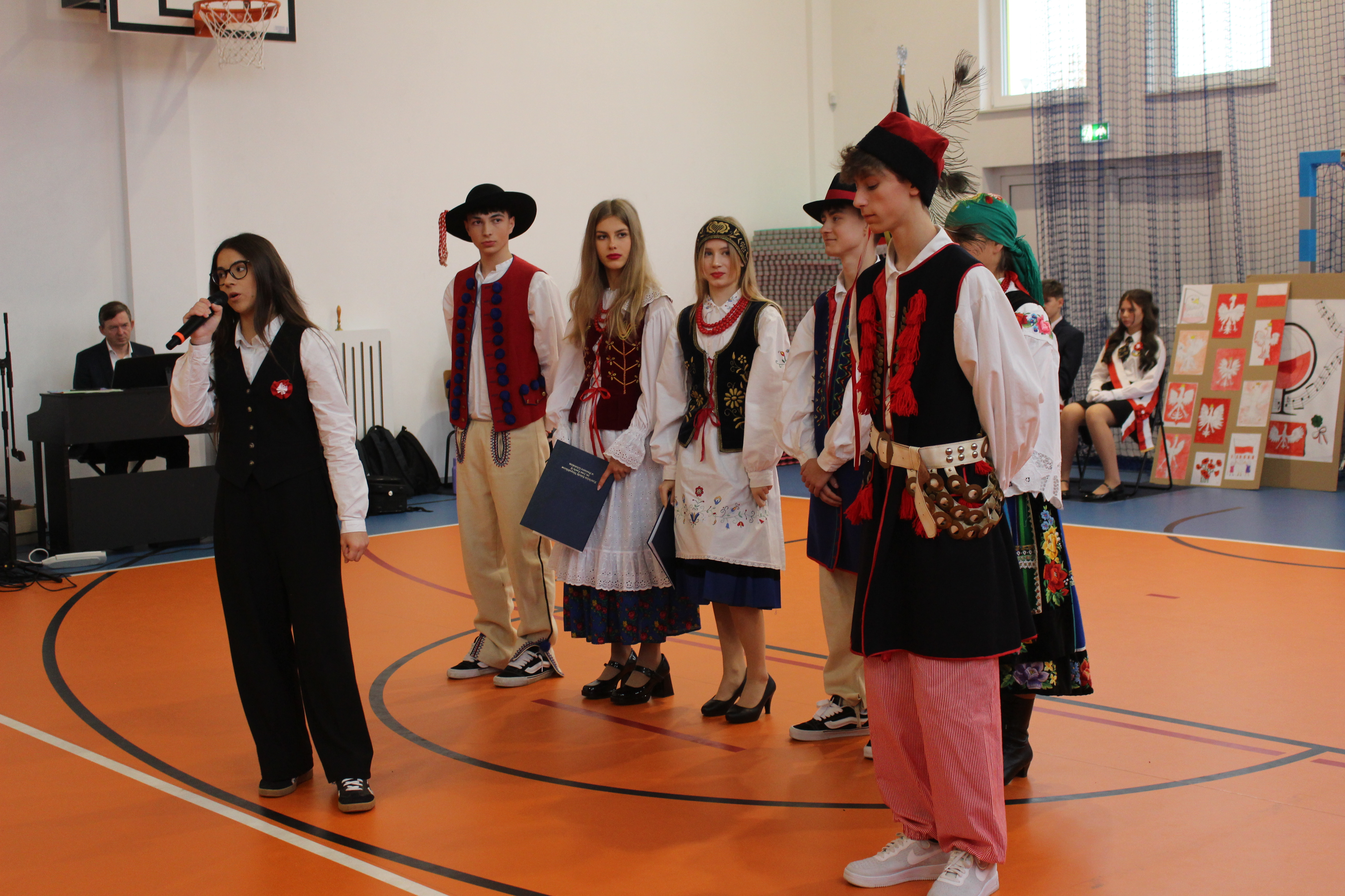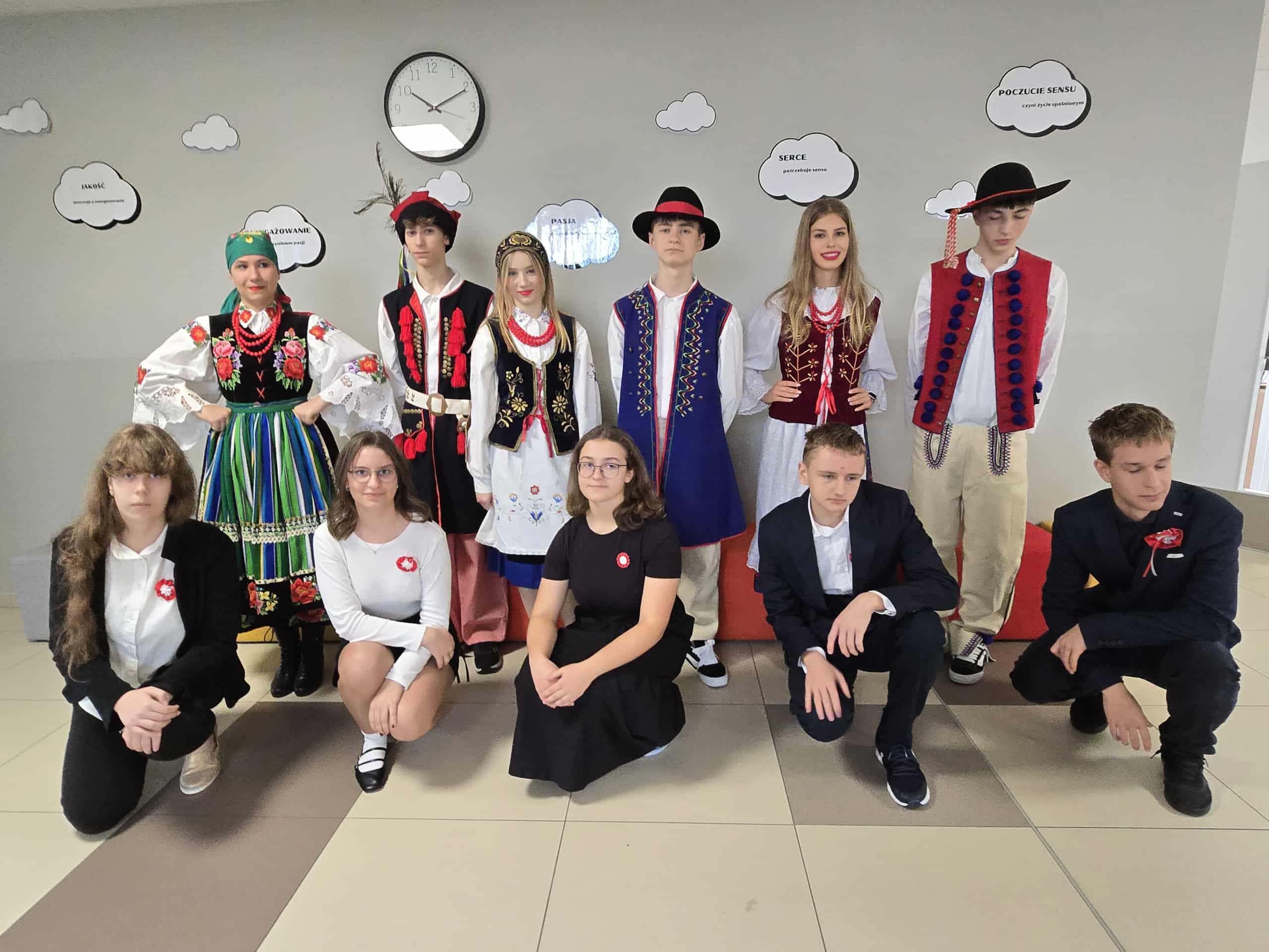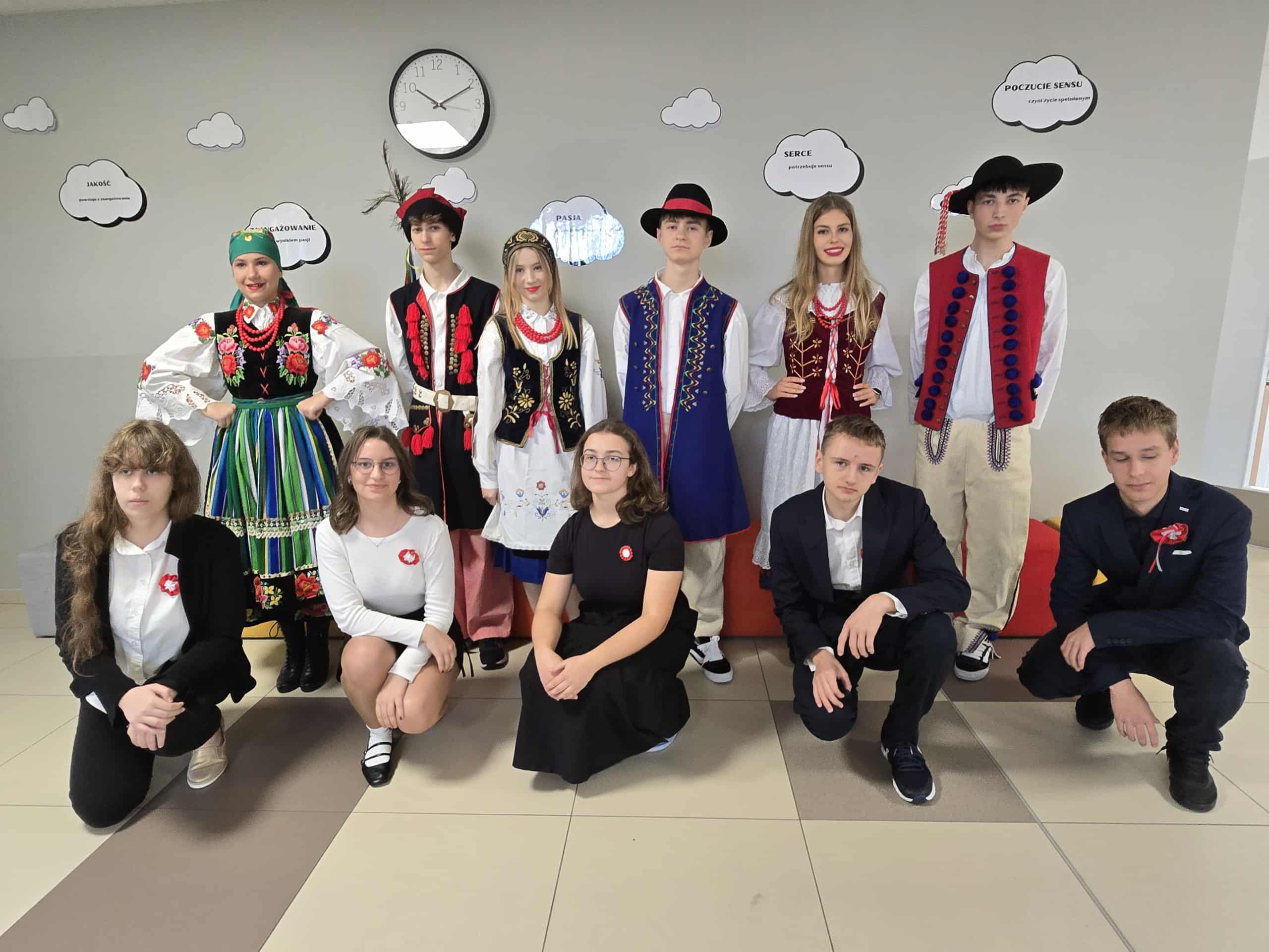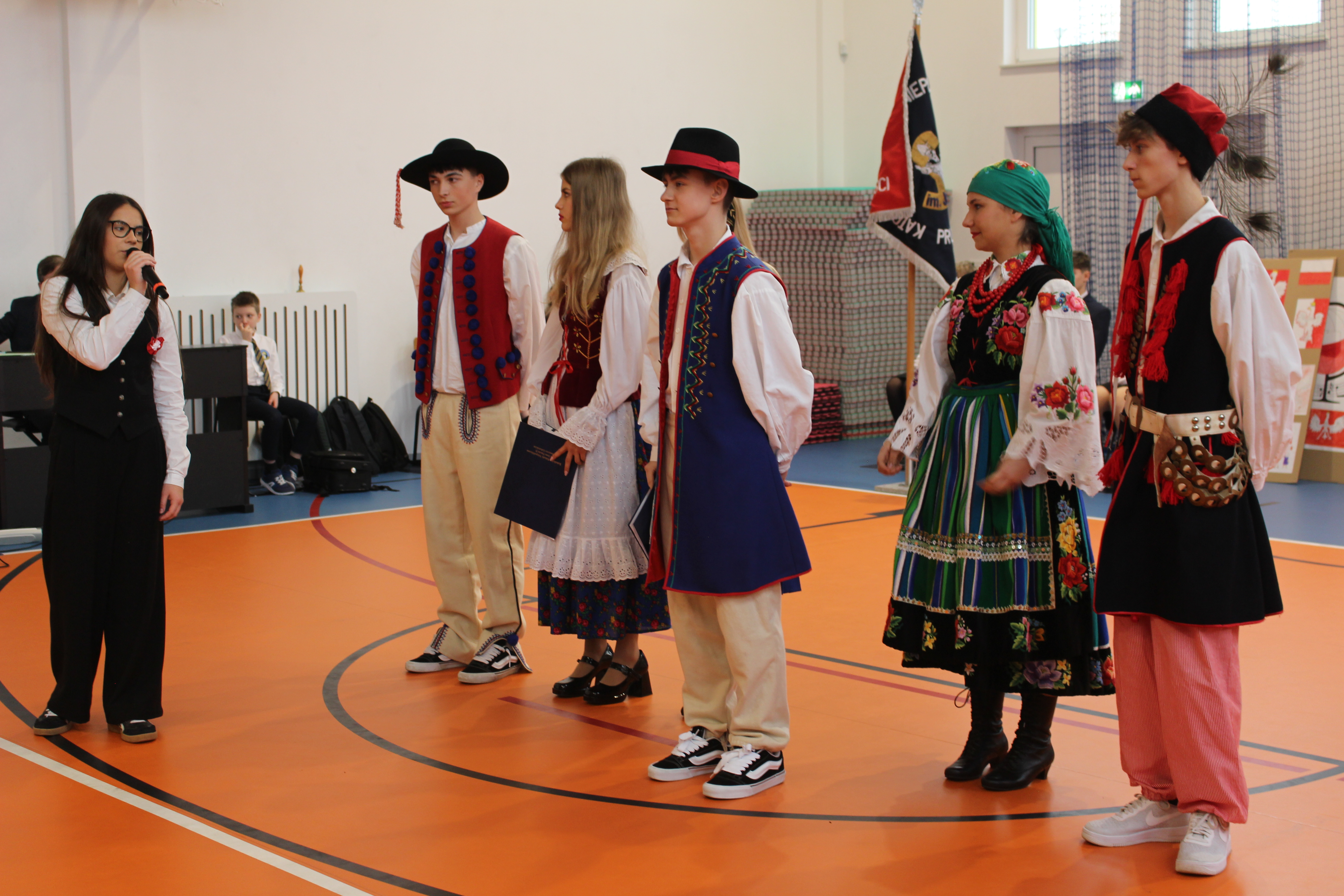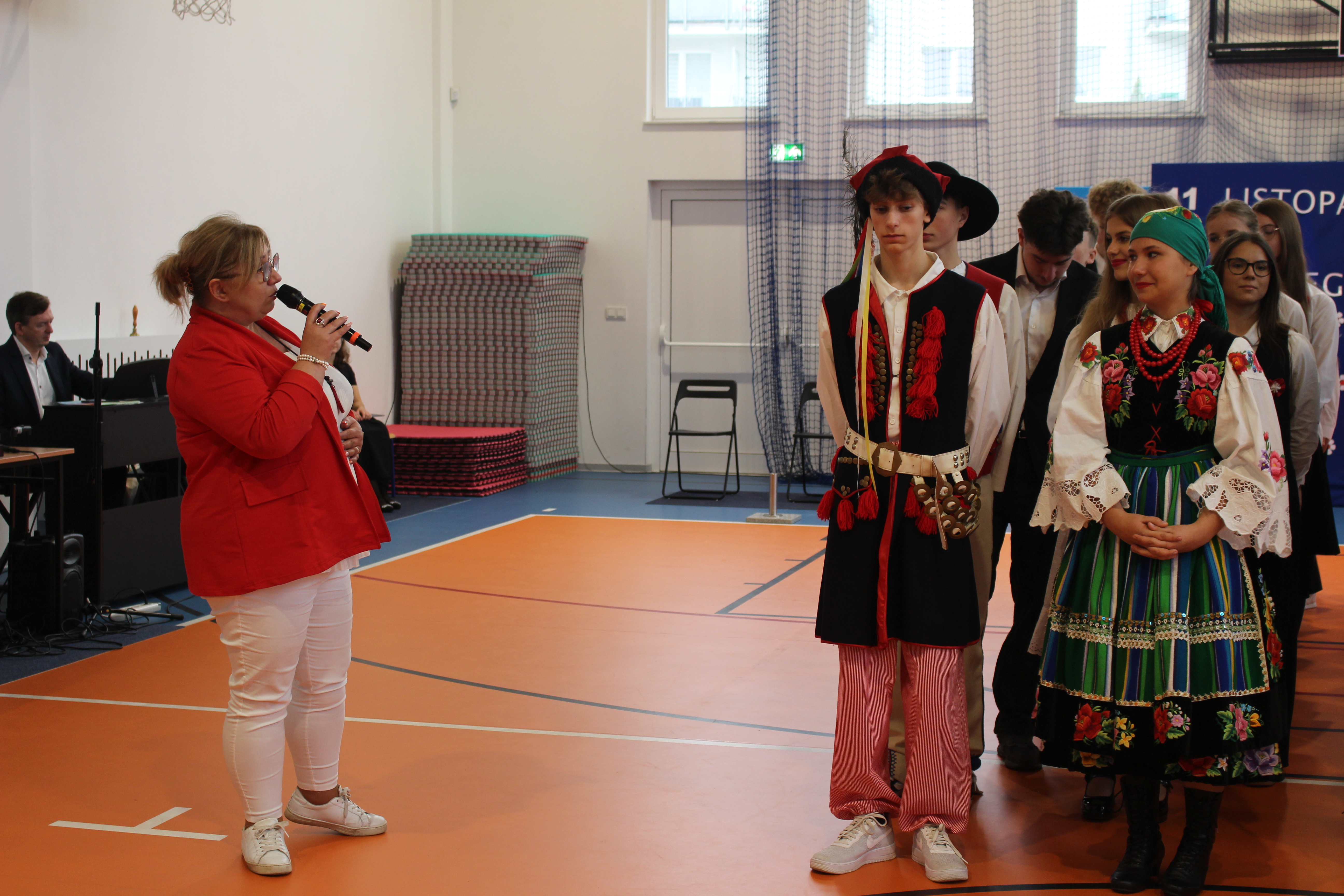 Wspólnie odśpiewaliśmy również "Rota", wyrażając nadzieję i szacunek dla naszej ojczyzny, a na scenie pojawiły się uczennice z klasy 5, które z dumą i radością wystąpiły z biało-czerwonymi flagami, symbolizującymi wolność i niepodległość Polski. Nie zabrakło także prezentacji barwnych strojów regionalnych, które zaprezentowali uczniowie liceum — ich występy dodały uroczystości kolorytu, tradycji i atmosfery święta.