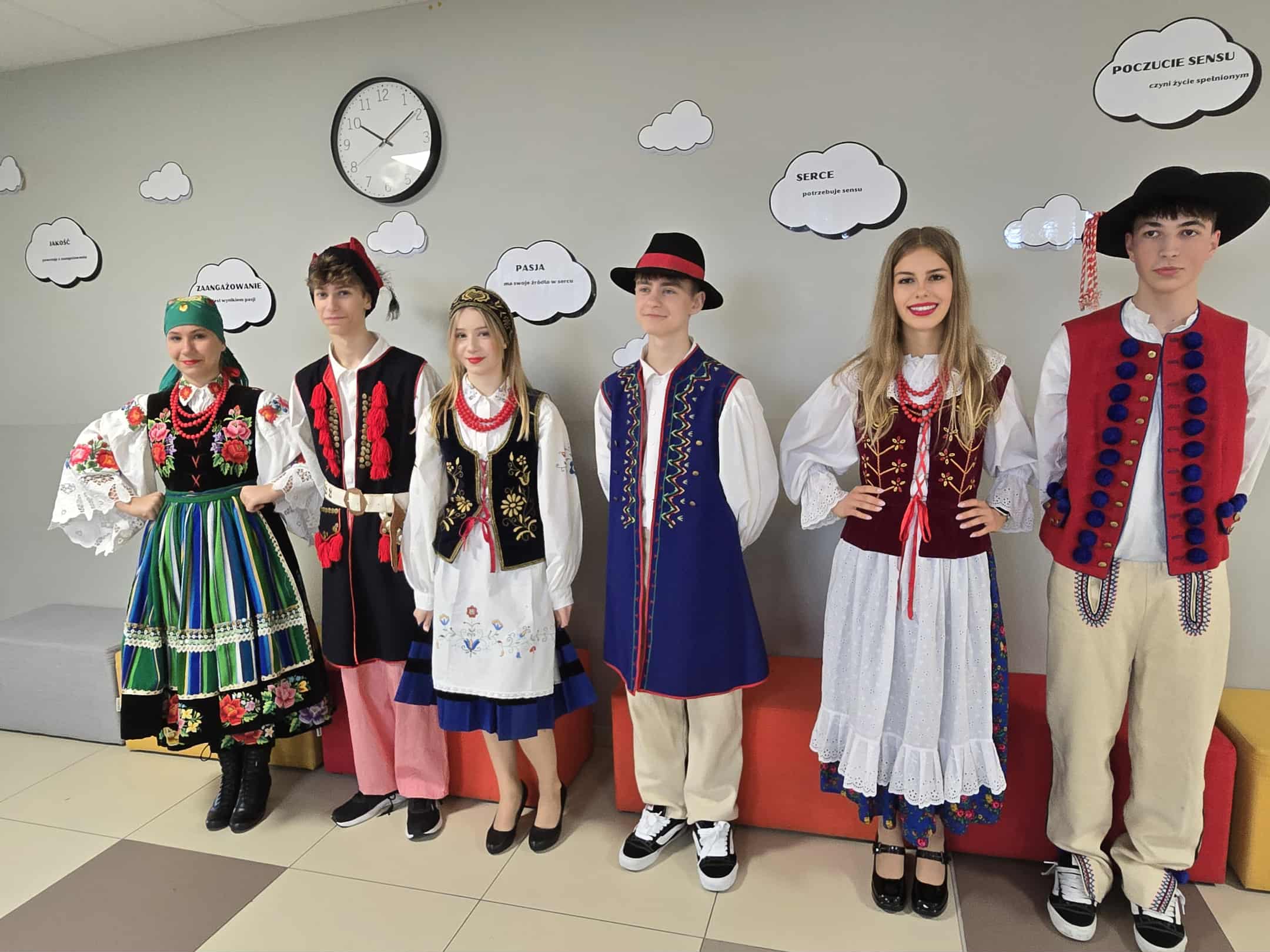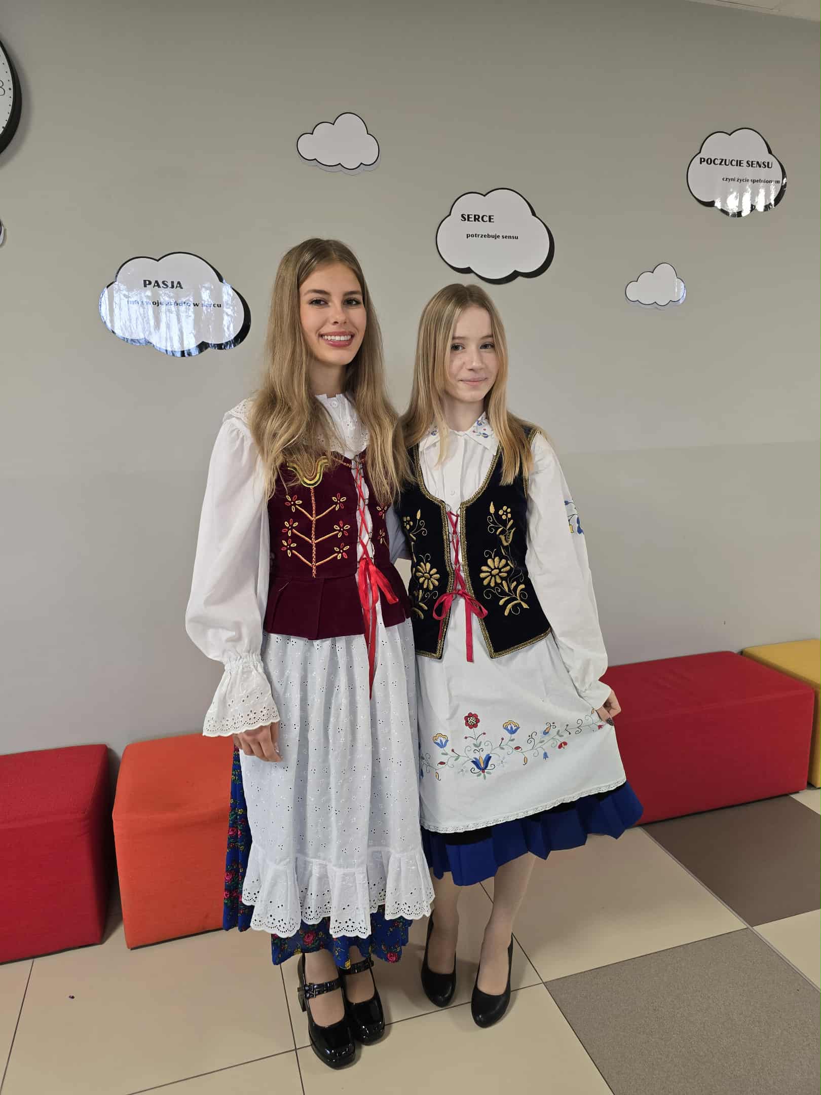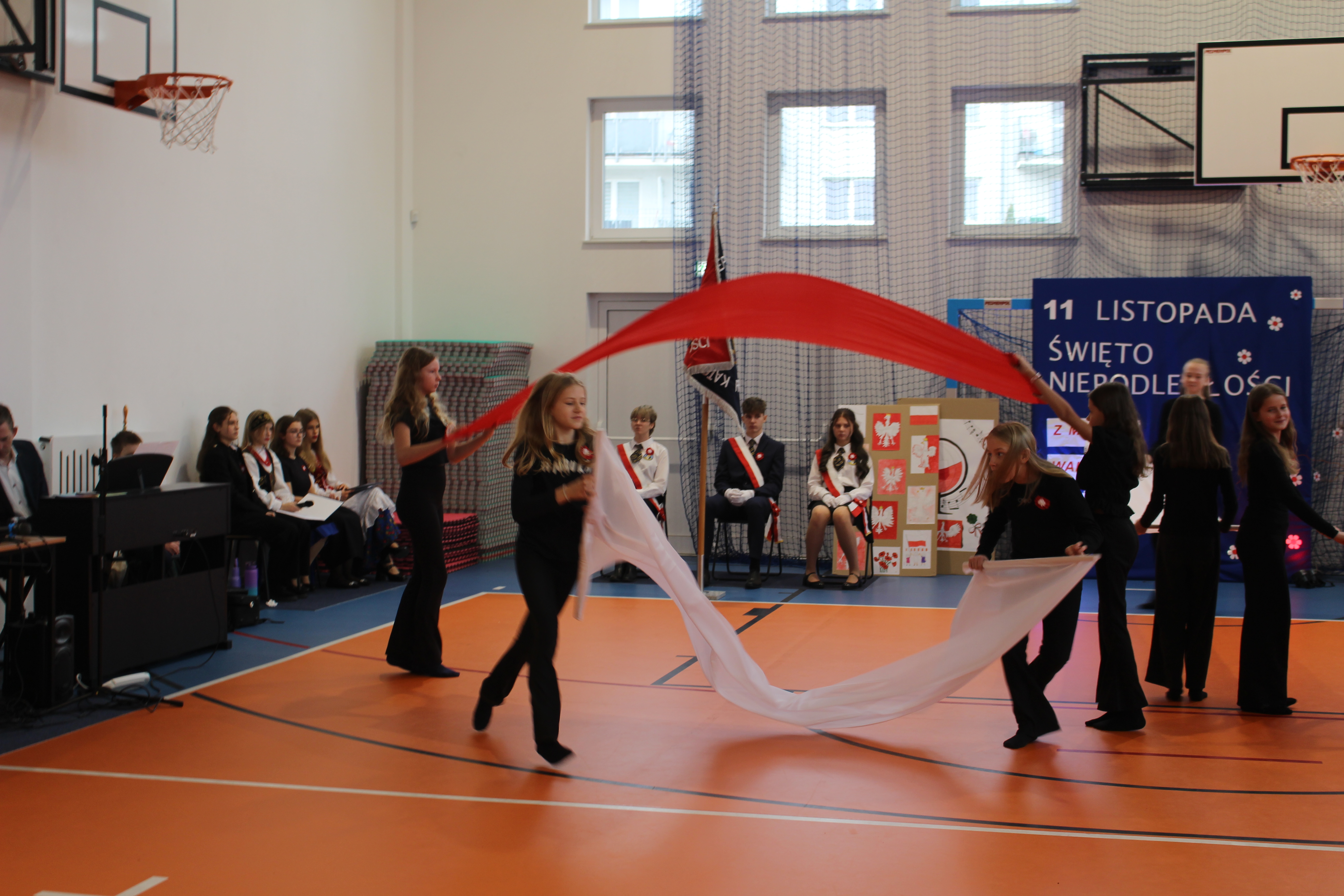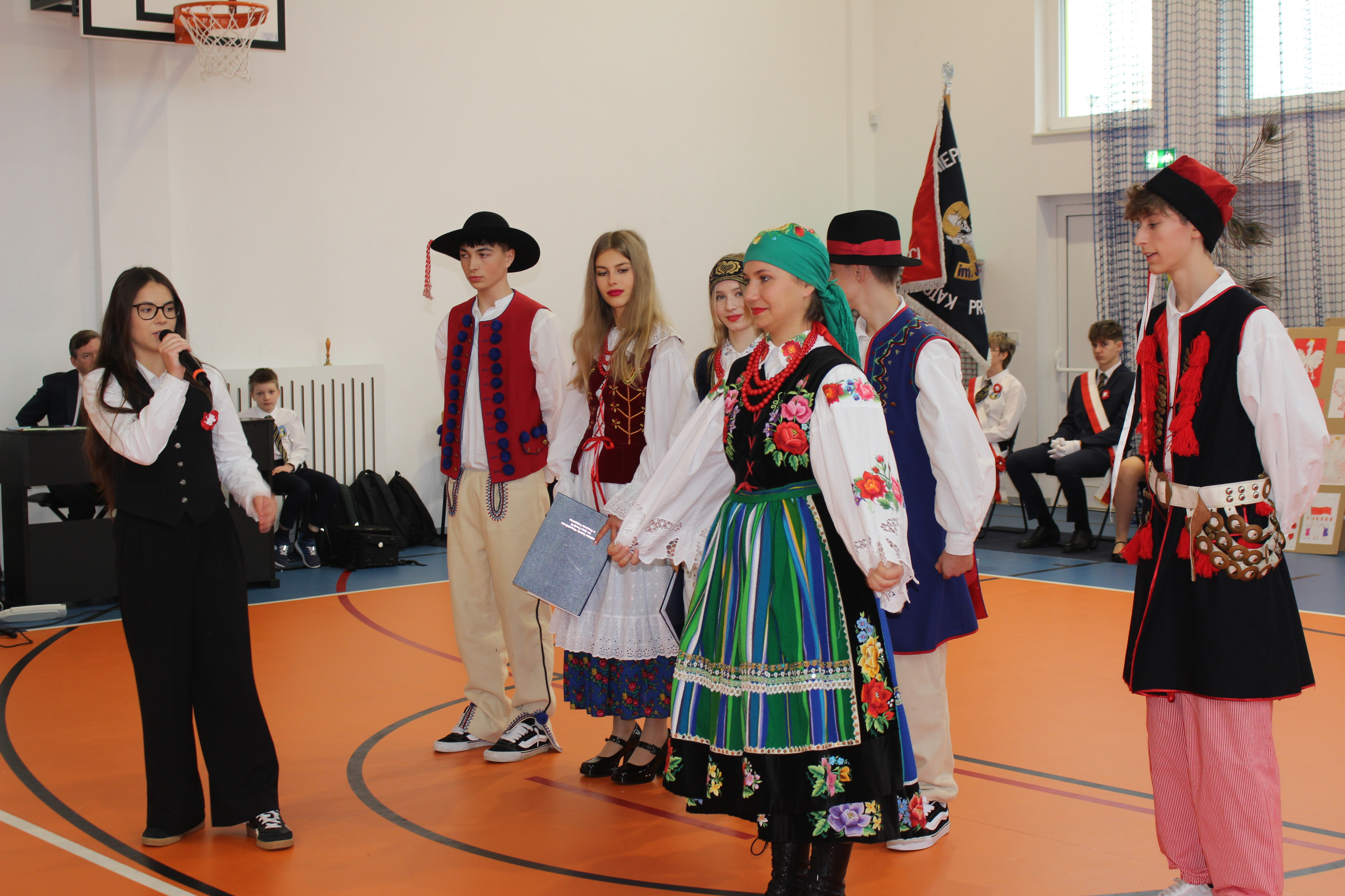 Wspólnie odśpiewaliśmy również "Rota", wyrażając nadzieję i szacunek dla naszej ojczyzny, a na scenie pojawiły się uczennice z klasy 5, które z dumą i radością wystąpiły z biało-czerwonymi flagami, symbolizującymi wolność i niepodległość Polski. Nie zabrakło także prezentacji barwnych strojów regionalnych, które zaprezentowali uczniowie liceum — ich występy dodały uroczystości kolorytu, tradycji i atmosfery święta.