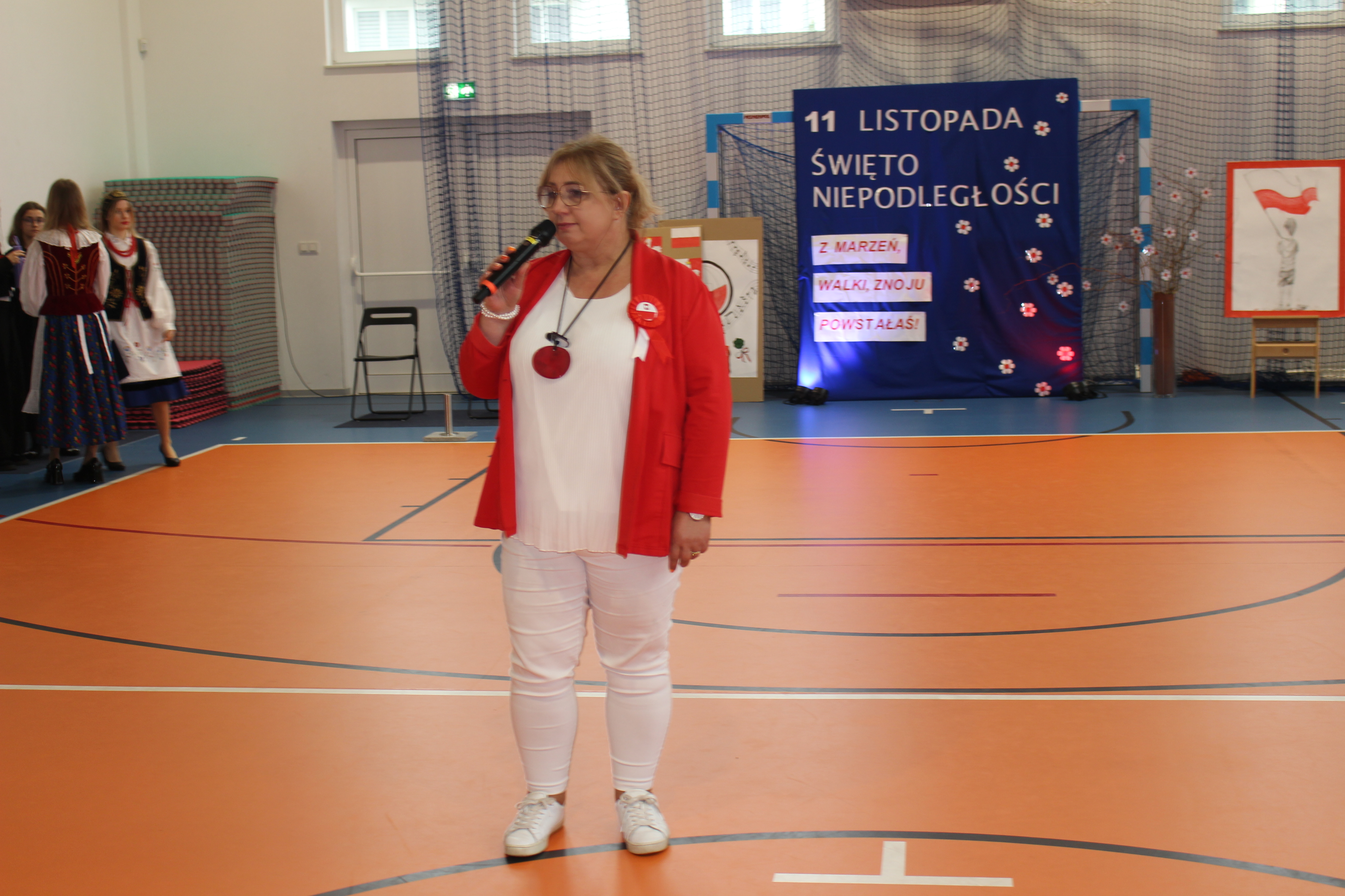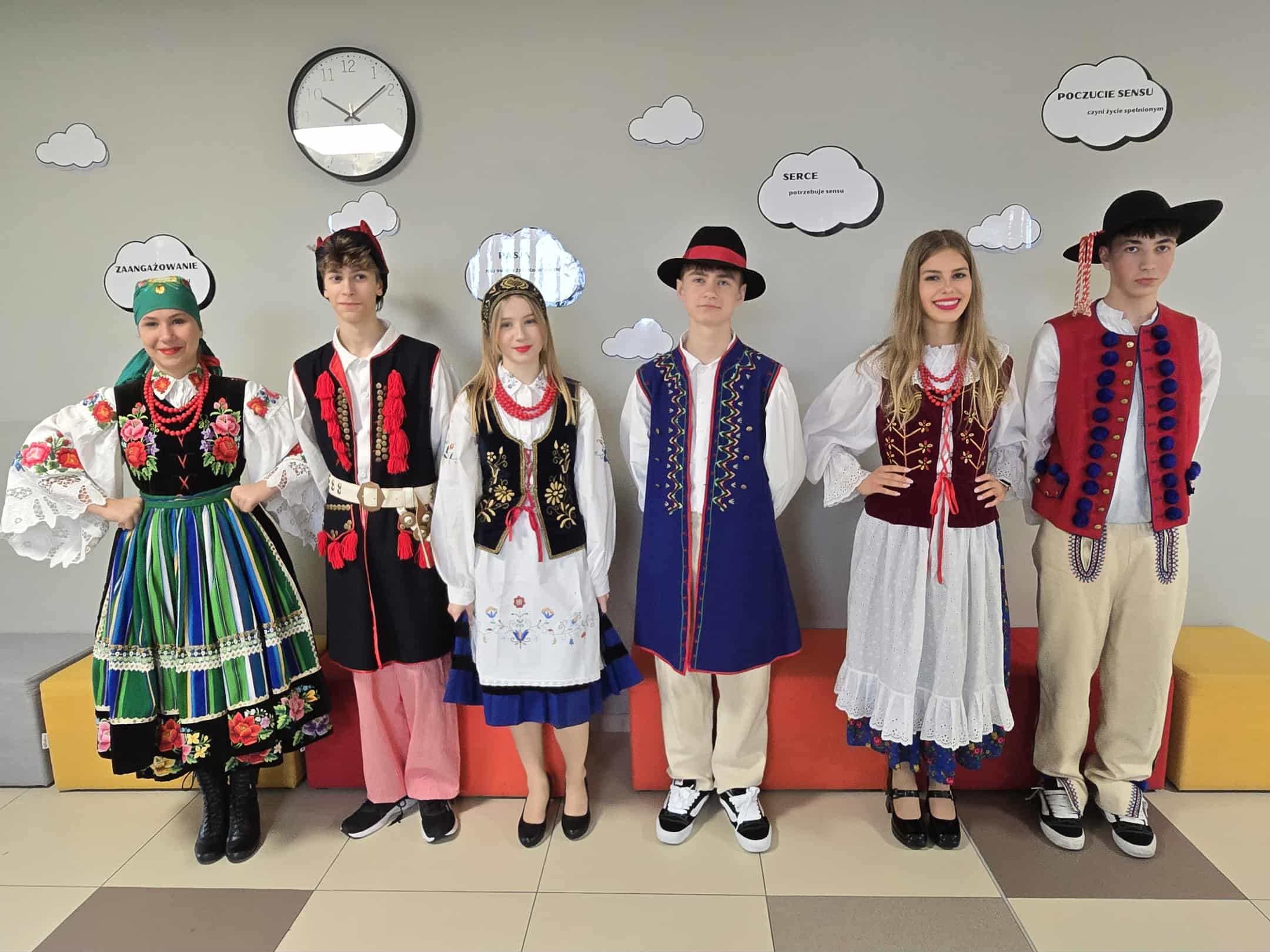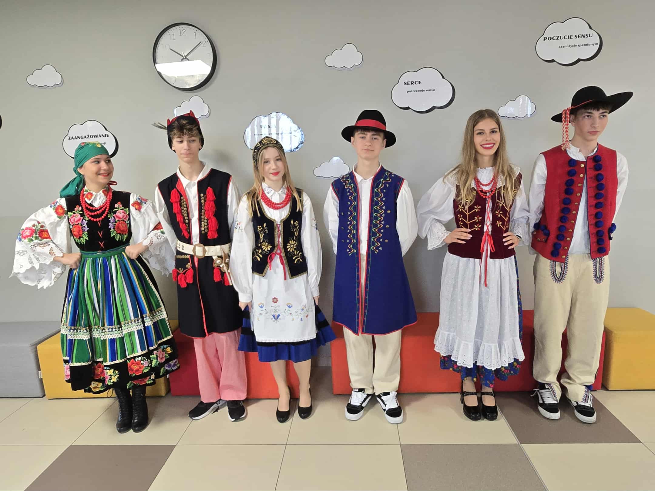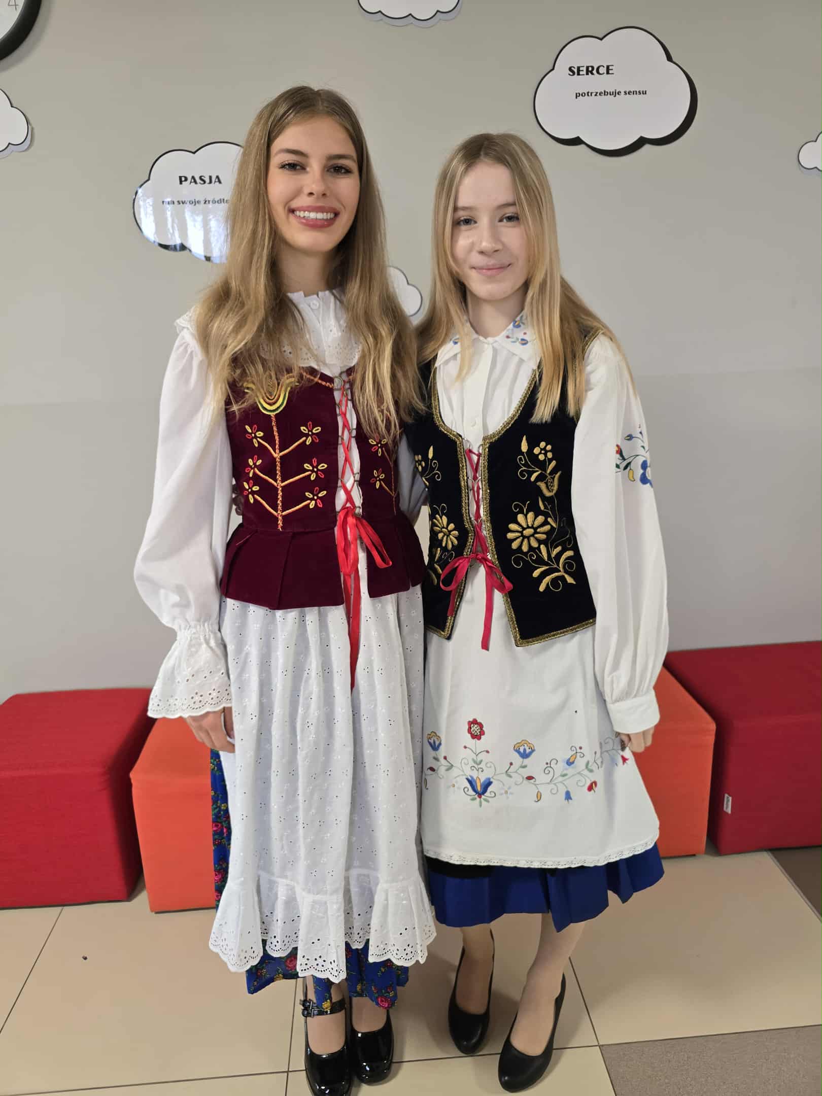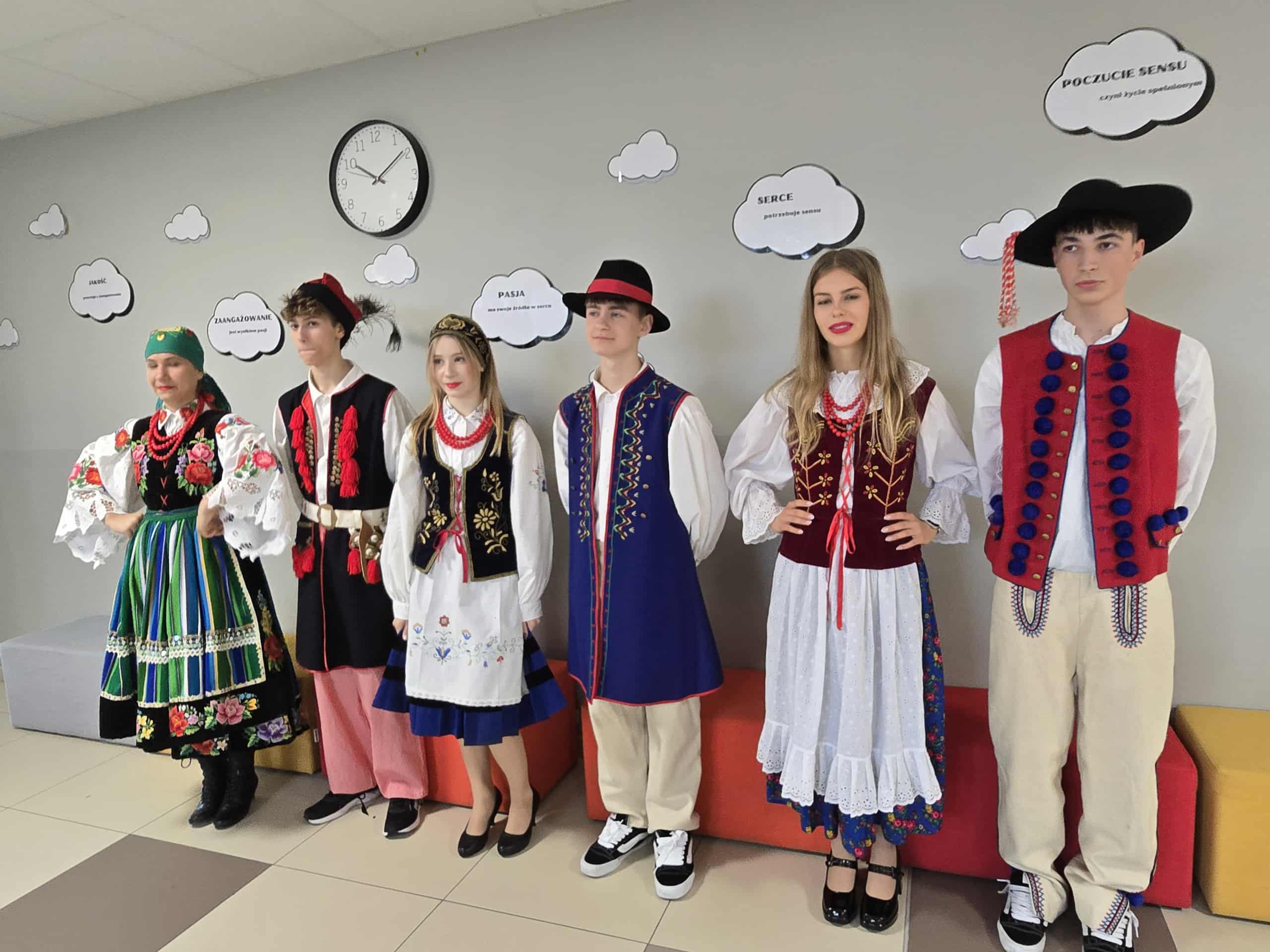 Wspólnie odśpiewaliśmy również "Rota", wyrażając nadzieję i szacunek dla naszej ojczyzny, a na scenie pojawiły się uczennice z klasy 5, które z dumą i radością wystąpiły z biało-czerwonymi flagami, symbolizującymi wolność i niepodległość Polski. Nie zabrakło także prezentacji barwnych strojów regionalnych, które zaprezentowali uczniowie liceum — ich występy dodały uroczystości kolorytu, tradycji i atmosfery święta.
