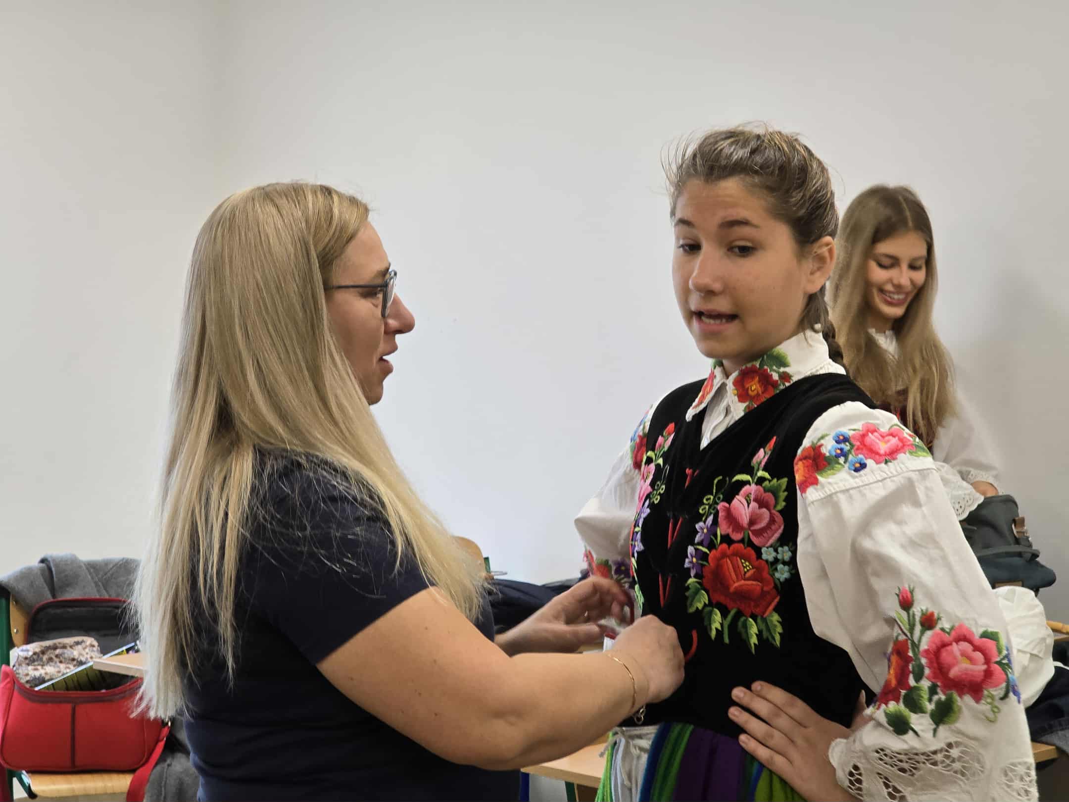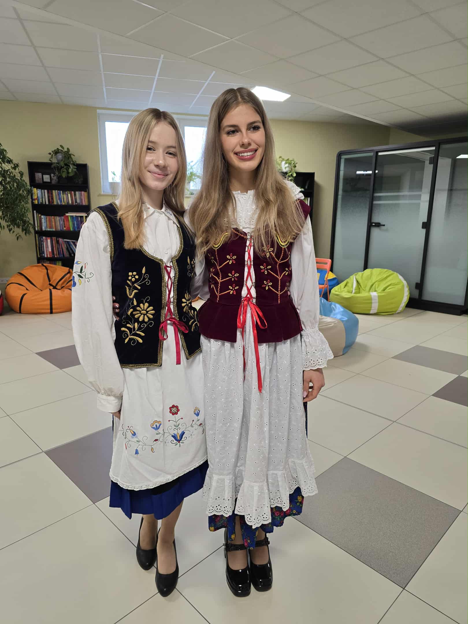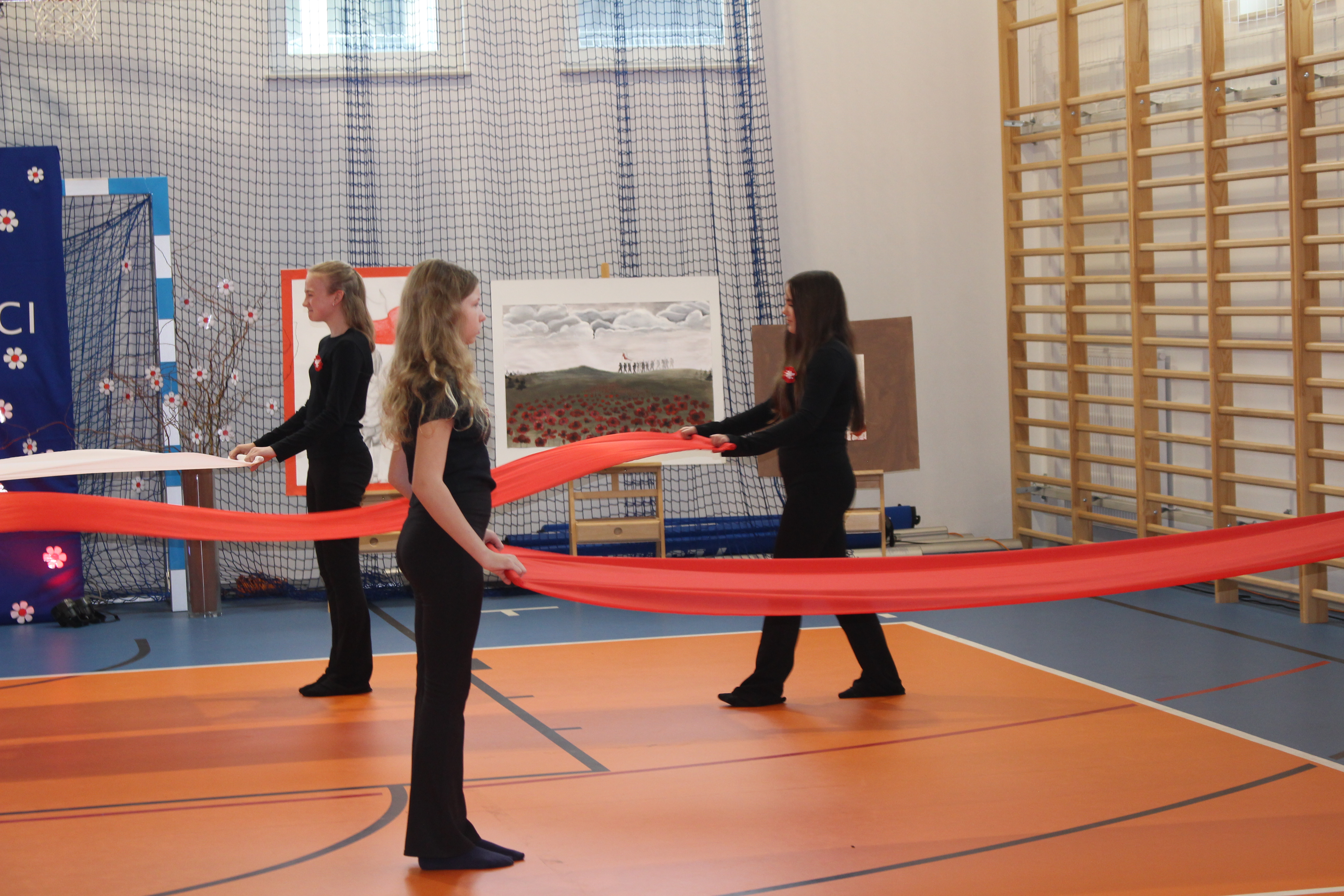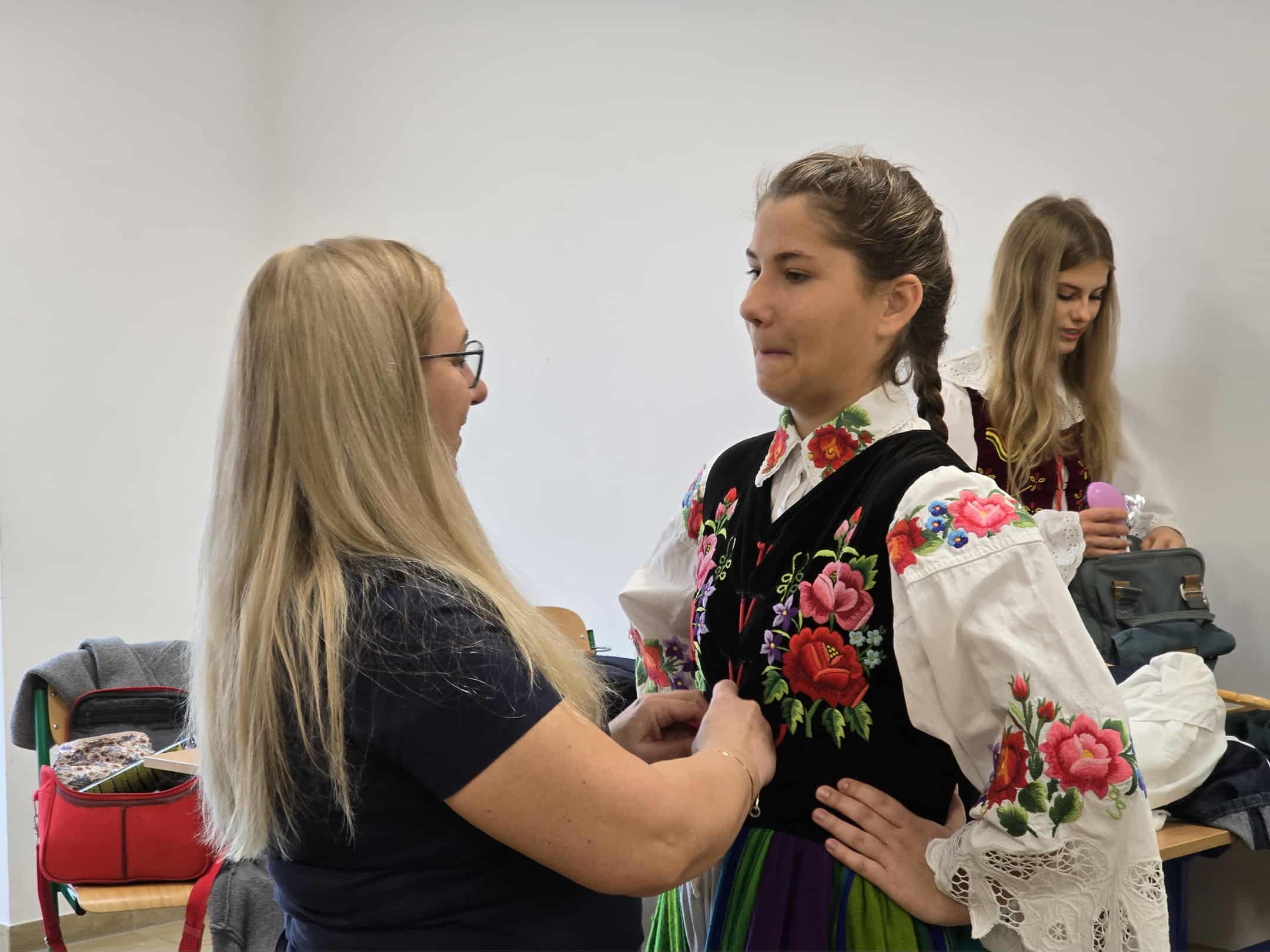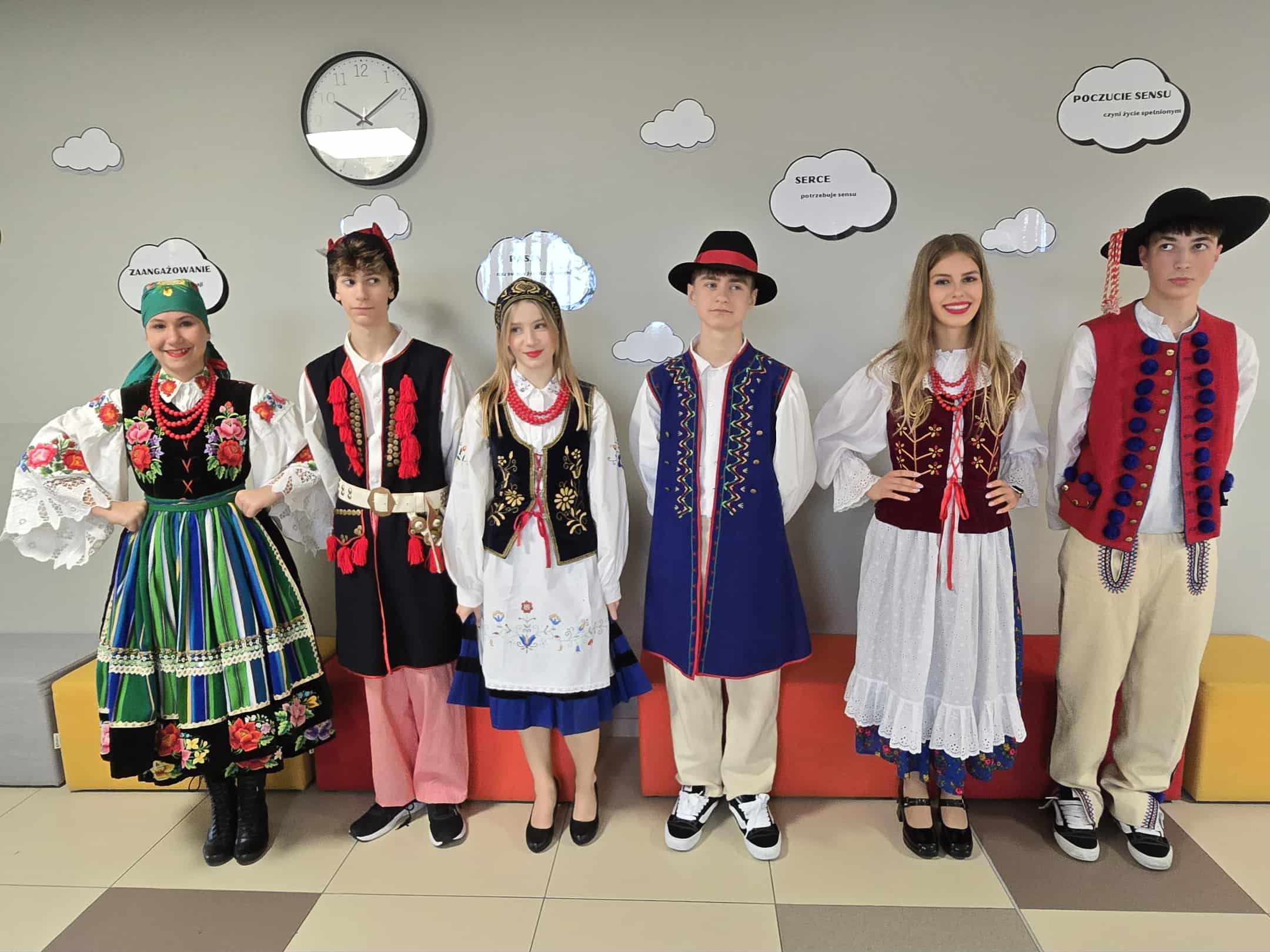 Wspólnie odśpiewaliśmy również "Rota", wyrażając nadzieję i szacunek dla naszej ojczyzny, a na scenie pojawiły się uczennice z klasy 5, które z dumą i radością wystąpiły z biało-czerwonymi flagami, symbolizującymi wolność i niepodległość Polski. Nie zabrakło także prezentacji barwnych strojów regionalnych, które zaprezentowali uczniowie liceum — ich występy dodały uroczystości kolorytu, tradycji i atmosfery święta.