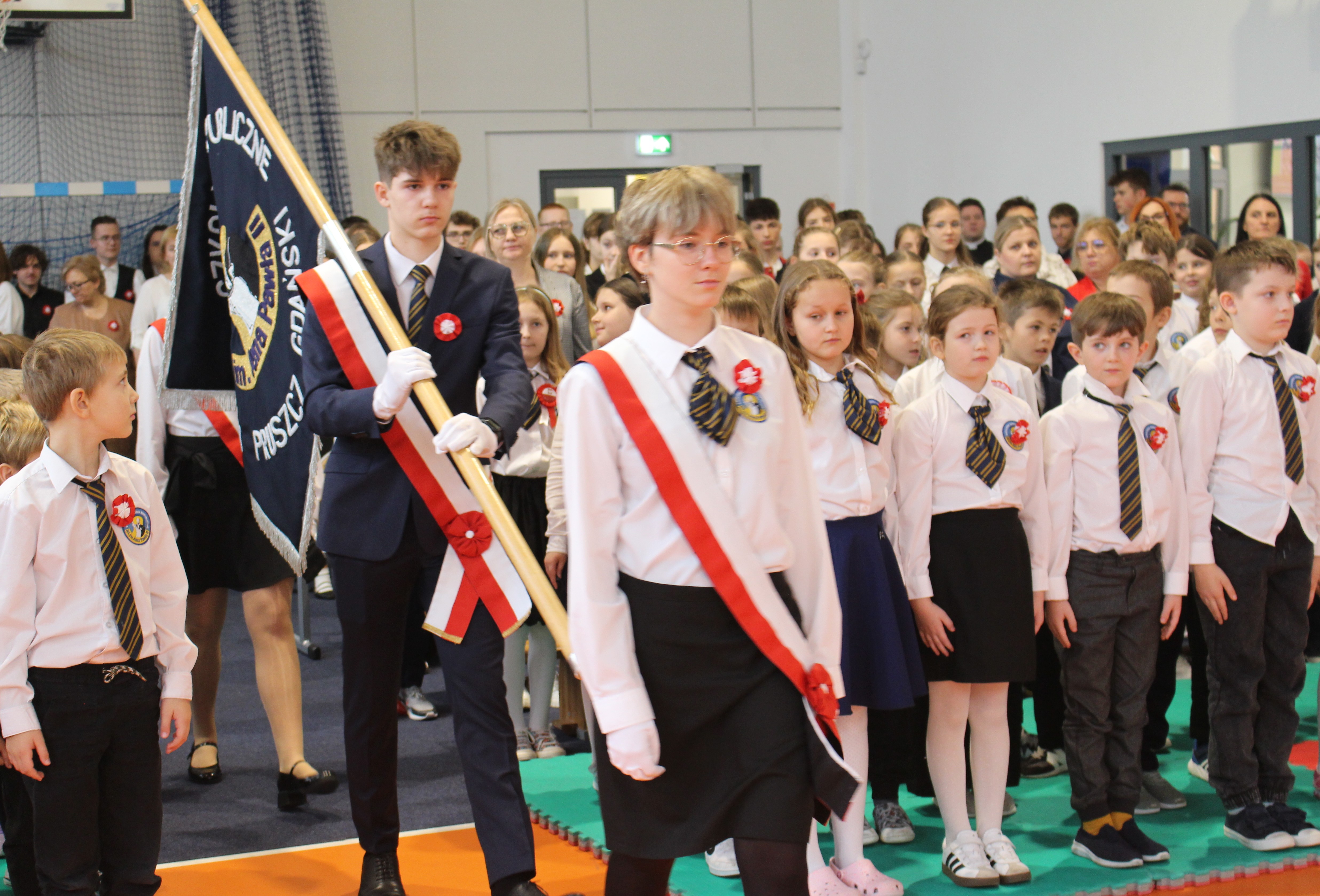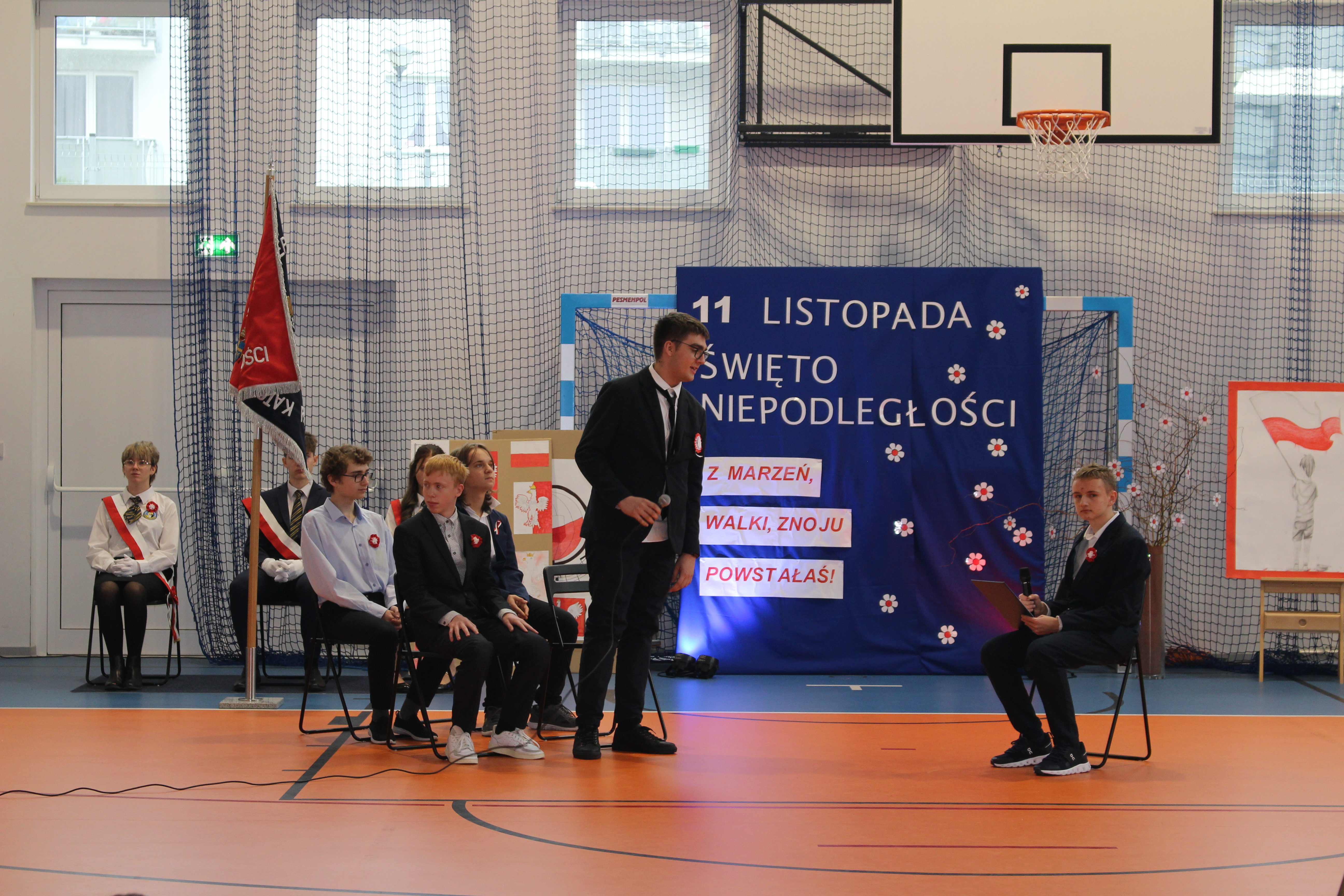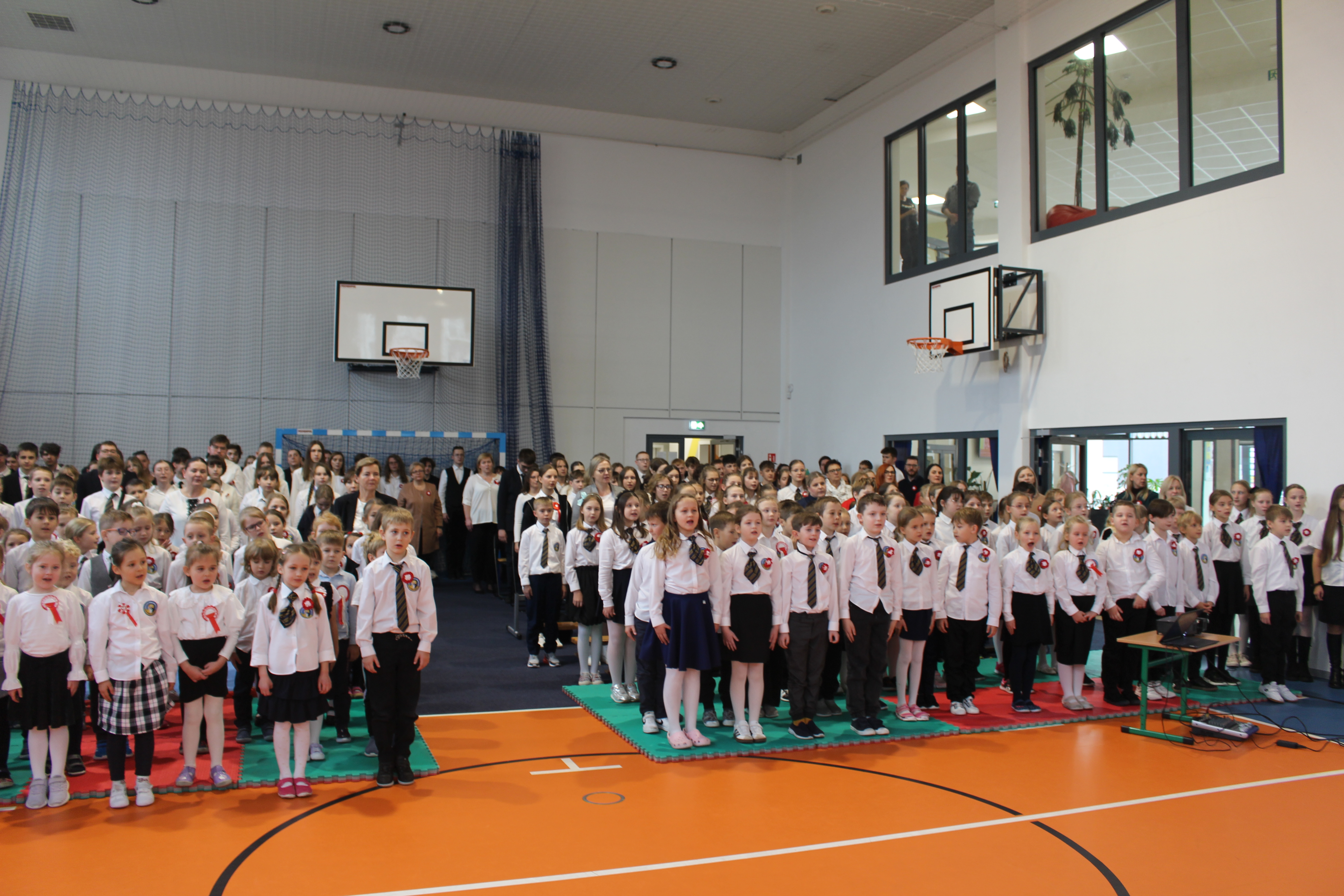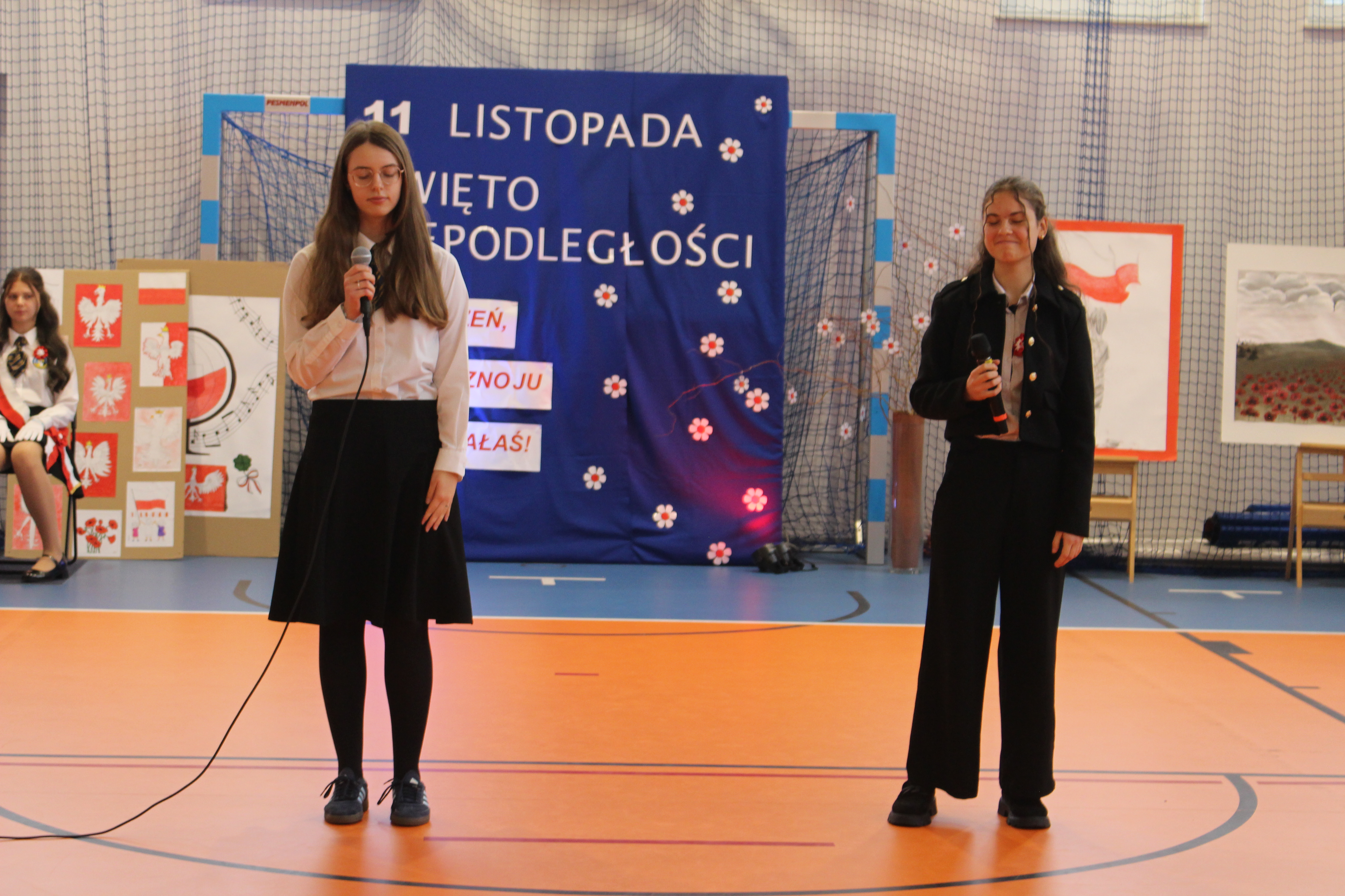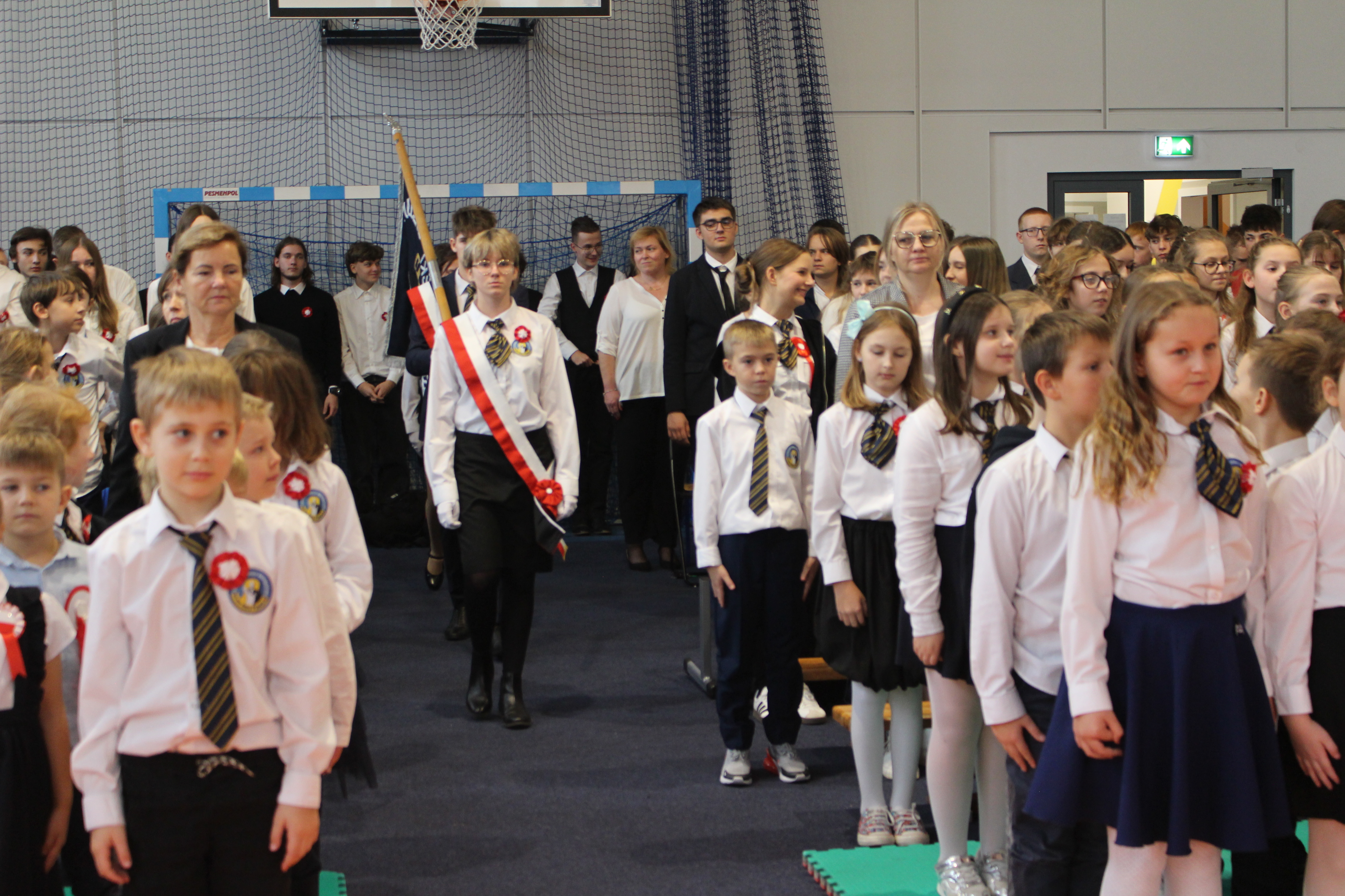 Dziś w naszej szkole odbyło się wyjątkowe Święto Niepodległości, które zgromadziło całą społeczność szkolną w duchu patriotyzmu, dumy i wspólnoty narodowej. Uroczystości rozpoczęły się punktualnie o godzinie 11:11, kiedy to wszyscy razem odśpiewaliśmy hymn Polski, co stało się piękną i wzruszającą tradycją, symbolizującą jedność i szacunek dla naszej ojczyzny. To wspólne śpiewanie przypomniało wszystkim o wartości patriotyzmu i konieczności pielęgnowania pamięci o naszej historii.