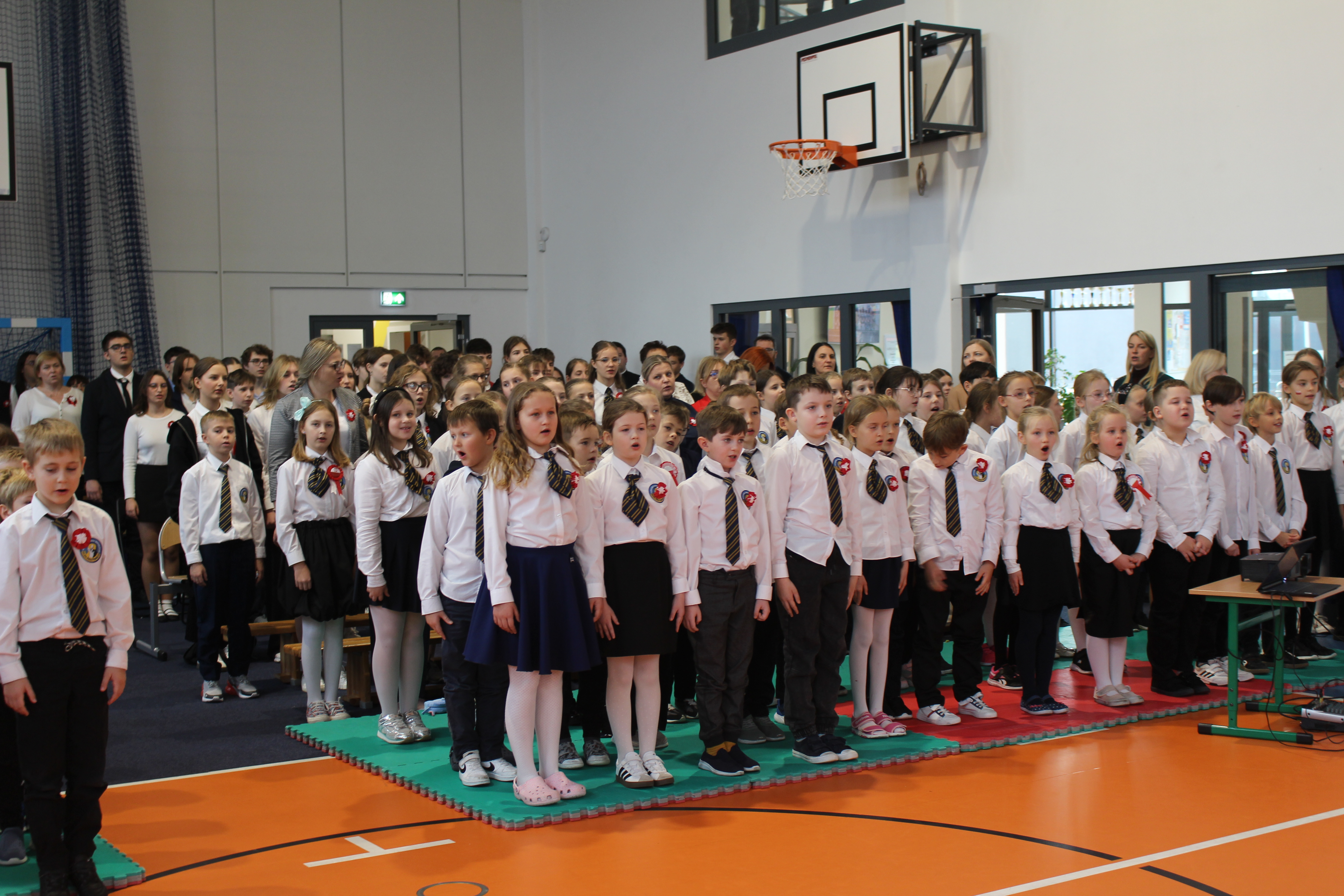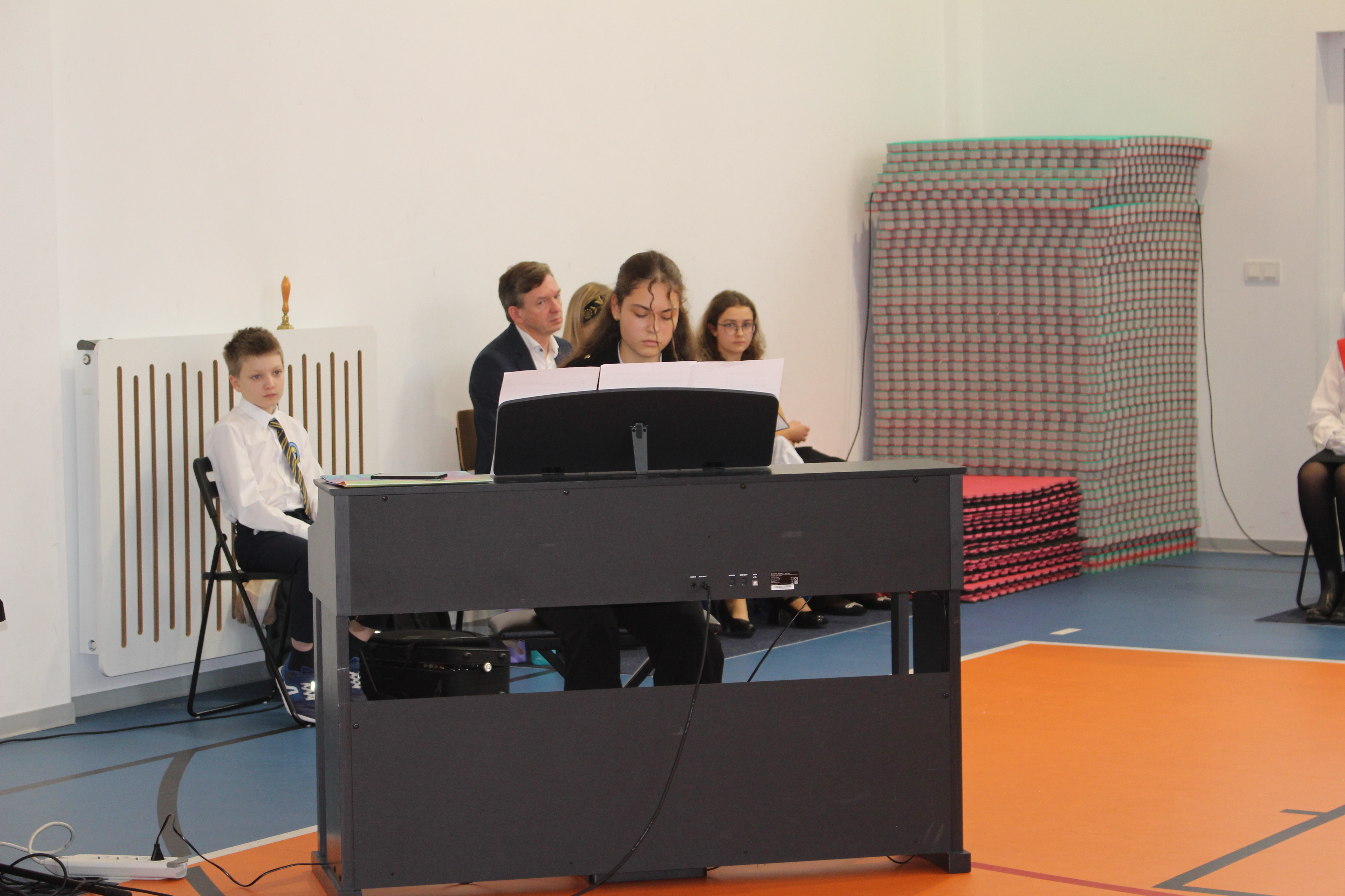 Podczas apelu nie zabrakło również artystycznych występów. Na scenie pojawiły się także utalentowane uczennice — Julia z 2LO, Diana z 3LO oraz Julia z 8LO — które zaśpiewały patriotyczne pieśni, wyrażając swoją miłość do ojczyzny. Diana dodatkowo zachwyciła nas swoją grą na pianinie, dodając uroczystości wyjątkowego klimatu i podkreślając rangę tego wydarzenia.