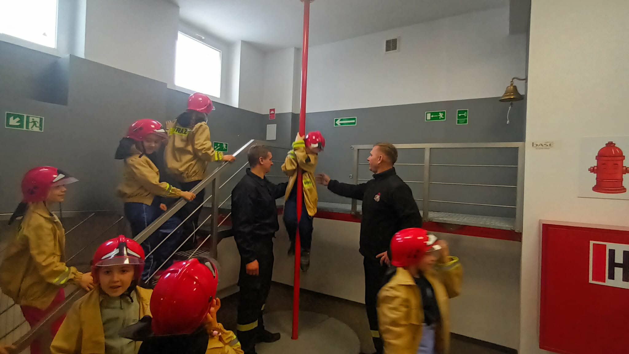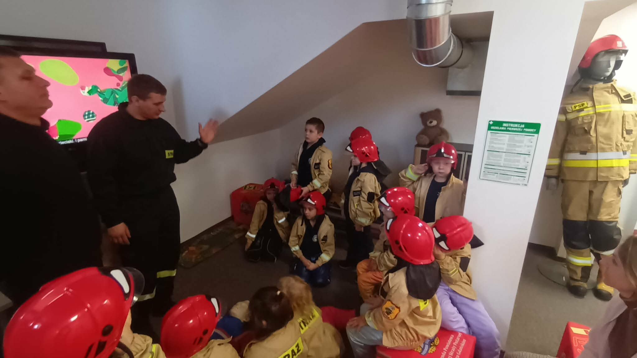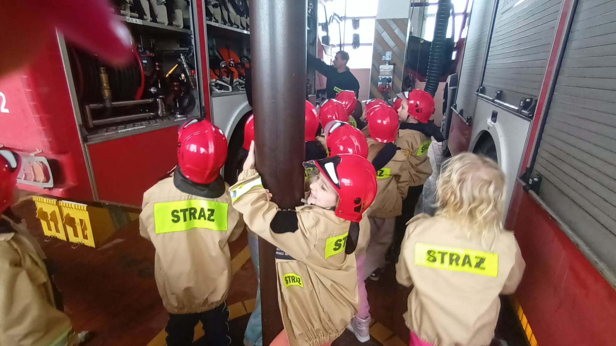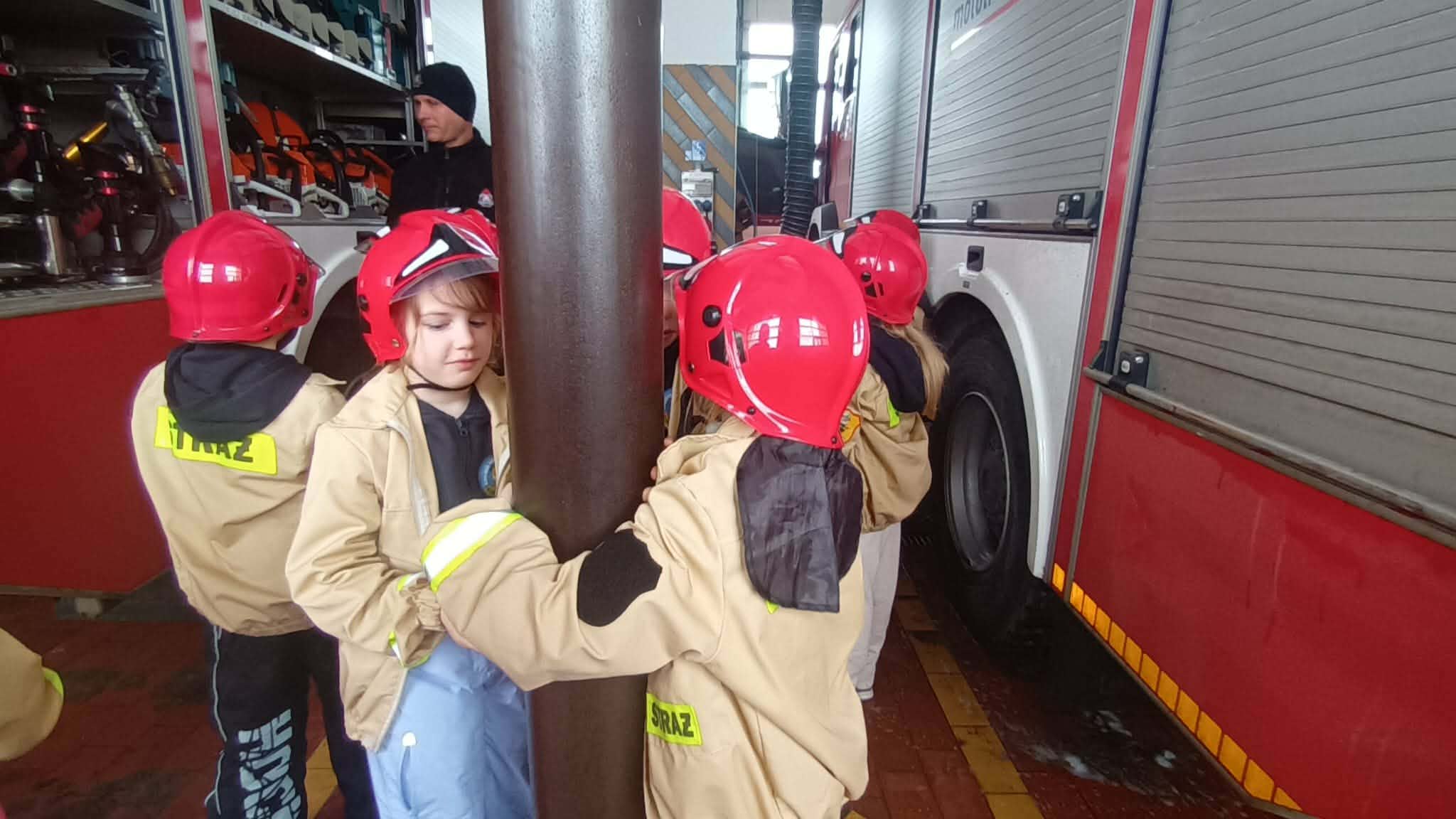 Przed wycieczką dzieci przypomniały sobie zasady bezpieczeństwa obowiązujące podczas drogi do straży oraz w samym miejscu zwiedzania. Po dotarciu na miejsce zostały serdecznie powitane przez strażaków, którzy czekali na nie w gotowości. Strażacy pokazali dzieciom swoją sprawność, zjeżdżając do nich po specjalnej rurze, co wzbudziło ogromny entuzjazm wśród małych gości.