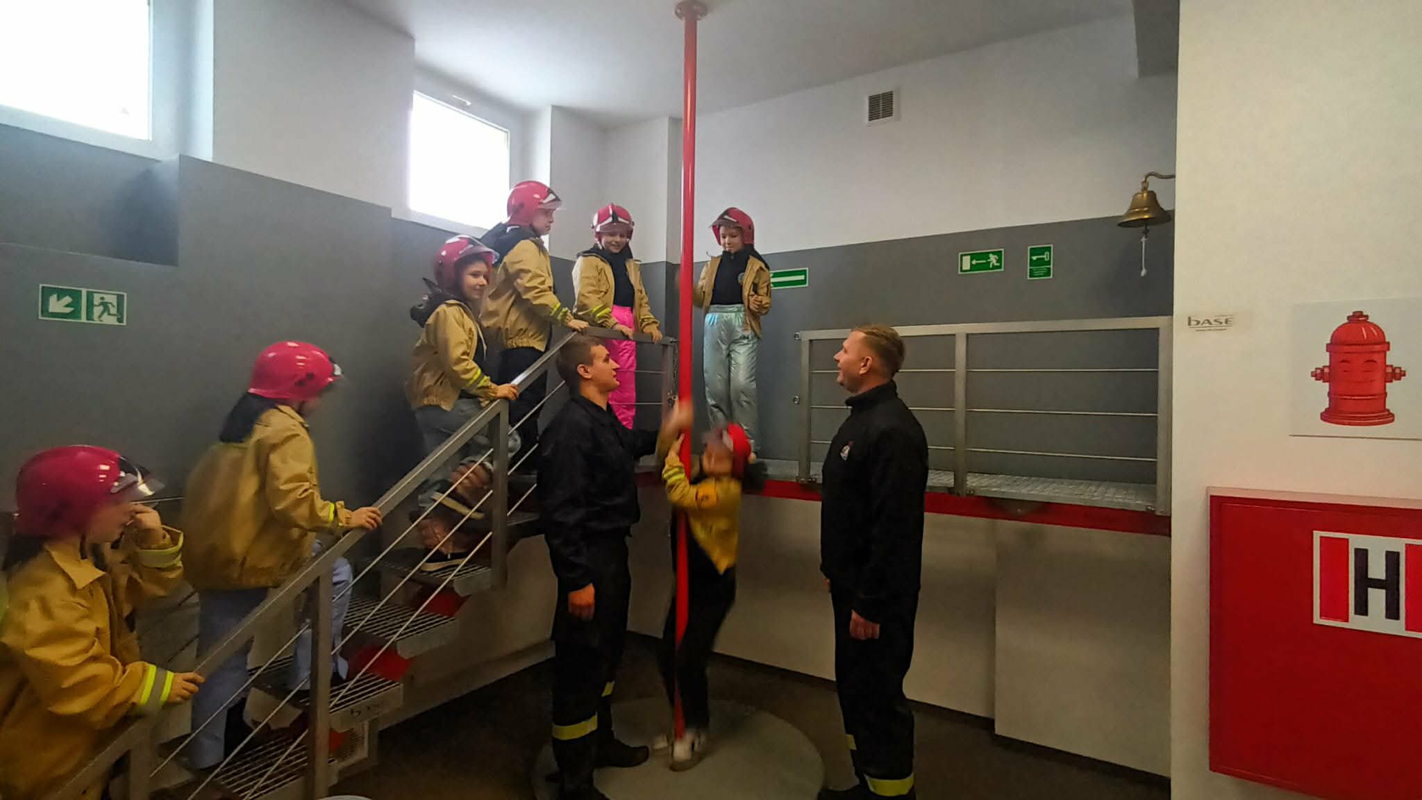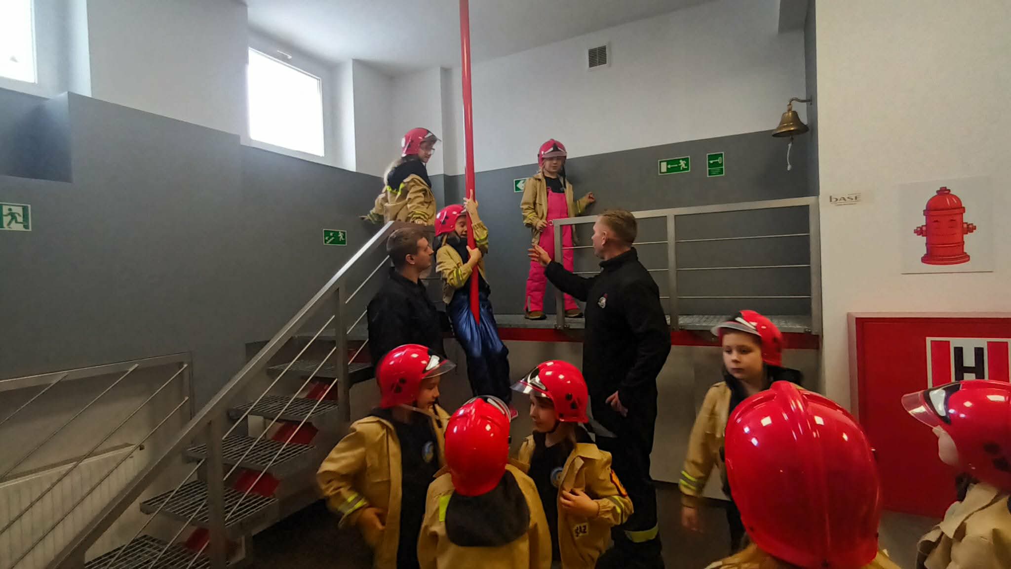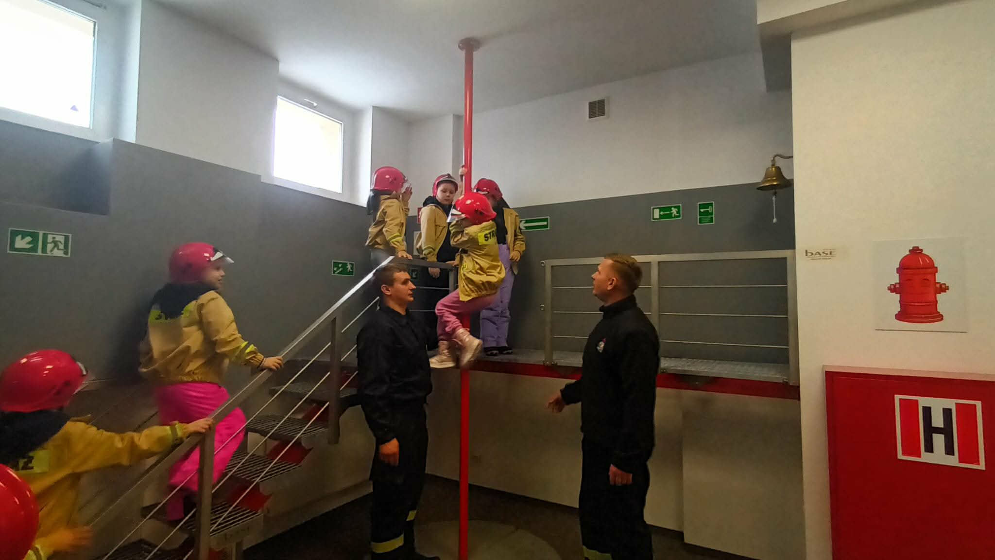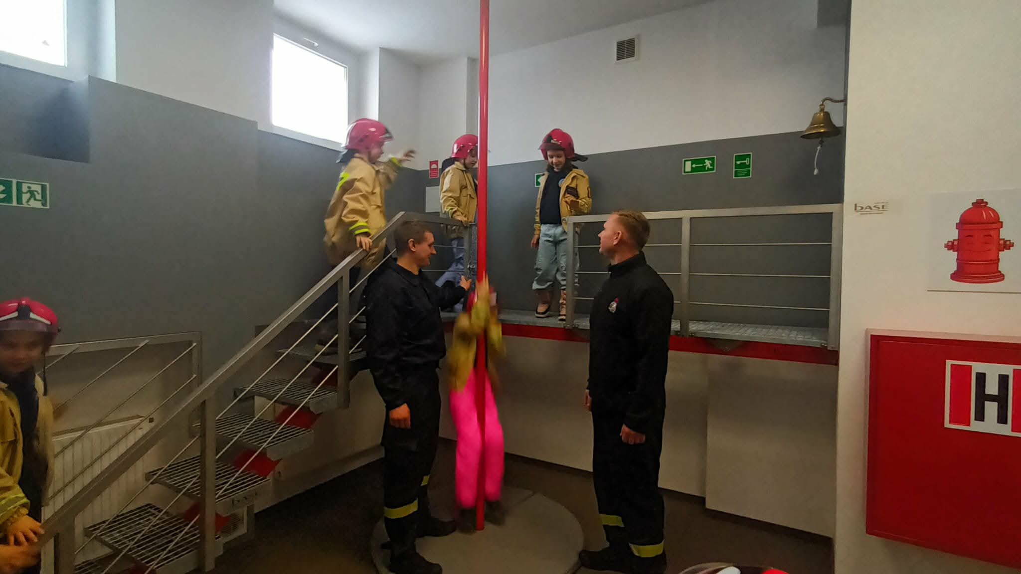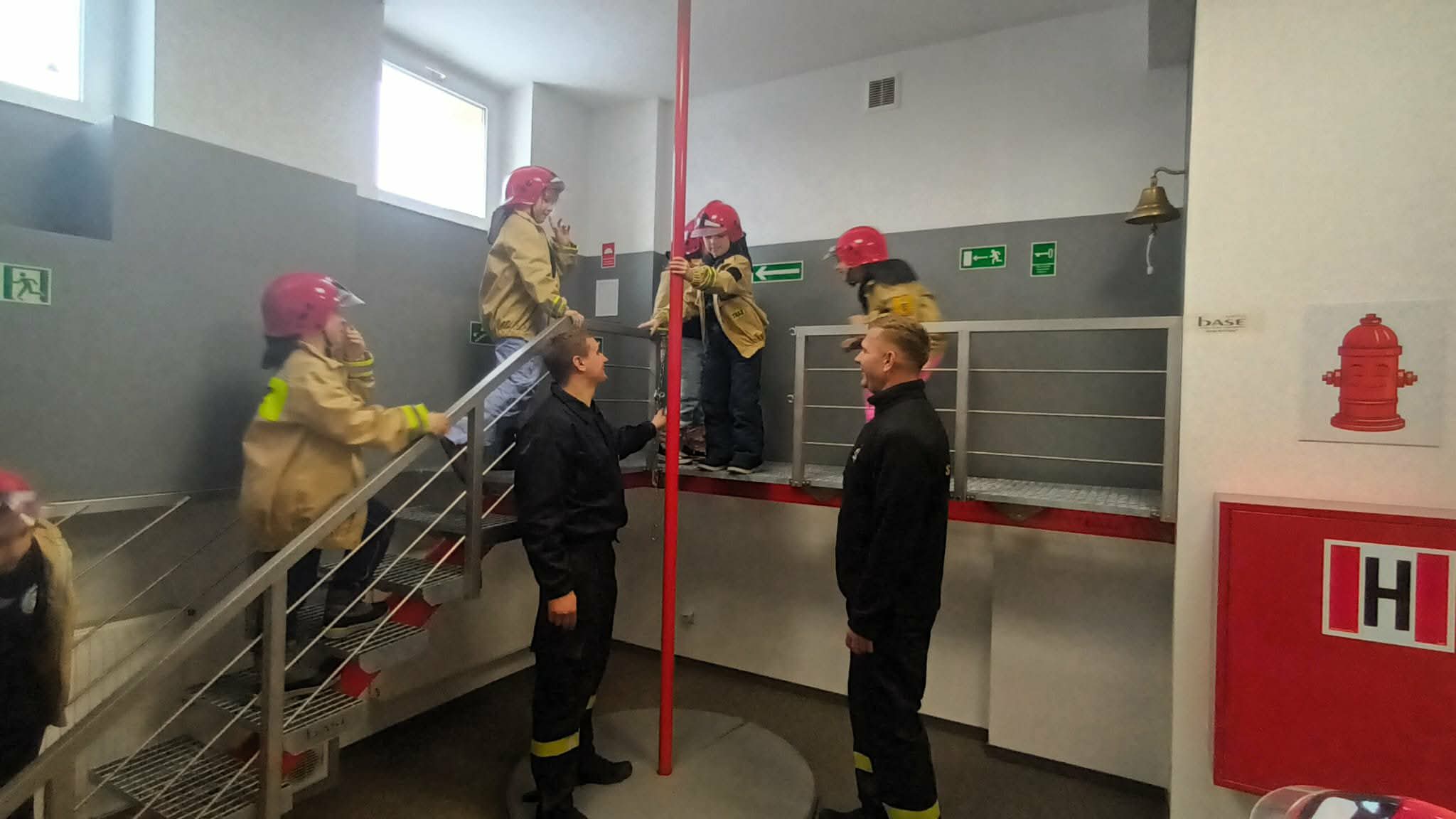 Przed wycieczką dzieci przypomniały sobie zasady bezpieczeństwa obowiązujące podczas drogi do straży oraz w samym miejscu zwiedzania. Po dotarciu na miejsce zostały serdecznie powitane przez strażaków, którzy czekali na nie w gotowości. Strażacy pokazali dzieciom swoją sprawność, zjeżdżając do nich po specjalnej rurze, co wzbudziło ogromny entuzjazm wśród małych gości.