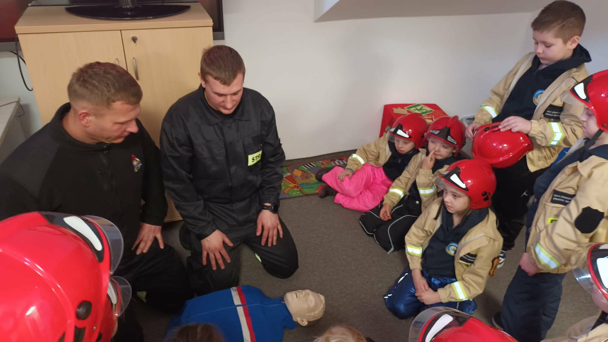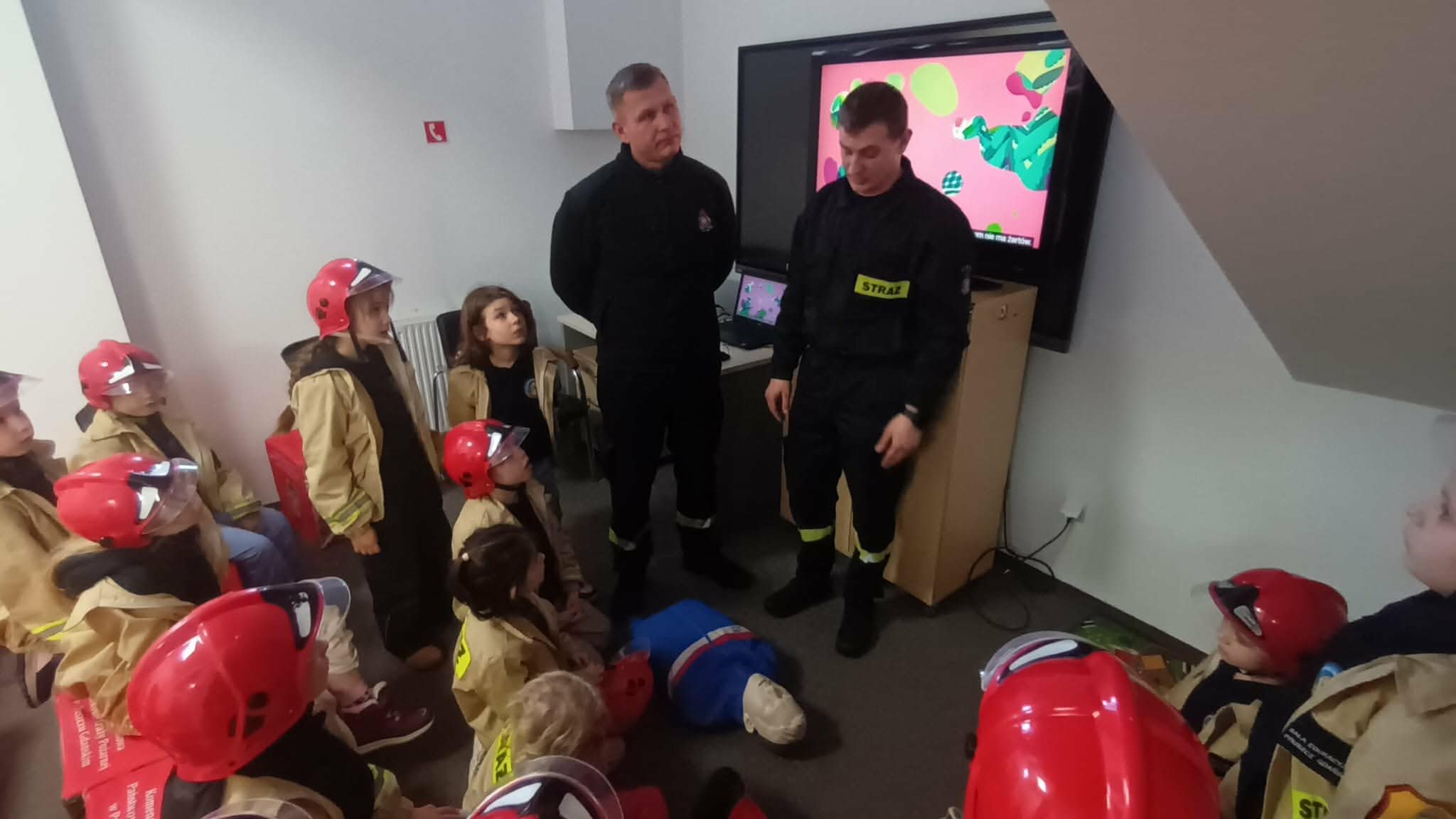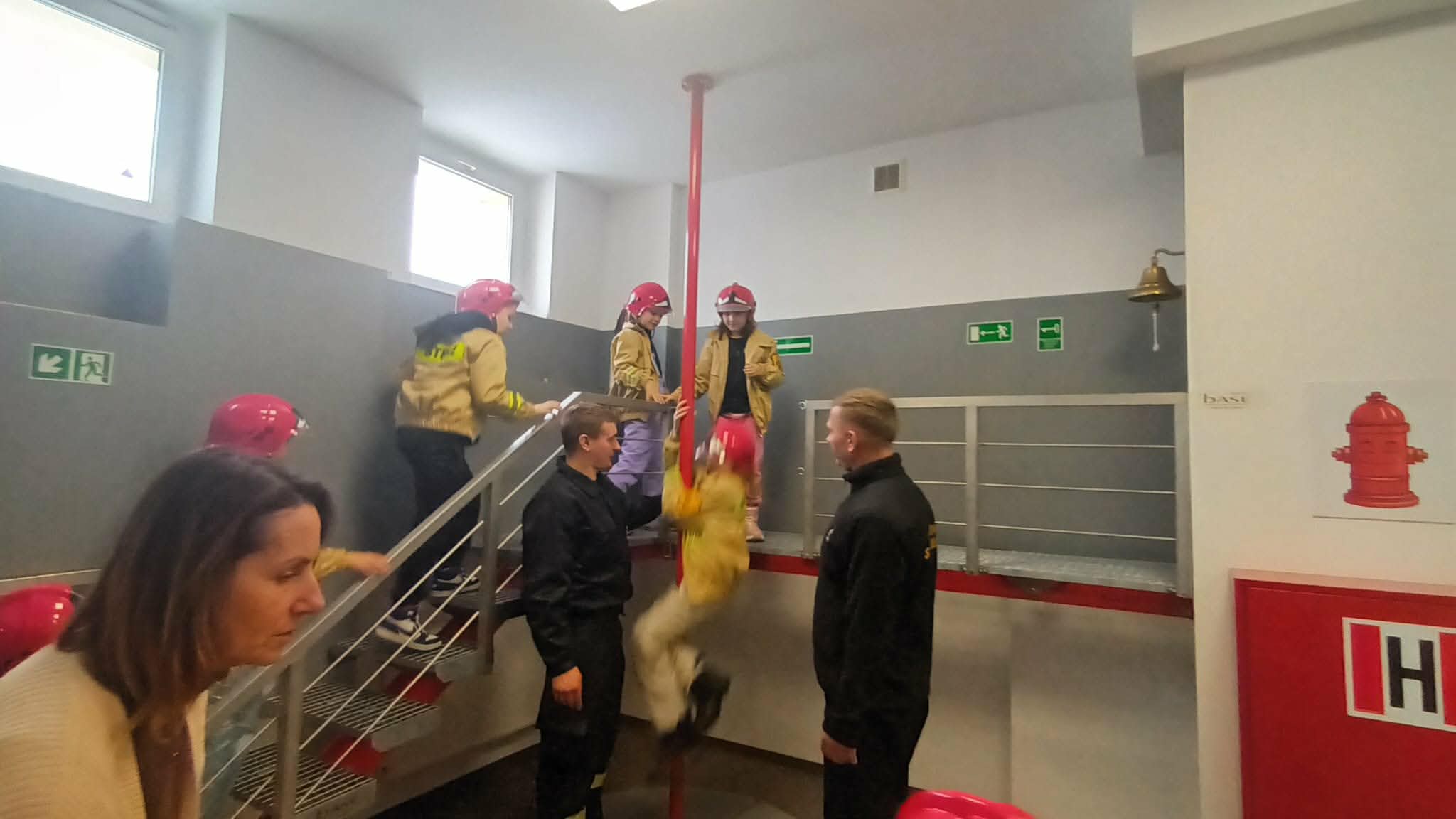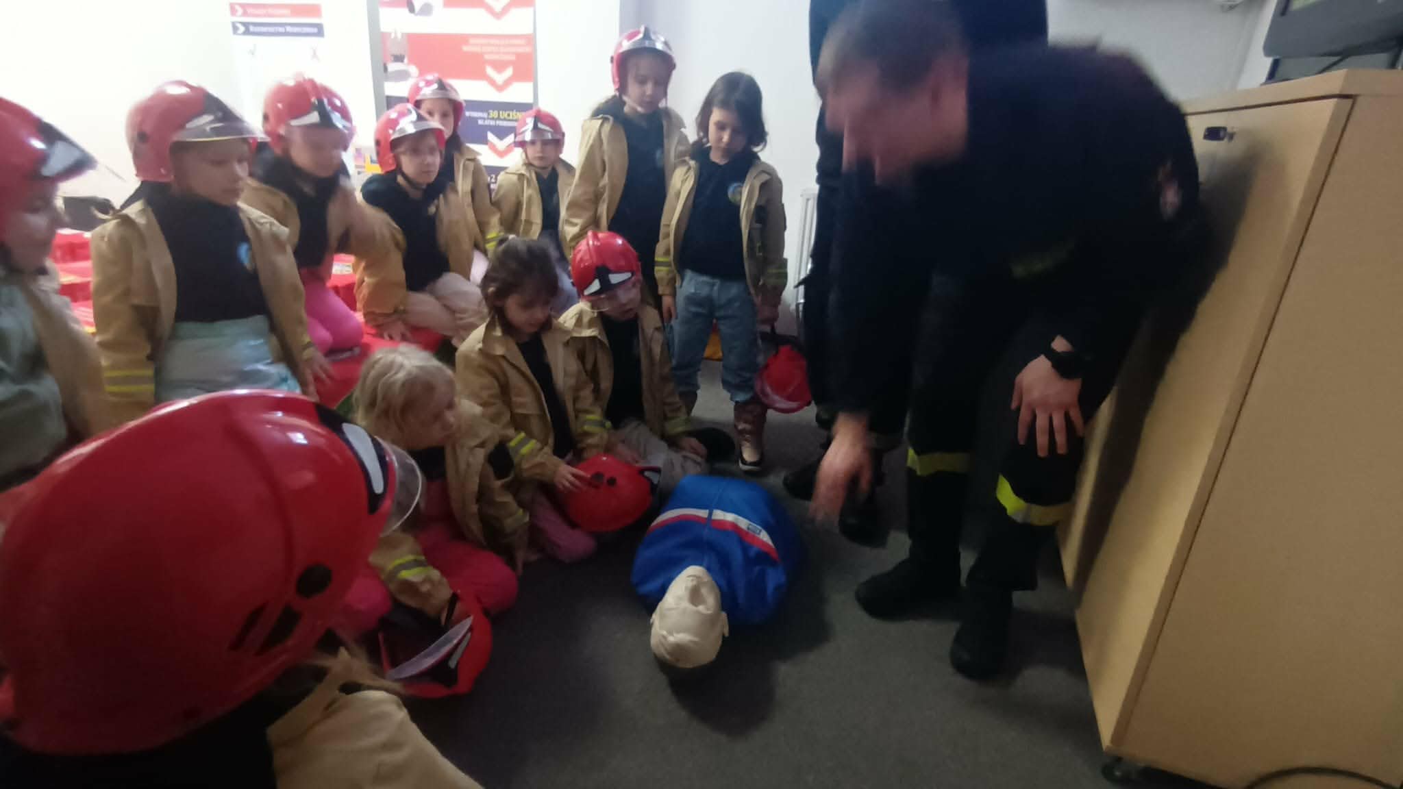 Przed wycieczką dzieci przypomniały sobie zasady bezpieczeństwa obowiązujące podczas drogi do straży oraz w samym miejscu zwiedzania. Po dotarciu na miejsce zostały serdecznie powitane przez strażaków, którzy czekali na nie w gotowości. Strażacy pokazali dzieciom swoją sprawność, zjeżdżając do nich po specjalnej rurze, co wzbudziło ogromny entuzjazm wśród małych gości.