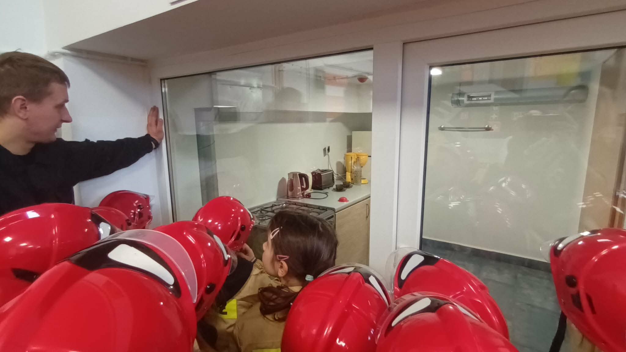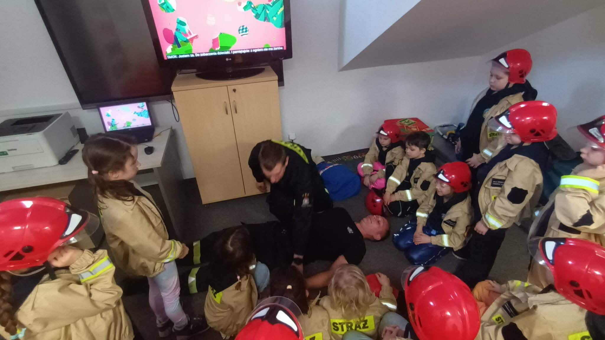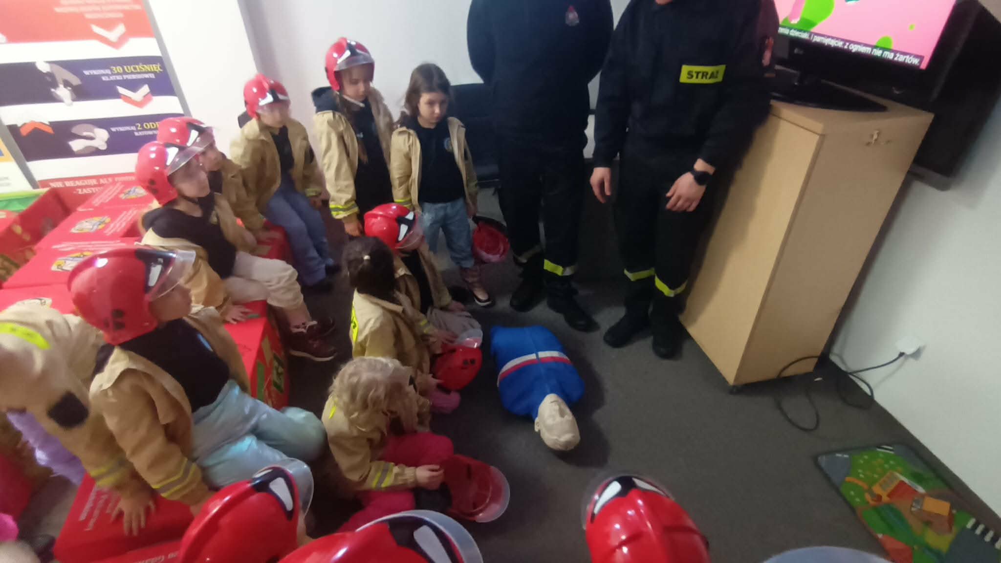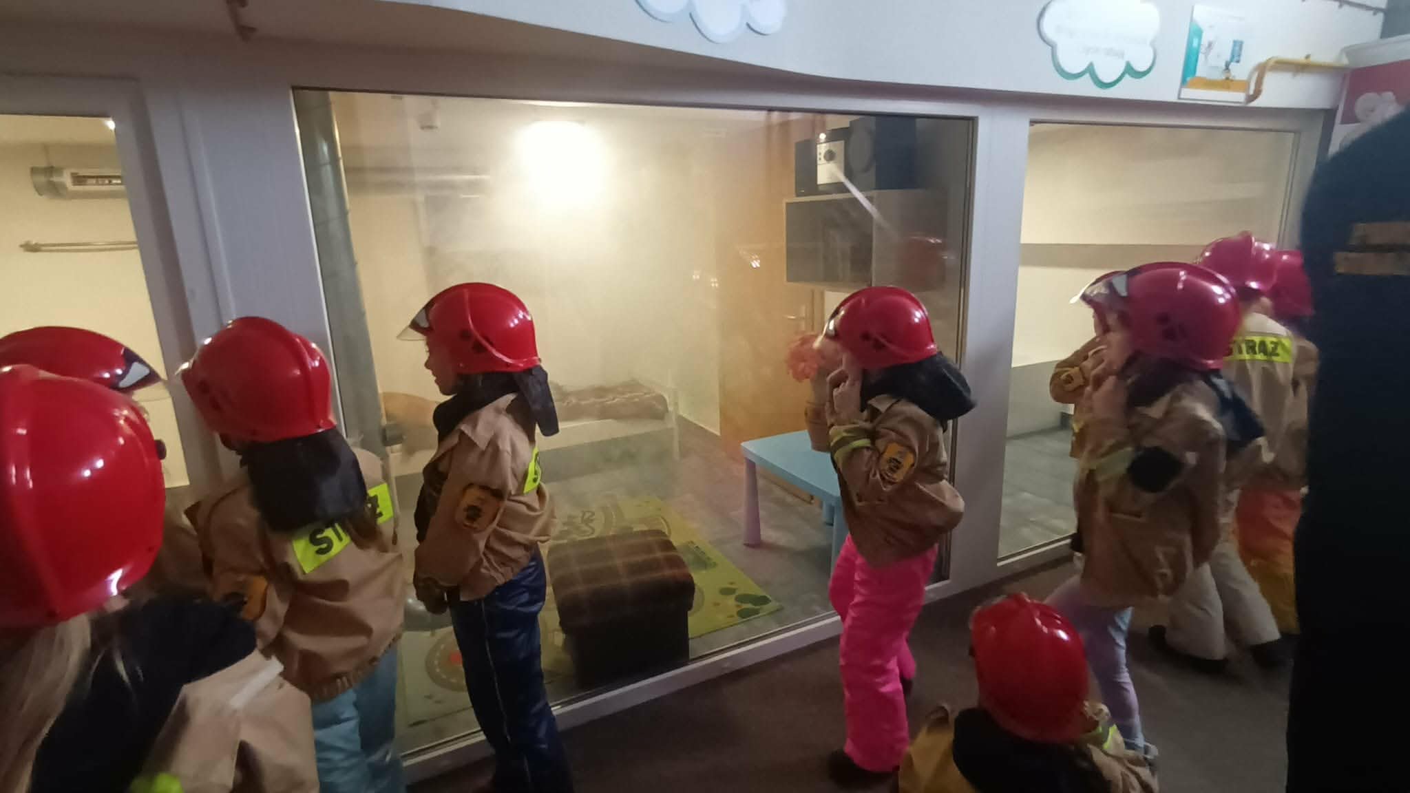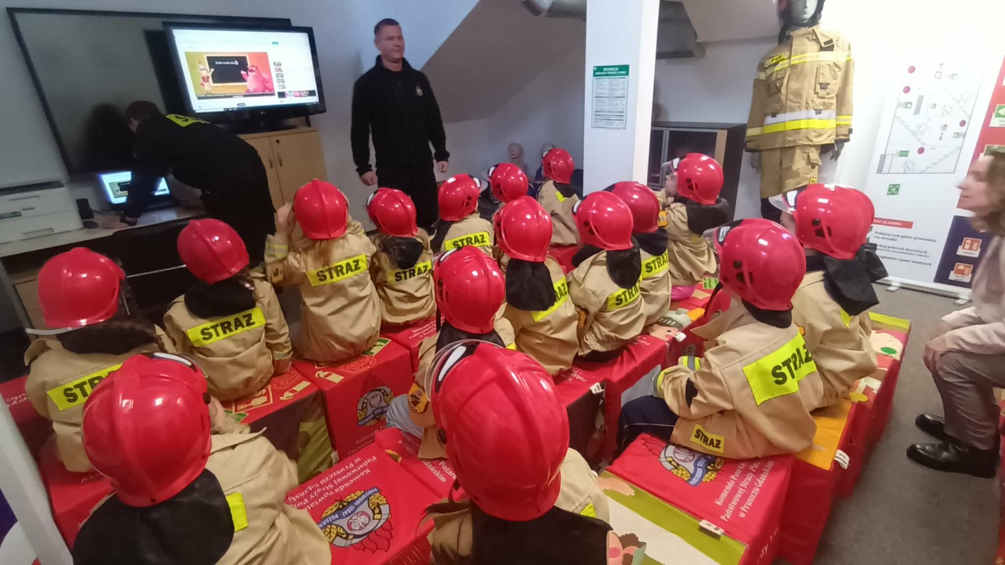 Przed wycieczką dzieci przypomniały sobie zasady bezpieczeństwa obowiązujące podczas drogi do straży oraz w samym miejscu zwiedzania. Po dotarciu na miejsce zostały serdecznie powitane przez strażaków, którzy czekali na nie w gotowości. Strażacy pokazali dzieciom swoją sprawność, zjeżdżając do nich po specjalnej rurze, co wzbudziło ogromny entuzjazm wśród małych gości.