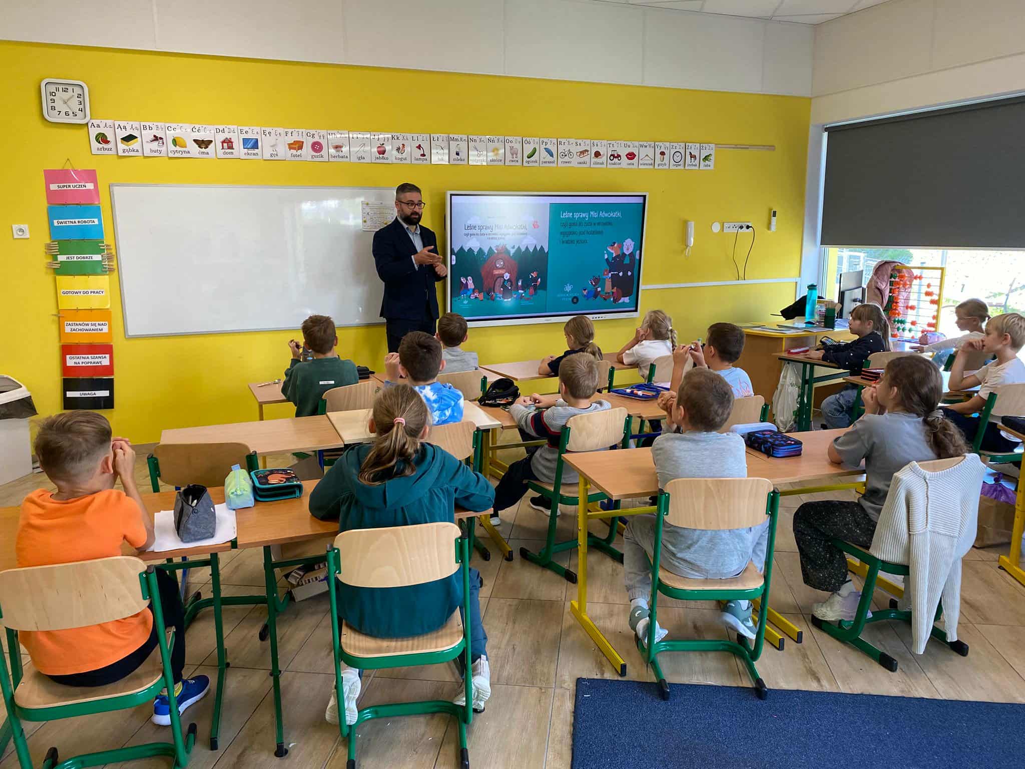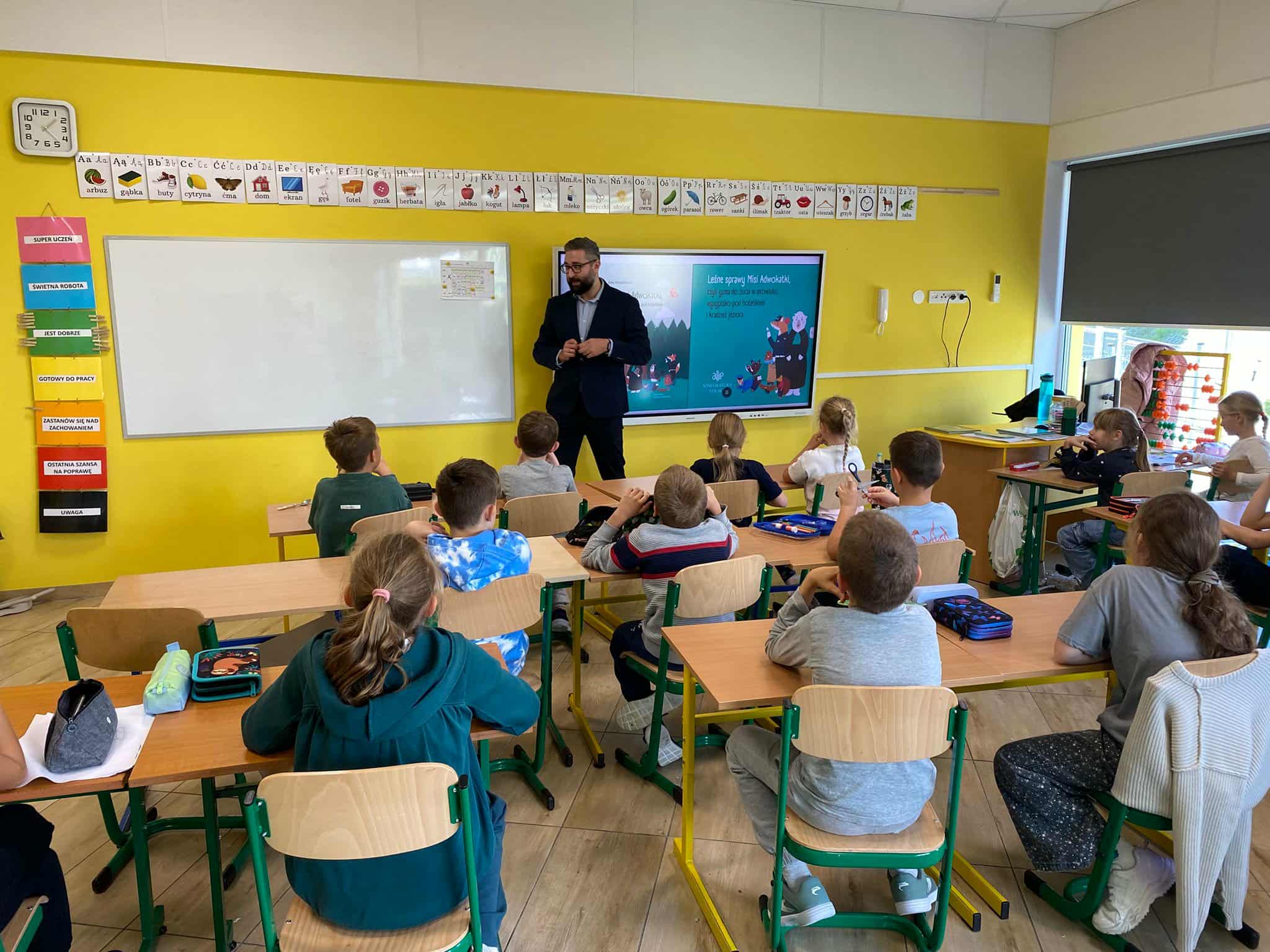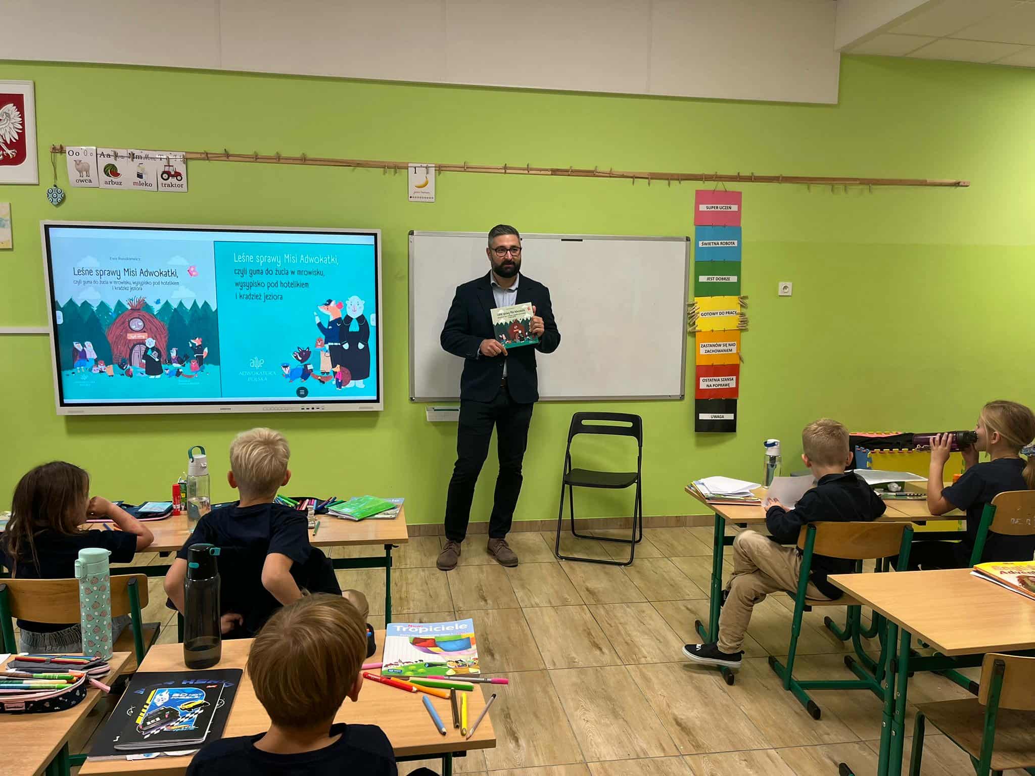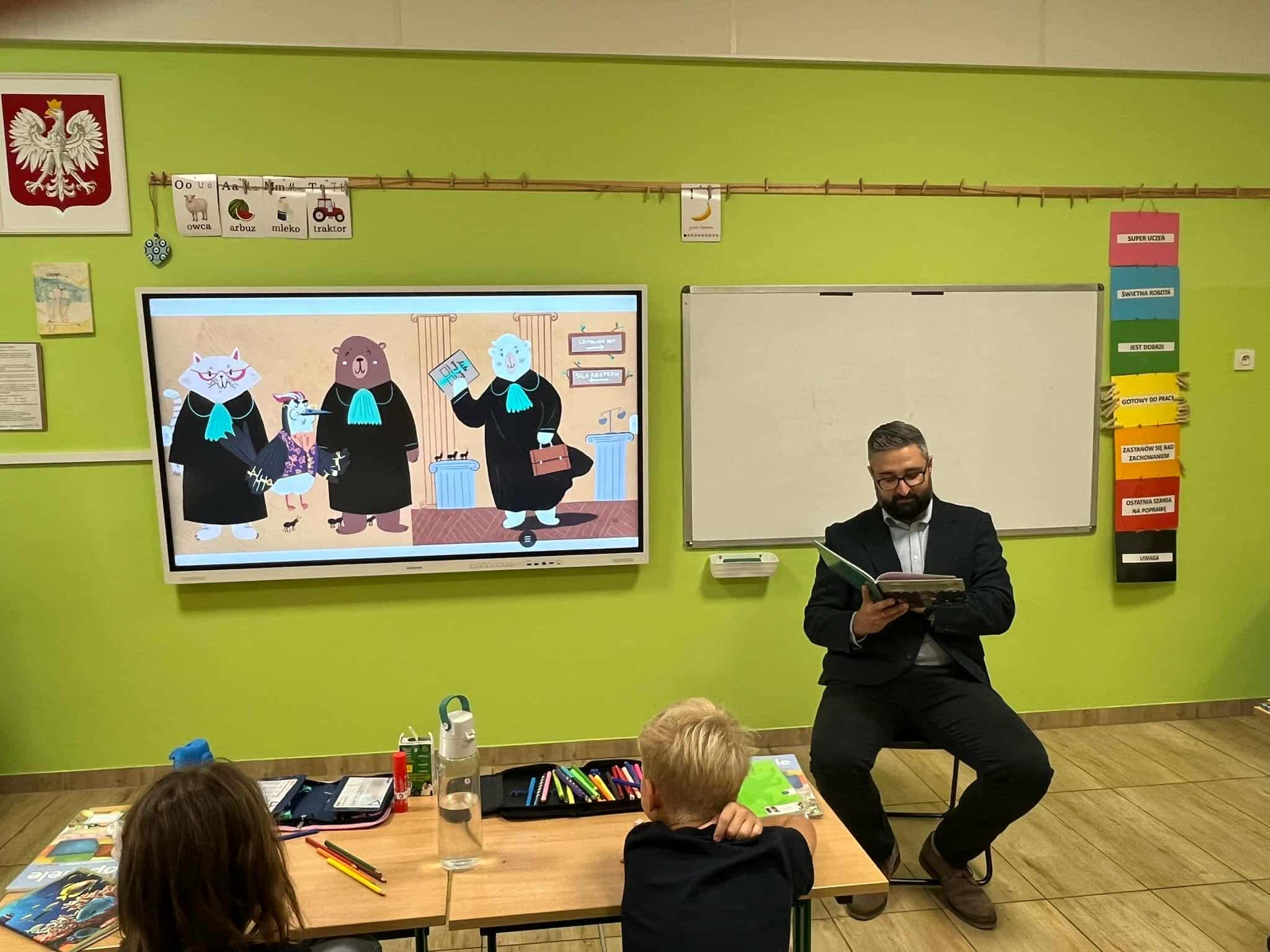 Pan mecenas przeczytał dzieciom fragmenty książek Leśne sprawy Misi Adwokatki i O leśnych sprawach aplikantów adwokackich, dzięki czemu w przystępny sposób wyjaśnił, czym zajmują się prawnicy, jakie są ich obowiązki i w jakich sprawach można się do nich zwrócić. Uczniowie dowiedzieli się, że prawnicy pomagają ludziom w rozwiązywaniu różnych problemów prawnych, takich jak sprawy związane z prawem rodzinnym, spadkowym, czy też prawem własności.