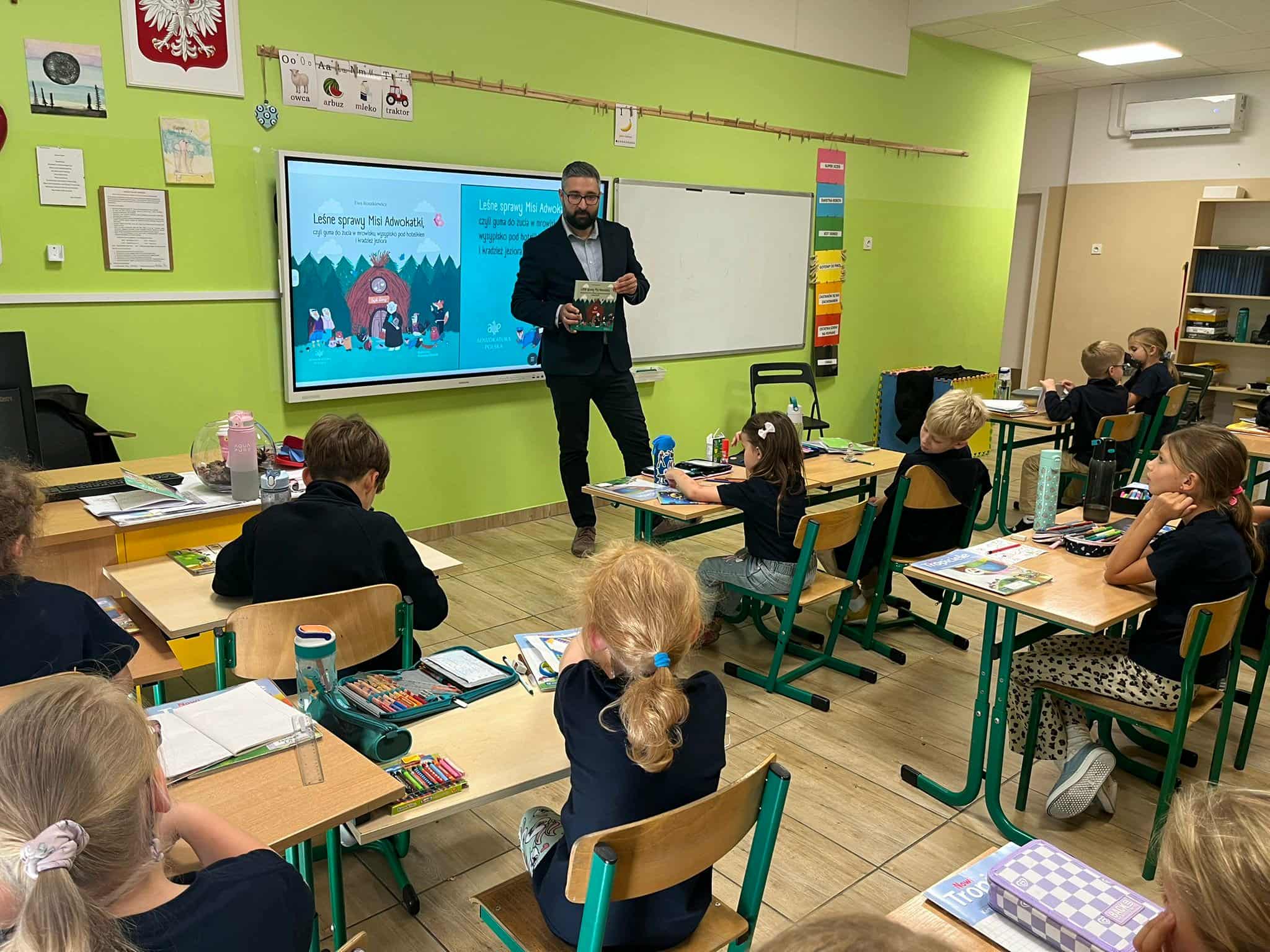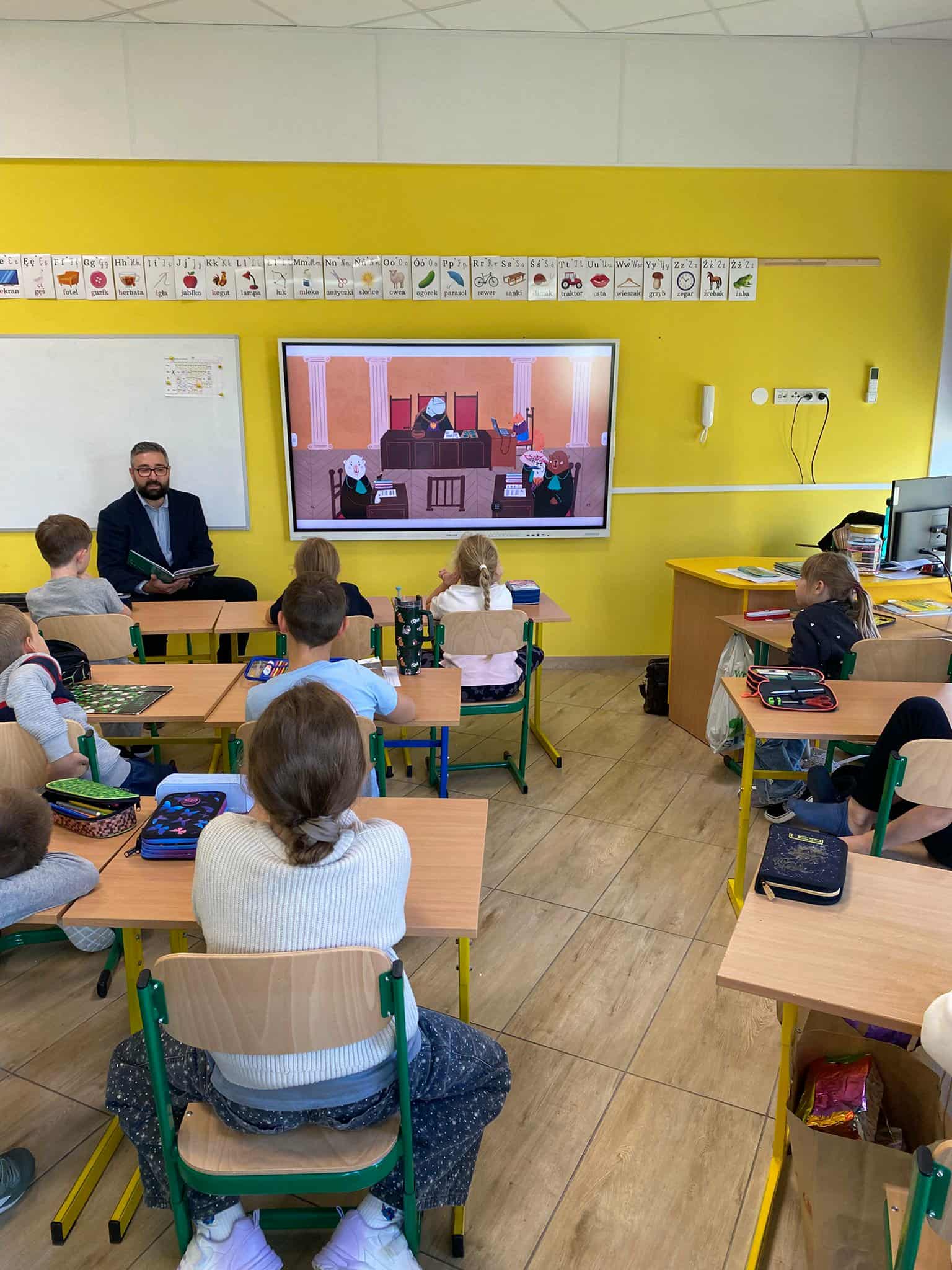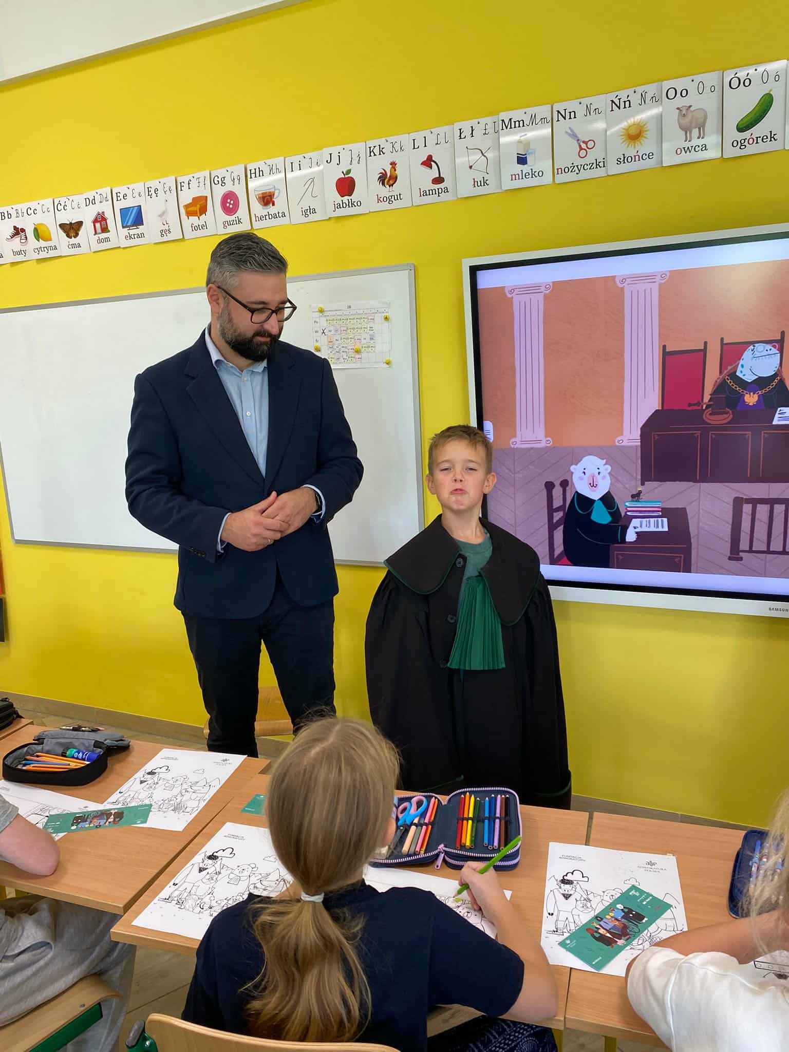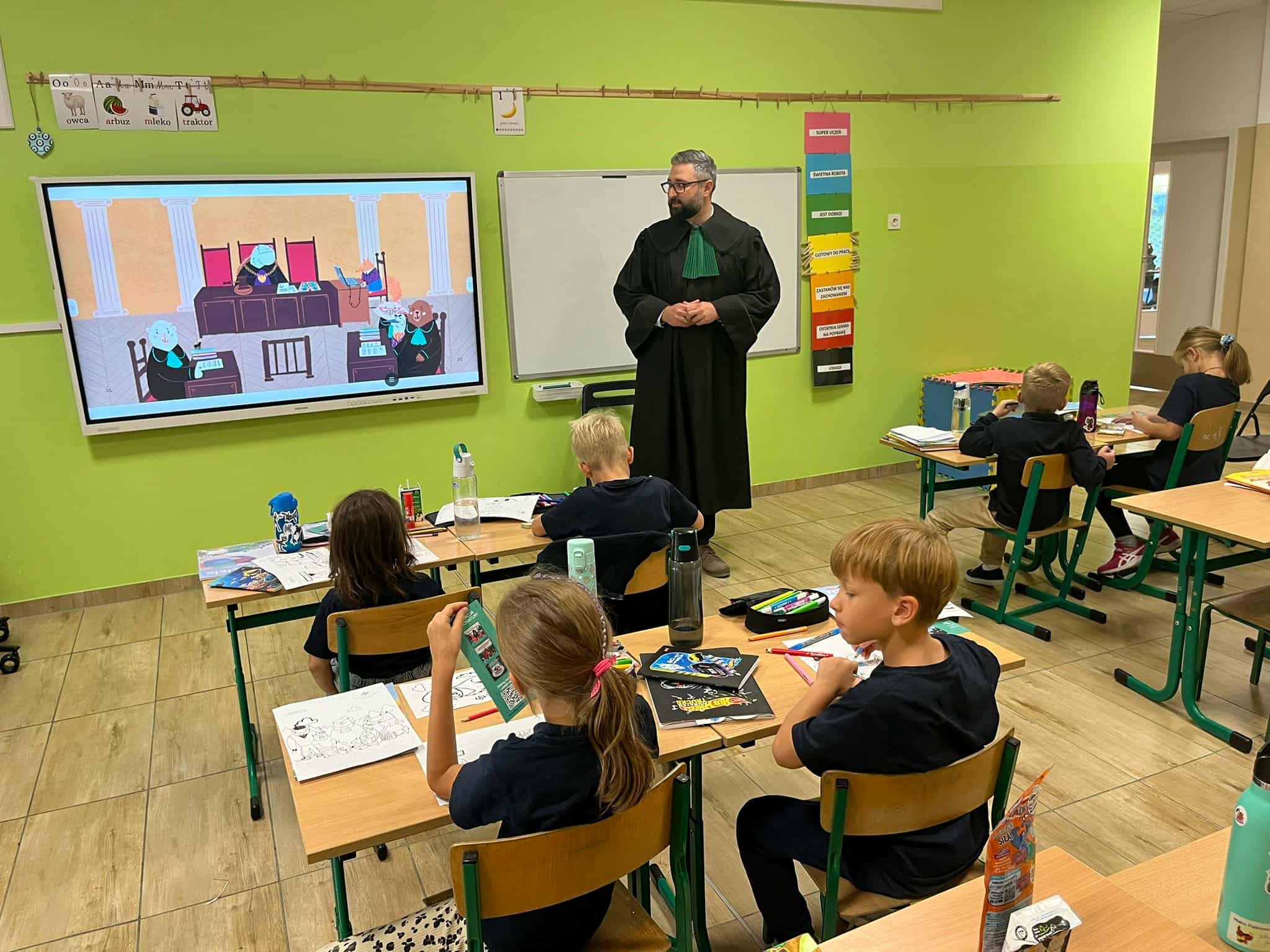 Pan mecenas przeczytał dzieciom fragmenty książek Leśne sprawy Misi Adwokatki i O leśnych sprawach aplikantów adwokackich, dzięki czemu w przystępny sposób wyjaśnił, czym zajmują się prawnicy, jakie są ich obowiązki i w jakich sprawach można się do nich zwrócić. Uczniowie dowiedzieli się, że prawnicy pomagają ludziom w rozwiązywaniu różnych problemów prawnych, takich jak sprawy związane z prawem rodzinnym, spadkowym, czy też prawem własności.