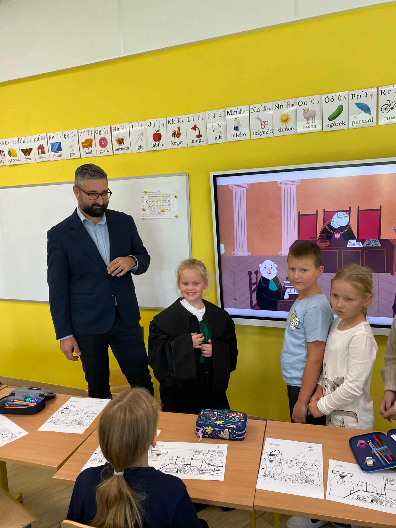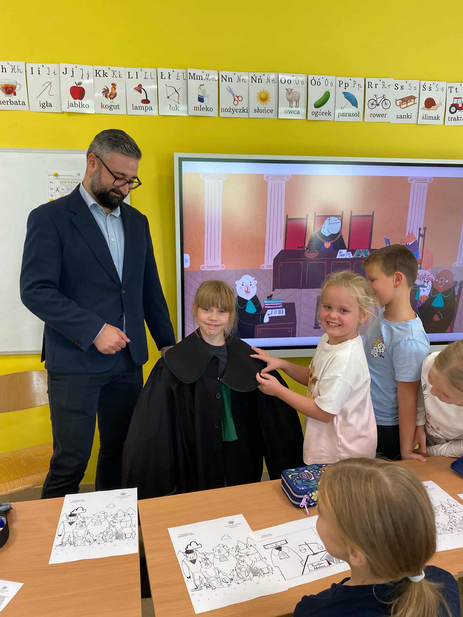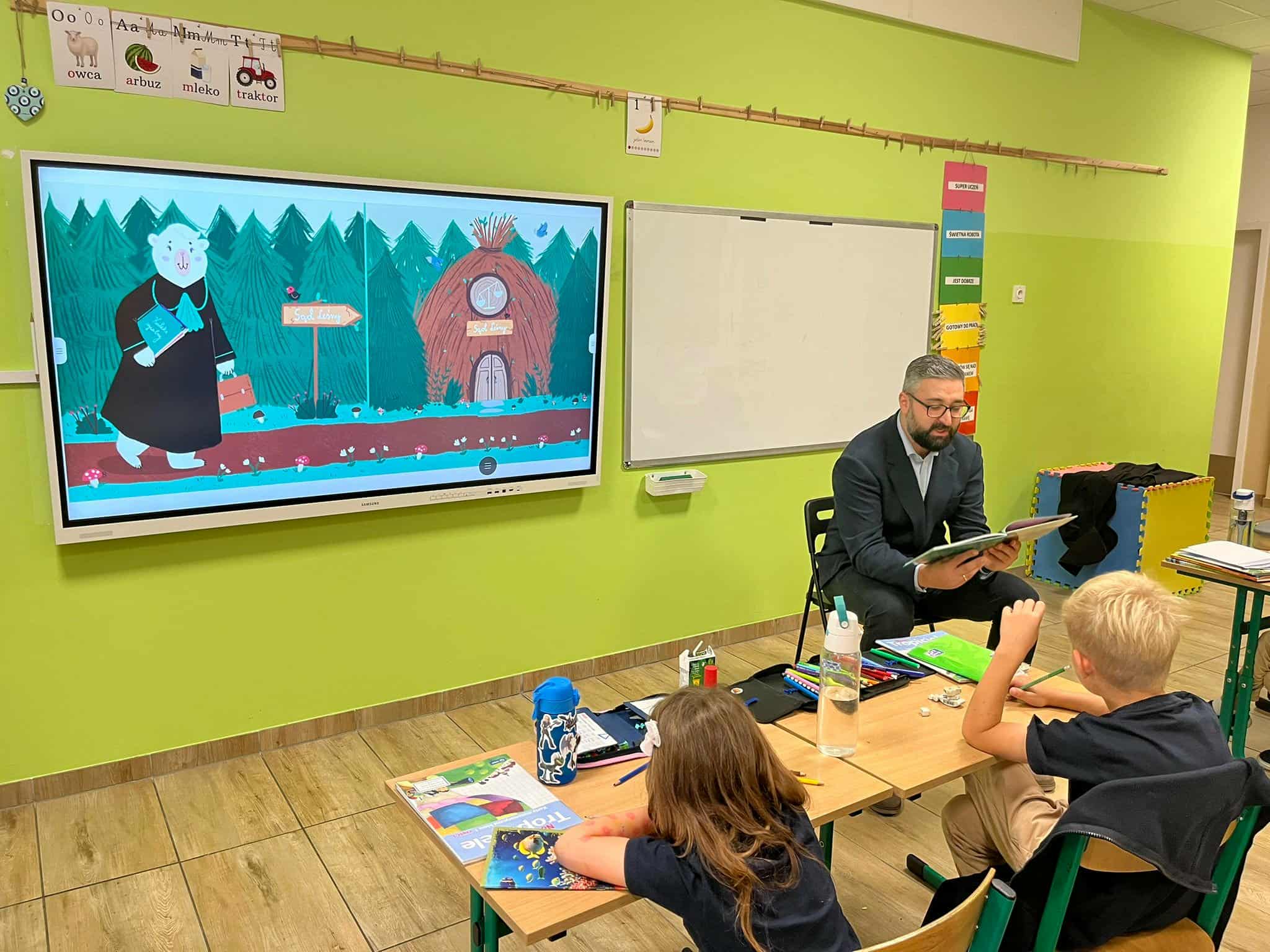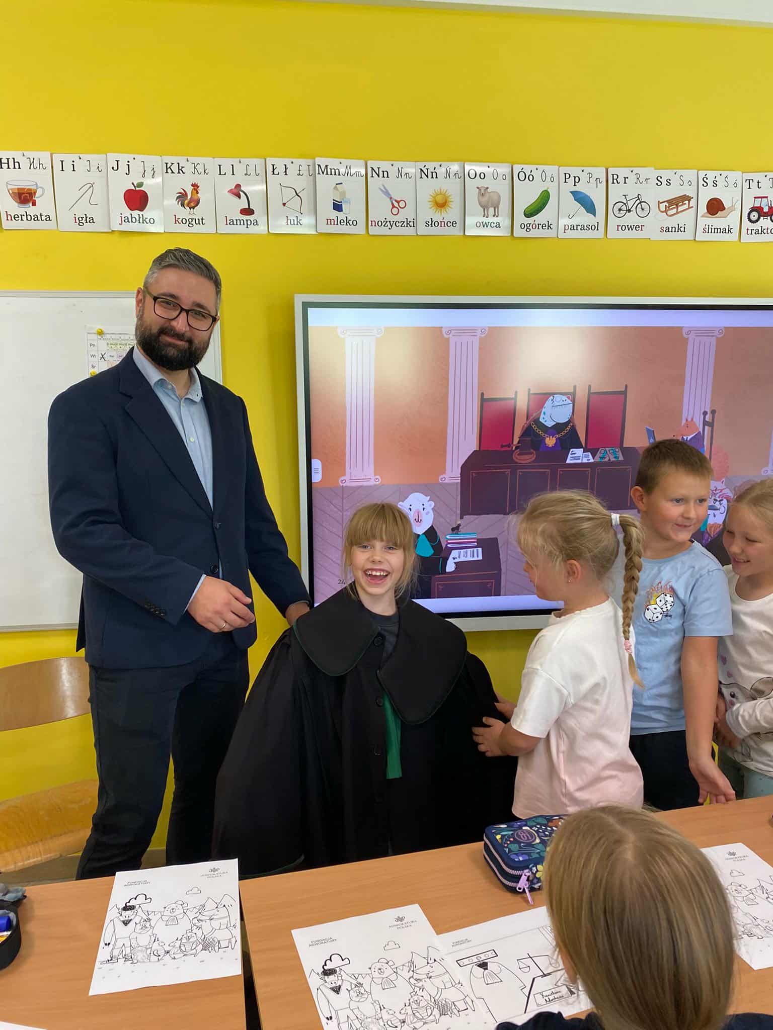Pan mecenas przeczytał dzieciom fragmenty książek Leśne sprawy Misi Adwokatki i O leśnych sprawach aplikantów adwokackich, dzięki czemu w przystępny sposób wyjaśnił, czym zajmują się prawnicy, jakie są ich obowiązki i w jakich sprawach można się do nich zwrócić. Uczniowie dowiedzieli się, że prawnicy pomagają ludziom w rozwiązywaniu różnych problemów prawnych, takich jak sprawy związane z prawem rodzinnym, spadkowym, czy też prawem własności.
