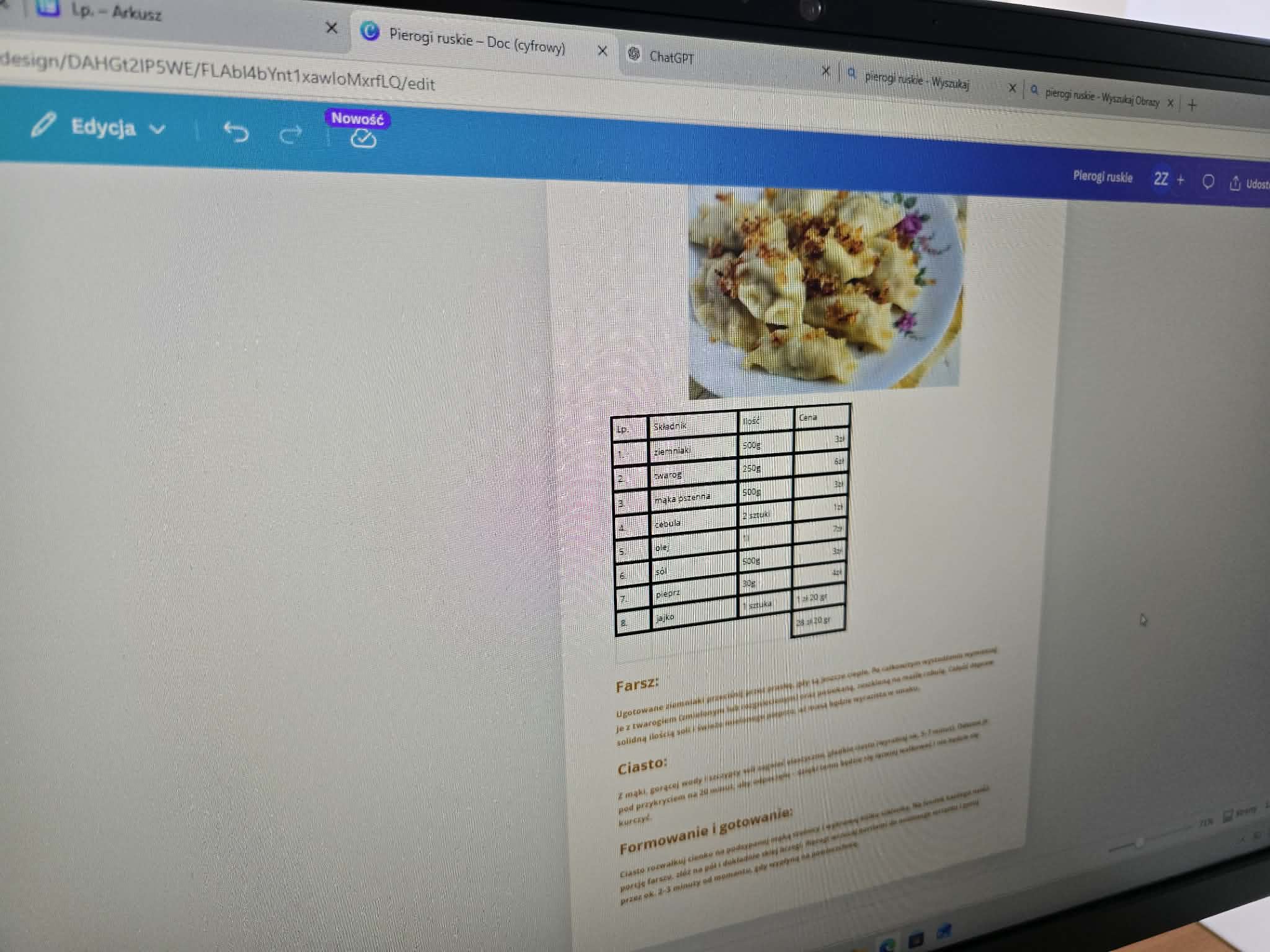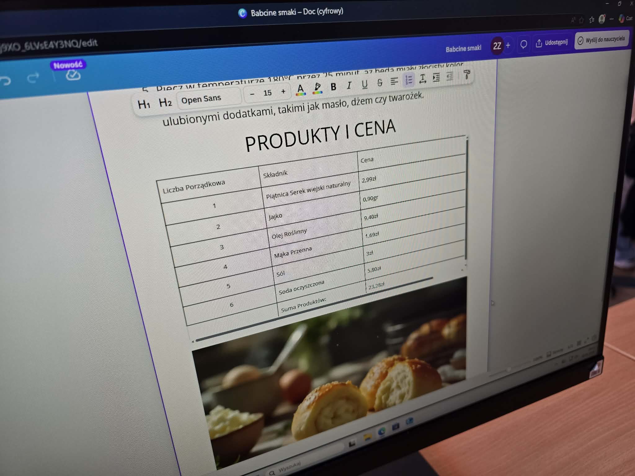 Po wykonaniu obliczeń uczniowie przenosili gotowe tabele z arkusza kalkulacyjnego do dokumentu tekstowego. W ten sposób powstały kompletne, profesjonalnie wyglądające strony książki kucharskiej, łączące tekst, dane i estetyczną formę.