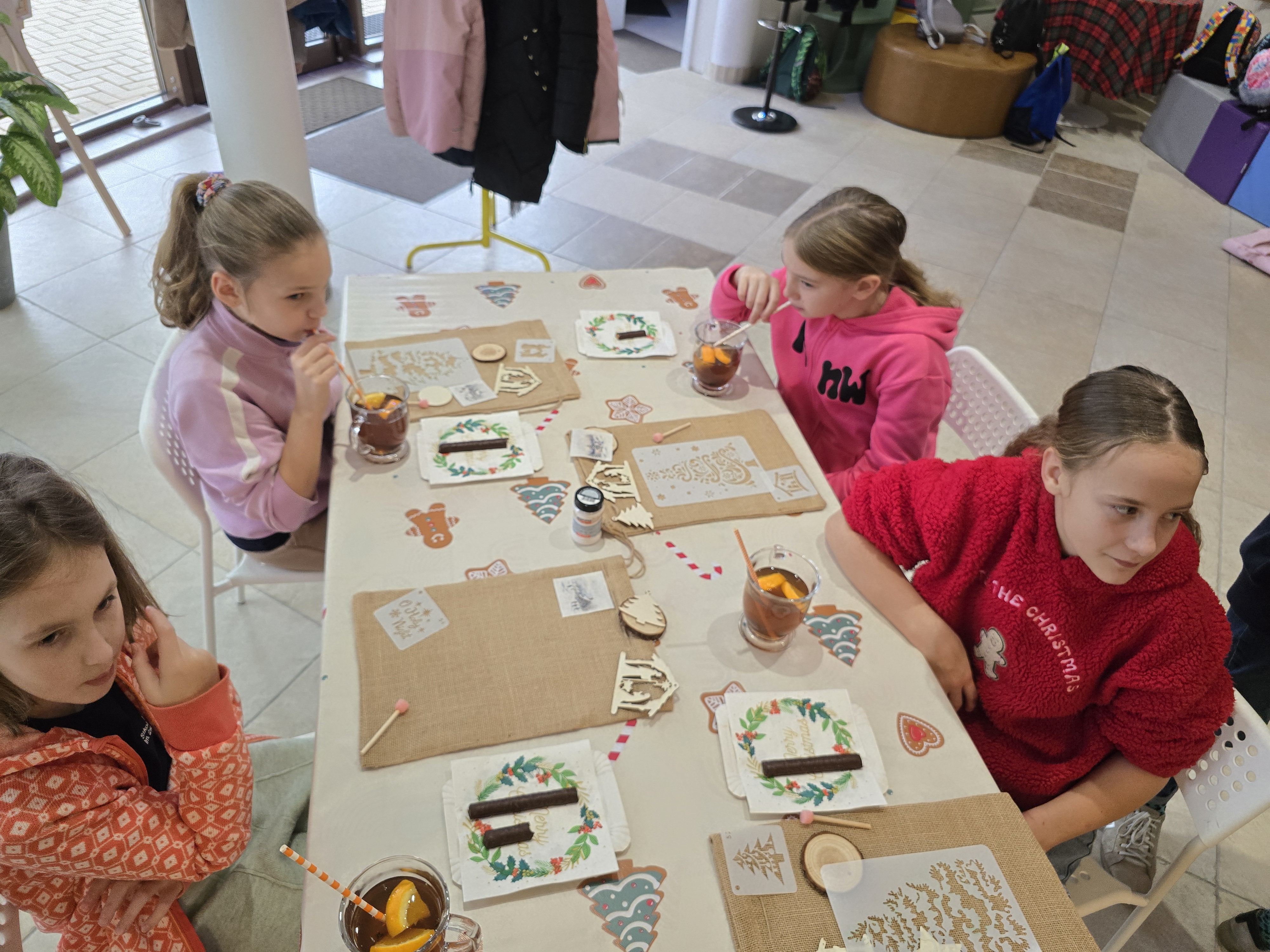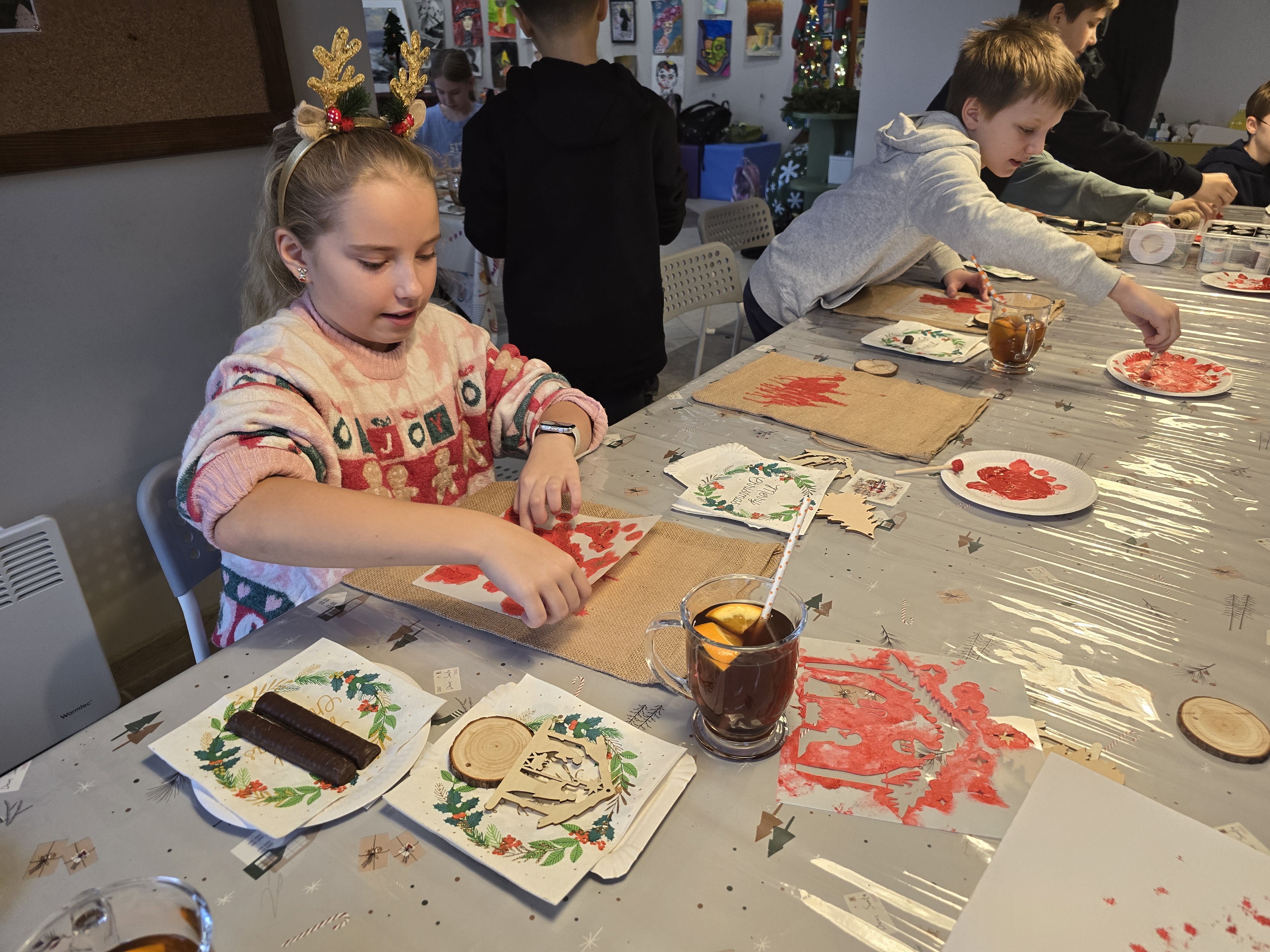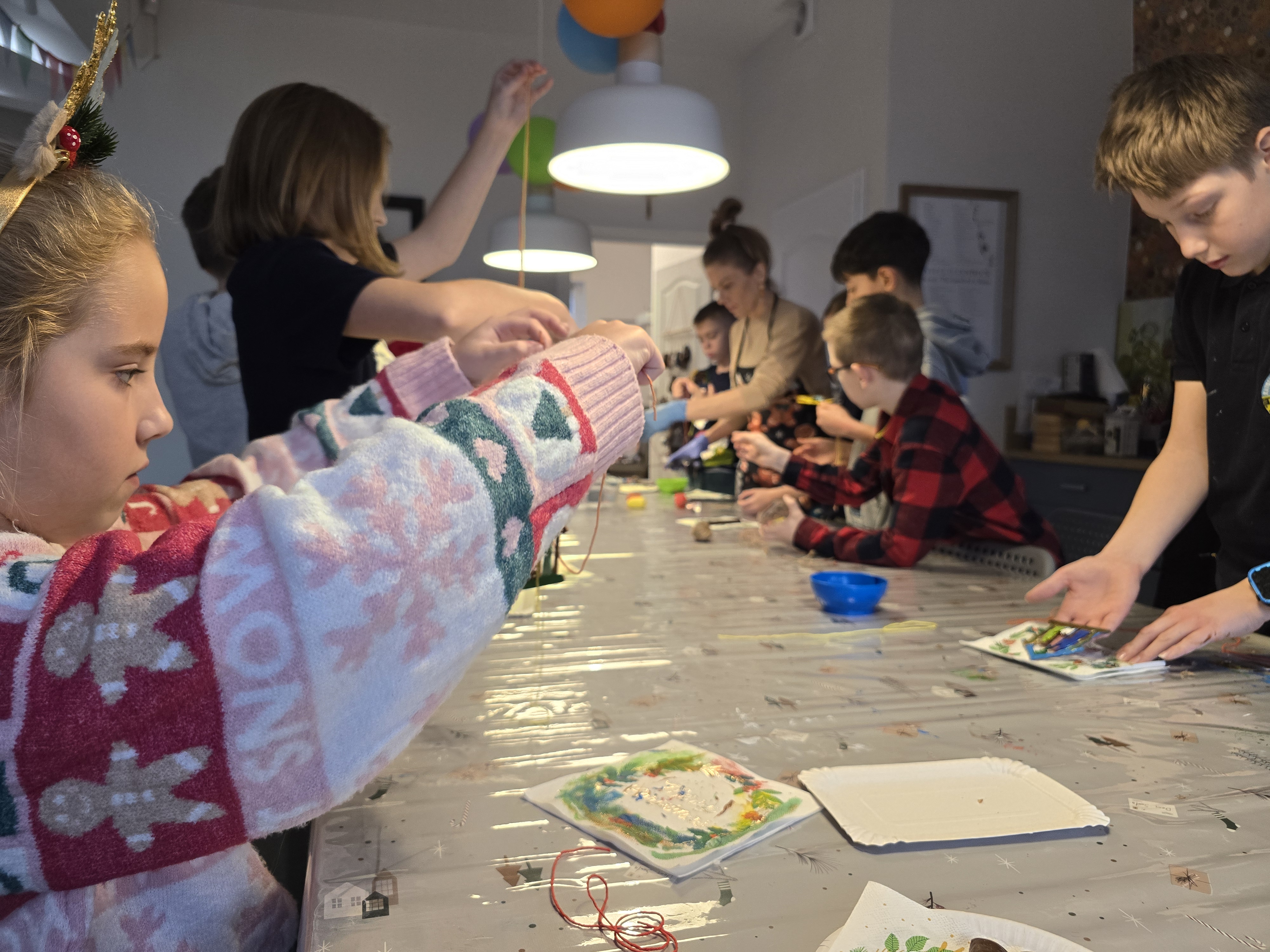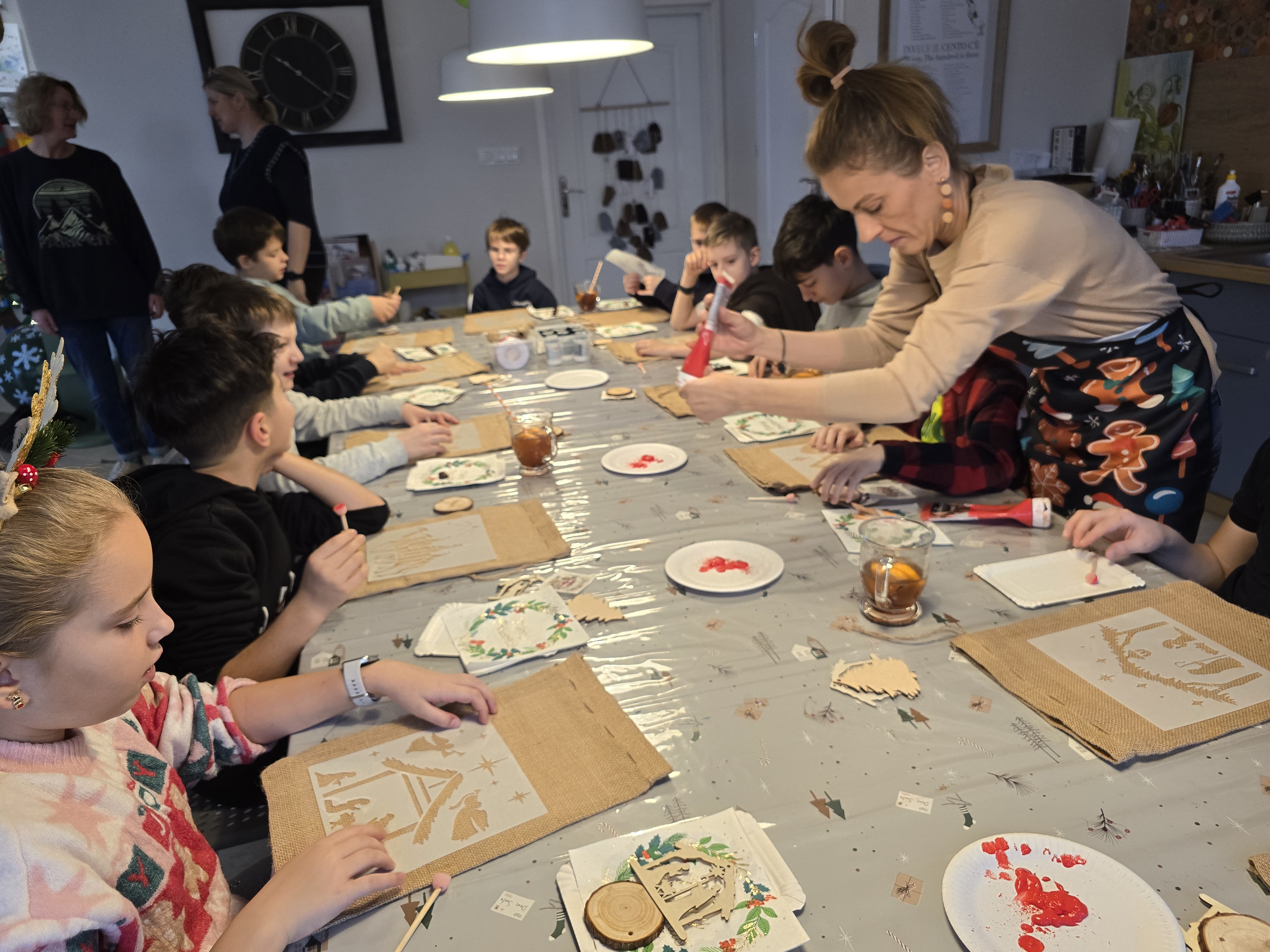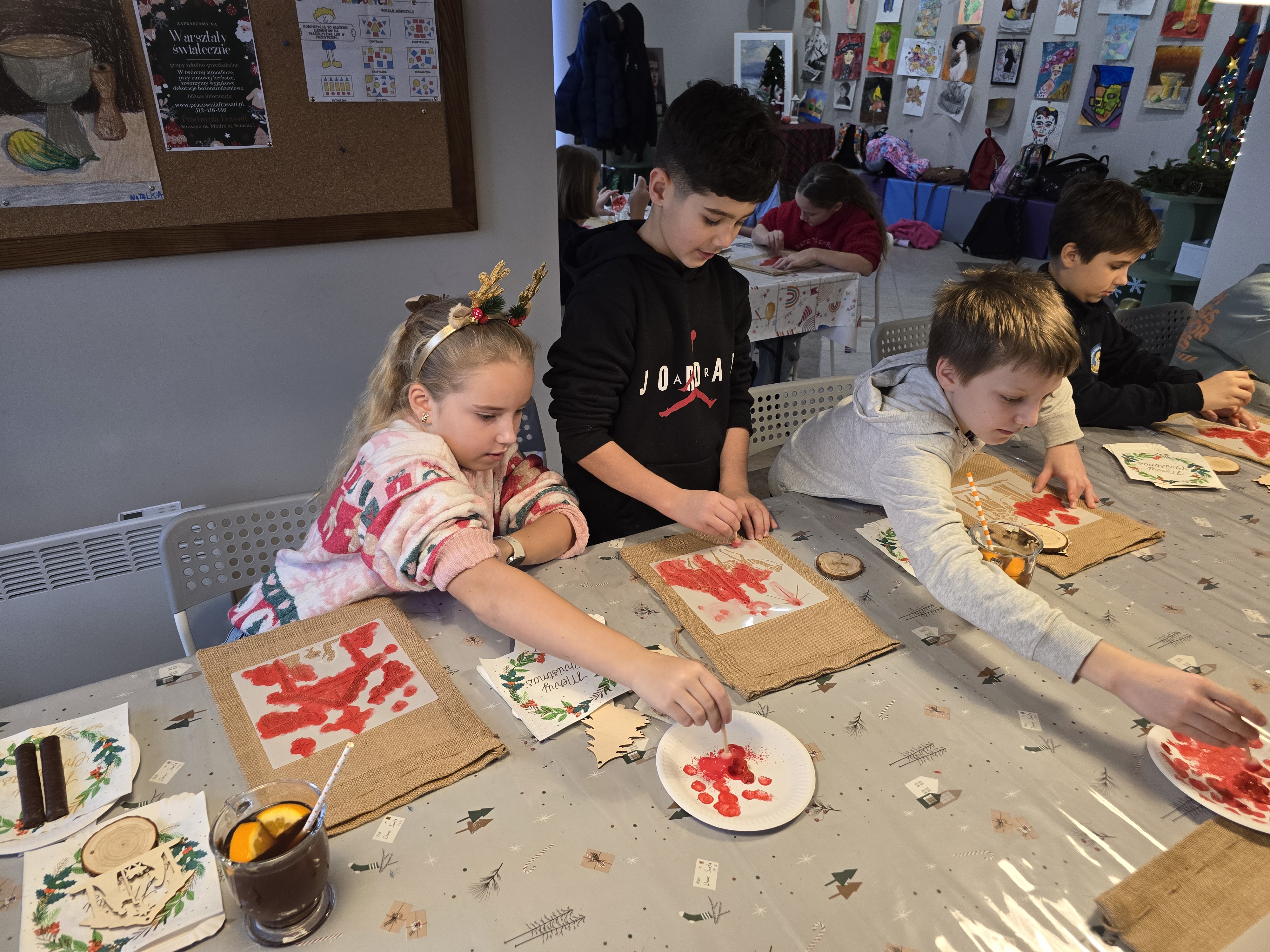 Atmosfera w pracowni była wyjątkowo miła i przyjazna. Dzieci pracowały w skupieniu, ale jednocześnie wesoło rozmawiały, wymieniały się pomysłami i śmiały się do łez. Prowadzący warsztaty dbali o to, aby każdy czuł się swobodnie i mógł wyrazić swoją kreatywność. W tle rozbrzmiewały dźwięki kolęd, które dodatkowo wprowadzały w świąteczny nastrój. Śpiewane przez dzieci, kolędy wypełniały pomieszczenie radością i wzruszeniem, tworząc niezapomnianą atmosferę.
