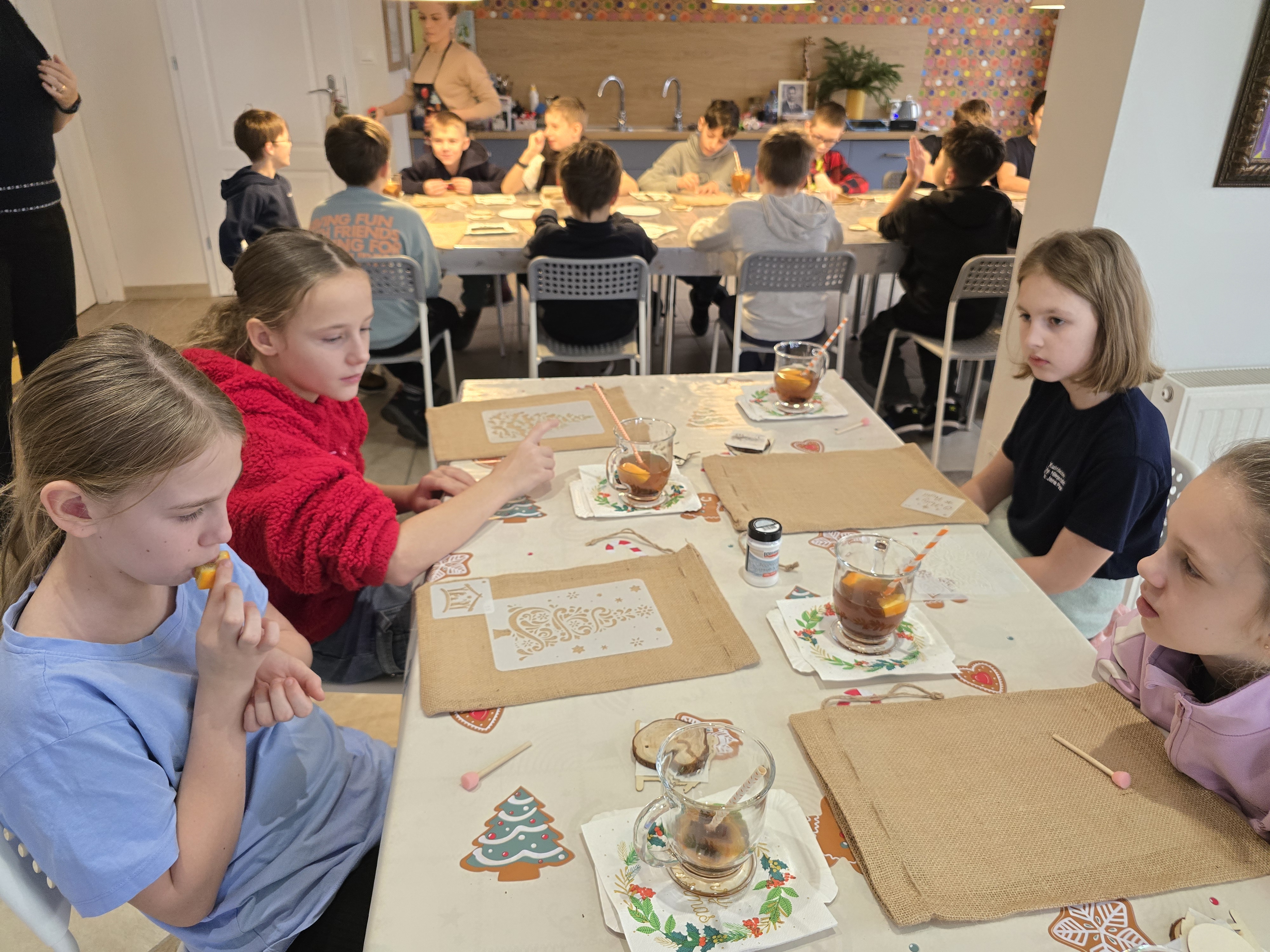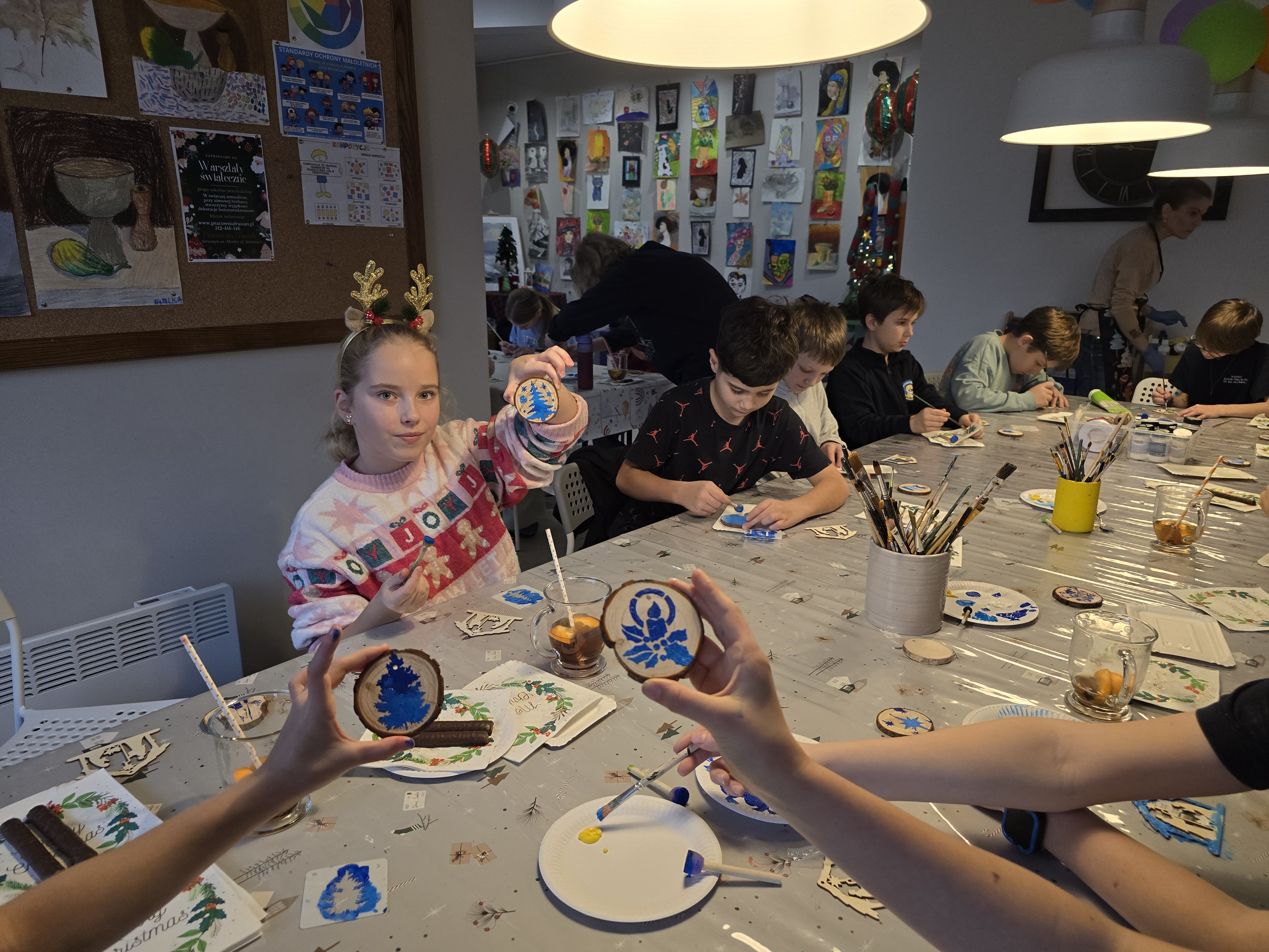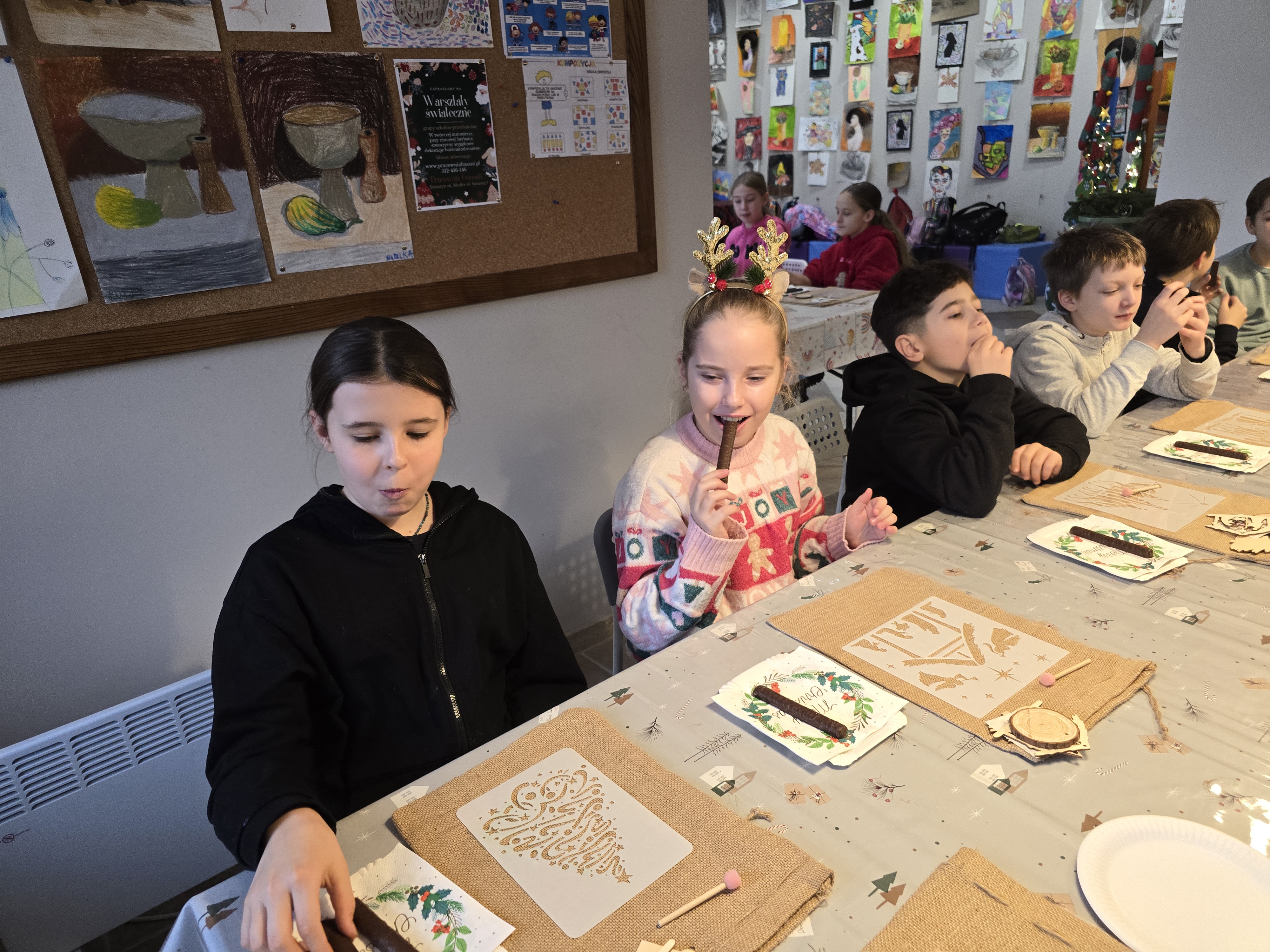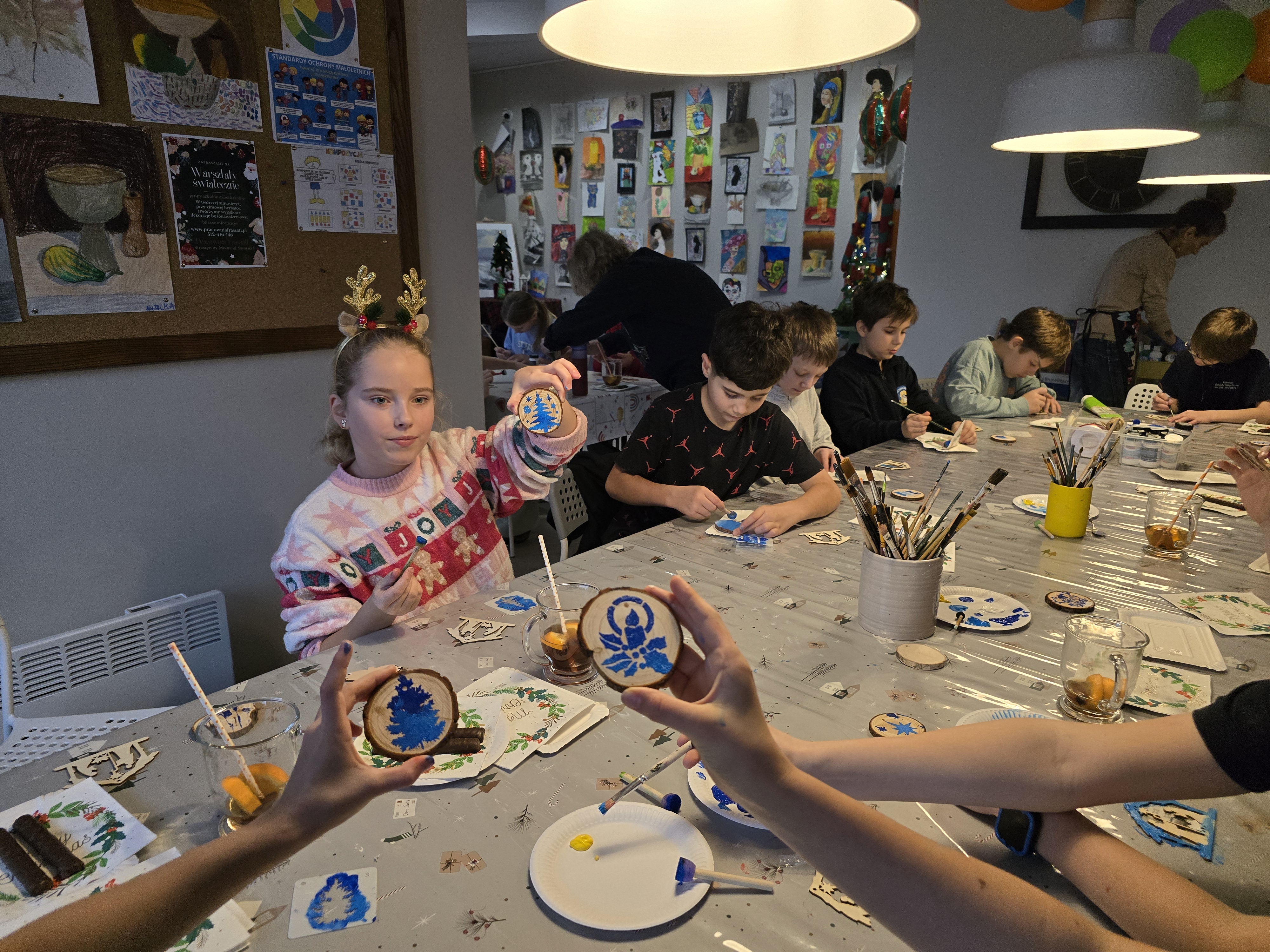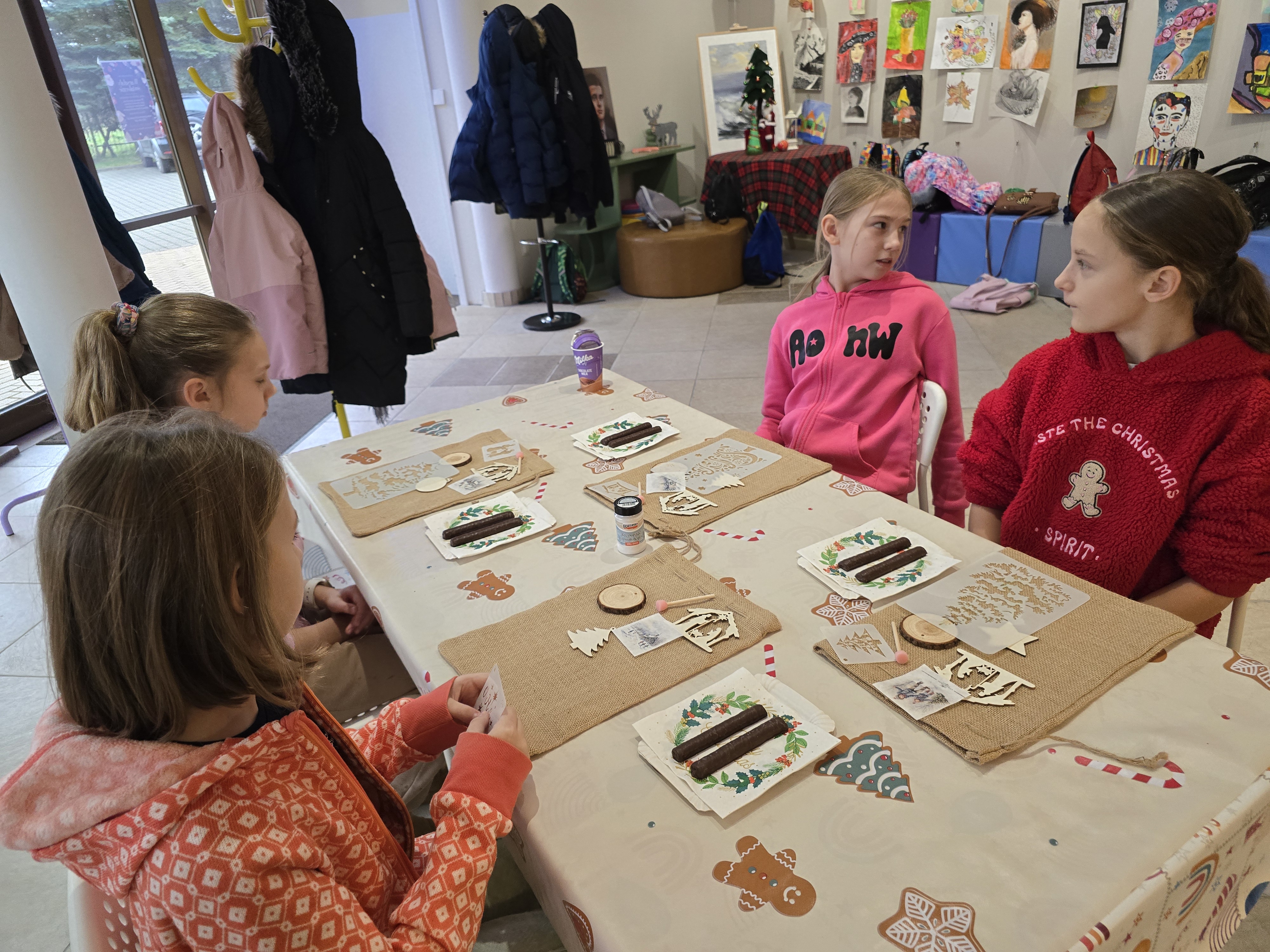 Atmosfera w pracowni była wyjątkowo miła i przyjazna. Dzieci pracowały w skupieniu, ale jednocześnie wesoło rozmawiały, wymieniały się pomysłami i śmiały się do łez. Prowadzący warsztaty dbali o to, aby każdy czuł się swobodnie i mógł wyrazić swoją kreatywność. W tle rozbrzmiewały dźwięki kolęd, które dodatkowo wprowadzały w świąteczny nastrój. Śpiewane przez dzieci, kolędy wypełniały pomieszczenie radością i wzruszeniem, tworząc niezapomnianą atmosferę.