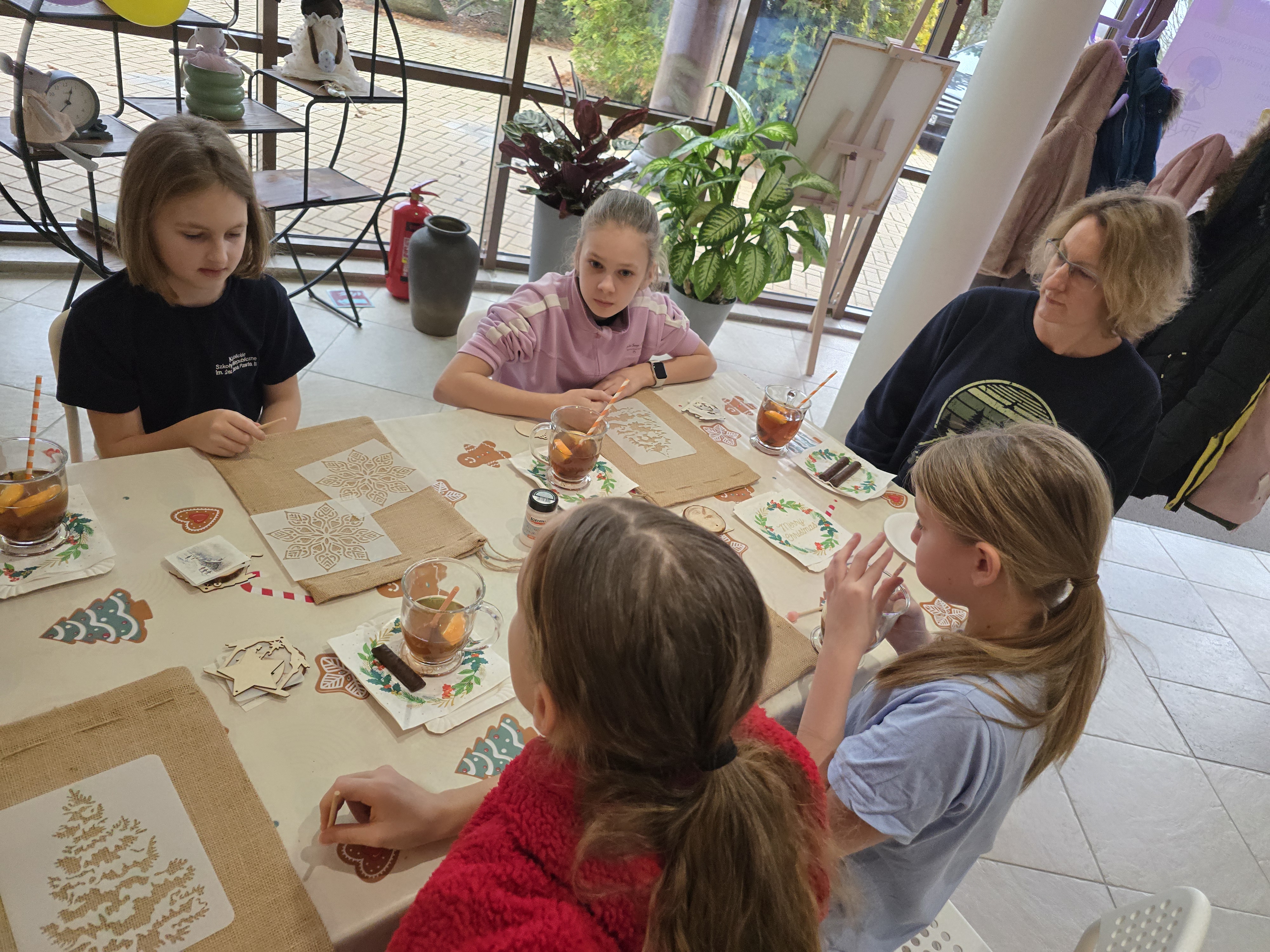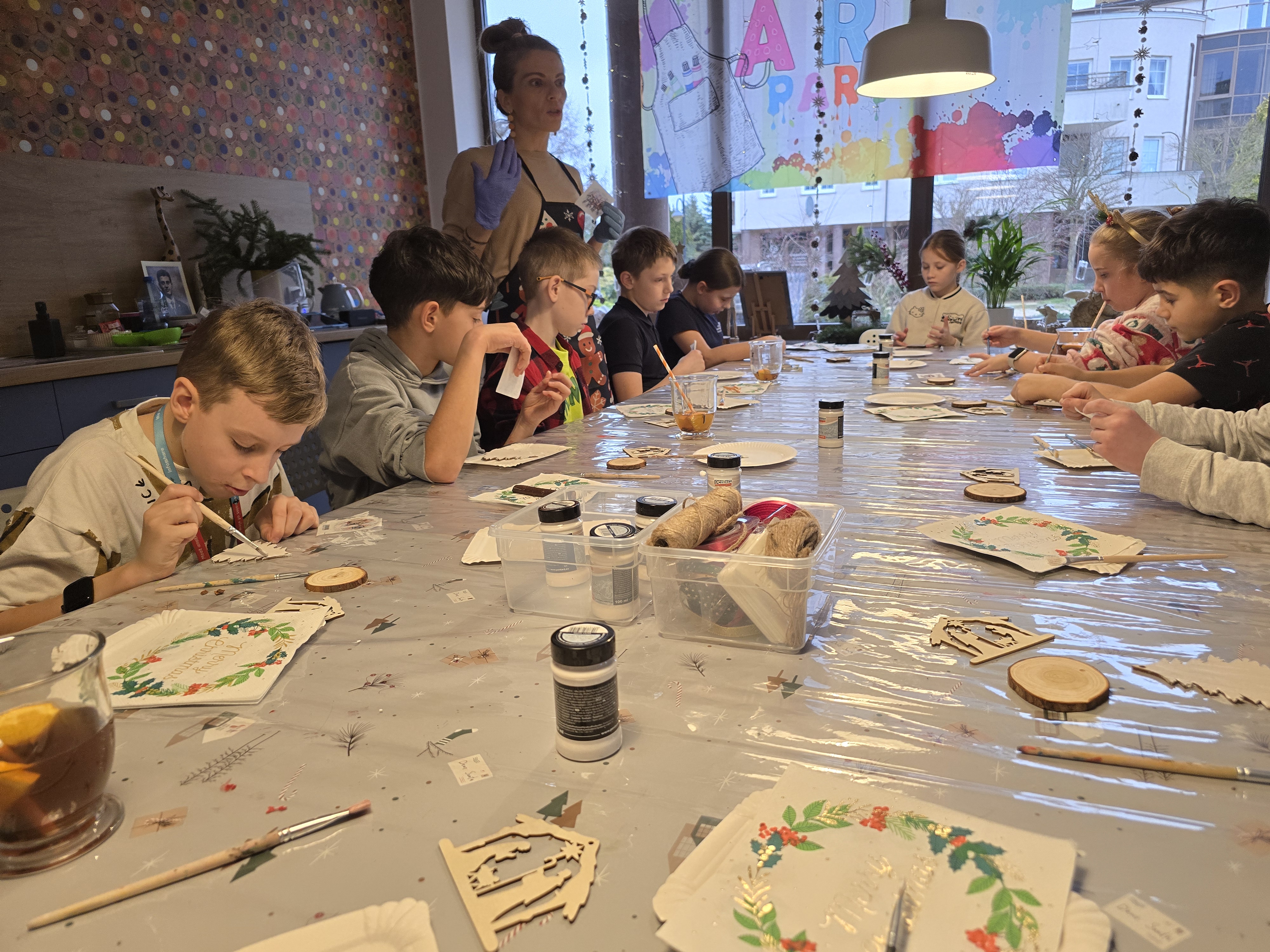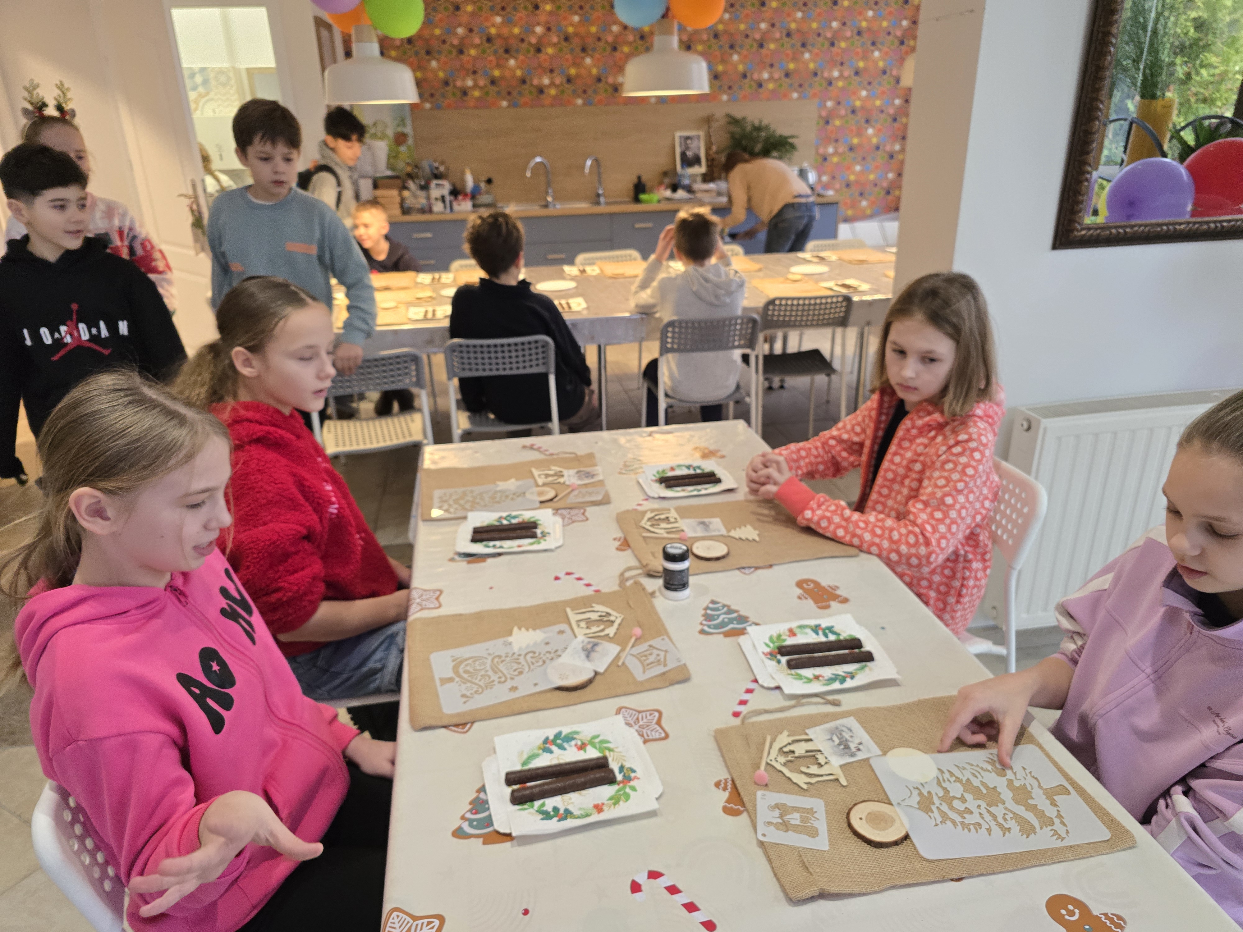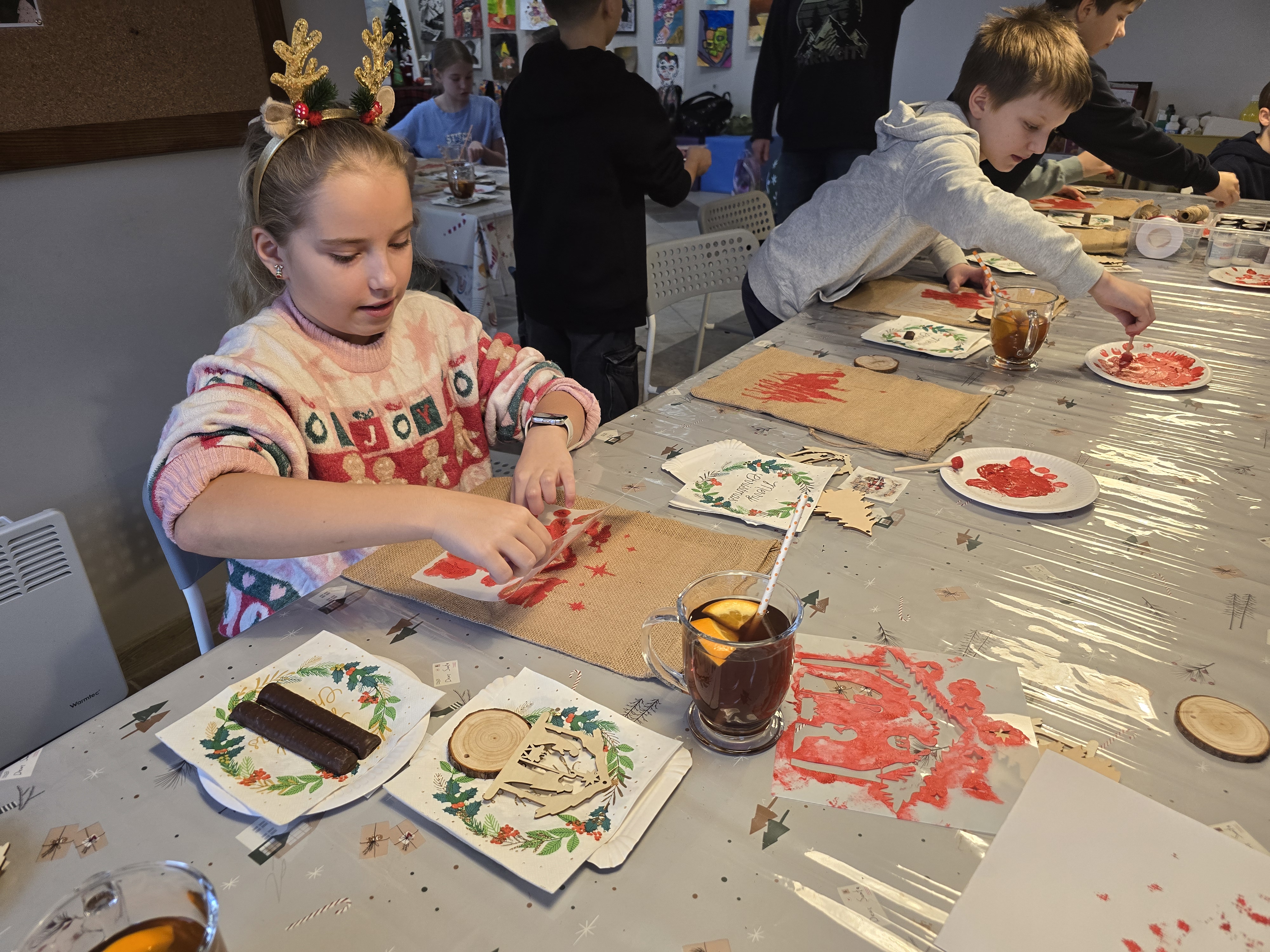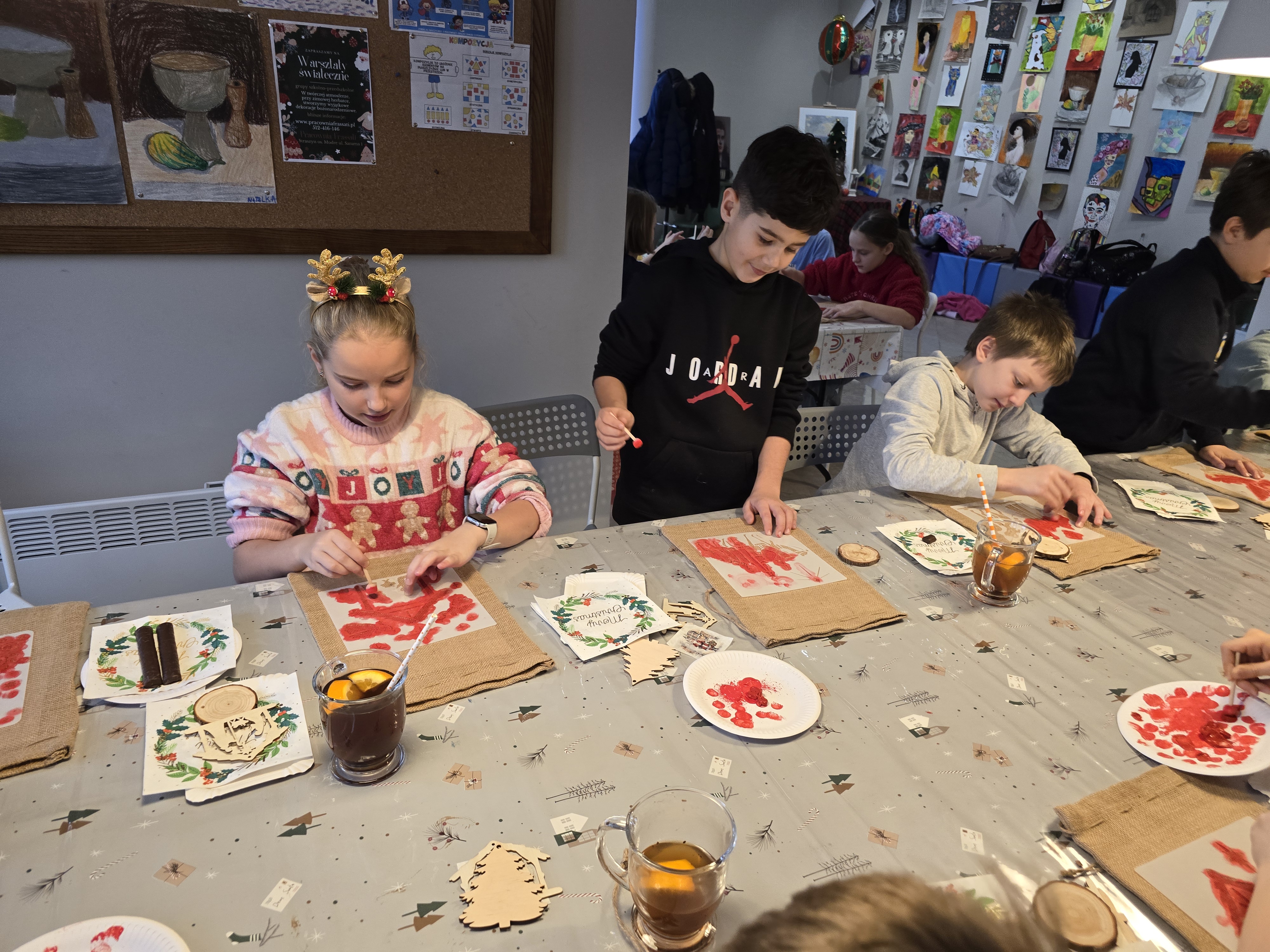 Atmosfera w pracowni była wyjątkowo miła i przyjazna. Dzieci pracowały w skupieniu, ale jednocześnie wesoło rozmawiały, wymieniały się pomysłami i śmiały się do łez. Prowadzący warsztaty dbali o to, aby każdy czuł się swobodnie i mógł wyrazić swoją kreatywność. W tle rozbrzmiewały dźwięki kolęd, które dodatkowo wprowadzały w świąteczny nastrój. Śpiewane przez dzieci, kolędy wypełniały pomieszczenie radością i wzruszeniem, tworząc niezapomnianą atmosferę.