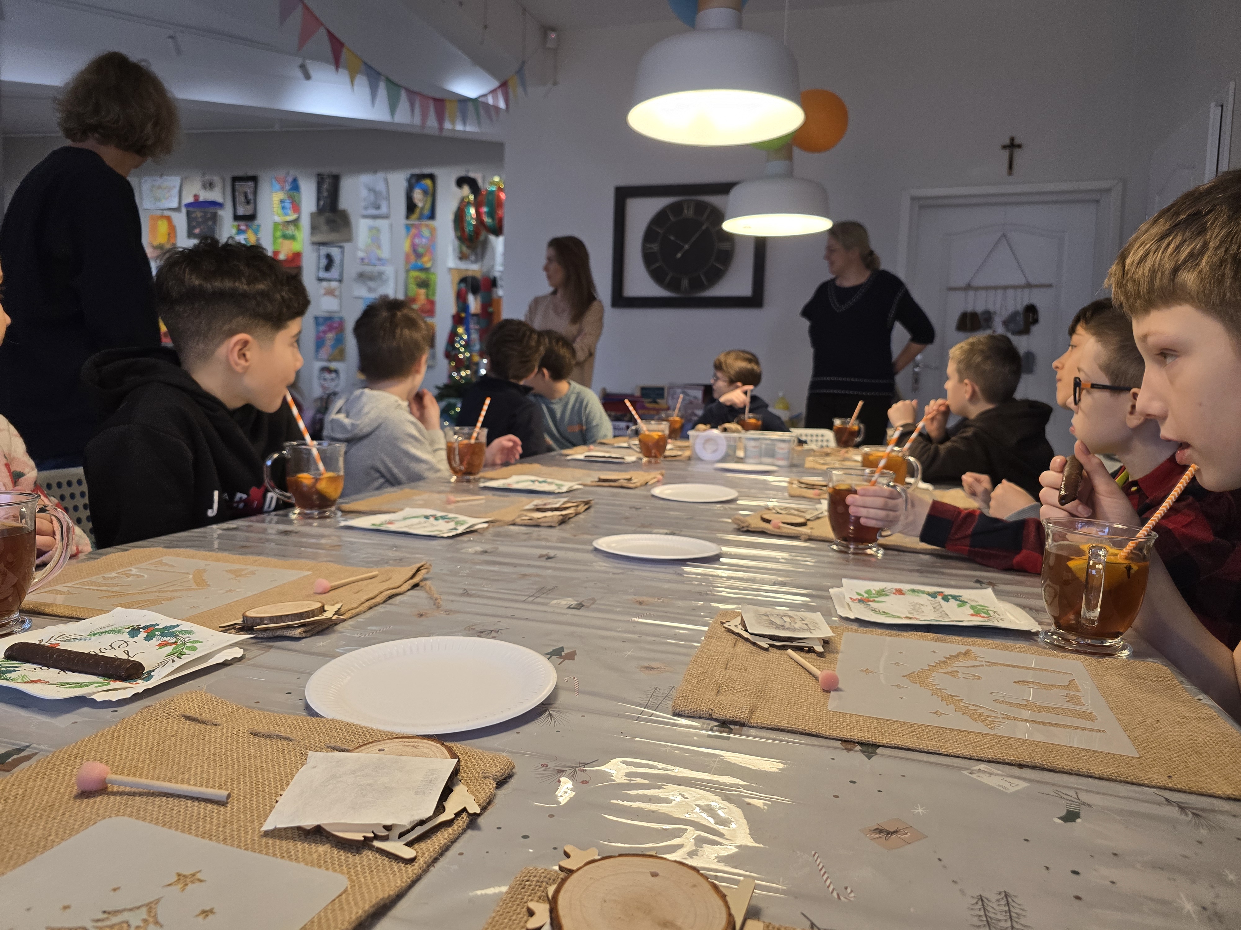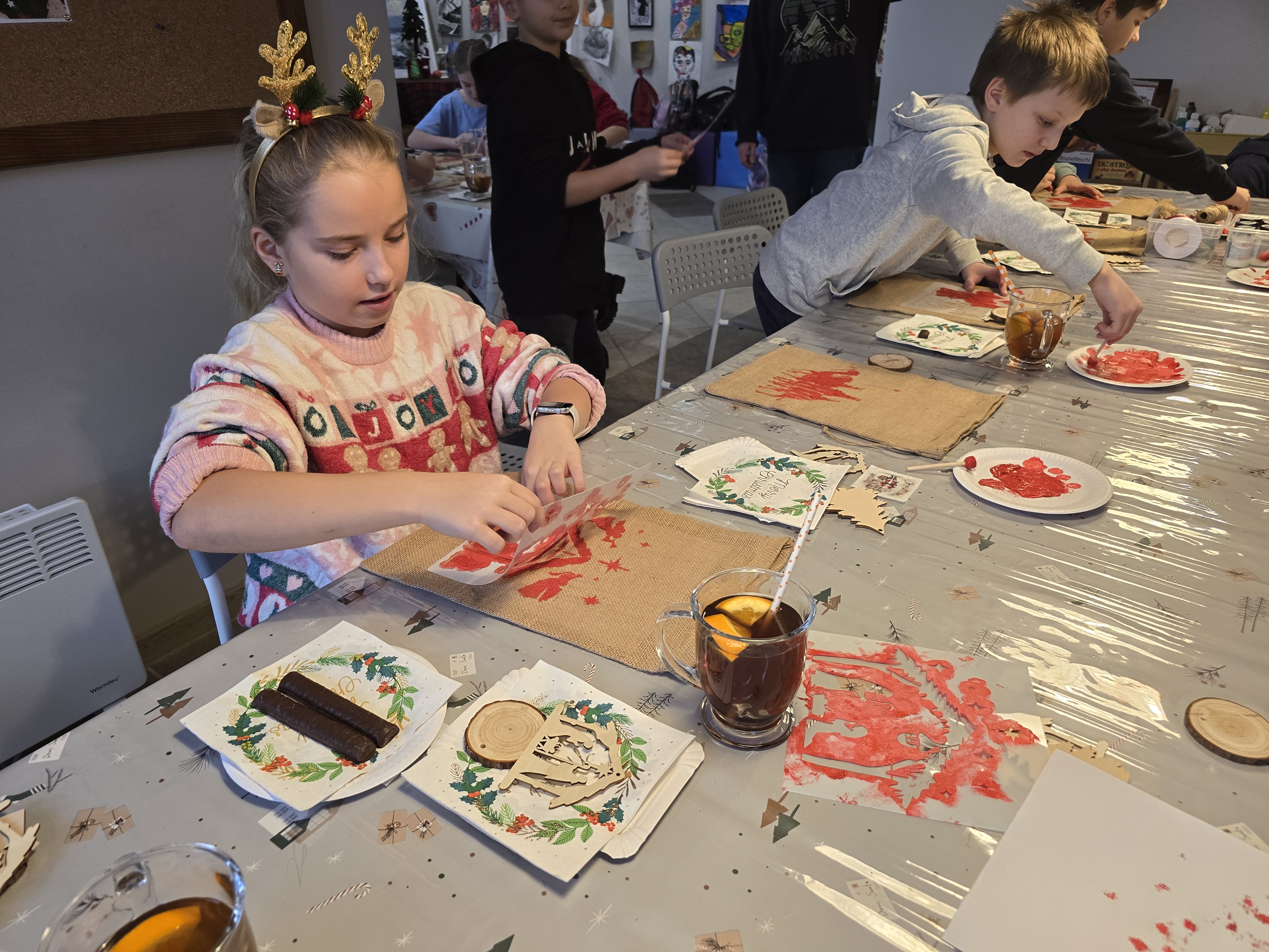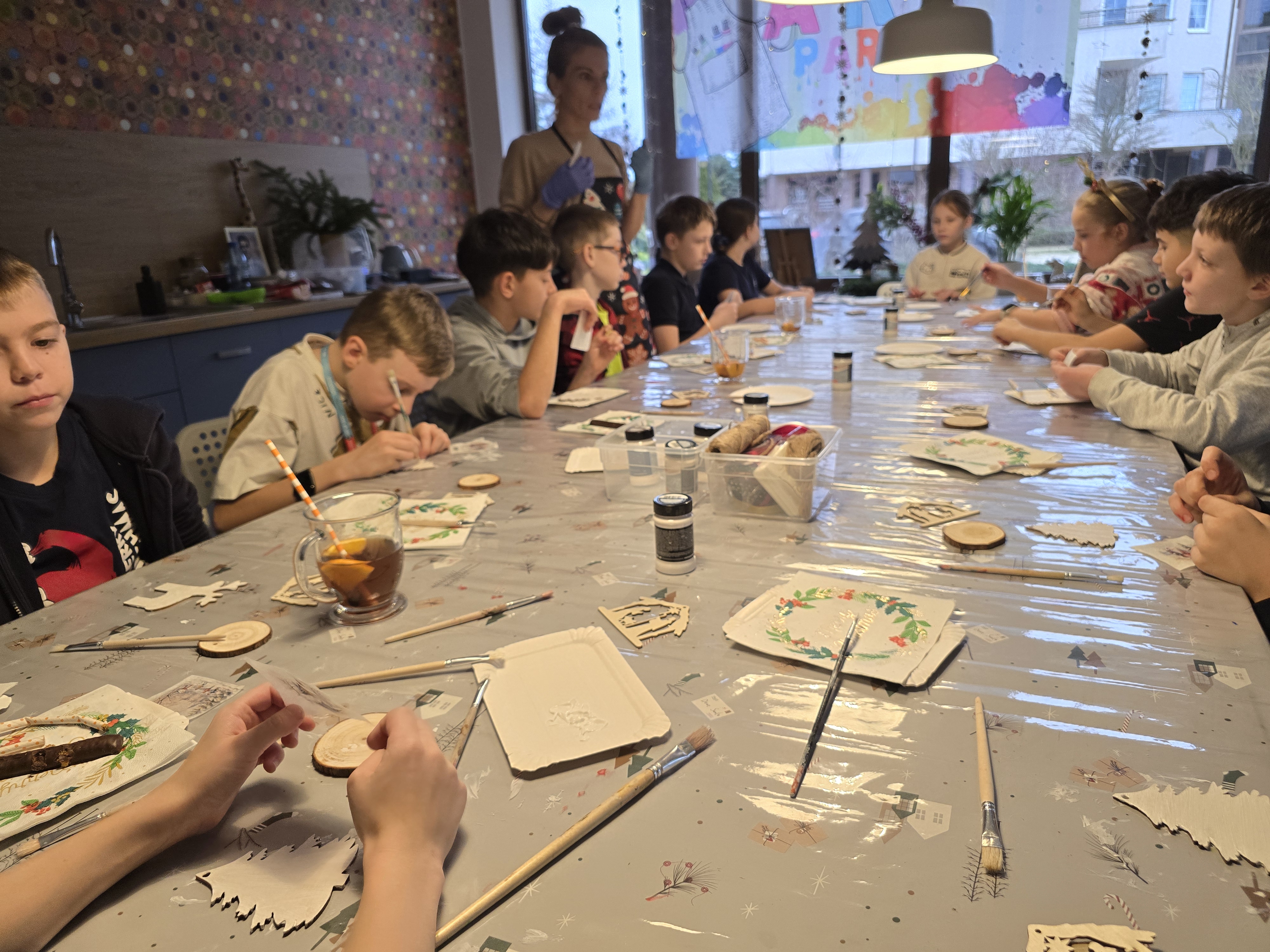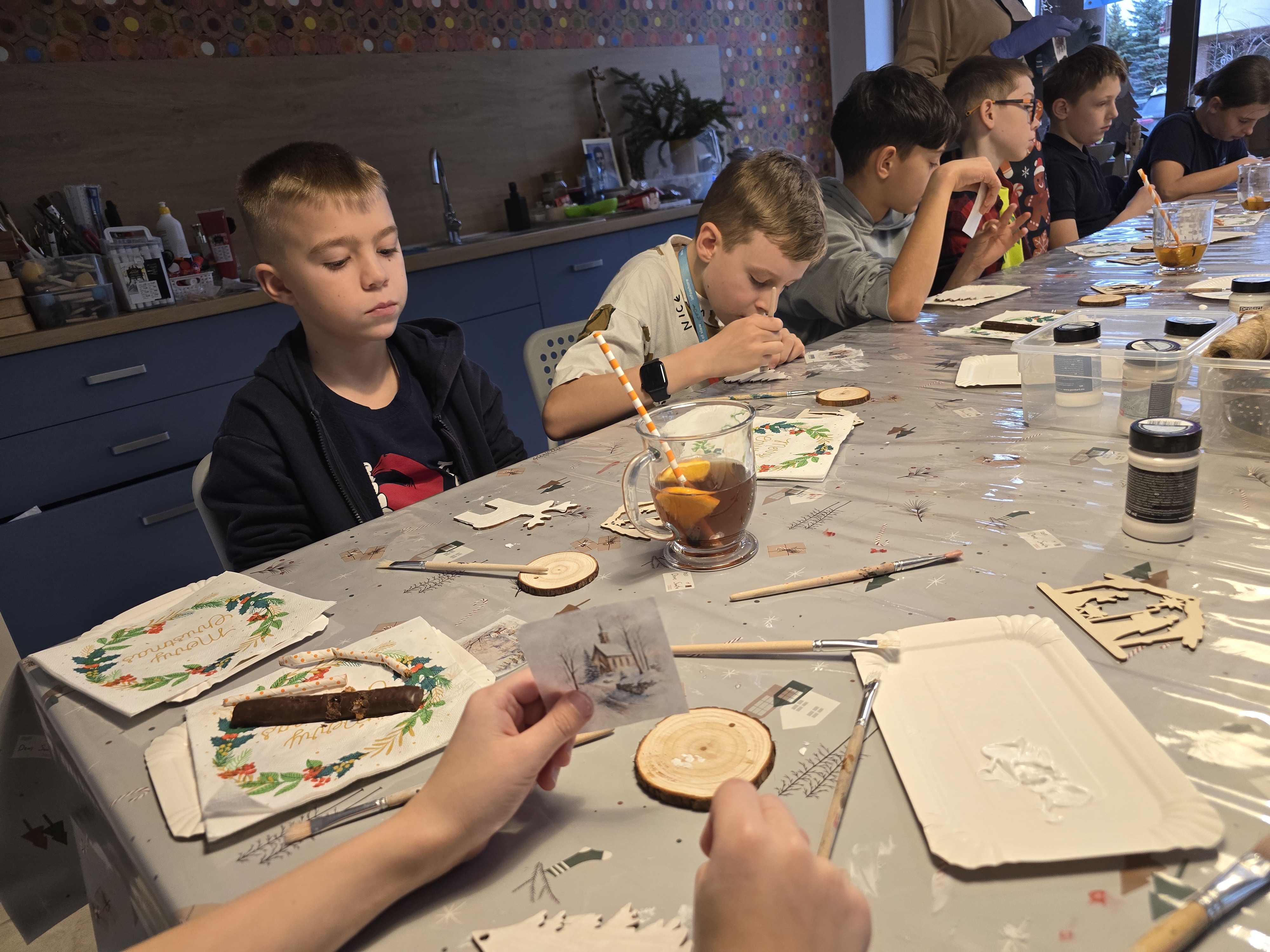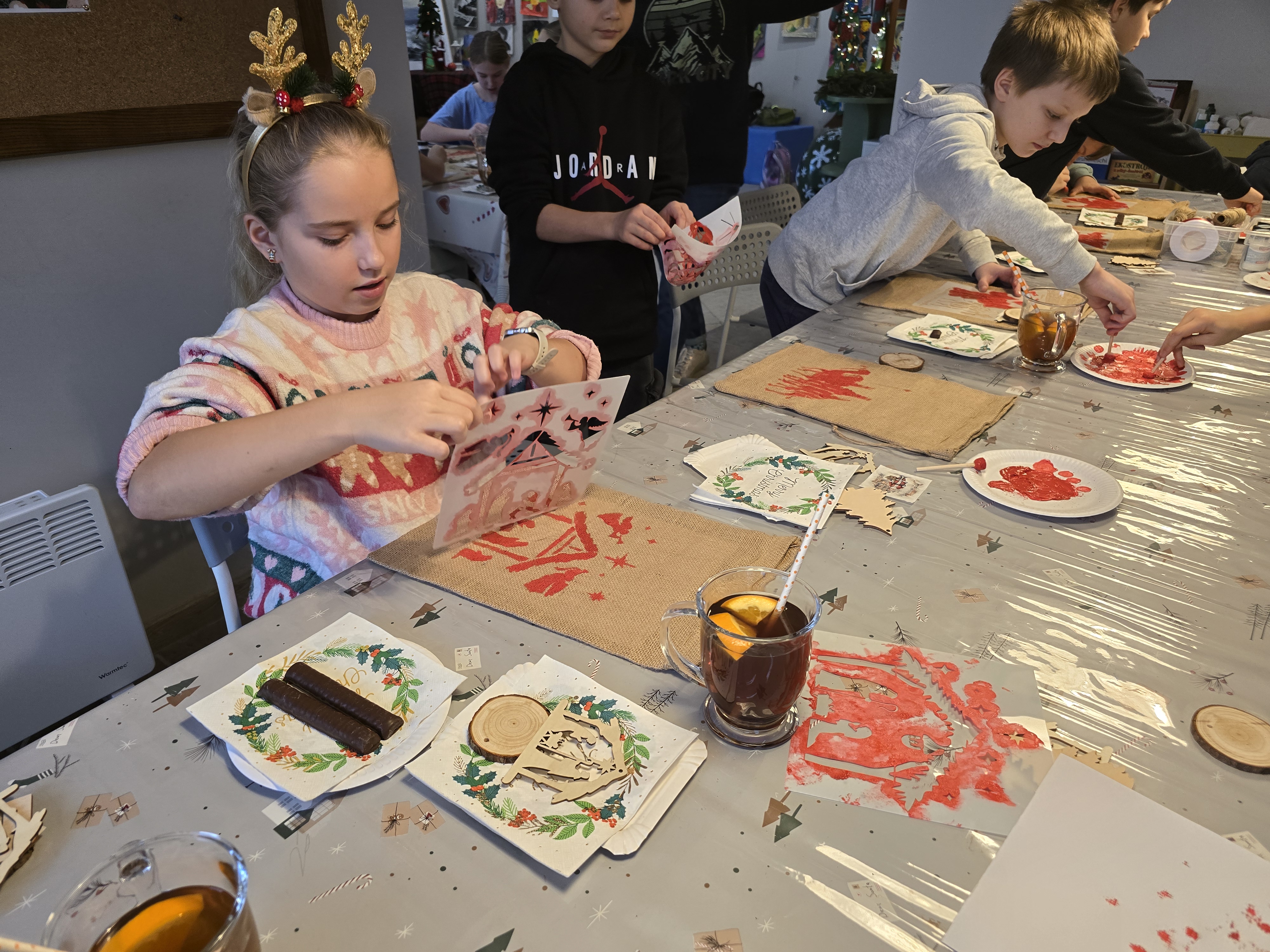 Atmosfera w pracowni była wyjątkowo miła i przyjazna. Dzieci pracowały w skupieniu, ale jednocześnie wesoło rozmawiały, wymieniały się pomysłami i śmiały się do łez. Prowadzący warsztaty dbali o to, aby każdy czuł się swobodnie i mógł wyrazić swoją kreatywność. W tle rozbrzmiewały dźwięki kolęd, które dodatkowo wprowadzały w świąteczny nastrój. Śpiewane przez dzieci, kolędy wypełniały pomieszczenie radością i wzruszeniem, tworząc niezapomnianą atmosferę.