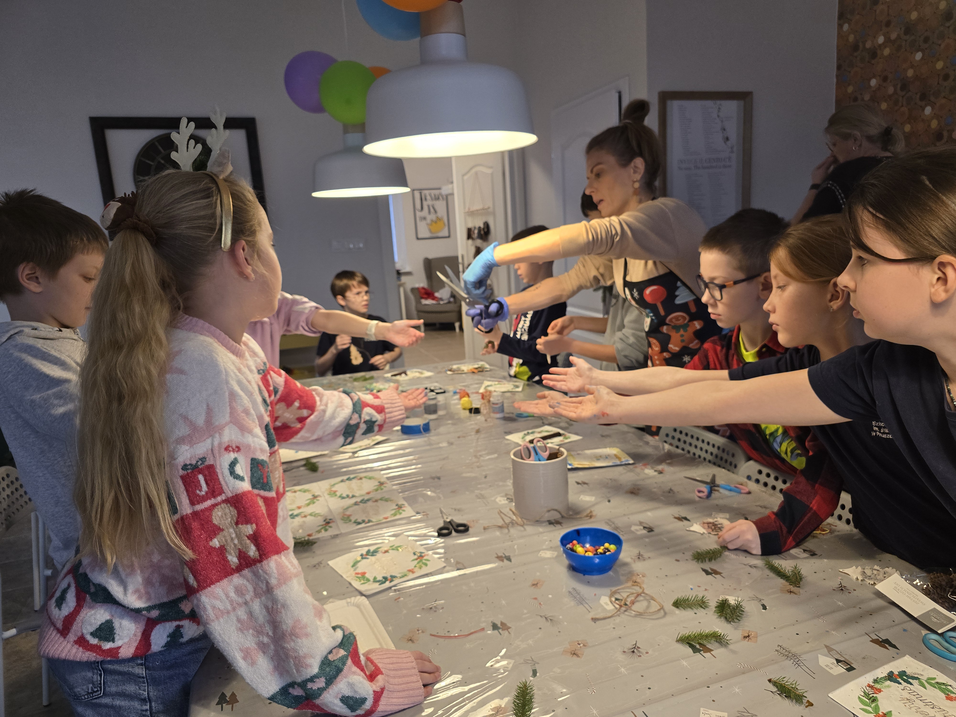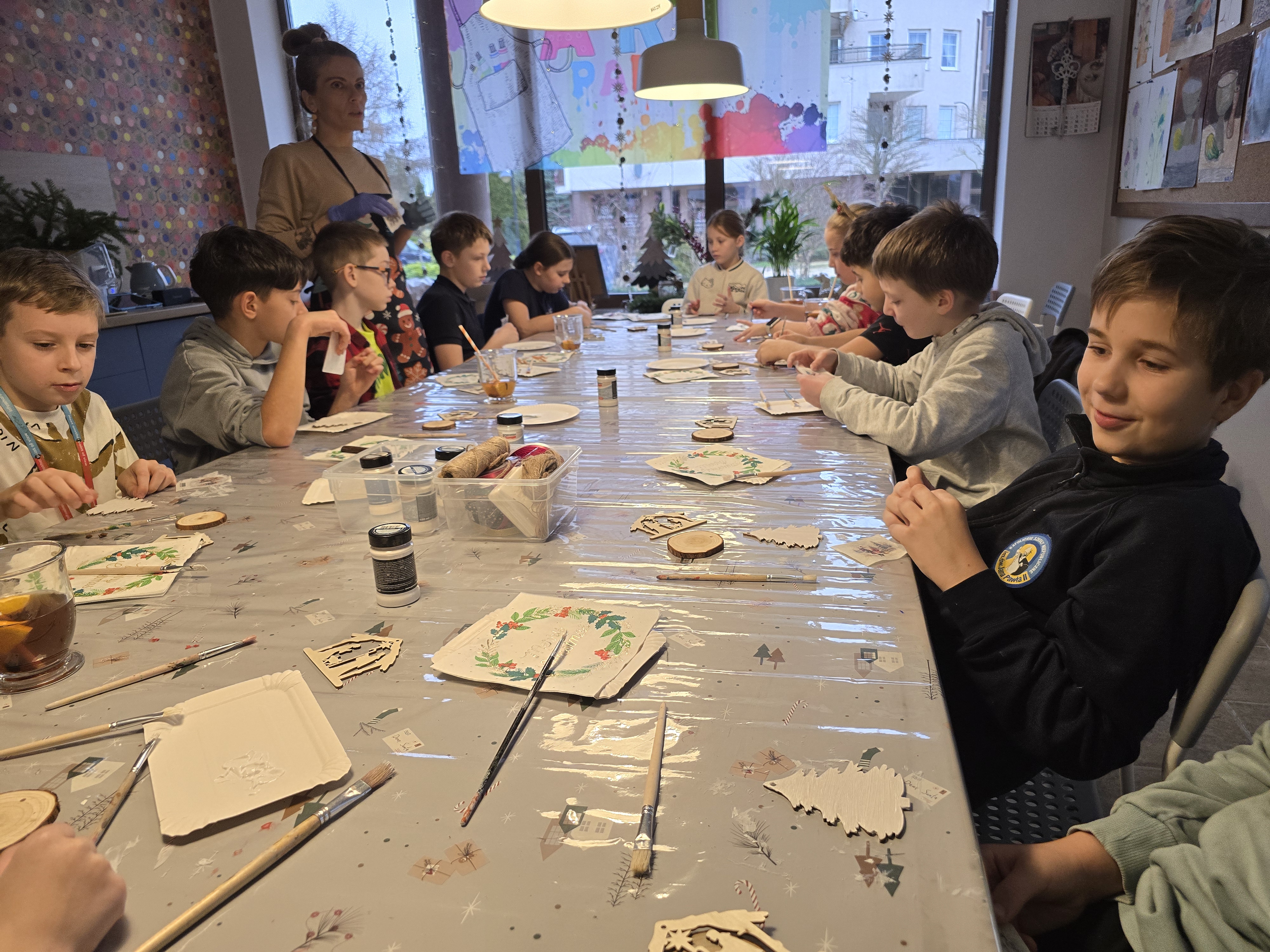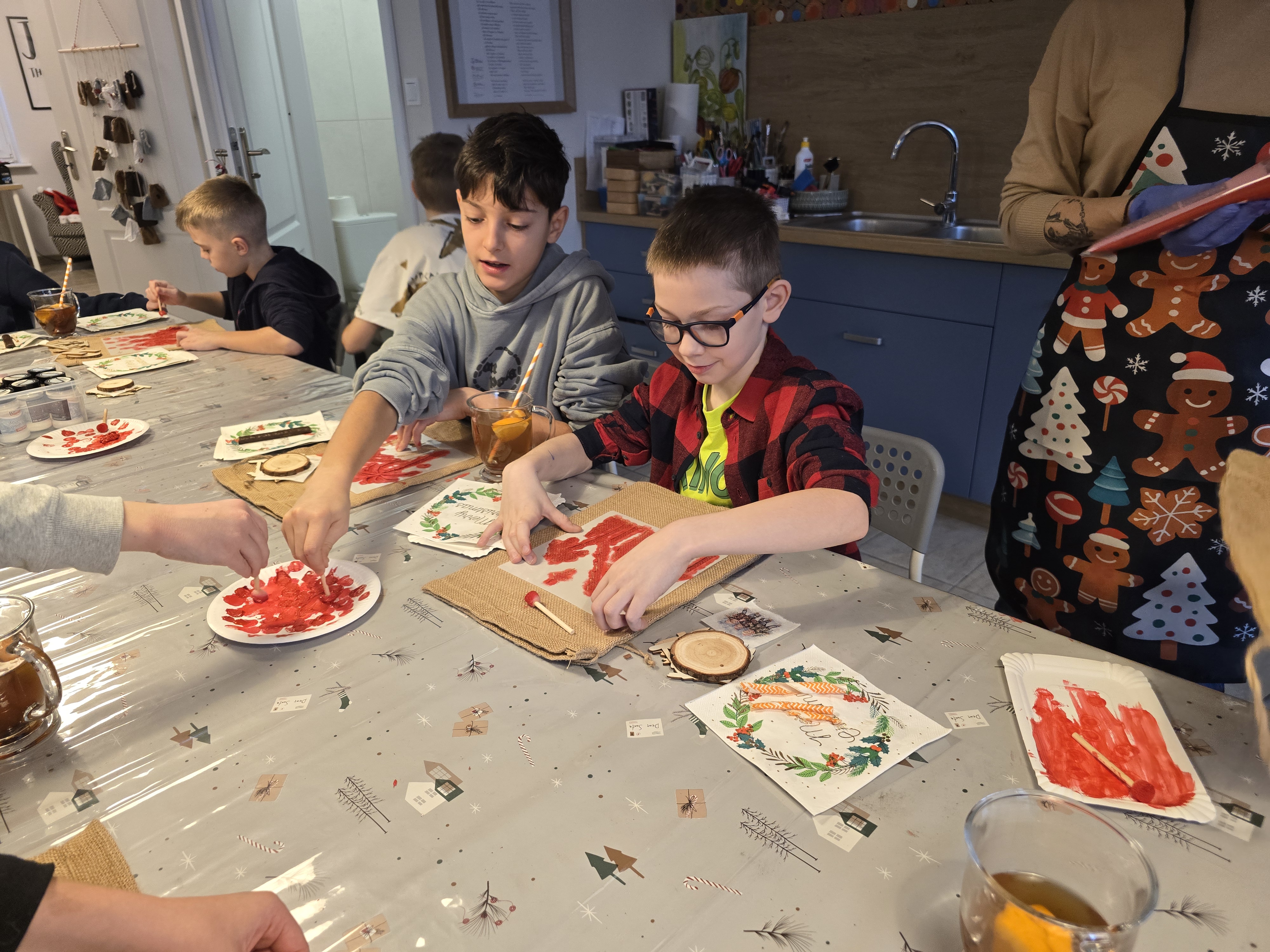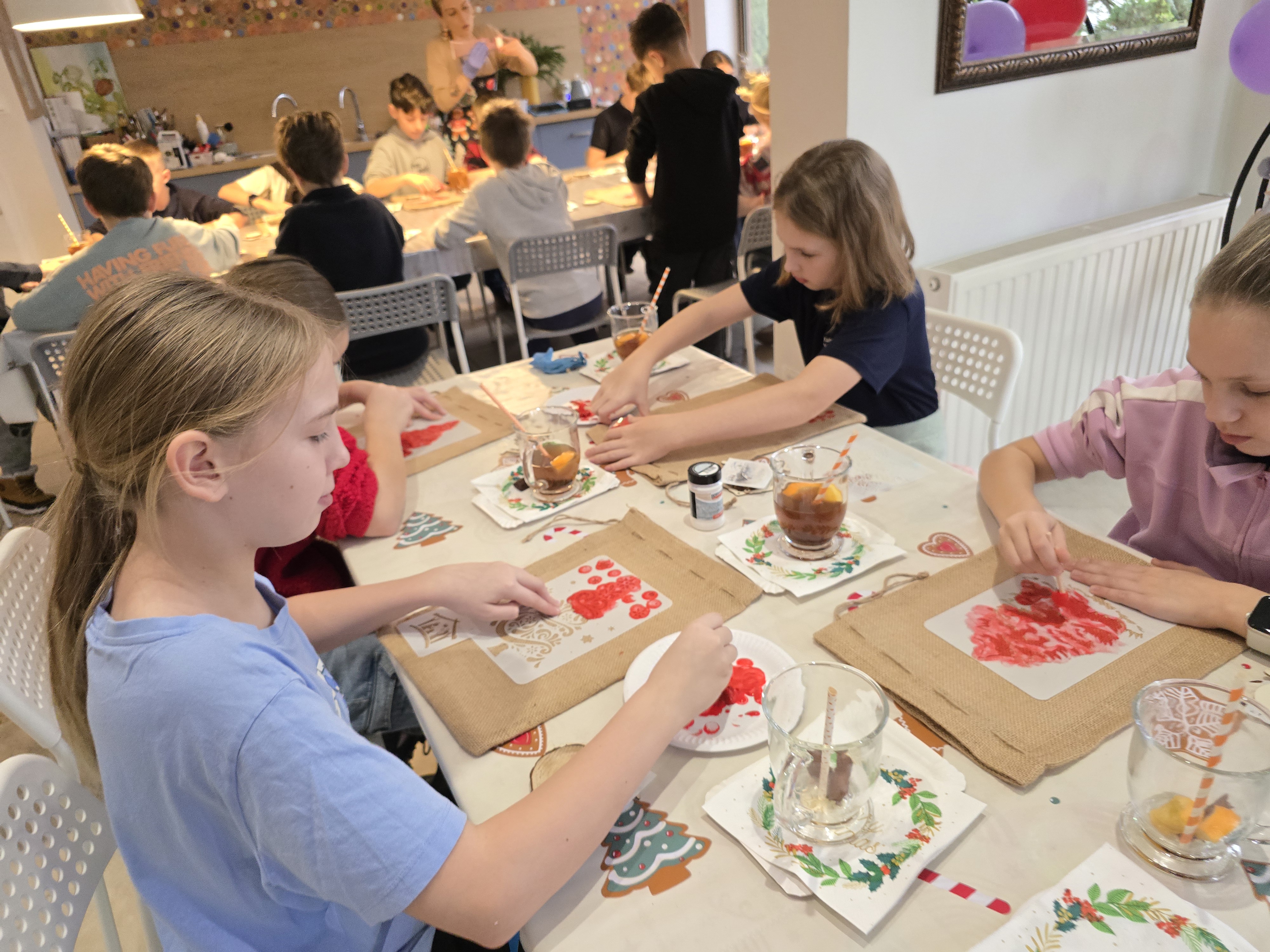 Atmosfera w pracowni była wyjątkowo miła i przyjazna. Dzieci pracowały w skupieniu, ale jednocześnie wesoło rozmawiały, wymieniały się pomysłami i śmiały się do łez. Prowadzący warsztaty dbali o to, aby każdy czuł się swobodnie i mógł wyrazić swoją kreatywność. W tle rozbrzmiewały dźwięki kolęd, które dodatkowo wprowadzały w świąteczny nastrój. Śpiewane przez dzieci, kolędy wypełniały pomieszczenie radością i wzruszeniem, tworząc niezapomnianą atmosferę.