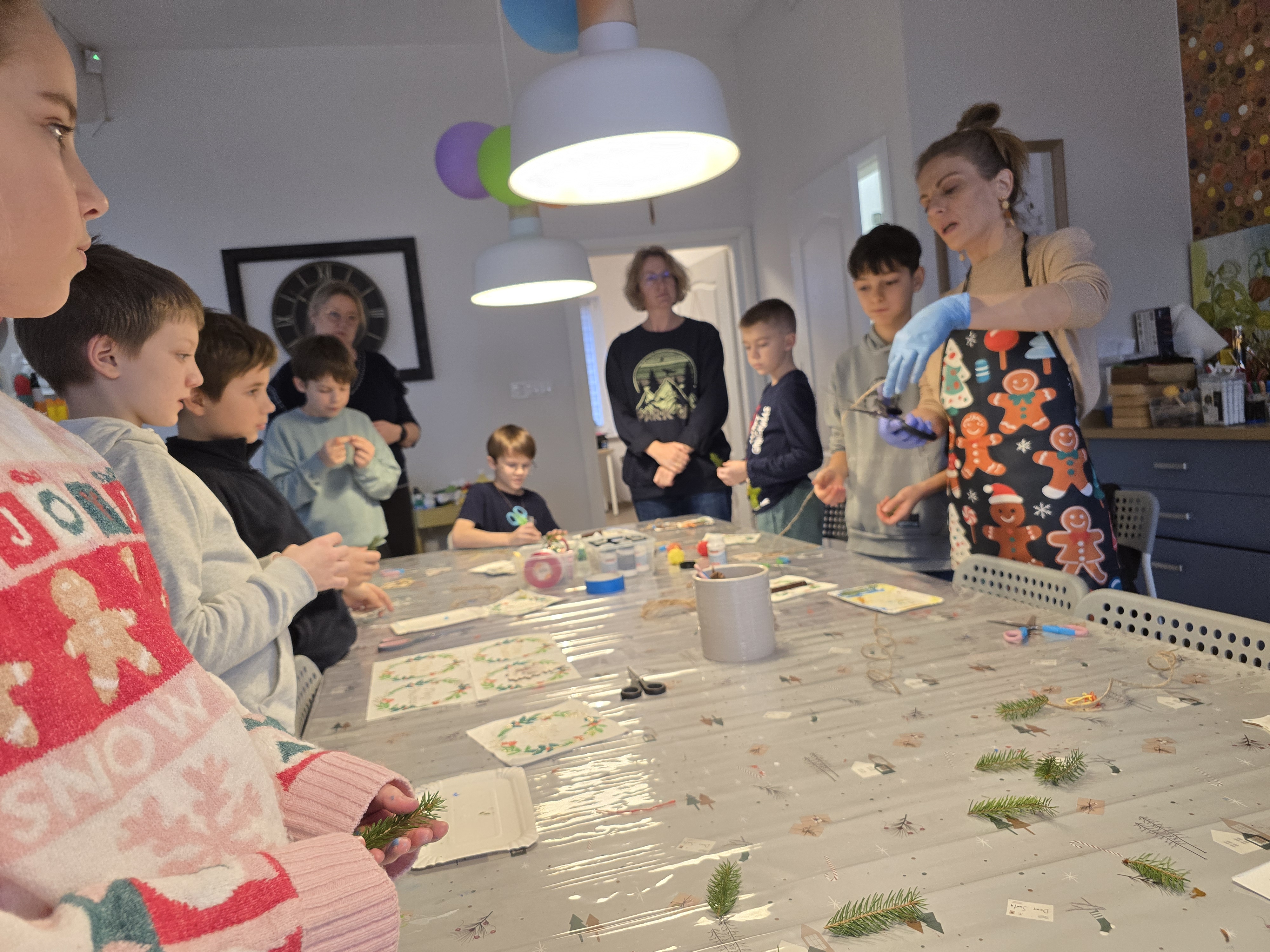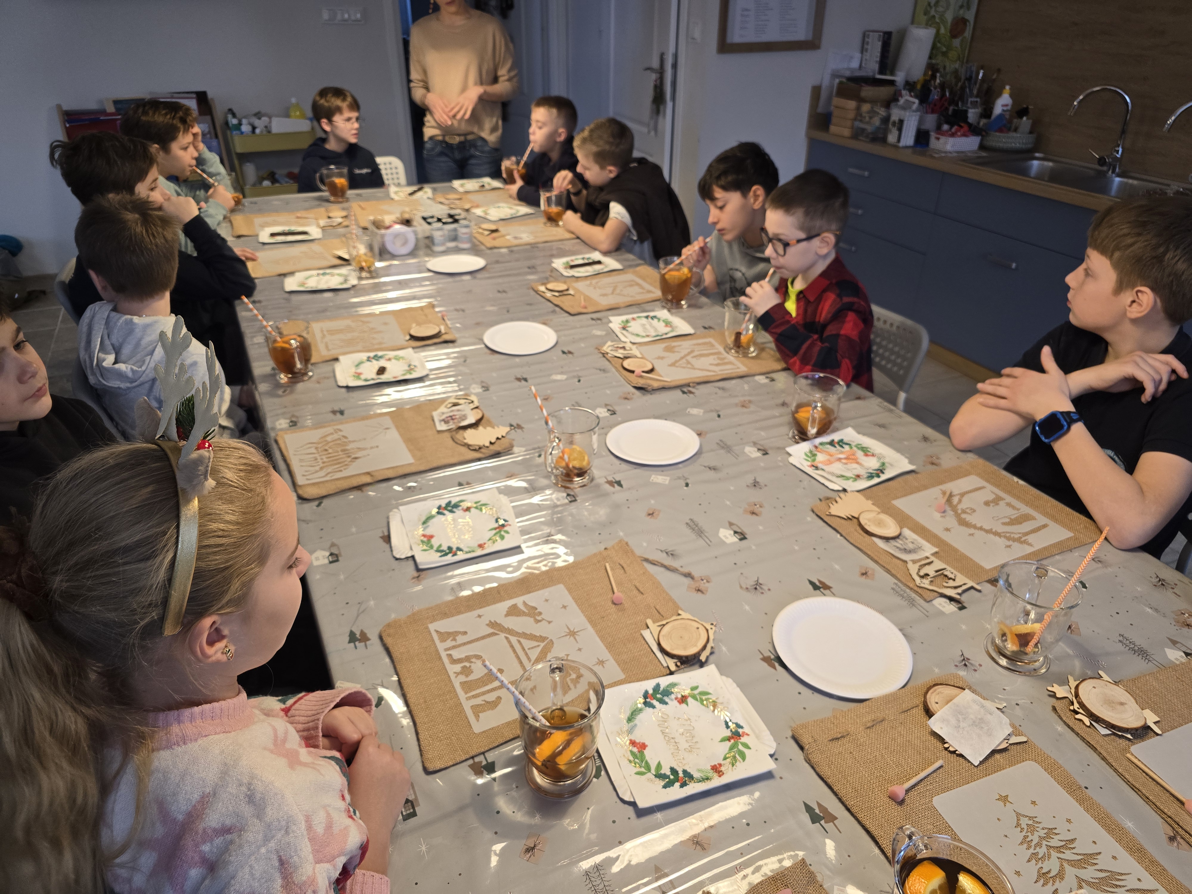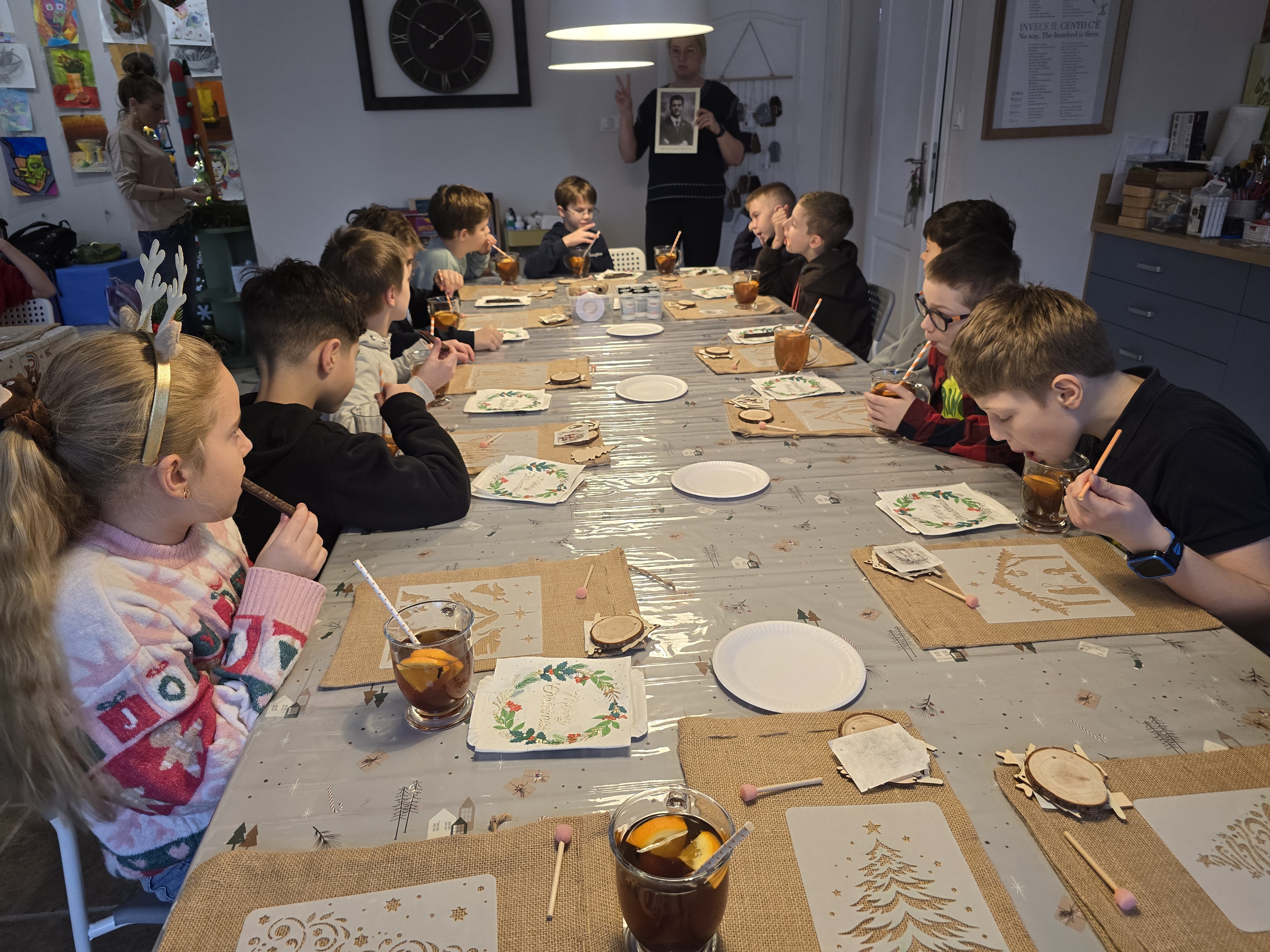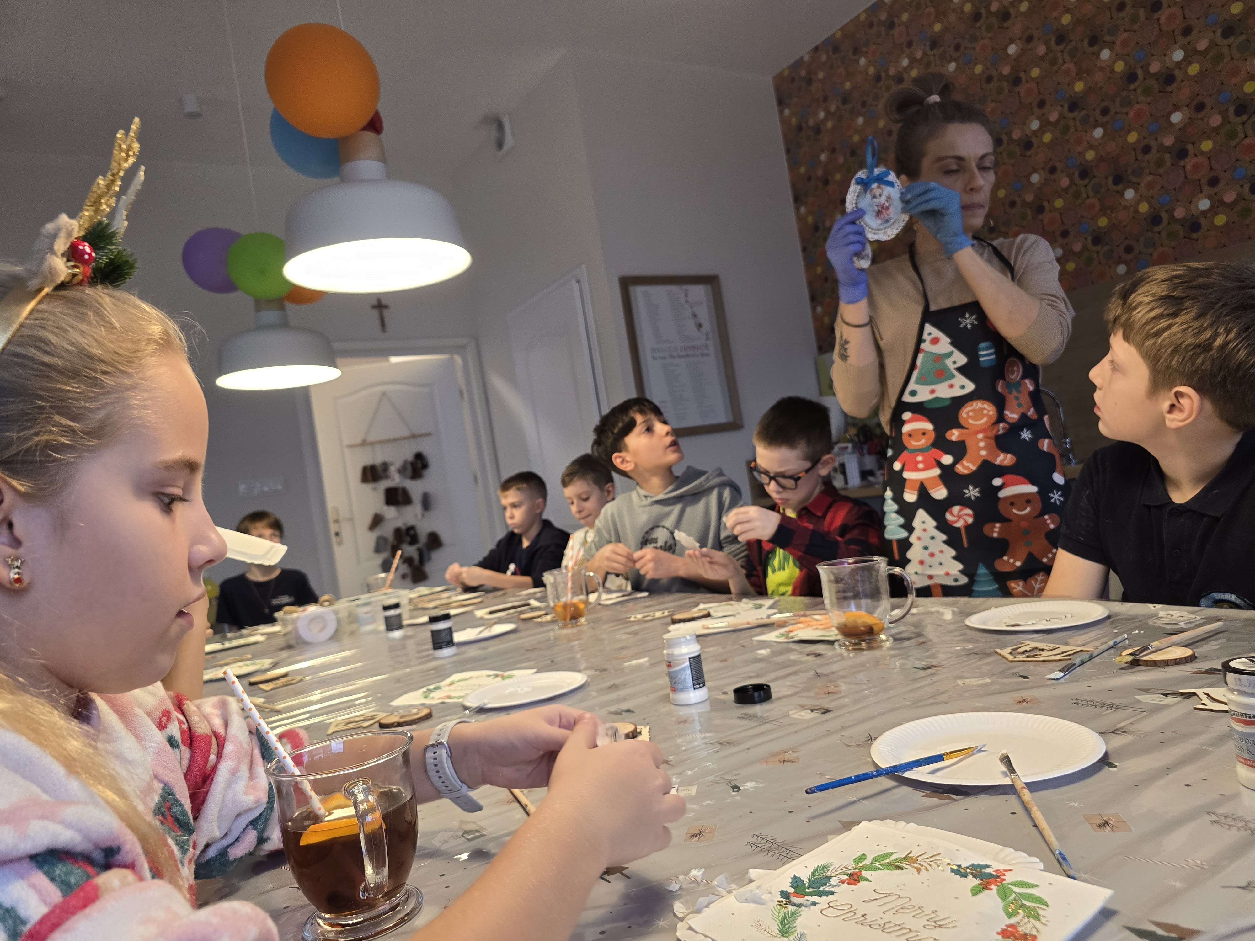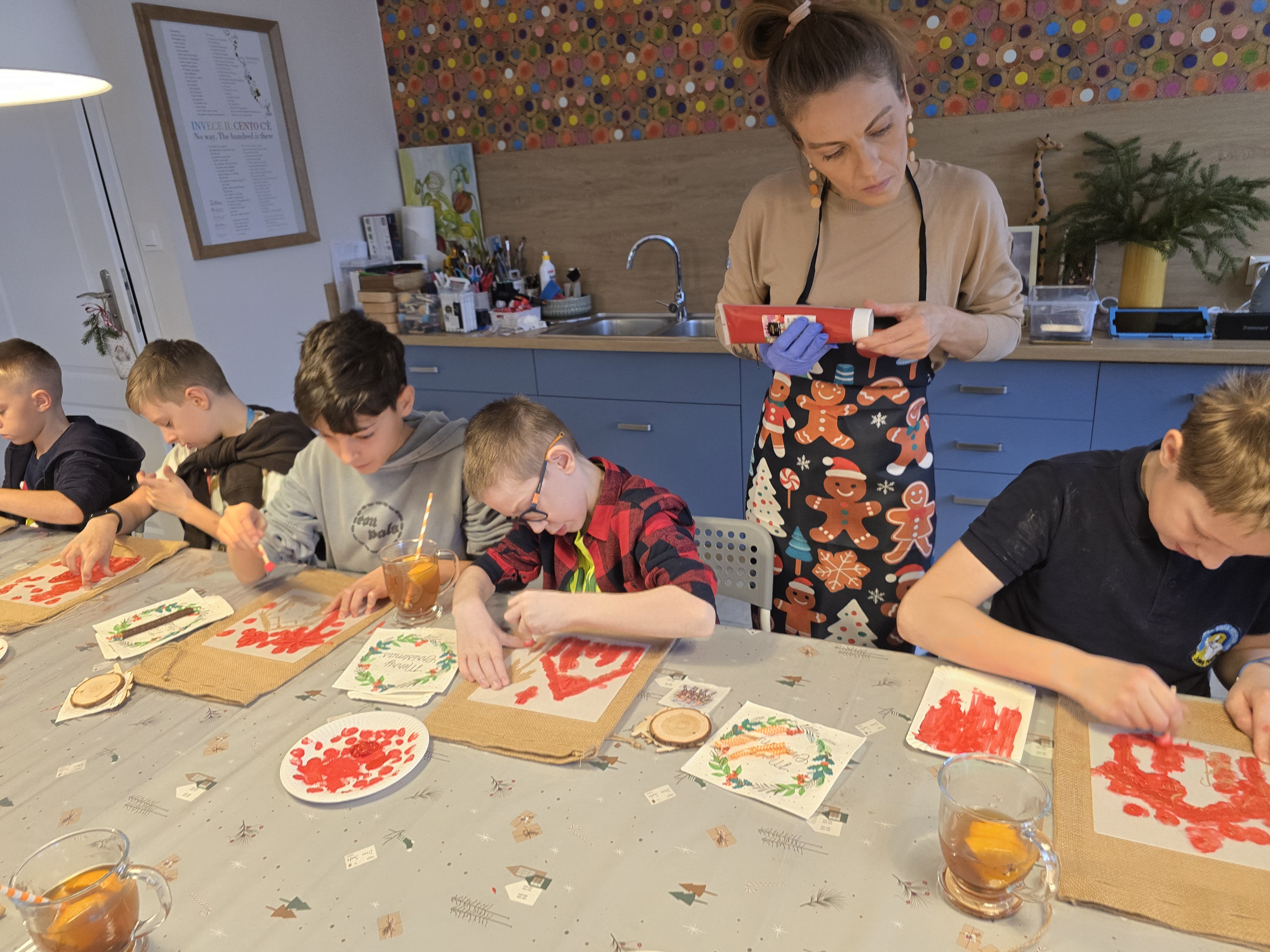 Atmosfera w pracowni była wyjątkowo miła i przyjazna. Dzieci pracowały w skupieniu, ale jednocześnie wesoło rozmawiały, wymieniały się pomysłami i śmiały się do łez. Prowadzący warsztaty dbali o to, aby każdy czuł się swobodnie i mógł wyrazić swoją kreatywność. W tle rozbrzmiewały dźwięki kolęd, które dodatkowo wprowadzały w świąteczny nastrój. Śpiewane przez dzieci, kolędy wypełniały pomieszczenie radością i wzruszeniem, tworząc niezapomnianą atmosferę.