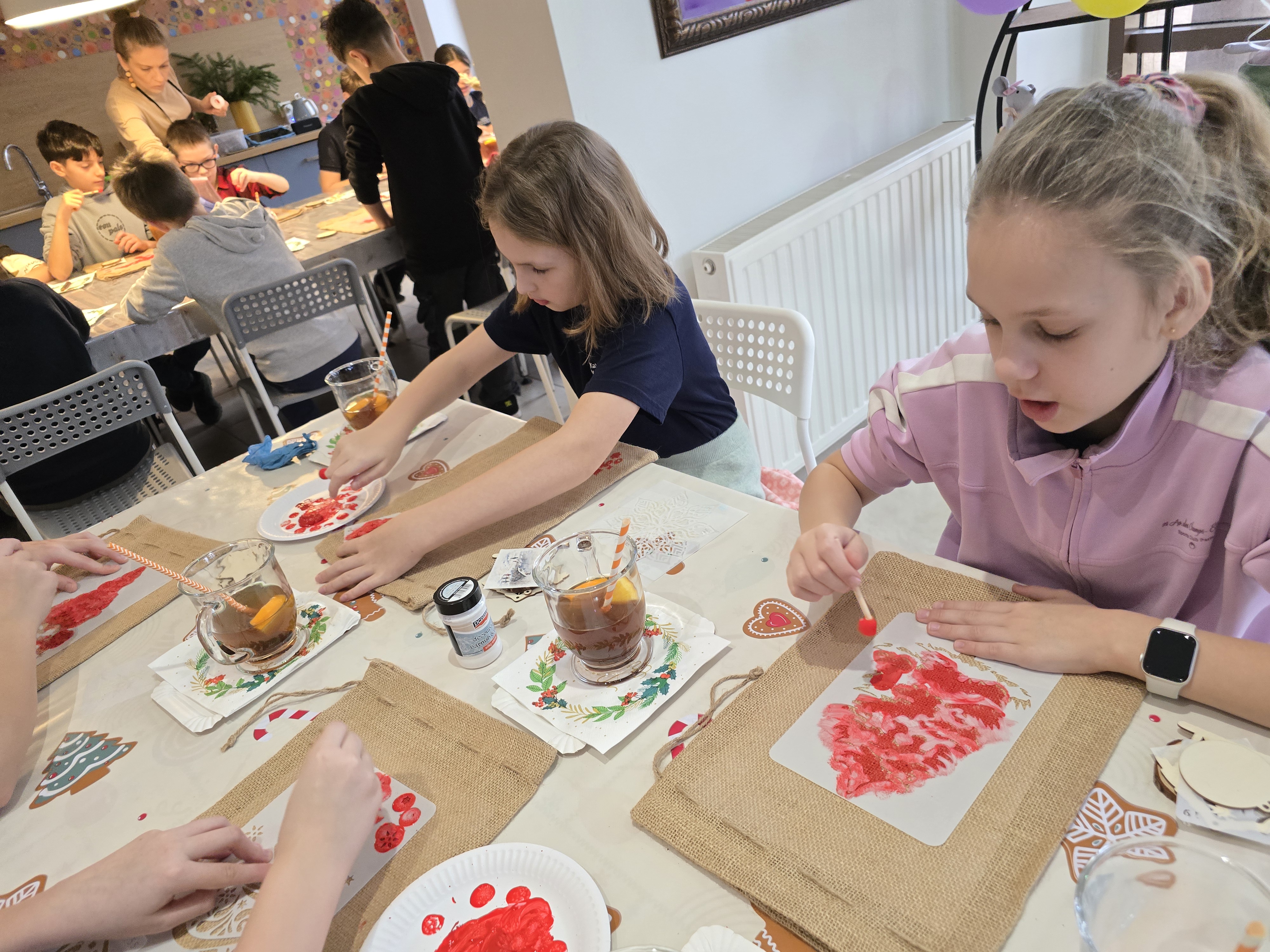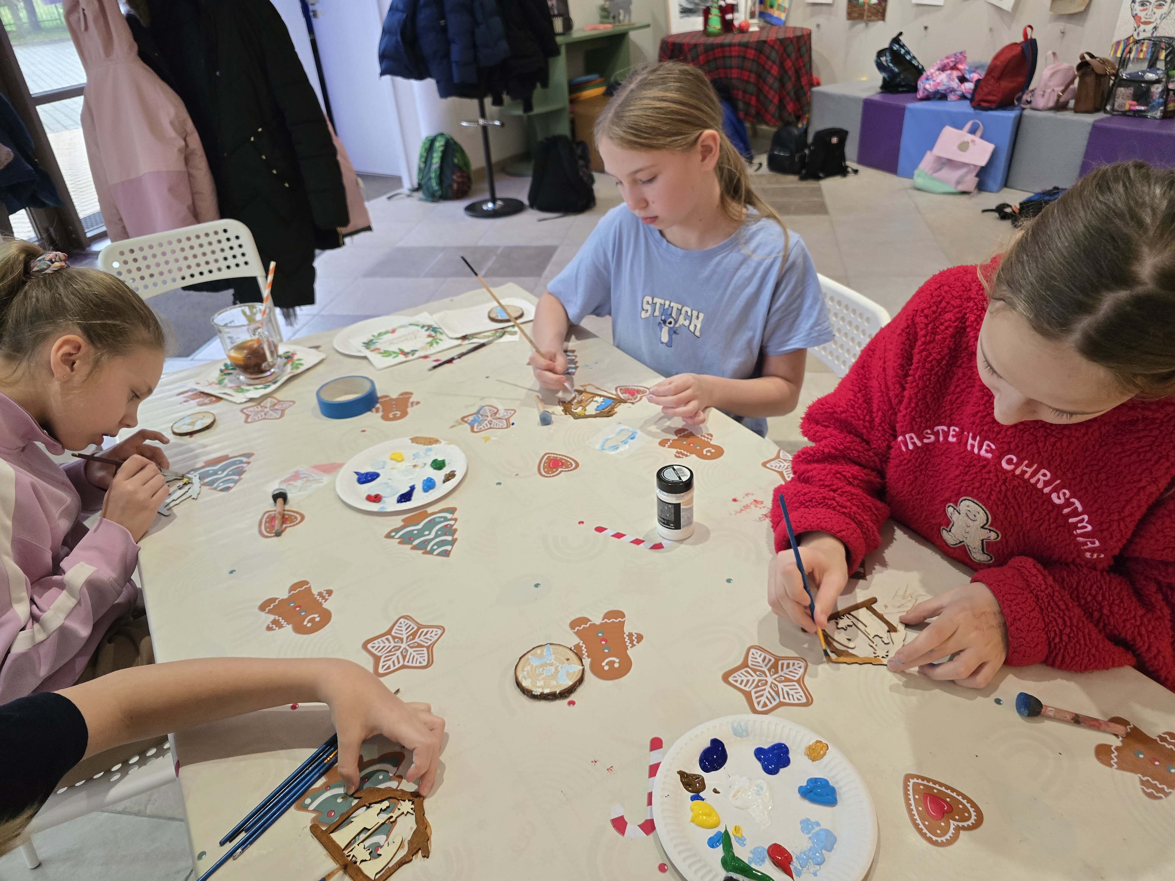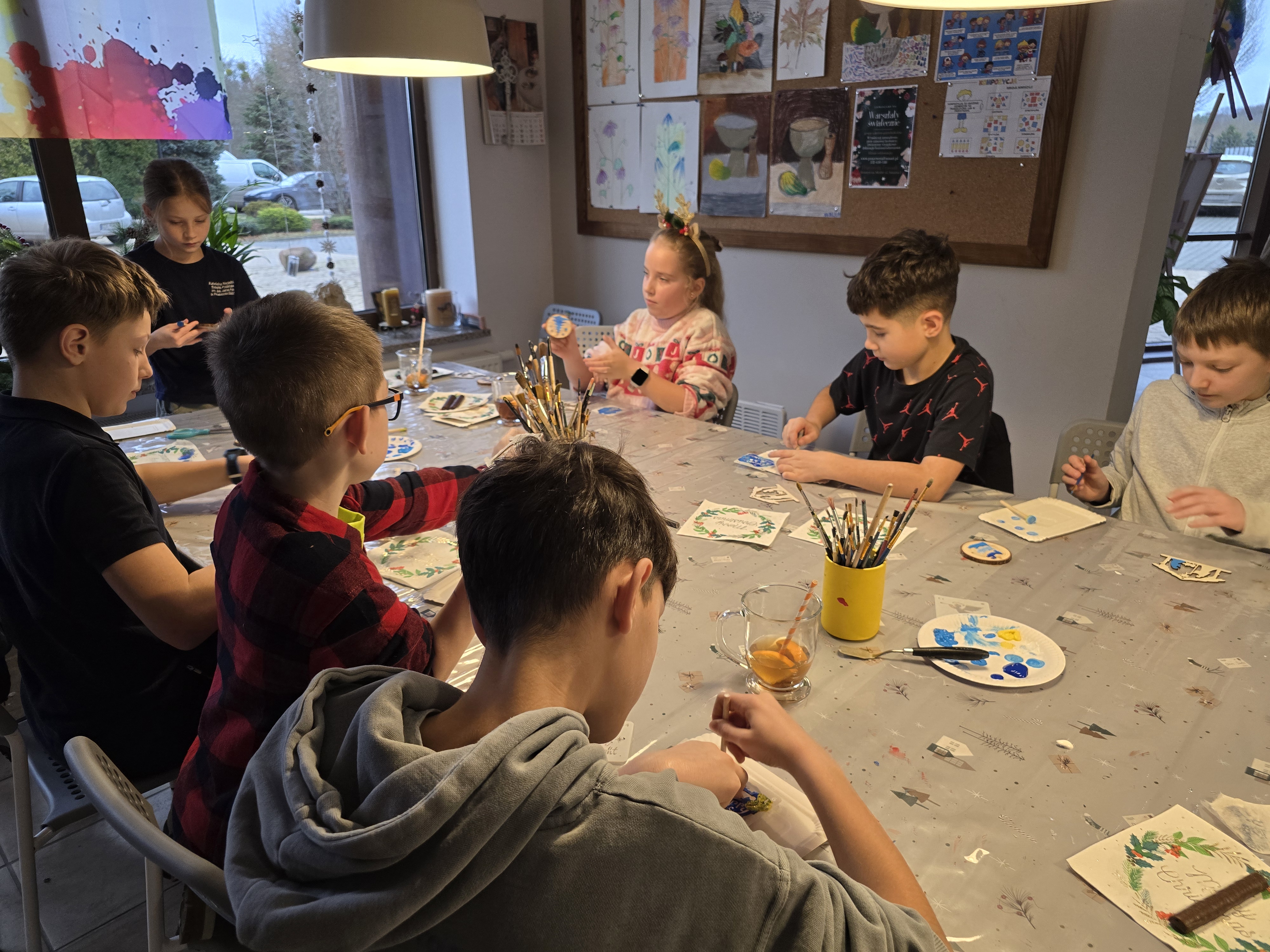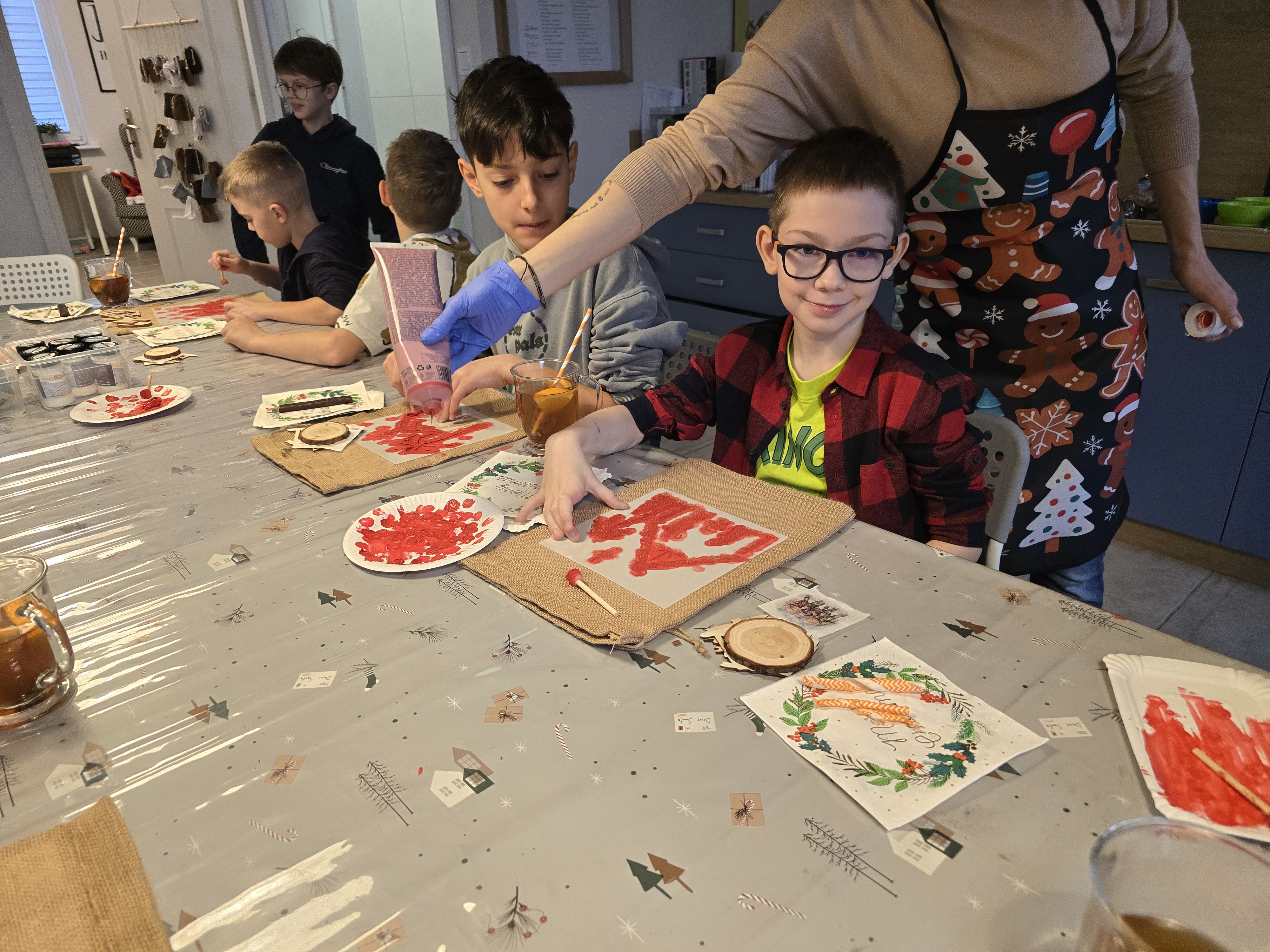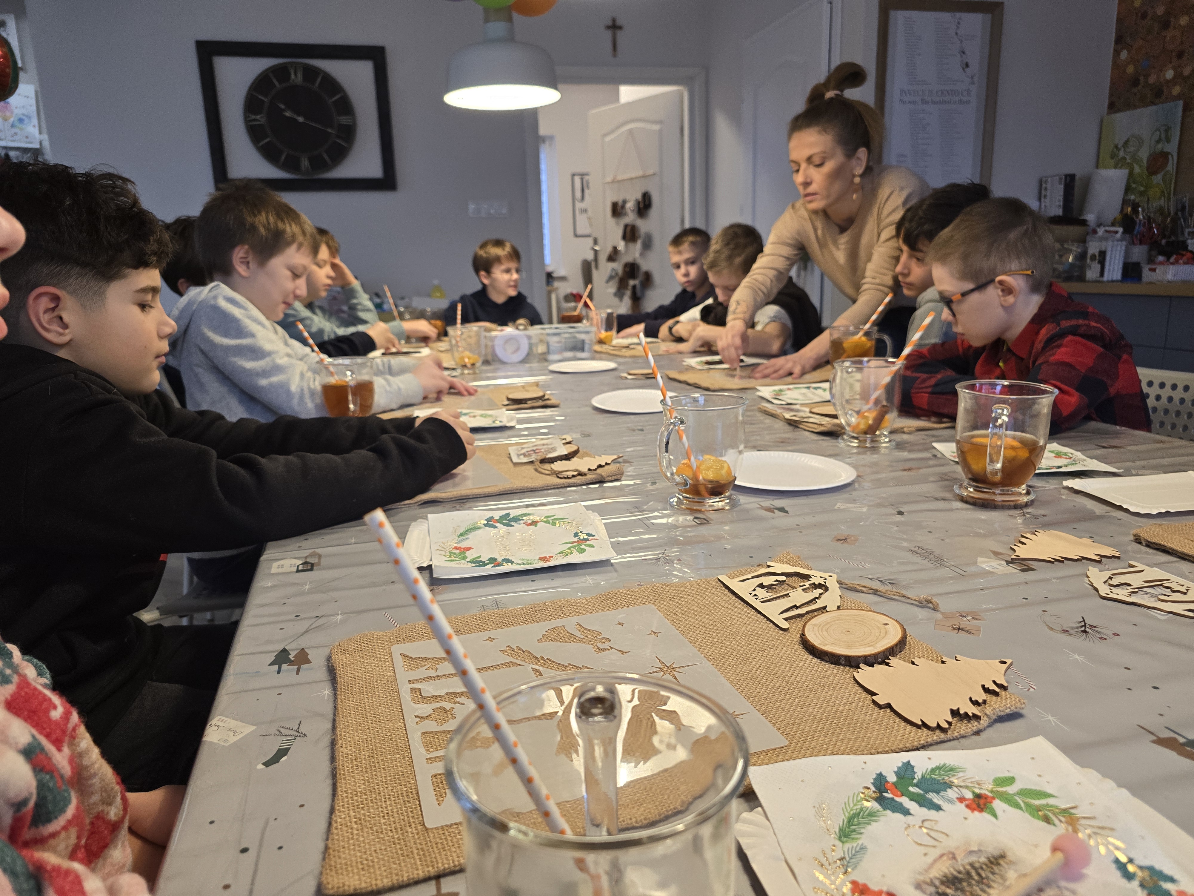 Atmosfera w pracowni była wyjątkowo miła i przyjazna. Dzieci pracowały w skupieniu, ale jednocześnie wesoło rozmawiały, wymieniały się pomysłami i śmiały się do łez. Prowadzący warsztaty dbali o to, aby każdy czuł się swobodnie i mógł wyrazić swoją kreatywność. W tle rozbrzmiewały dźwięki kolęd, które dodatkowo wprowadzały w świąteczny nastrój. Śpiewane przez dzieci, kolędy wypełniały pomieszczenie radością i wzruszeniem, tworząc niezapomnianą atmosferę.