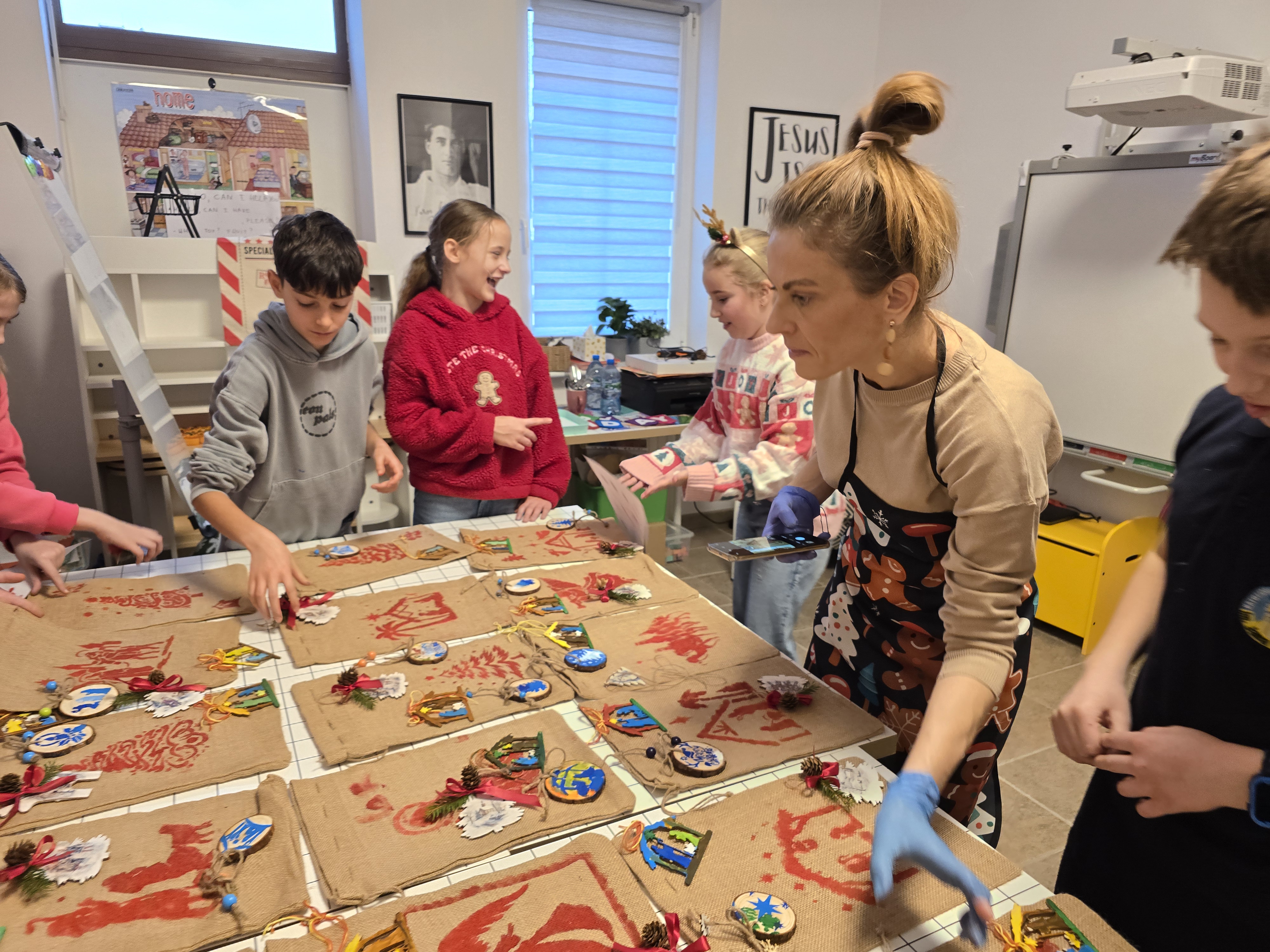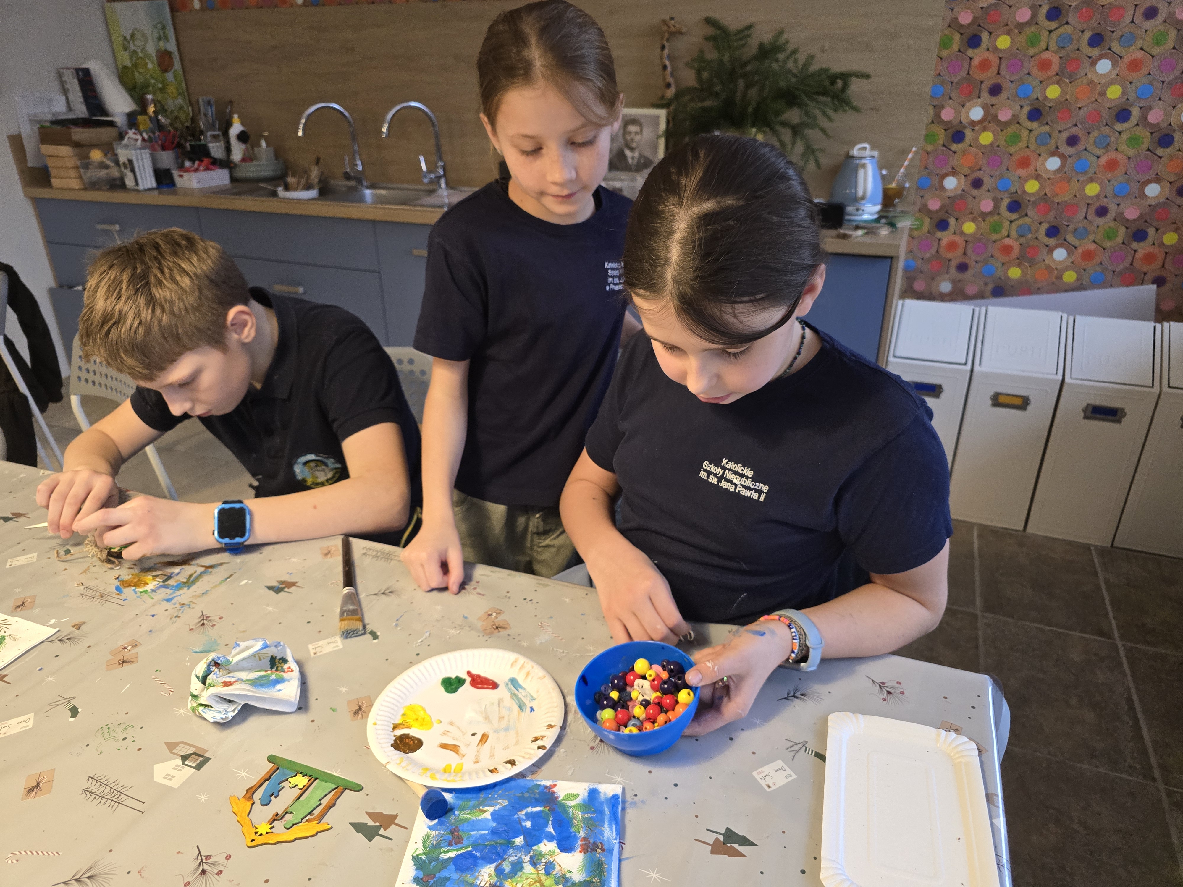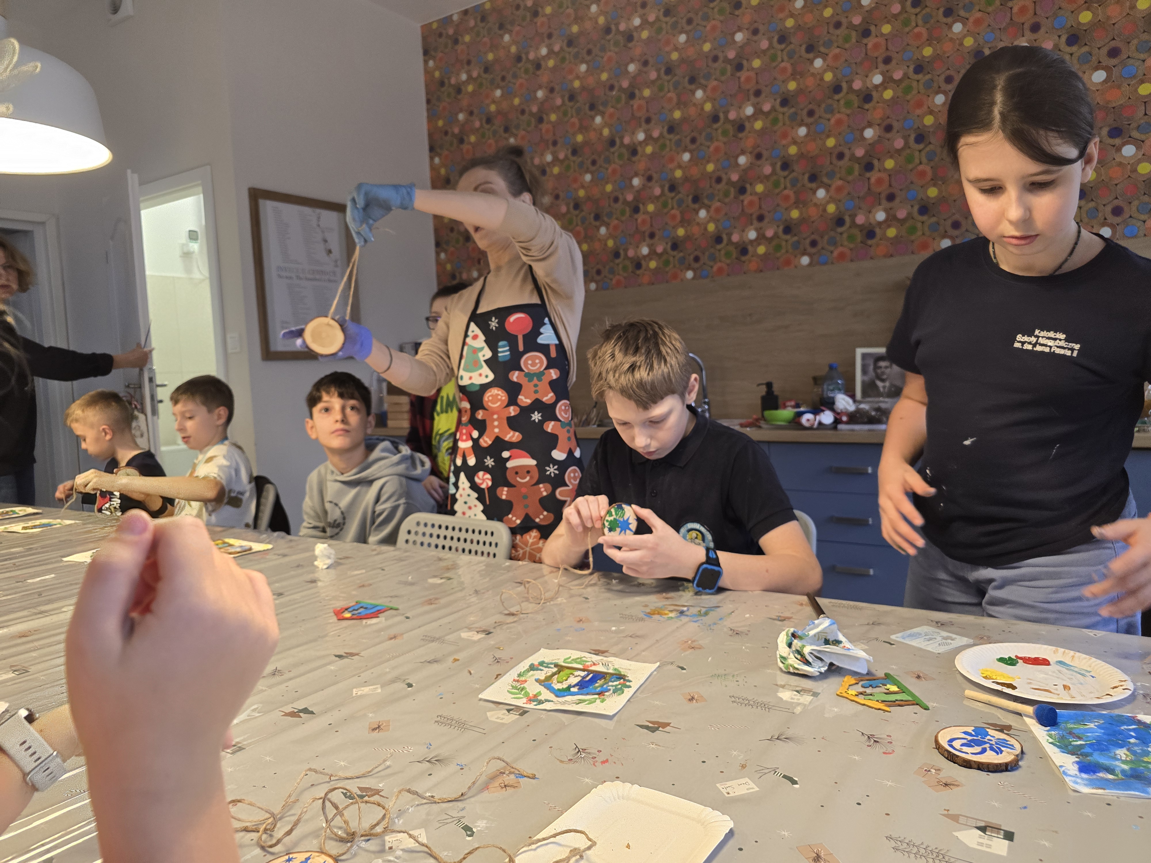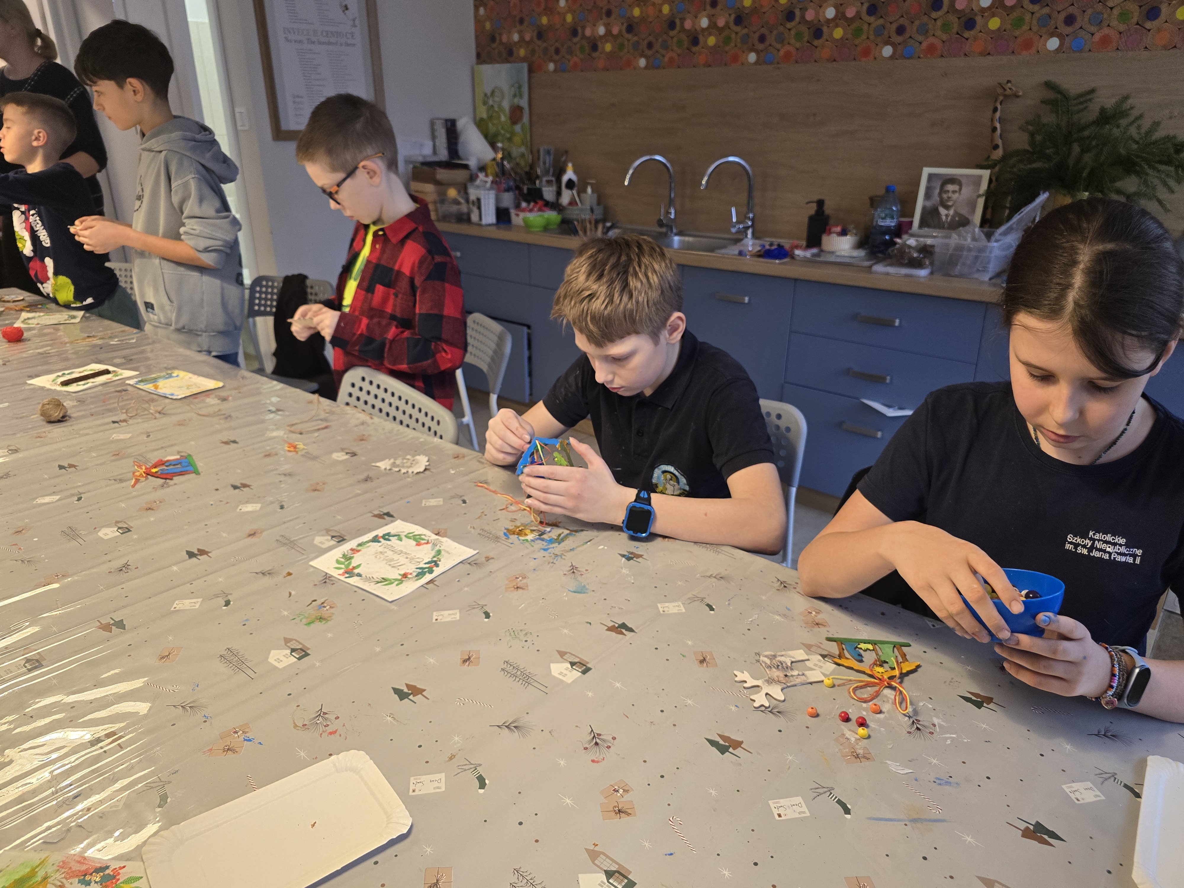 Jednak to nie koniec atrakcji. W Pracowni Frassati czekało na dzieci jeszcze wiele innych niespodzianek. Uczniowie mieli okazję spróbować swoich sił w tworzeniu innych świątecznych ozdób, wykorzystując różnorodne materiały i techniki. Powstawały piękne pomysłowe dekoracje, które upiększą świąteczne drzewka i wnętrza domów.