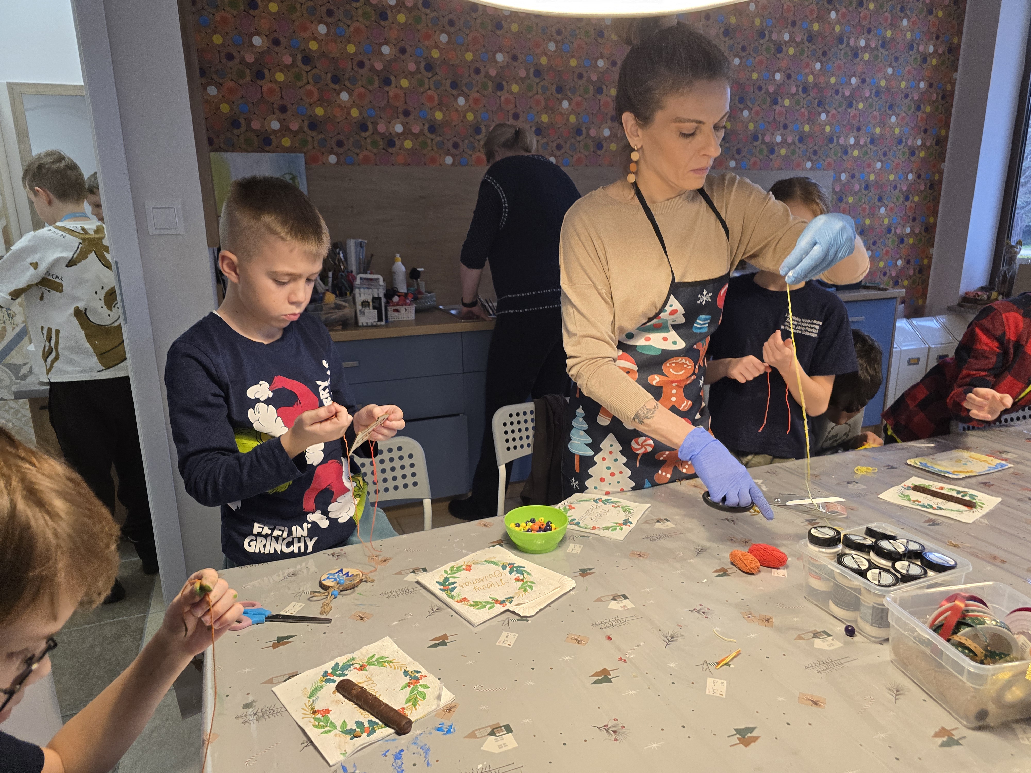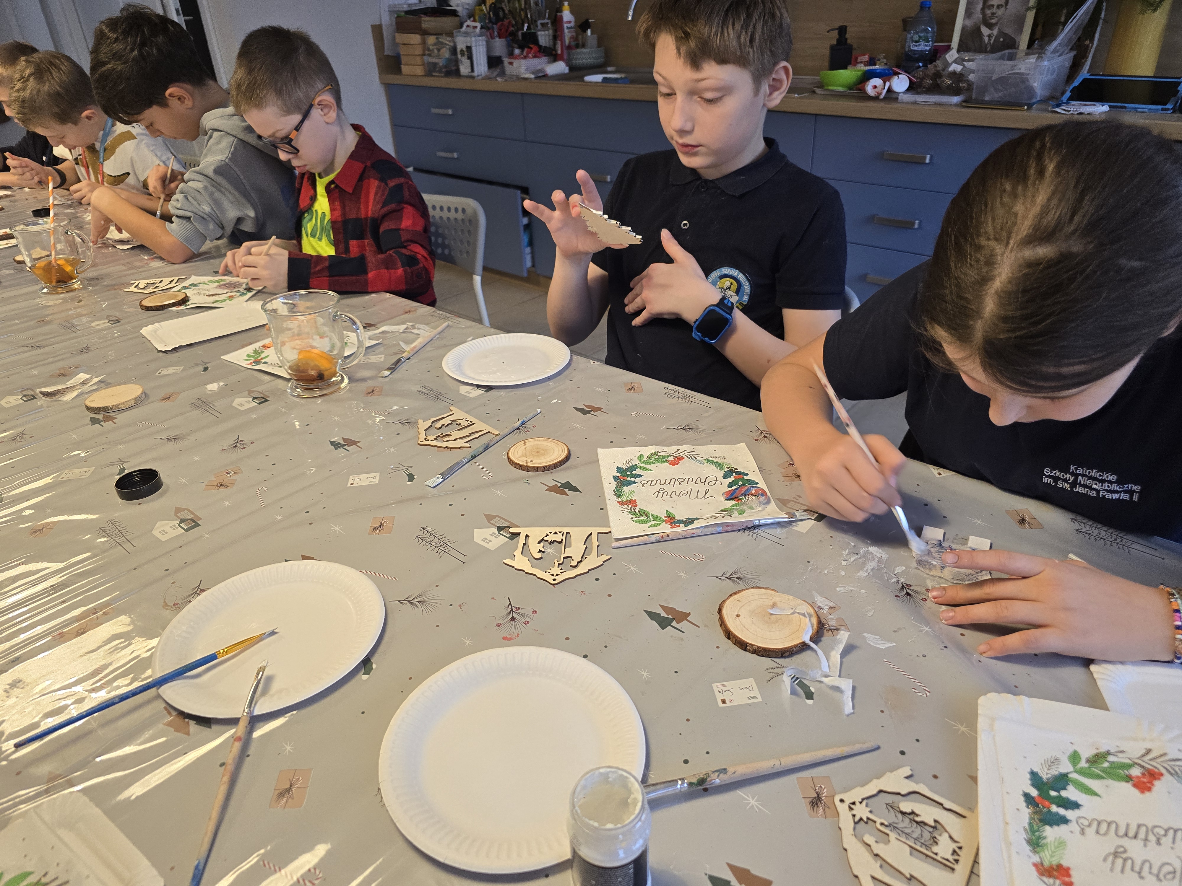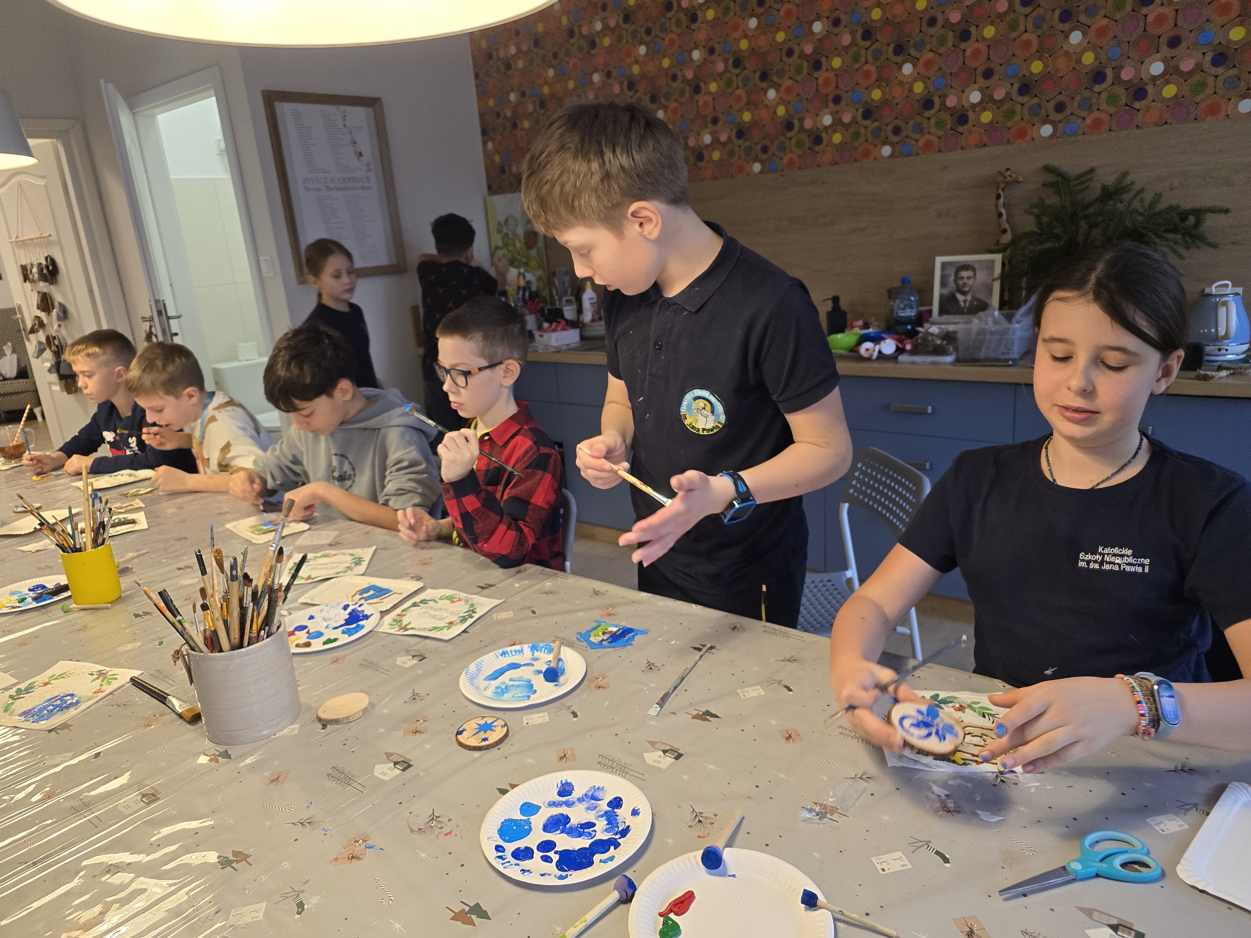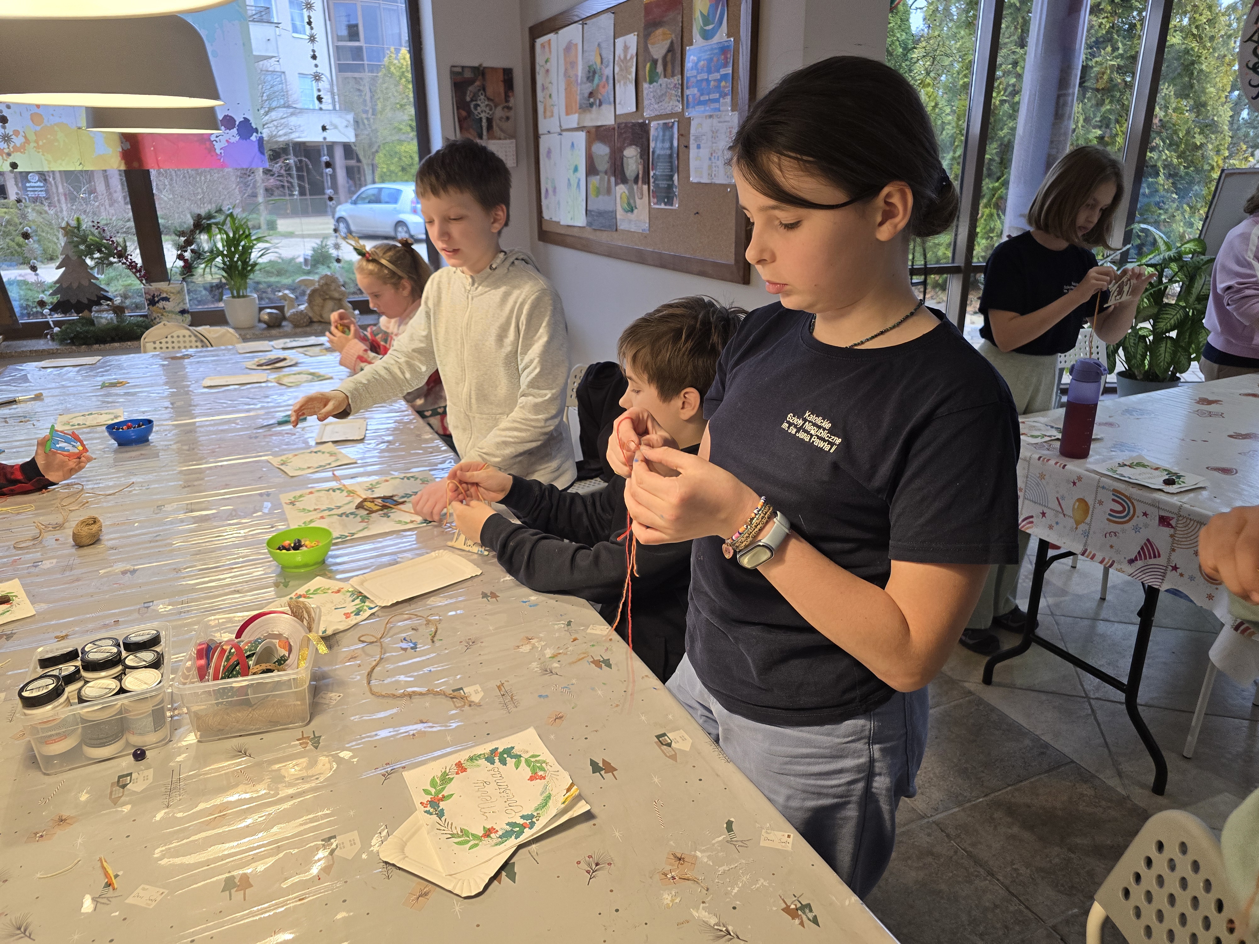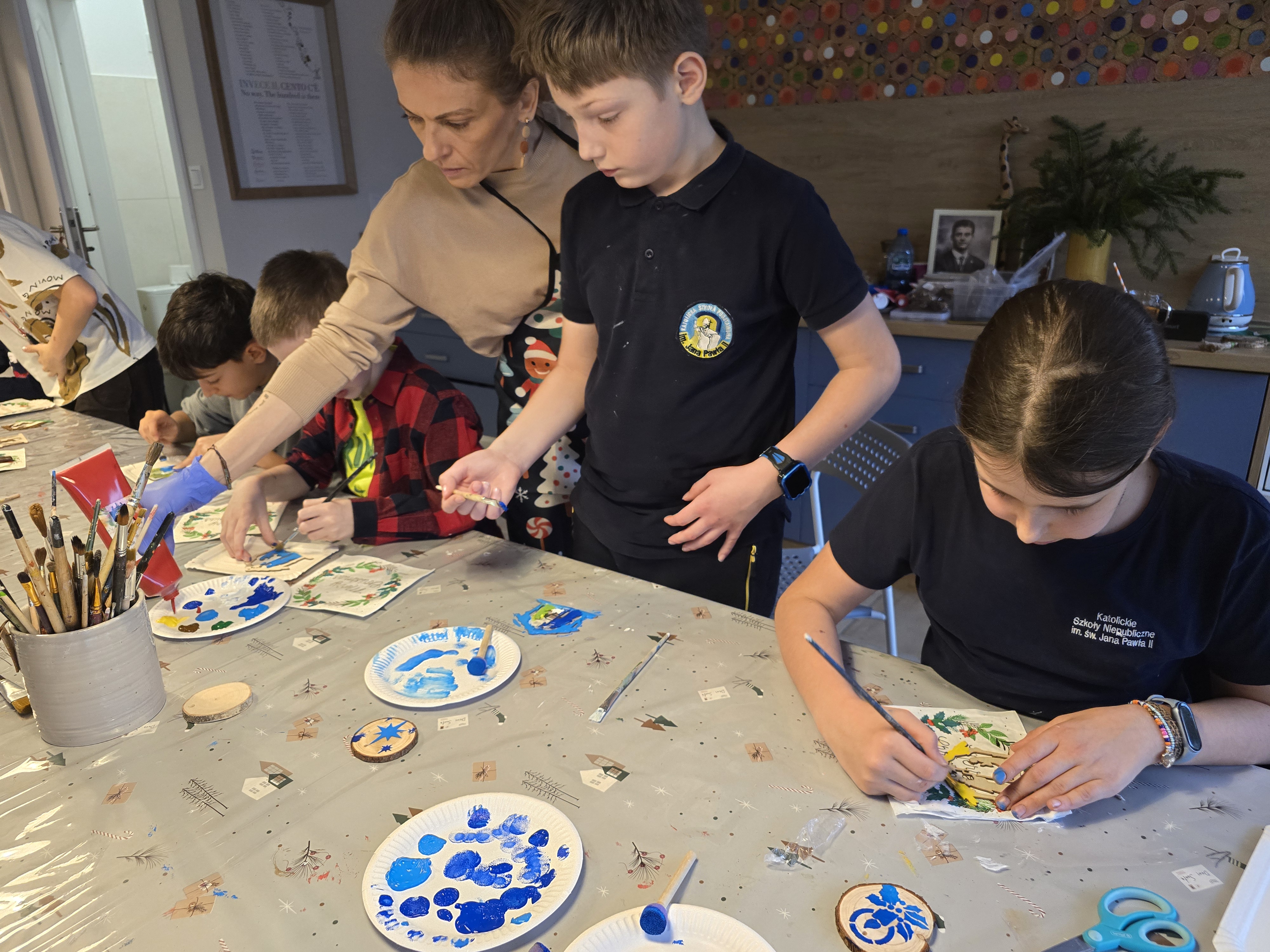 Jednak to nie koniec atrakcji. W Pracowni Frassati czekało na dzieci jeszcze wiele innych niespodzianek. Uczniowie mieli okazję spróbować swoich sił w tworzeniu innych świątecznych ozdób, wykorzystując różnorodne materiały i techniki. Powstawały piękne pomysłowe dekoracje, które upiększą świąteczne drzewka i wnętrza domów.
