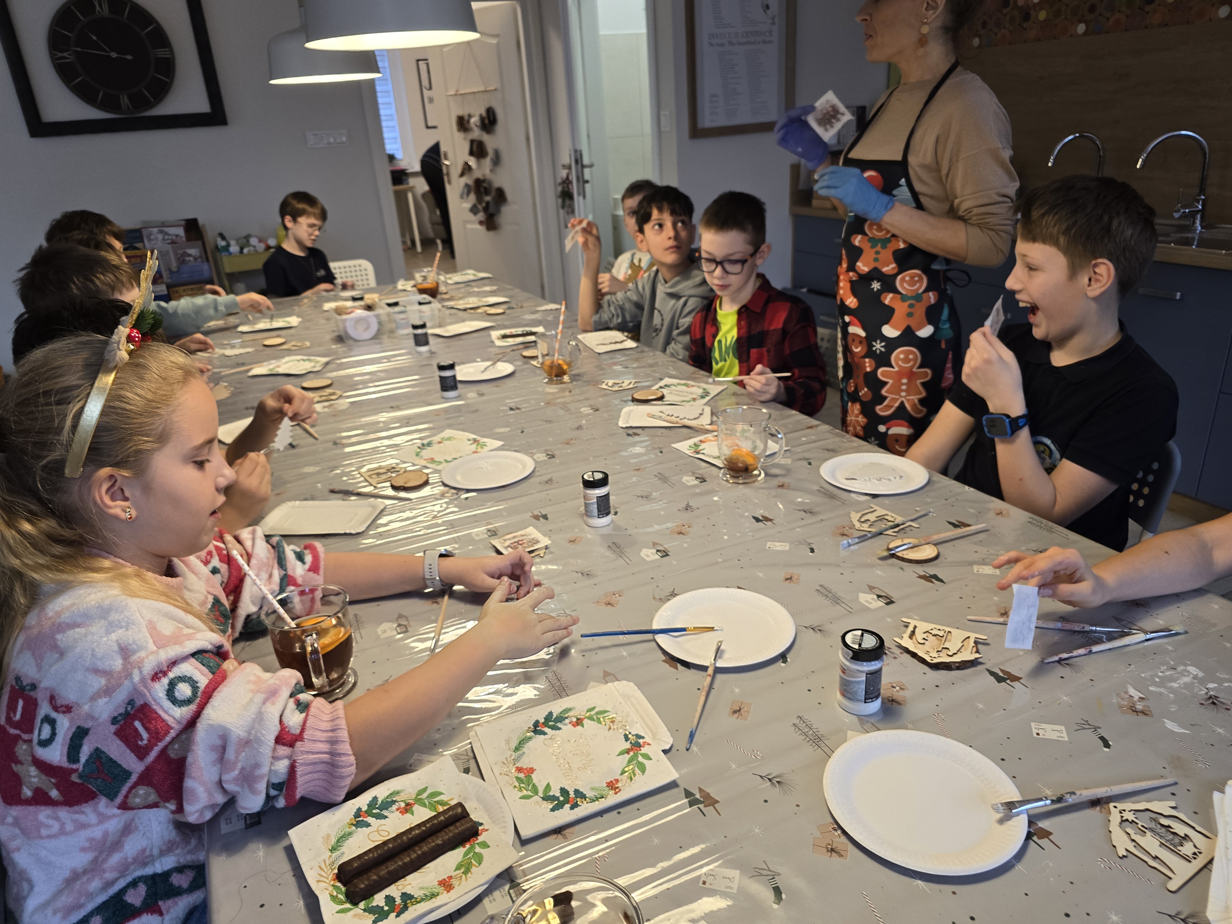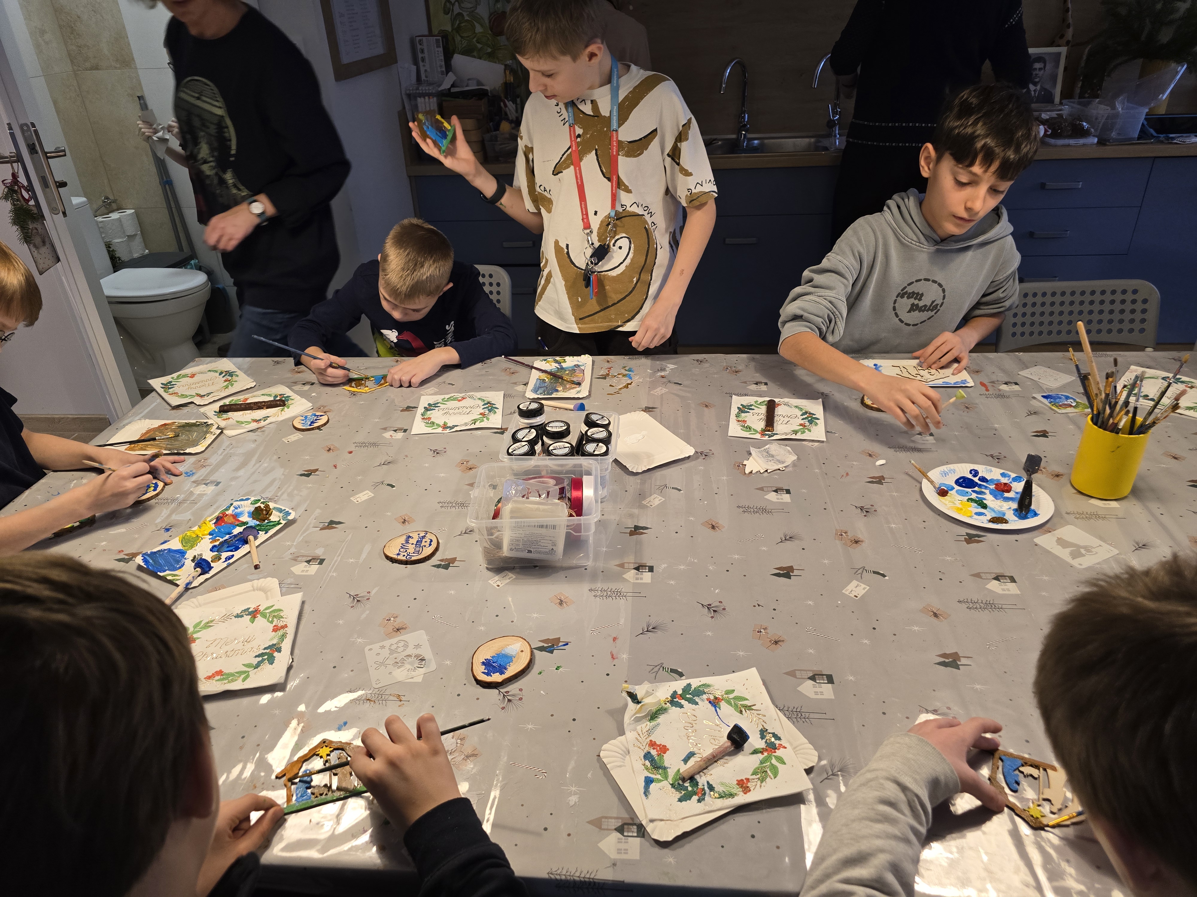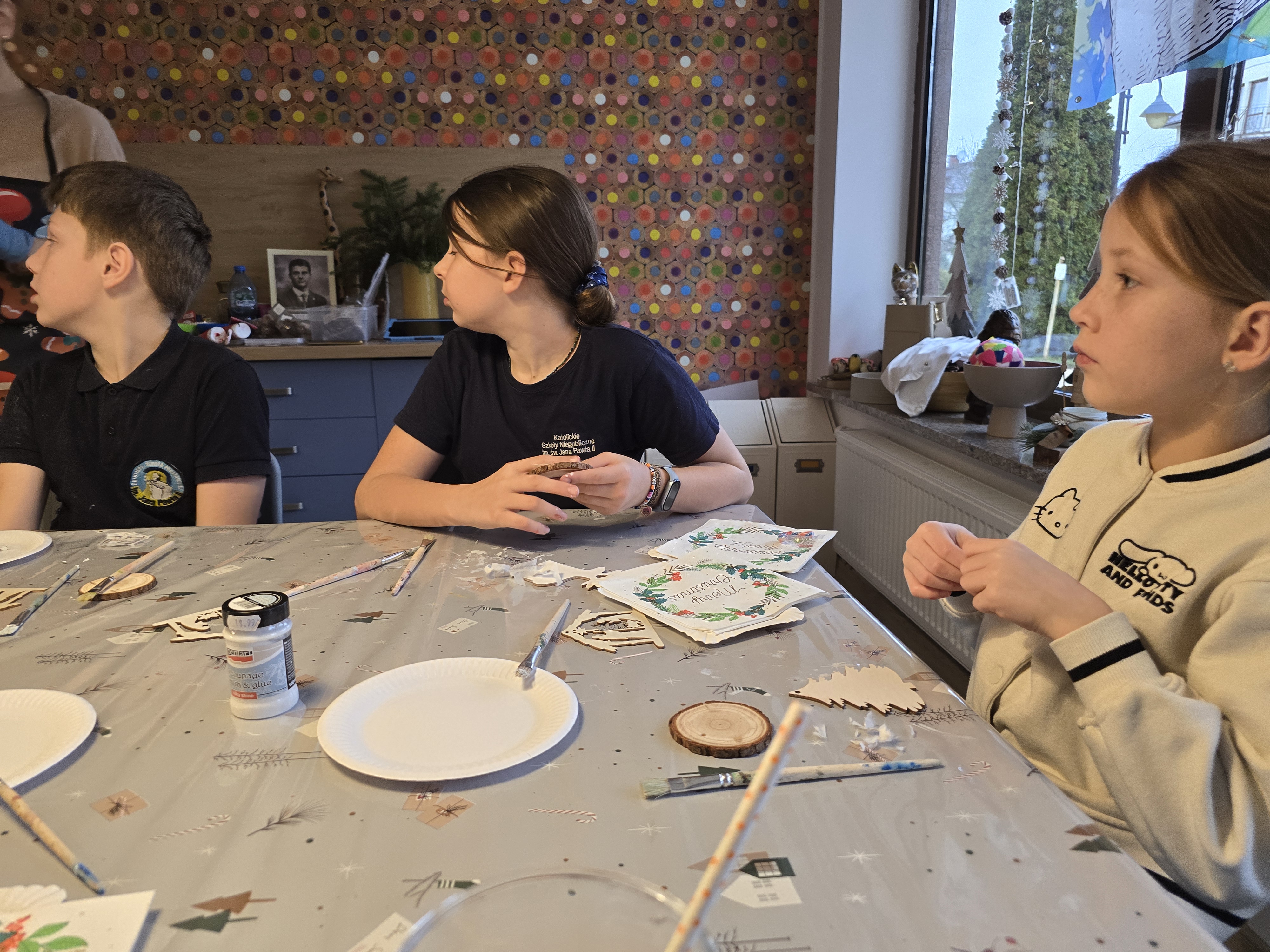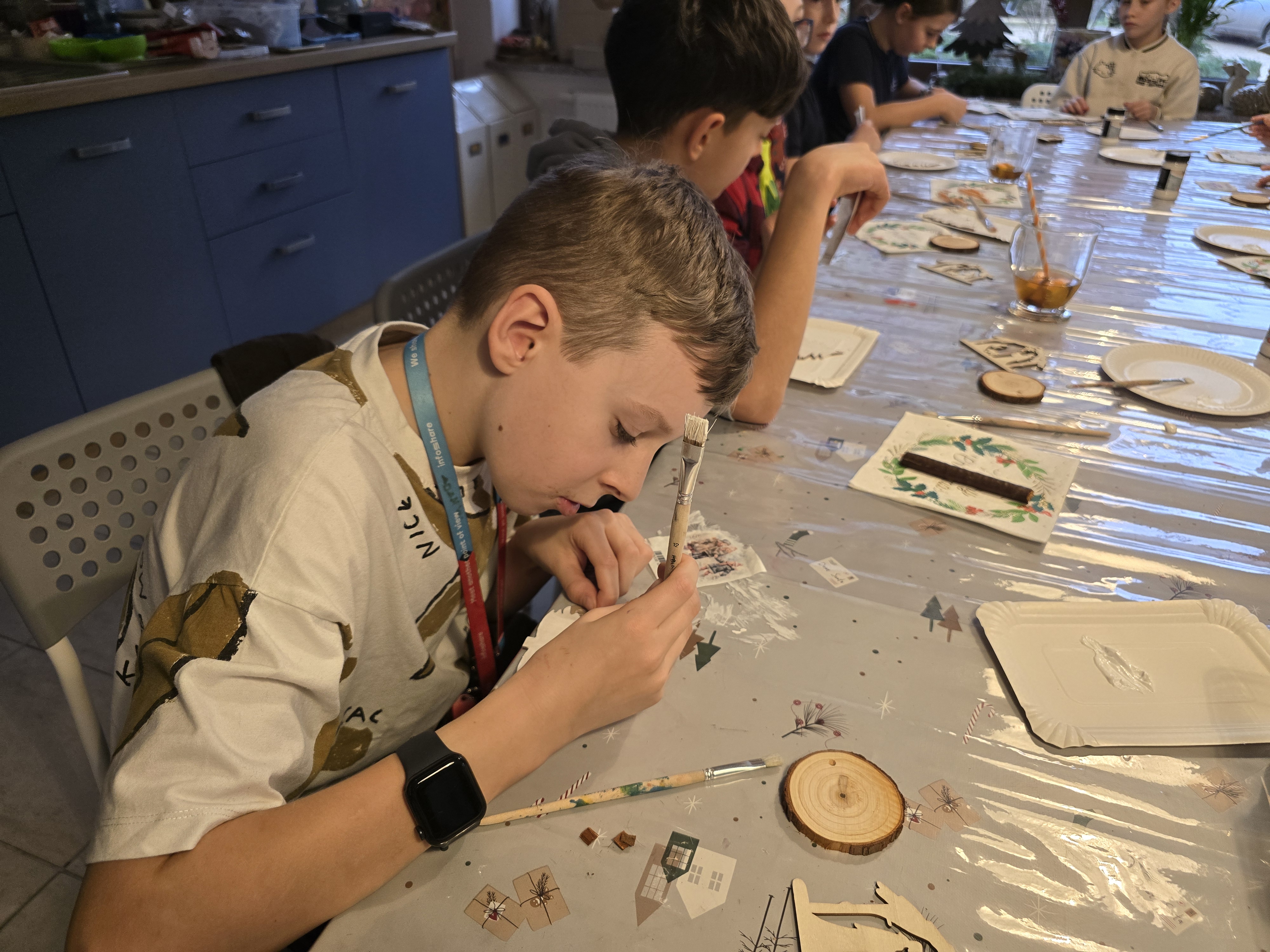 Jednak to nie koniec atrakcji. W Pracowni Frassati czekało na dzieci jeszcze wiele innych niespodzianek. Uczniowie mieli okazję spróbować swoich sił w tworzeniu innych świątecznych ozdób, wykorzystując różnorodne materiały i techniki. Powstawały piękne pomysłowe dekoracje, które upiększą świąteczne drzewka i wnętrza domów.