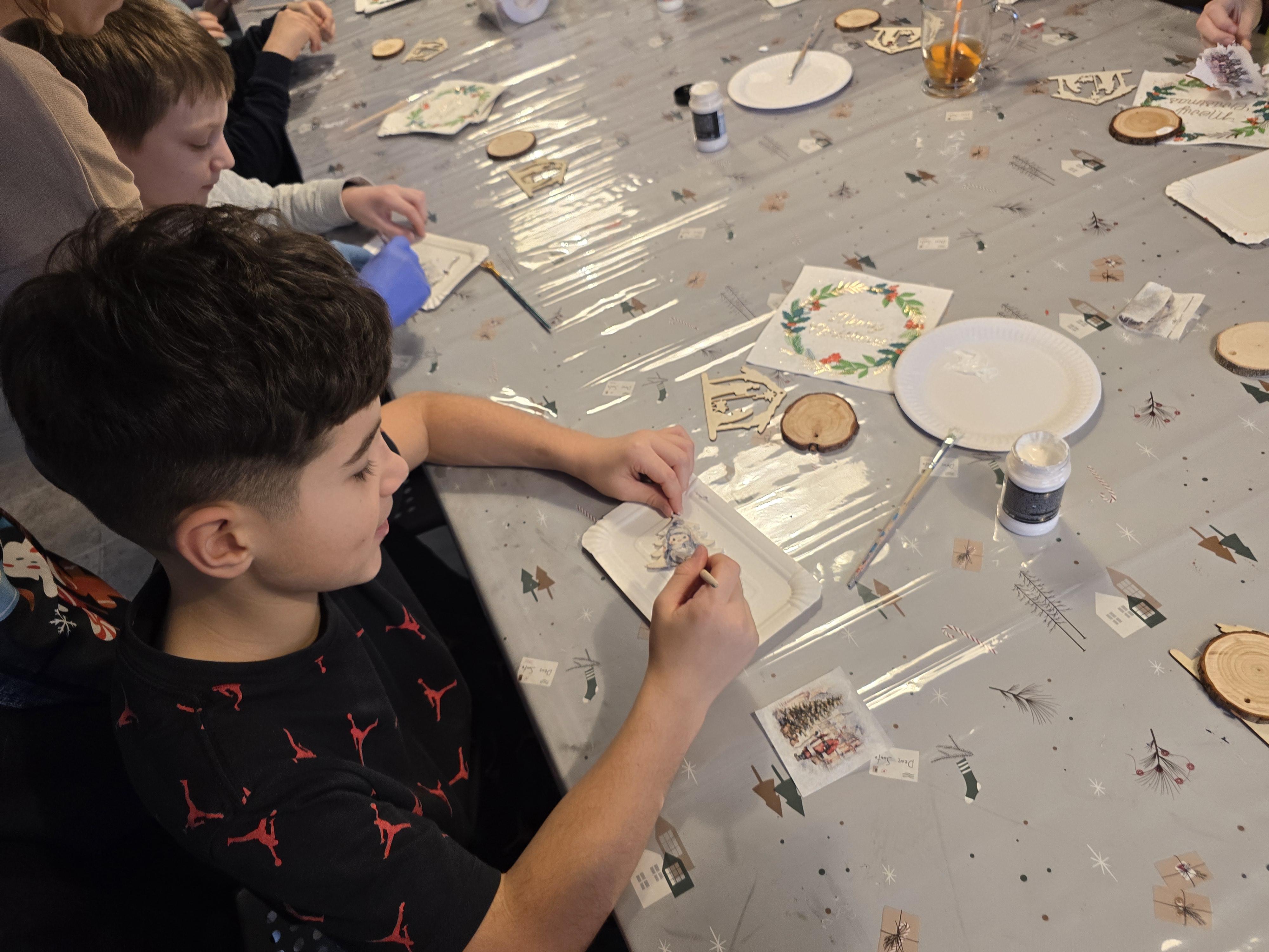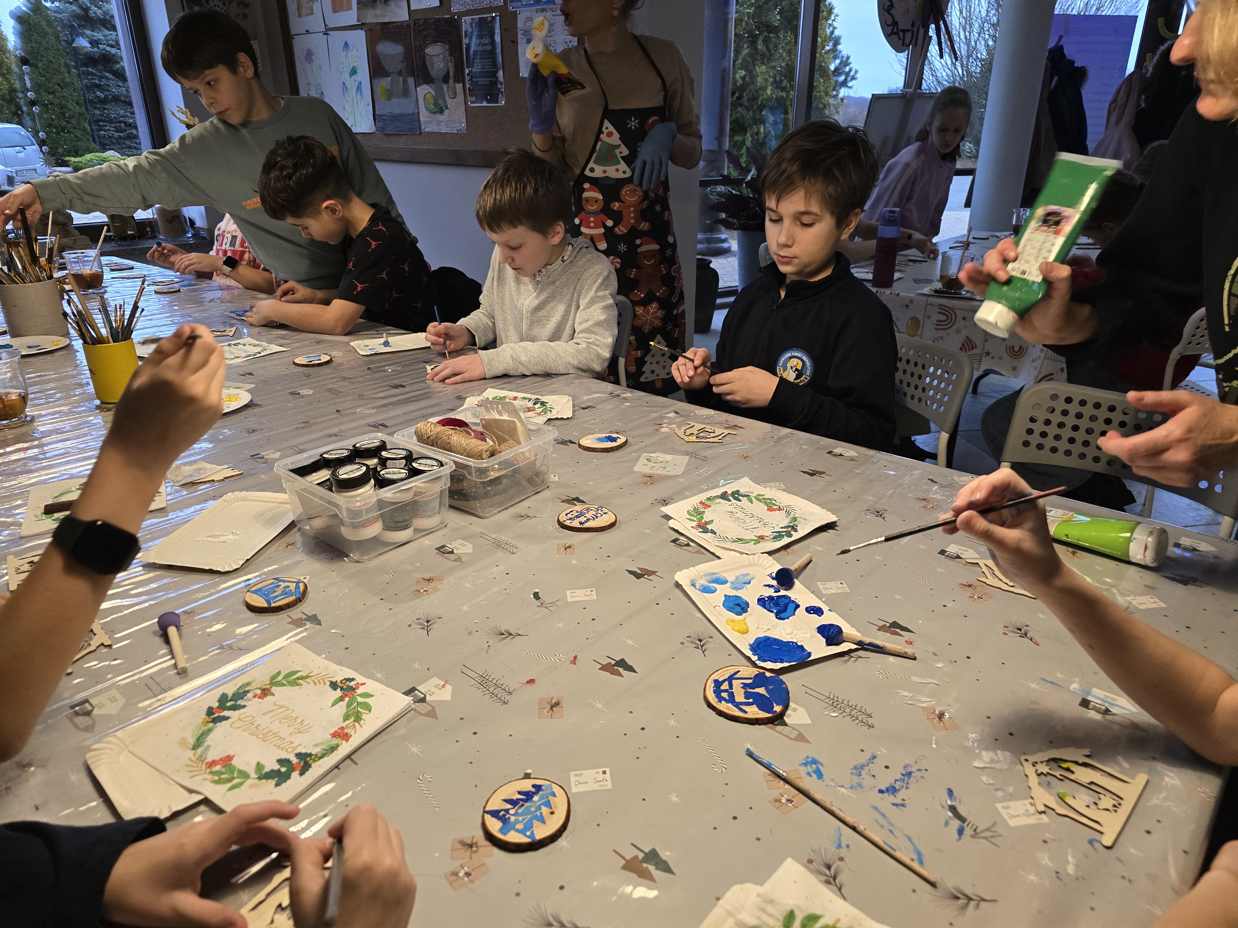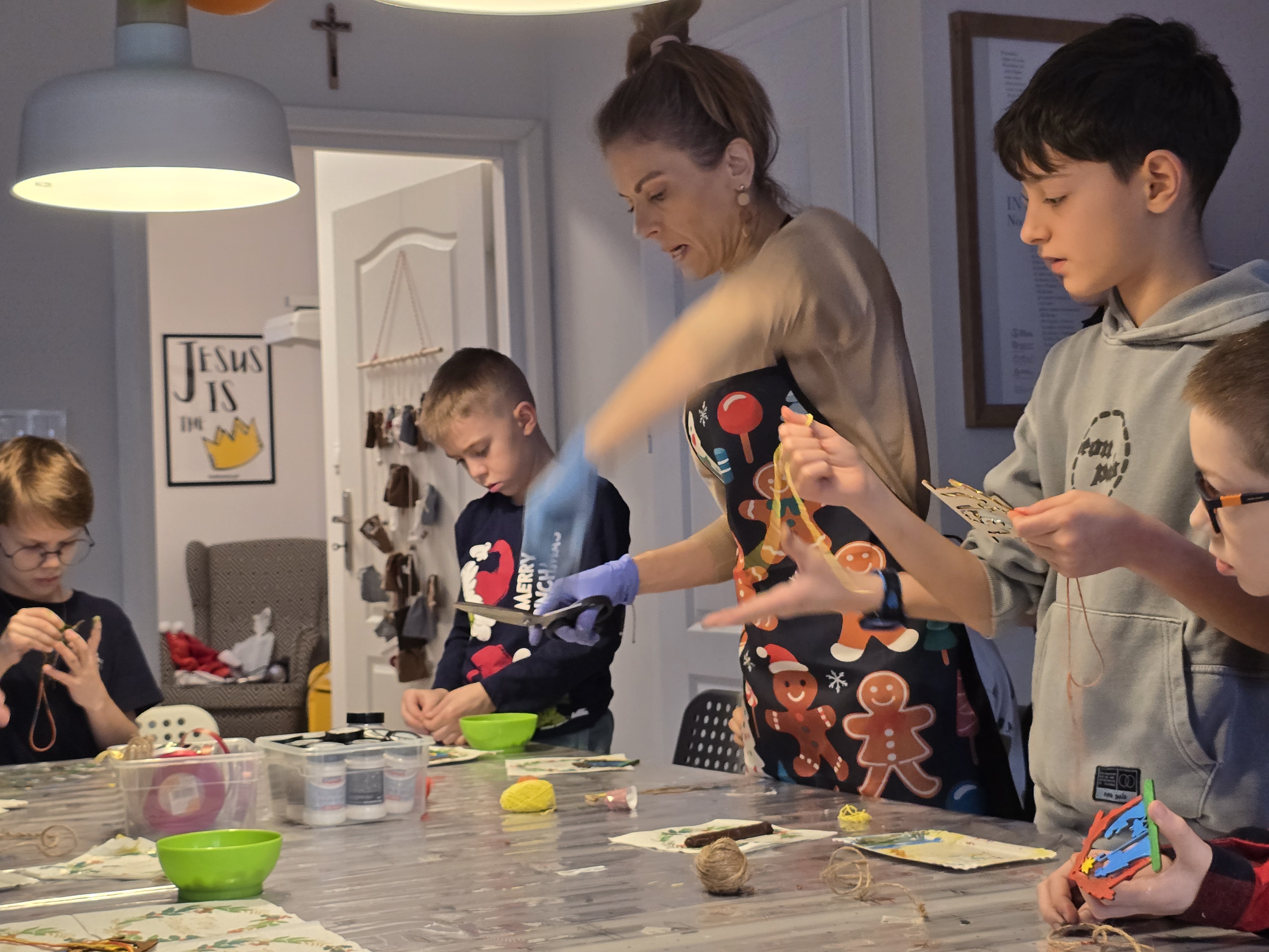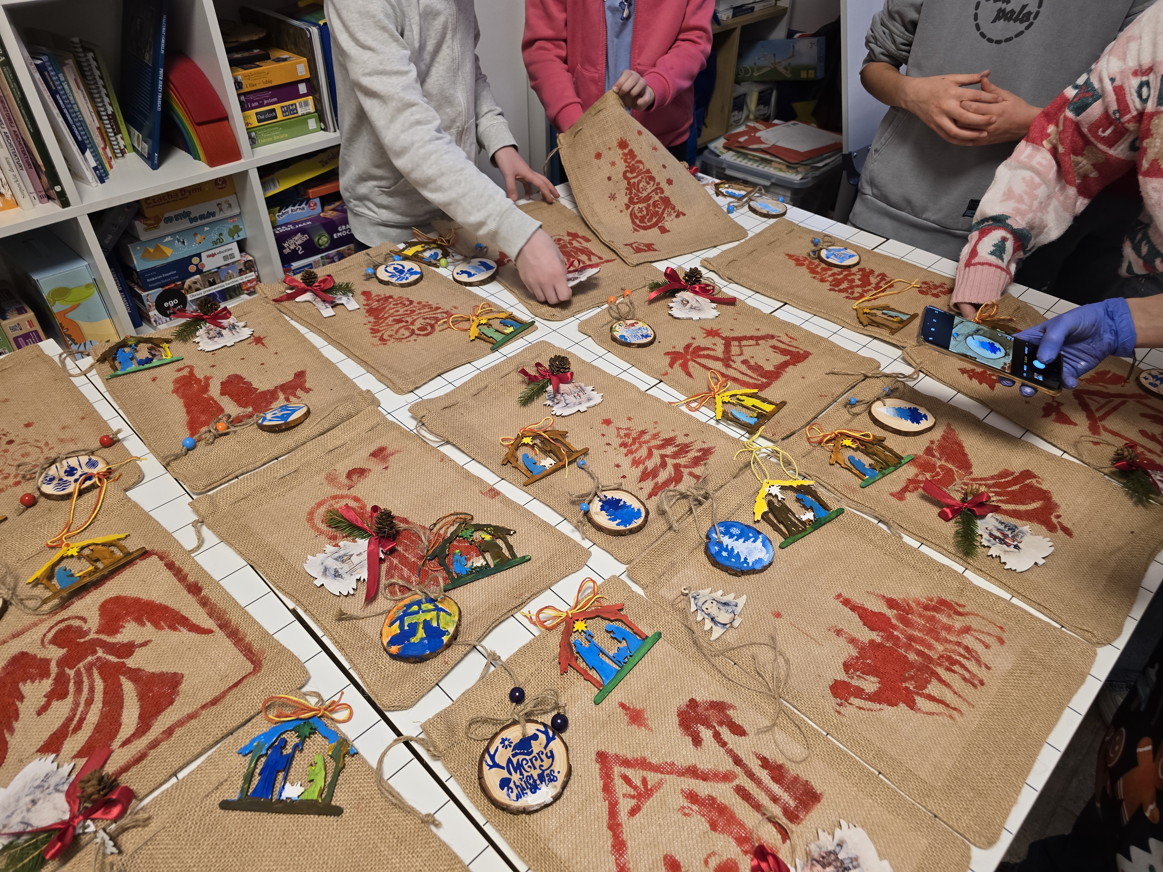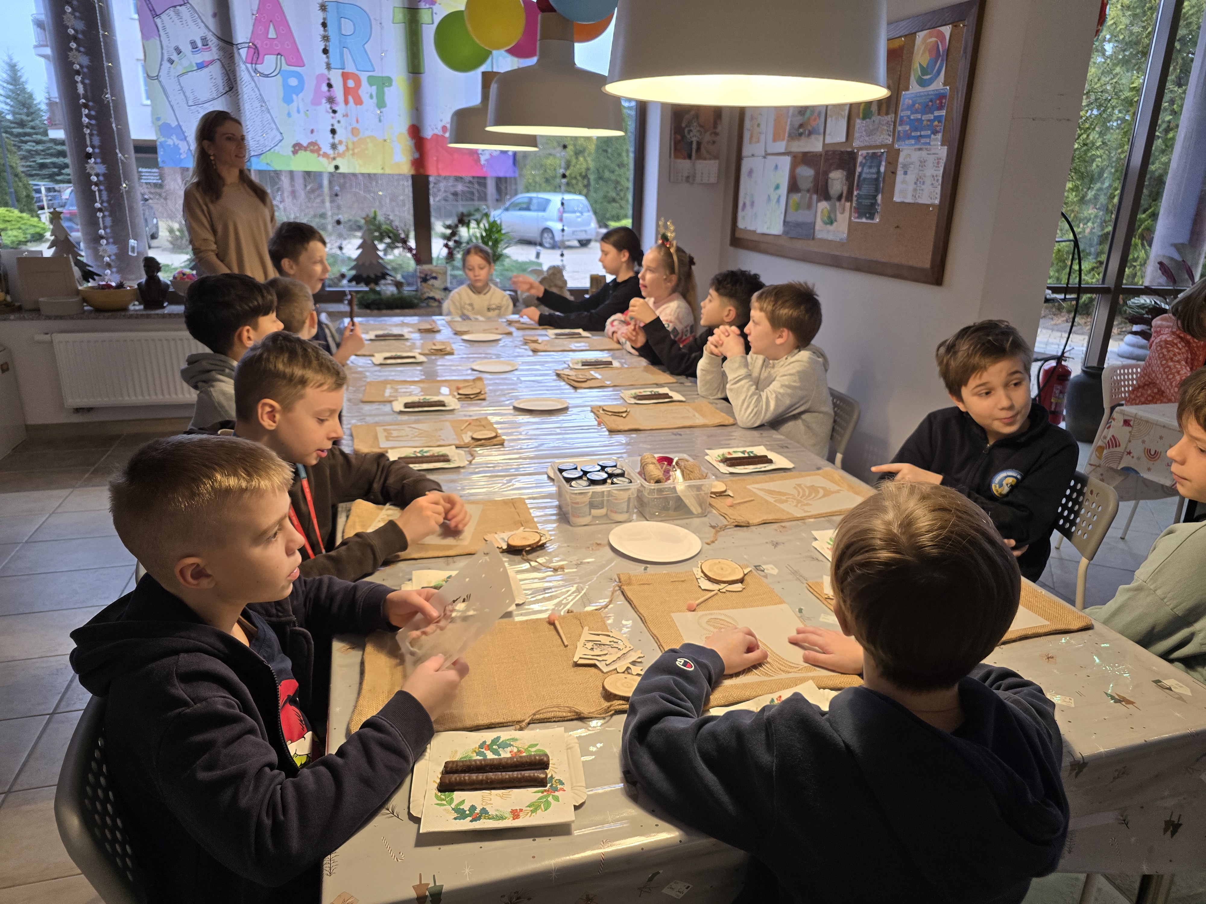 Jednak to nie koniec atrakcji. W Pracowni Frassati czekało na dzieci jeszcze wiele innych niespodzianek. Uczniowie mieli okazję spróbować swoich sił w tworzeniu innych świątecznych ozdób, wykorzystując różnorodne materiały i techniki. Powstawały piękne pomysłowe dekoracje, które upiększą świąteczne drzewka i wnętrza domów.