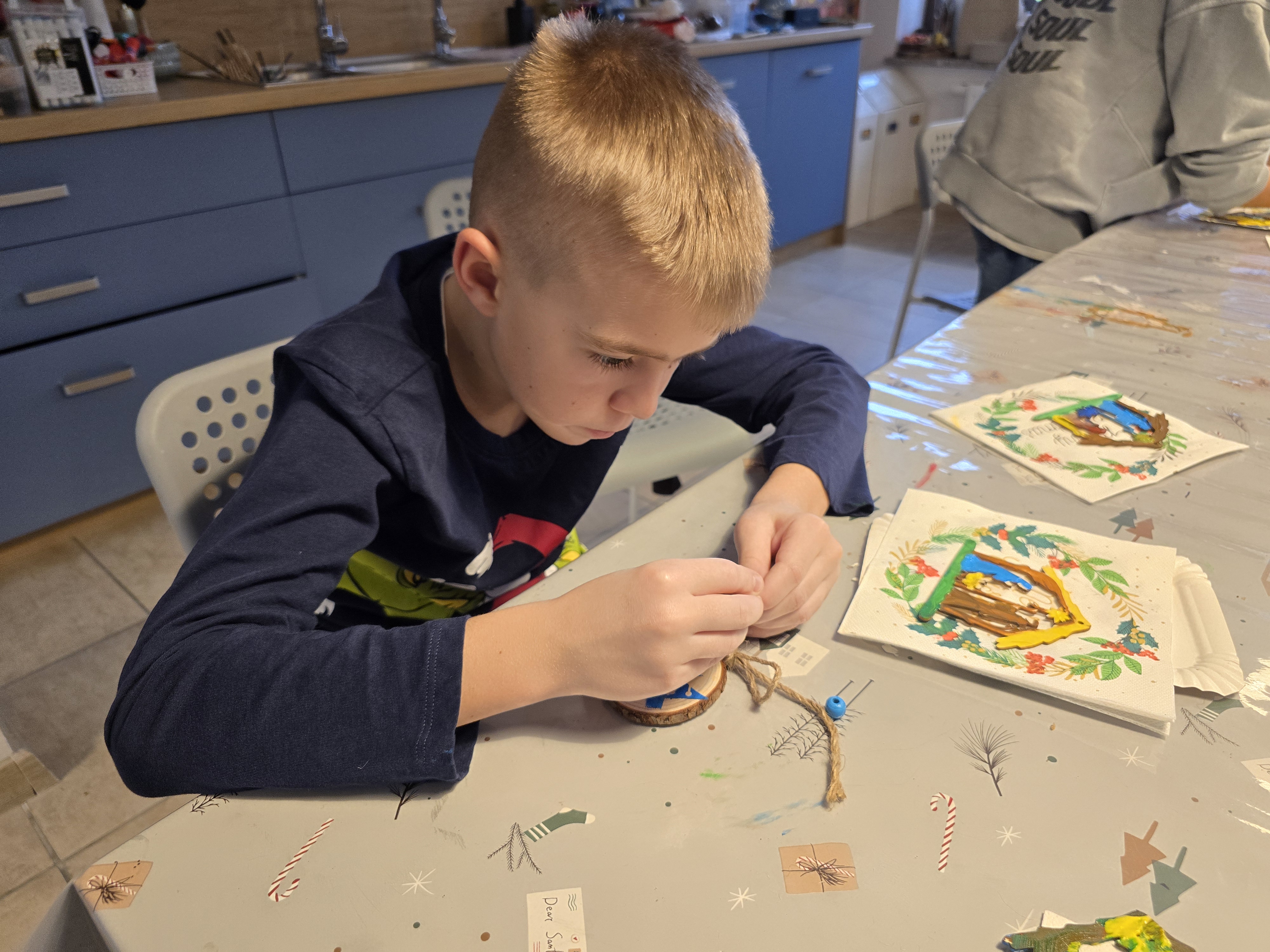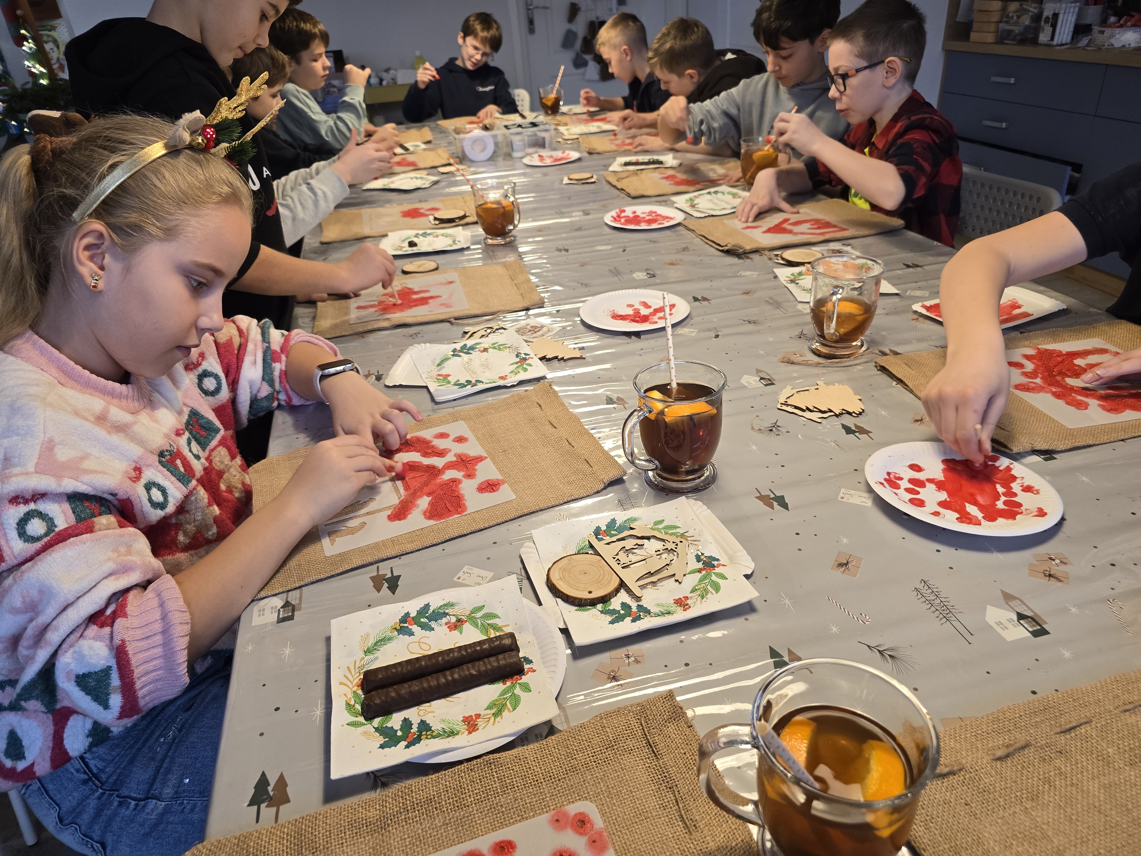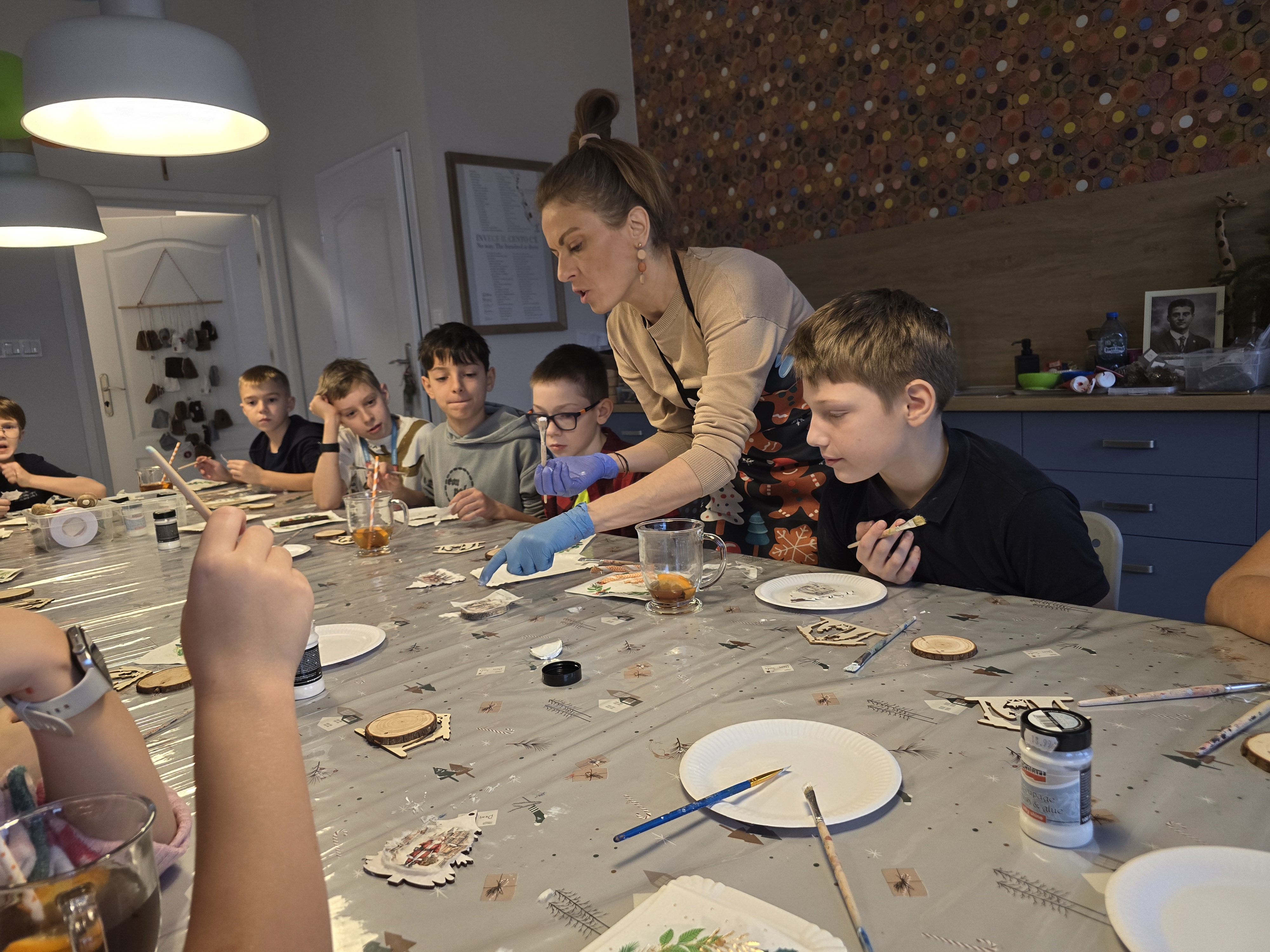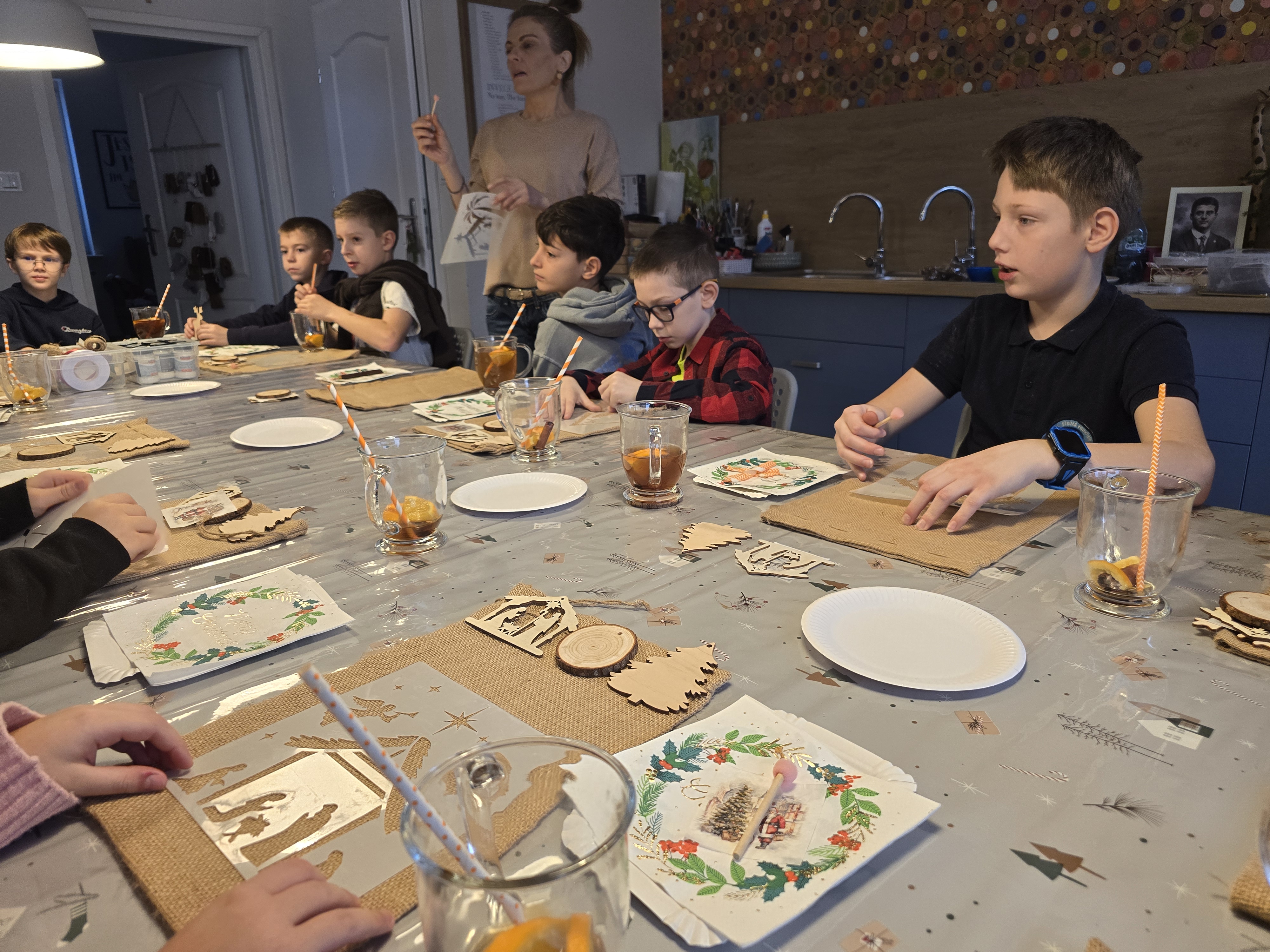 Kolejnym etapem warsztatów była technika decoupage, która otworzyła przed dziećmi zupełnie nowe możliwości. Uczniowie z ogromnym zaangażowaniem dekorowali bombki, naklejając na nie kolorowe serwetki z papieru ryżowego z bożonarodzeniowymi motywami. Precyzja, cierpliwość i odrobina magii sprawiły, że zwykłe, drewniane bombki zamieniły się w prawdziwe, błyszczące arcydzieła. Powstawały bombki z aniołkami, Mikołajami, śnieżynkami i innymi postaciami, które wkrótce zawisną na choinkach, wprowadzając do domów świąteczny nastrój.