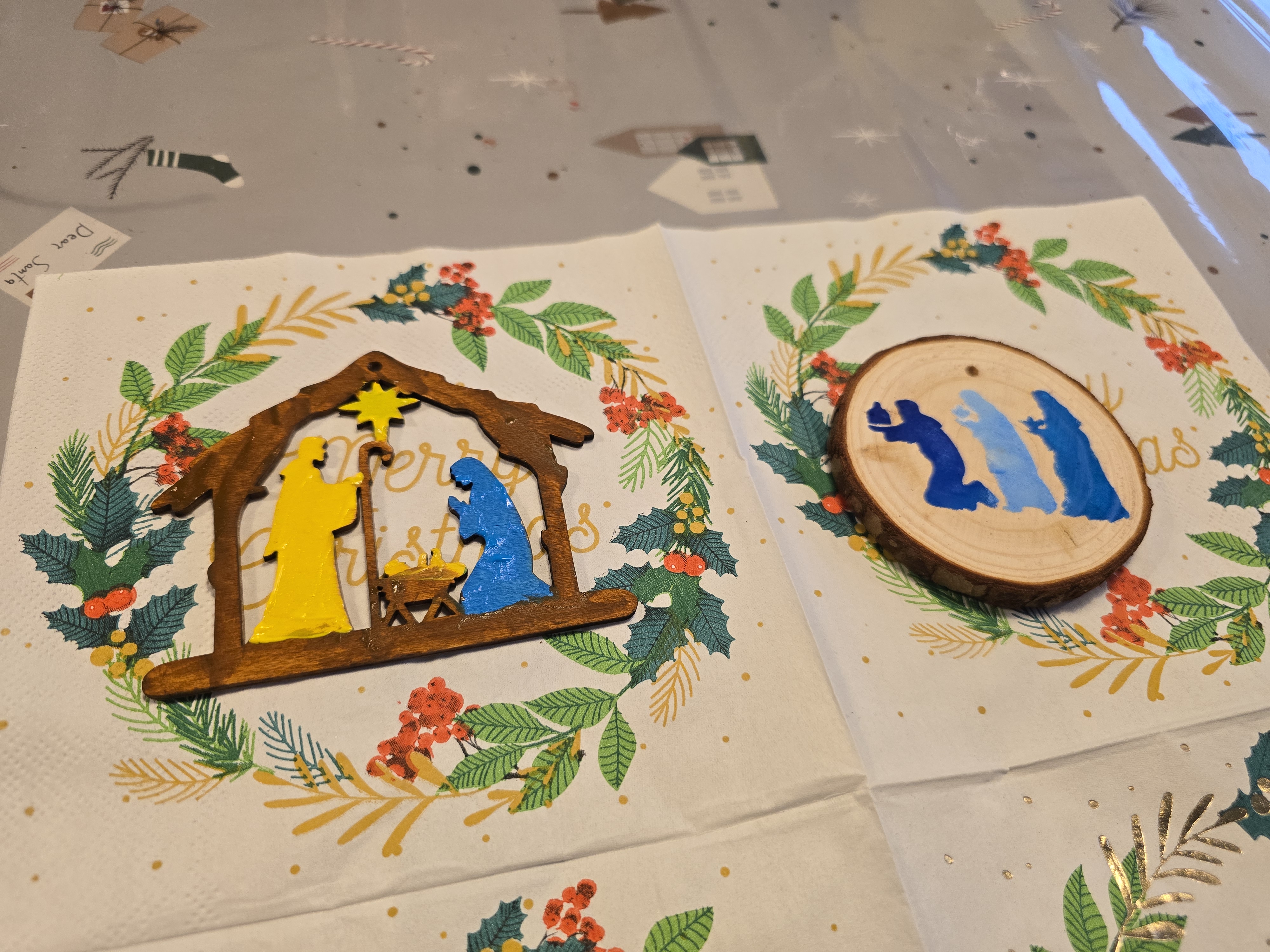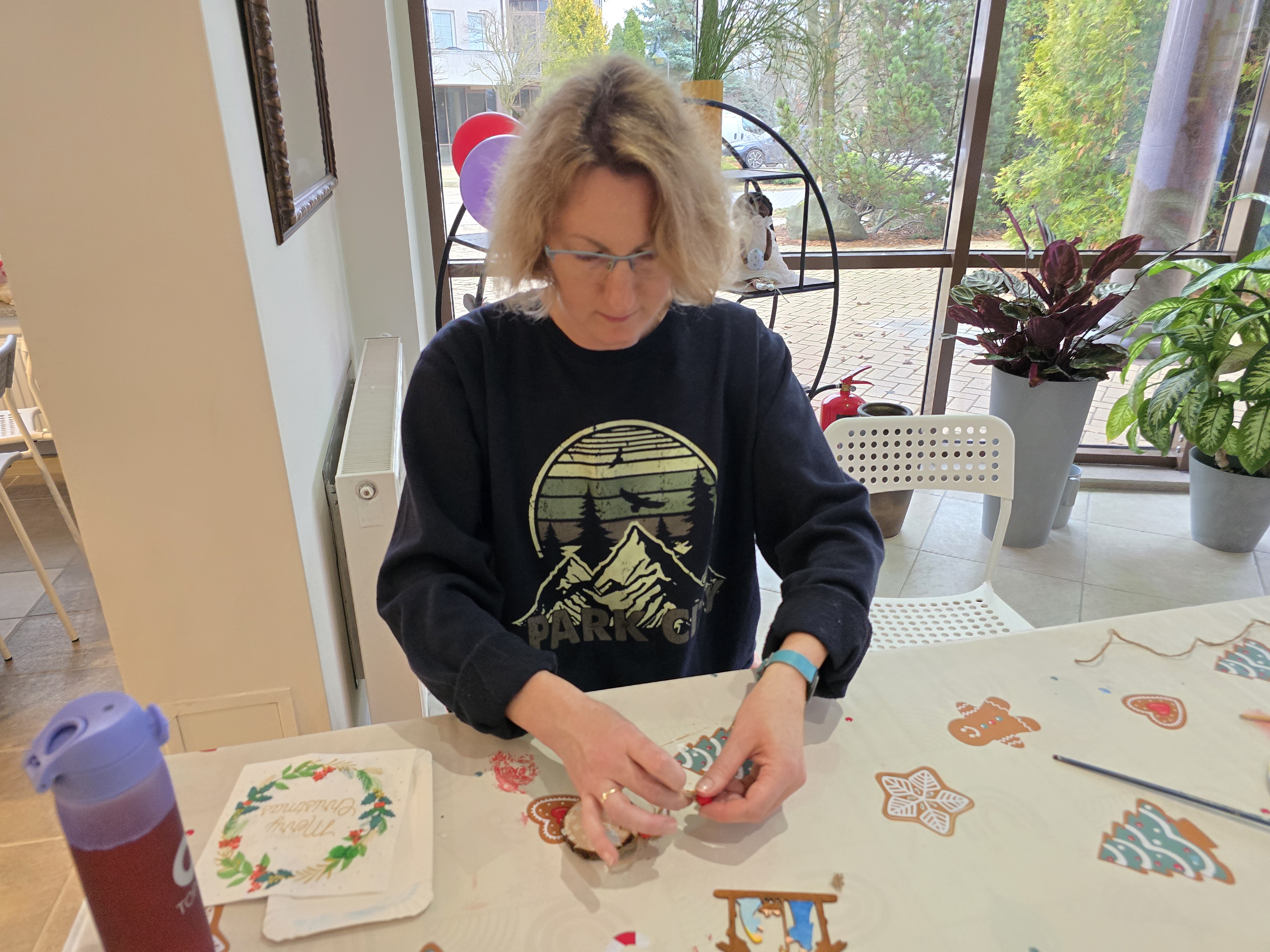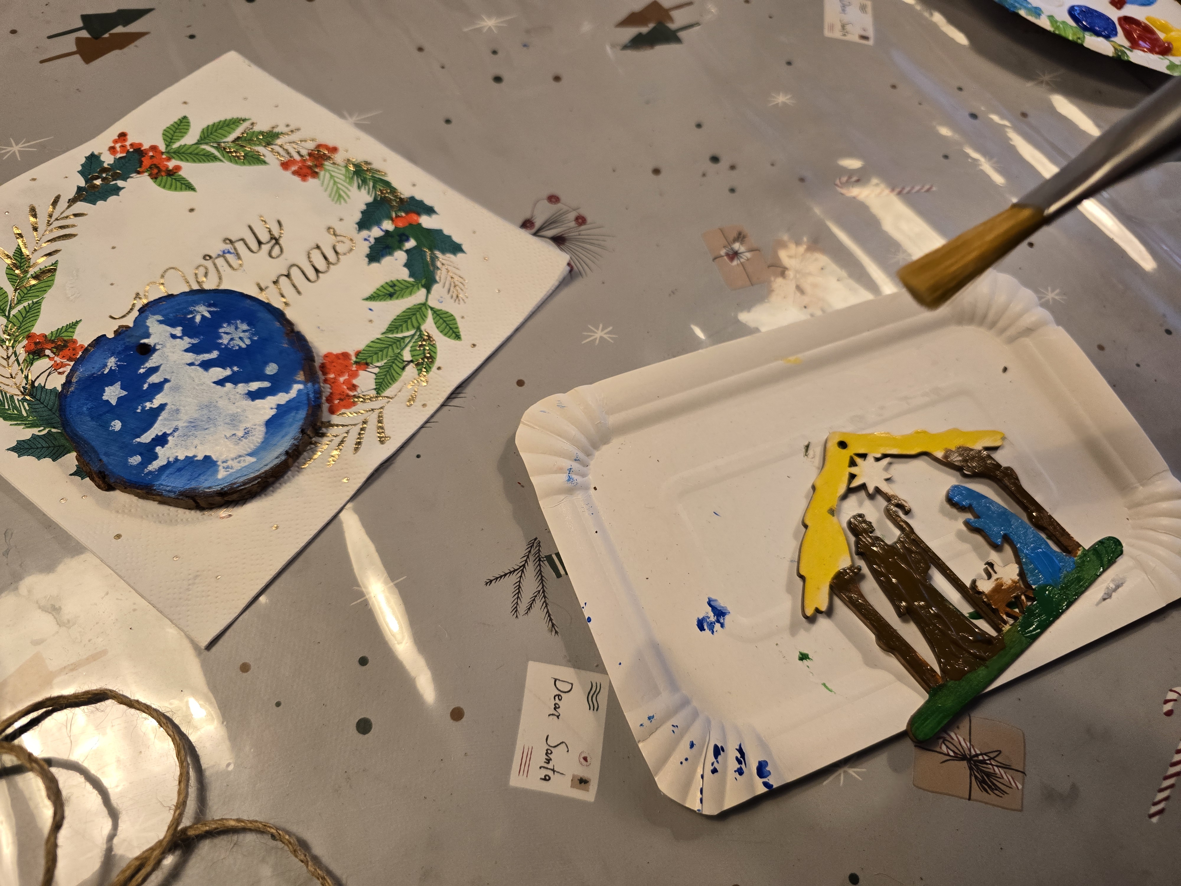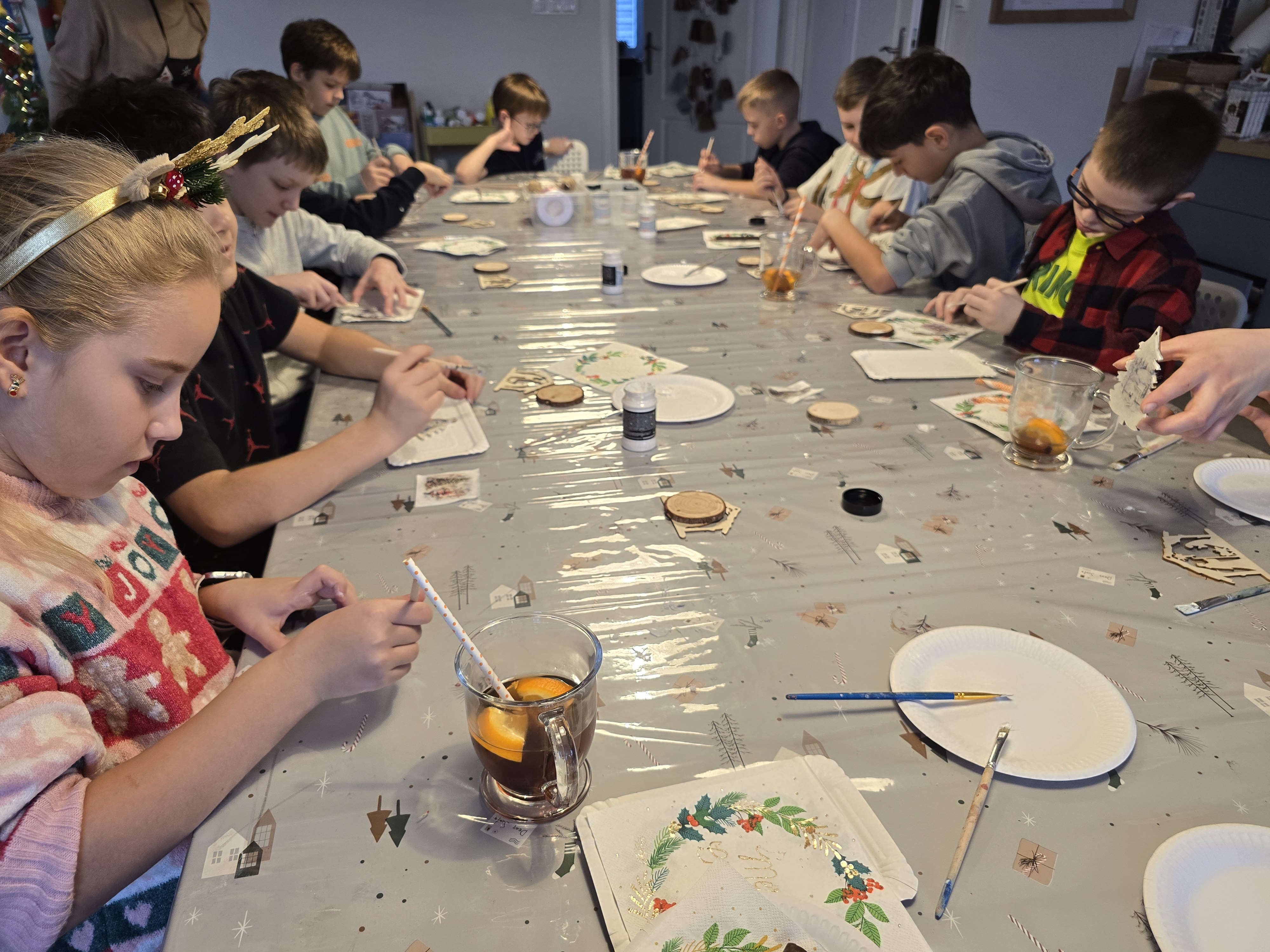 Kolejnym etapem warsztatów była technika decoupage, która otworzyła przed dziećmi zupełnie nowe możliwości. Uczniowie z ogromnym zaangażowaniem dekorowali bombki, naklejając na nie kolorowe serwetki z papieru ryżowego z bożonarodzeniowymi motywami. Precyzja, cierpliwość i odrobina magii sprawiły, że zwykłe, drewniane bombki zamieniły się w prawdziwe, błyszczące arcydzieła. Powstawały bombki z aniołkami, Mikołajami, śnieżynkami i innymi postaciami, które wkrótce zawisną na choinkach, wprowadzając do domów świąteczny nastrój.