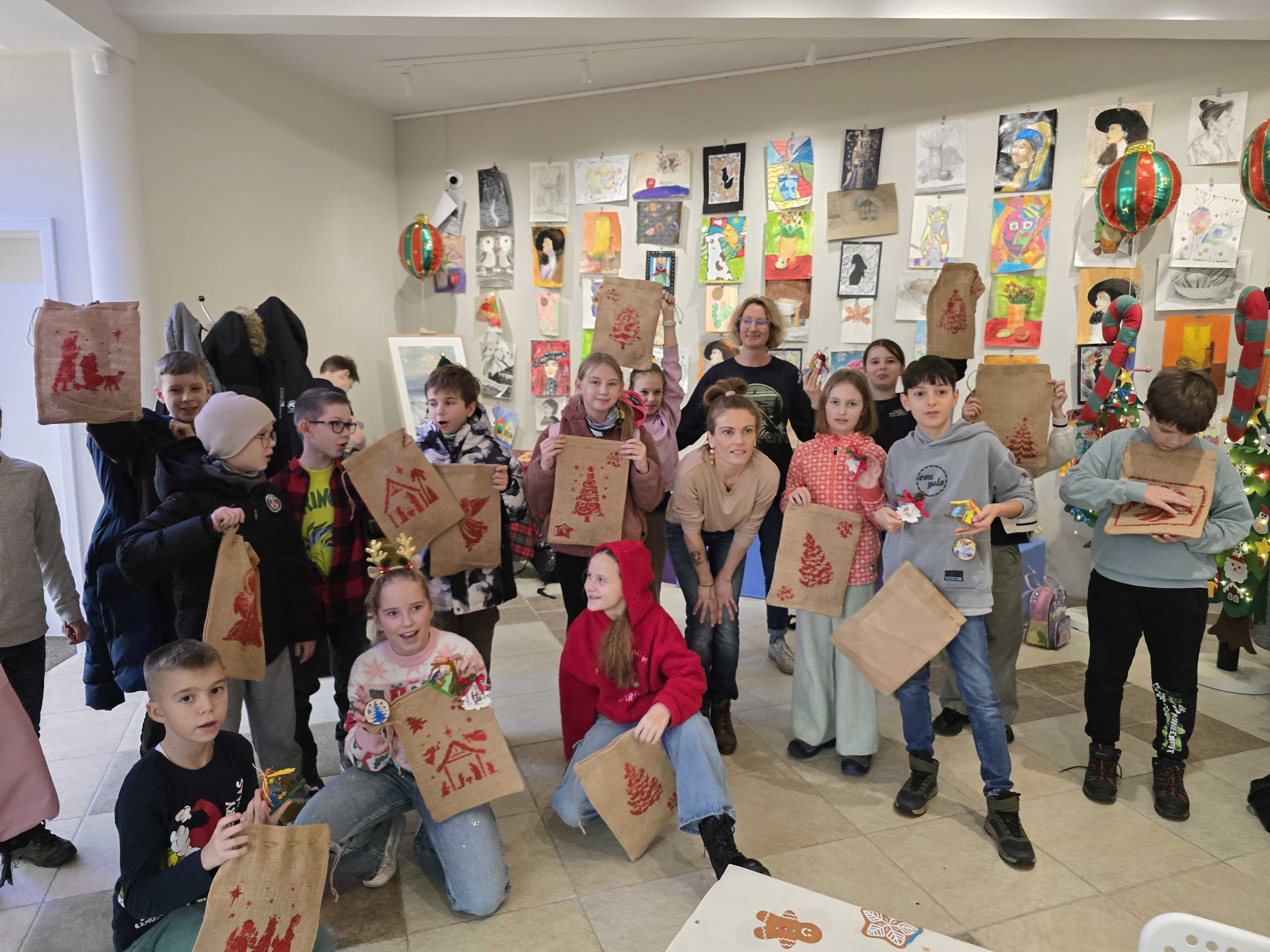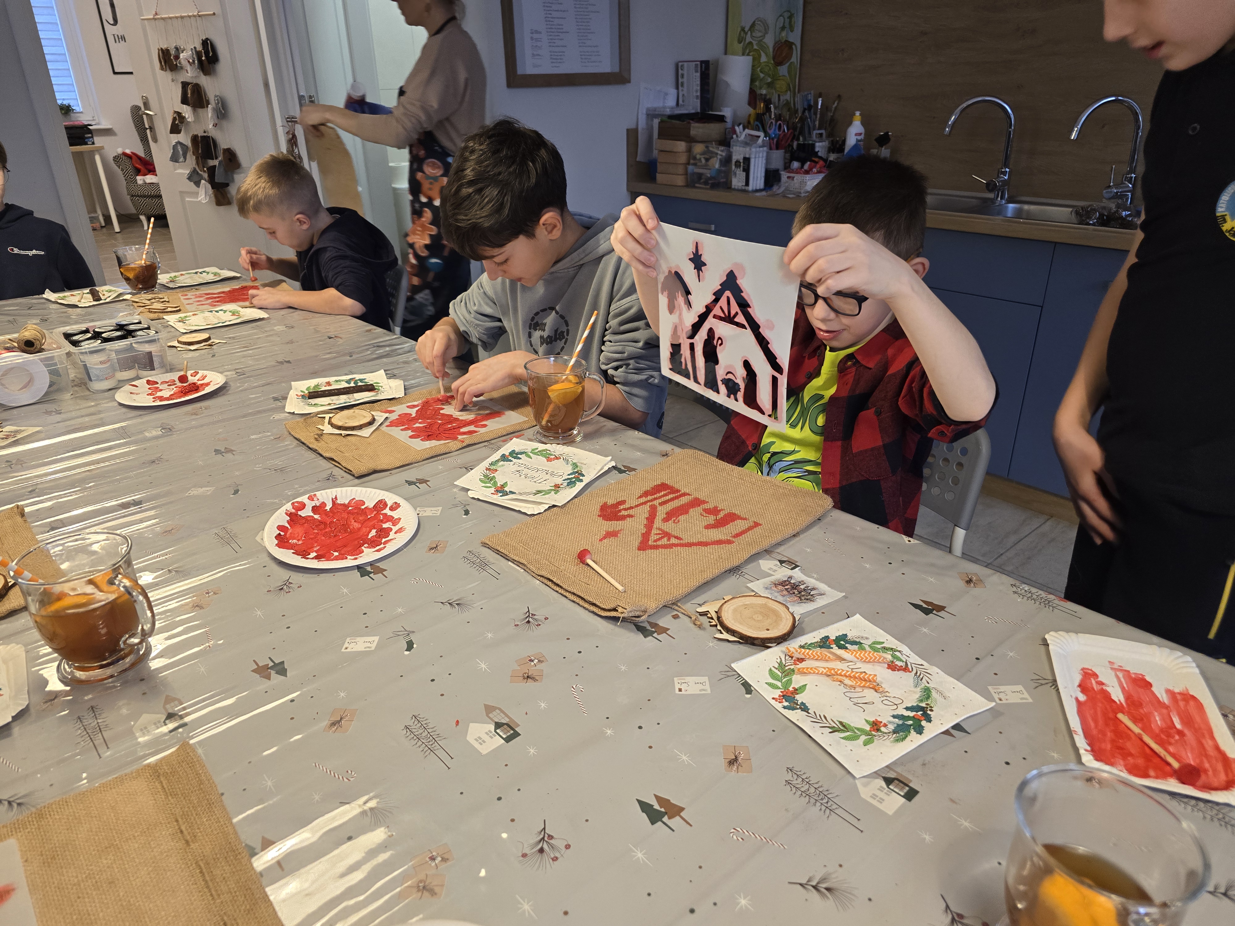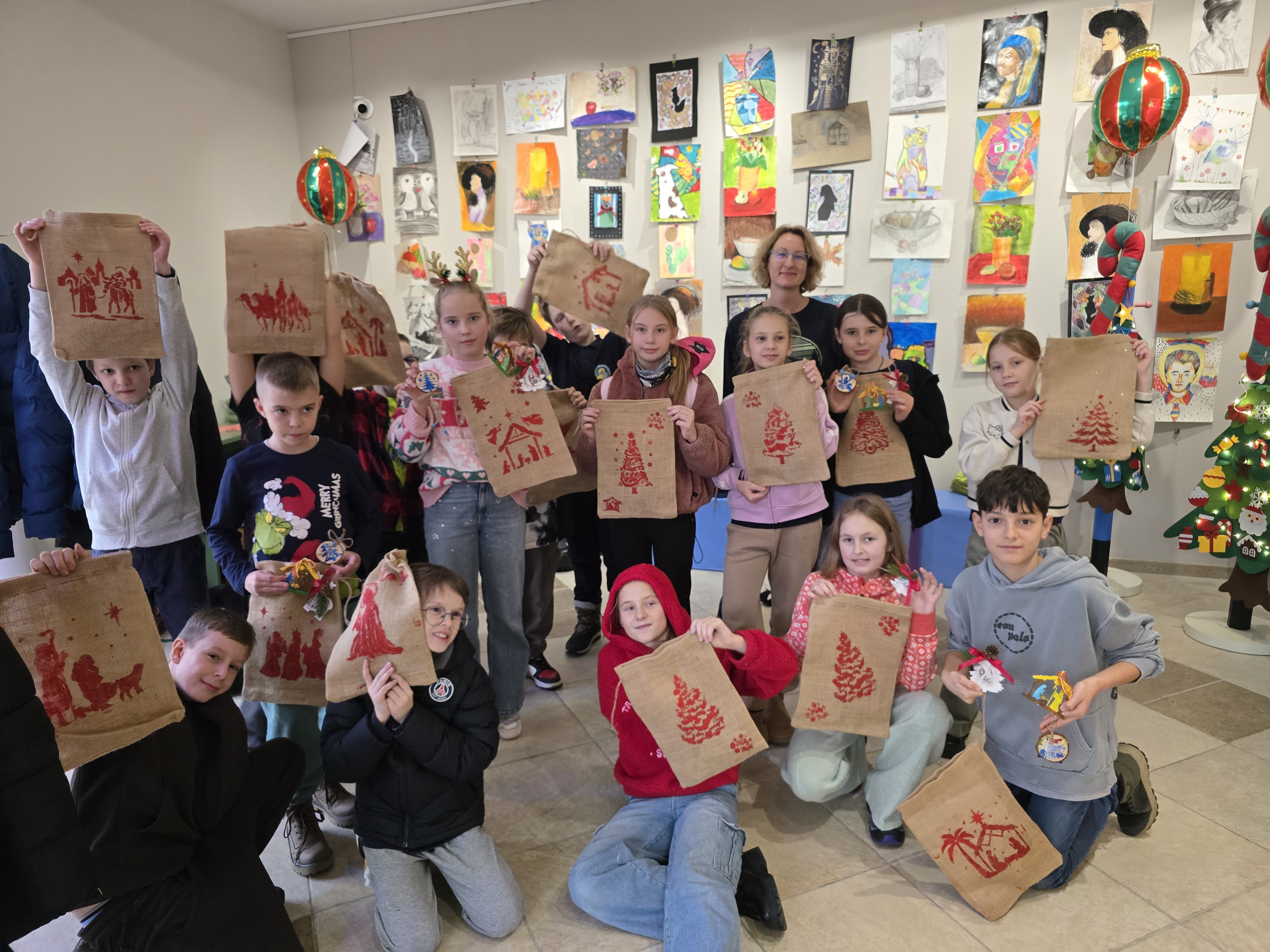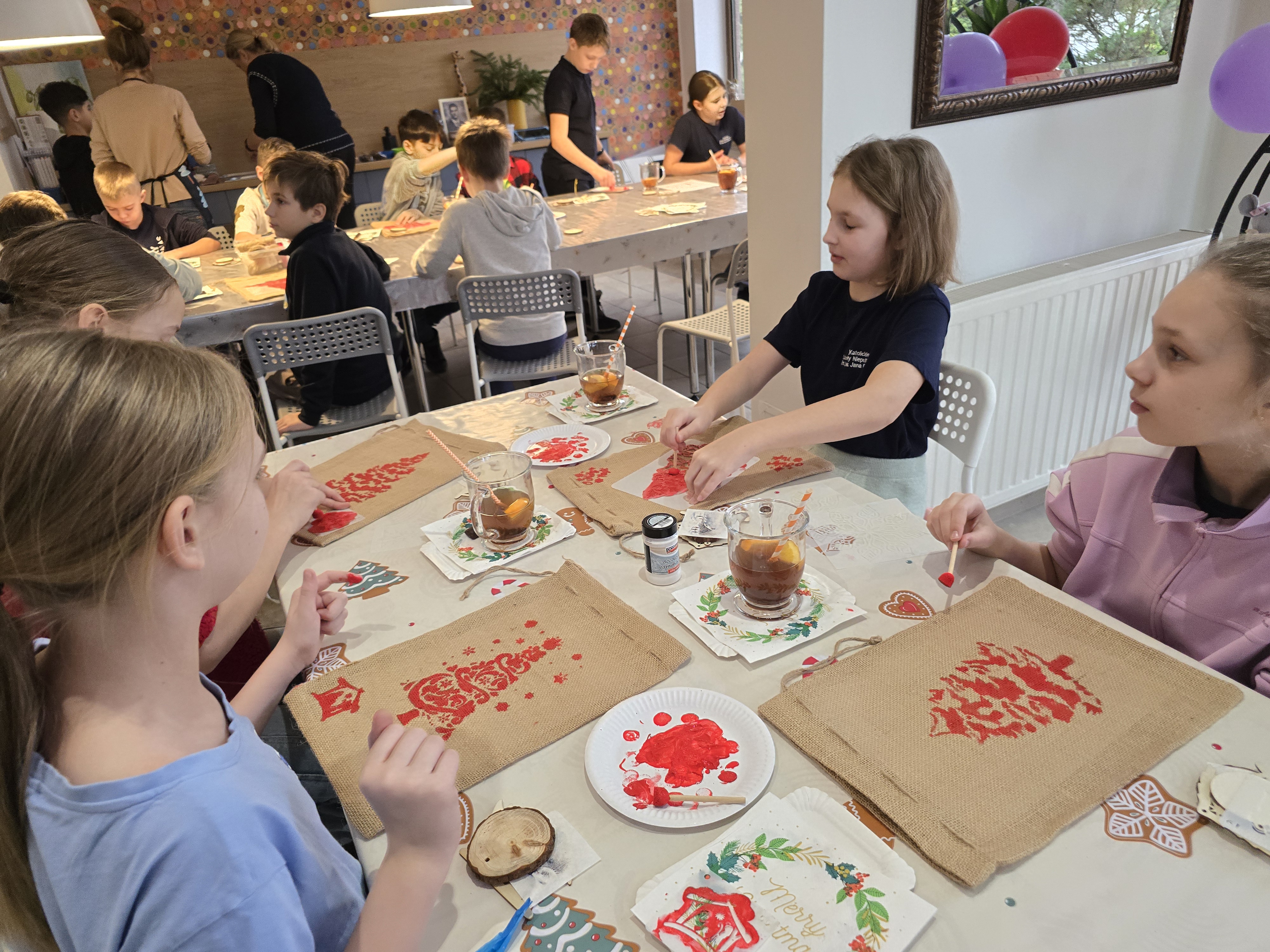Już od progu pracownia witała uczniów ciepłem i serdecznością. Uśmiechnięte twarze prowadzących i zapachy farb, kleju mieszające się z pachnącą przyprawami korzennymi, cynamonem i pomarańczą herbatką zwiastowały niesamowite doznania. Pierwszym zadaniem, które czekało na młodych artystów, było malowanie na workach. Każdy uczeń otrzymał swój własny, płócienny worek, który miał zamienić się w unikatowe dzieło sztuki. Dzieci z zapałem chwyciły za pędzle i farby, przenosząc na materiał swoje świąteczne wizje. Na workach zaczęły pojawiać się choinki, bałwanki, renifery i gwiazdki, a także imiona, życzenia i całe sceny z wigilijnej nocy. Każdy worek był inny, wyjątkowy, odzwierciedlający indywidualność i kreatywność młodych twórców.