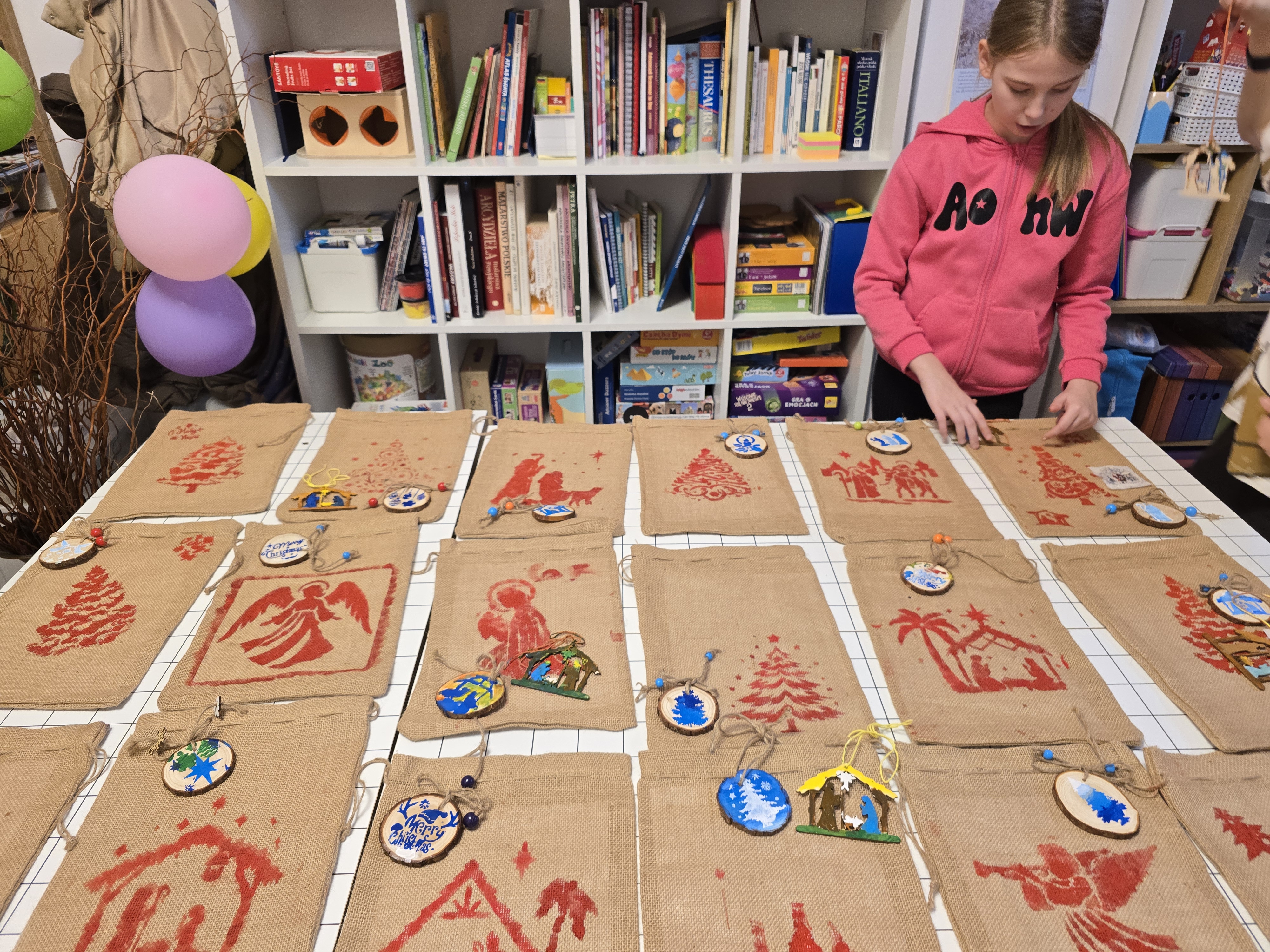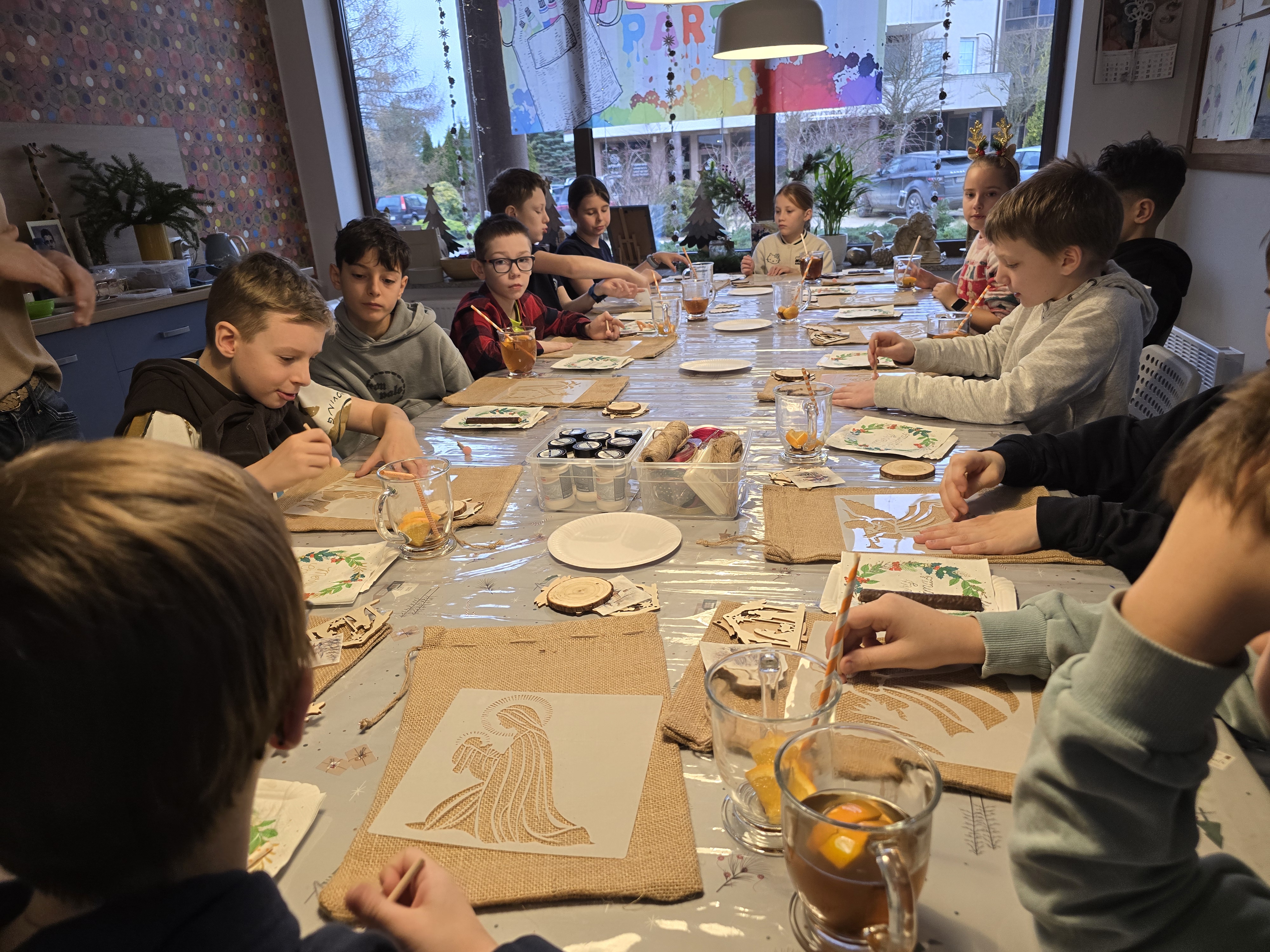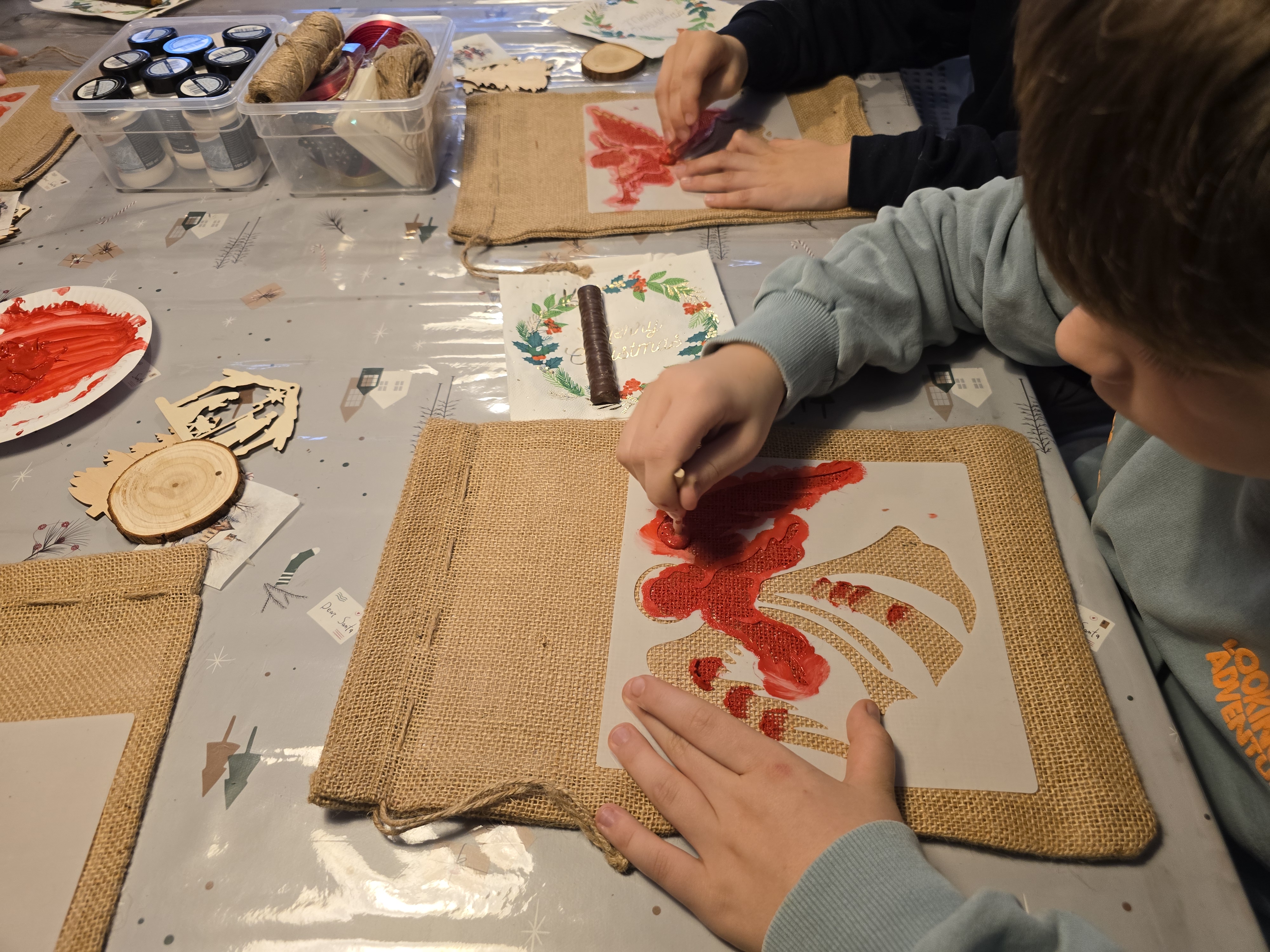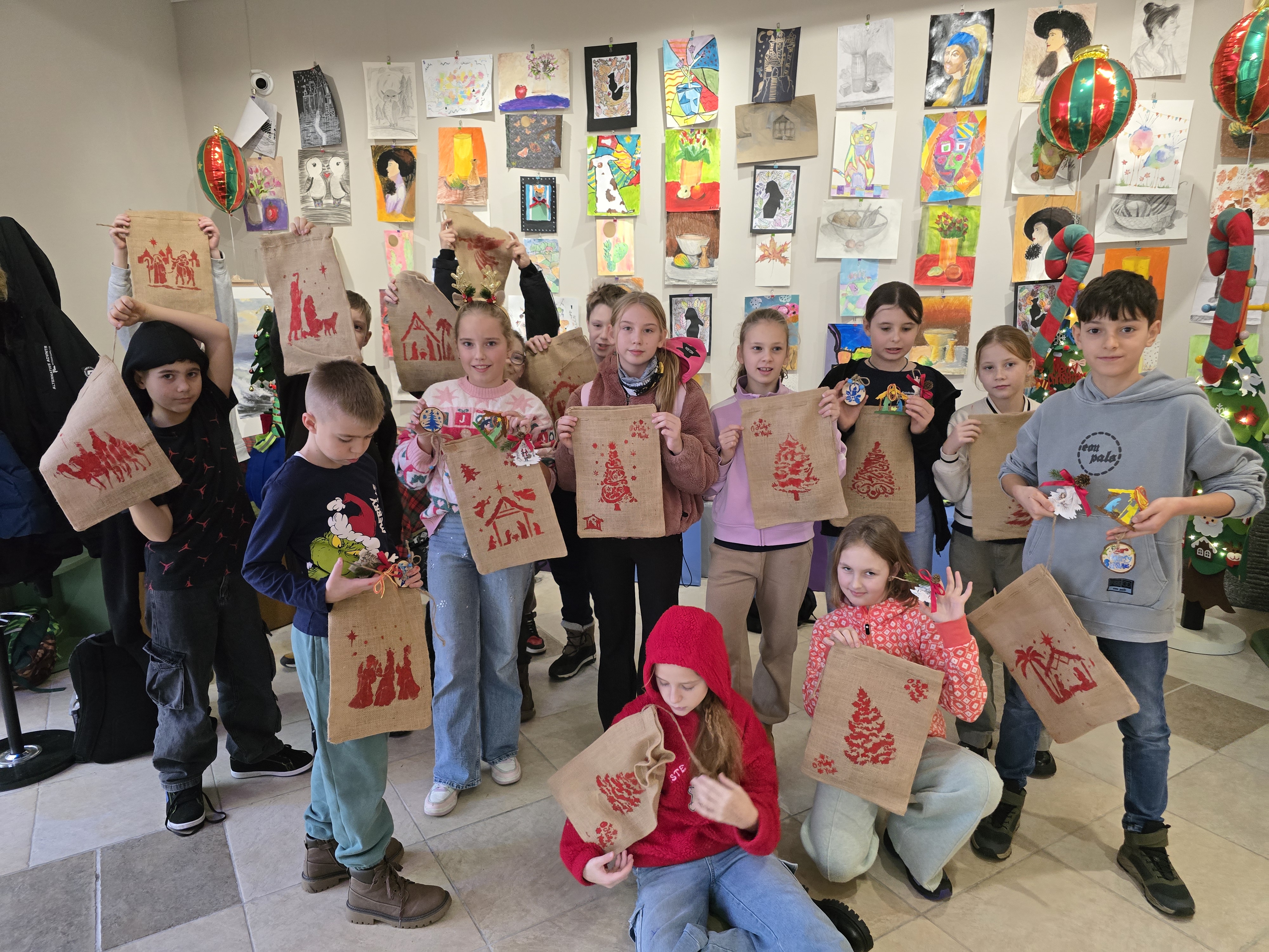 Już od progu pracownia witała uczniów ciepłem i serdecznością. Uśmiechnięte twarze prowadzących i zapachy farb, kleju mieszające się z pachnącą przyprawami korzennymi, cynamonem i pomarańczą herbatką zwiastowały niesamowite doznania. Pierwszym zadaniem, które czekało na młodych artystów, było malowanie na workach. Każdy uczeń otrzymał swój własny, płócienny worek, który miał zamienić się w unikatowe dzieło sztuki. Dzieci z zapałem chwyciły za pędzle i farby, przenosząc na materiał swoje świąteczne wizje. Na workach zaczęły pojawiać się choinki, bałwanki, renifery i gwiazdki, a także imiona, życzenia i całe sceny z wigilijnej nocy. Każdy worek był inny, wyjątkowy, odzwierciedlający indywidualność i kreatywność młodych twórców.