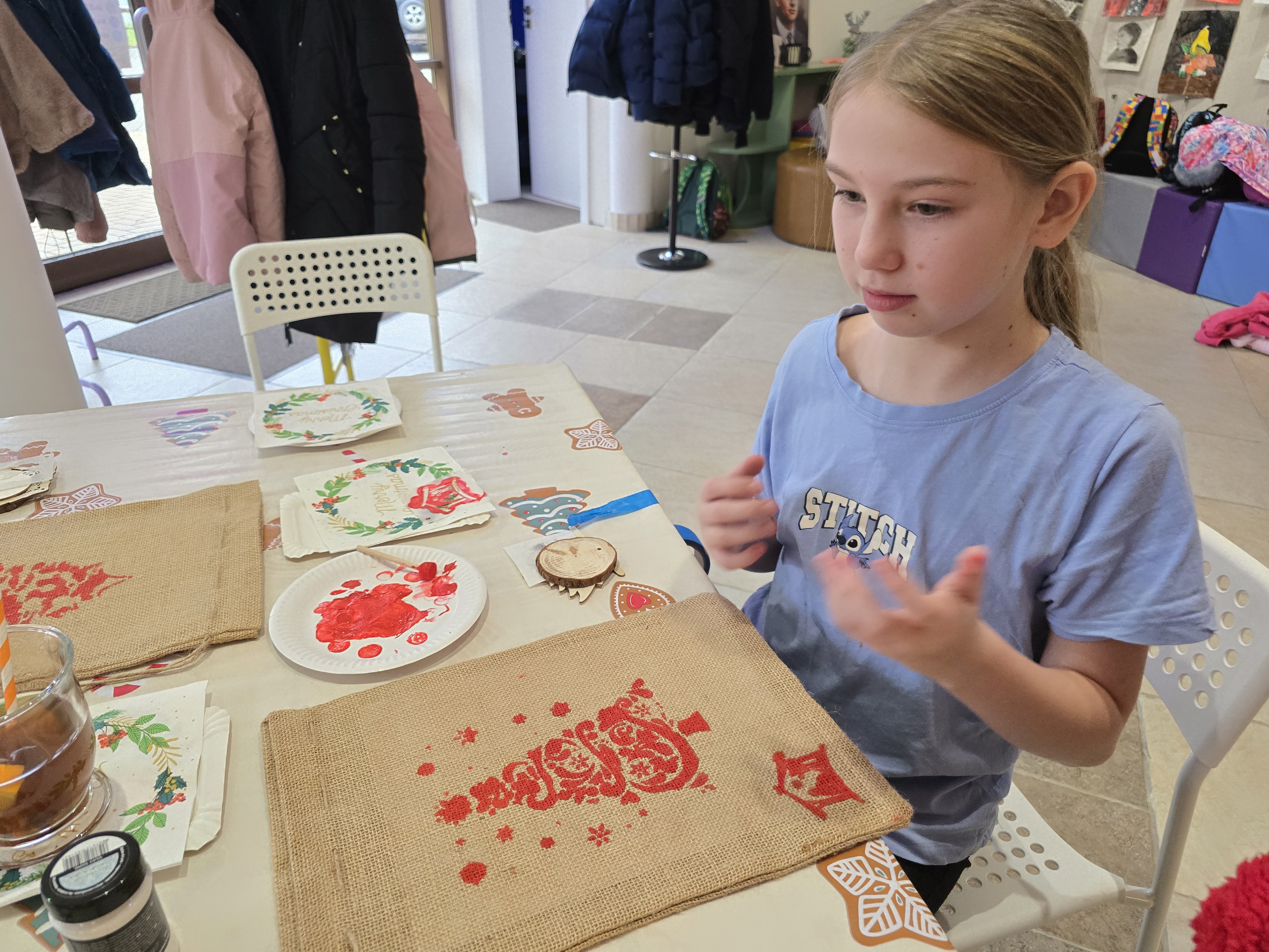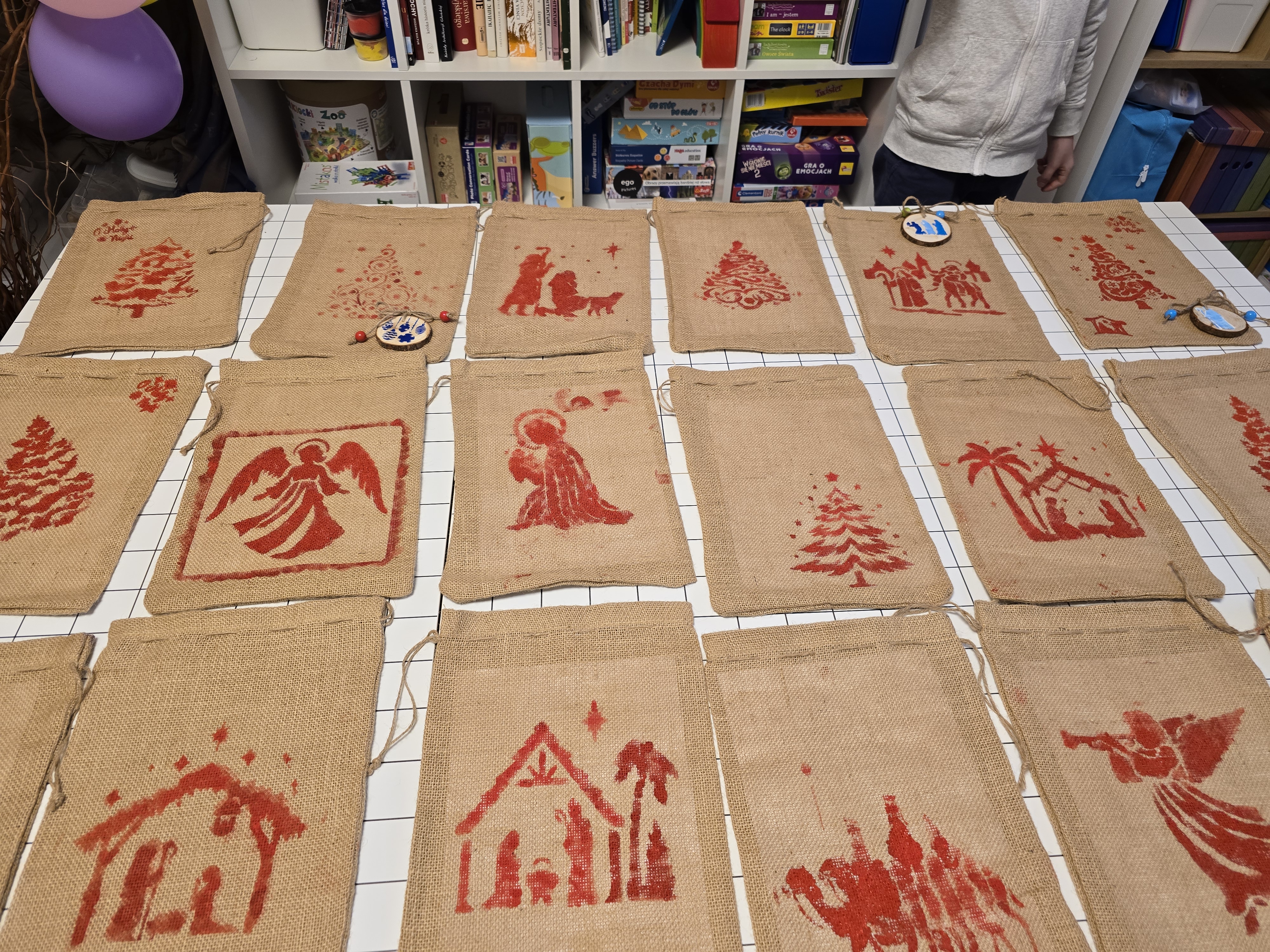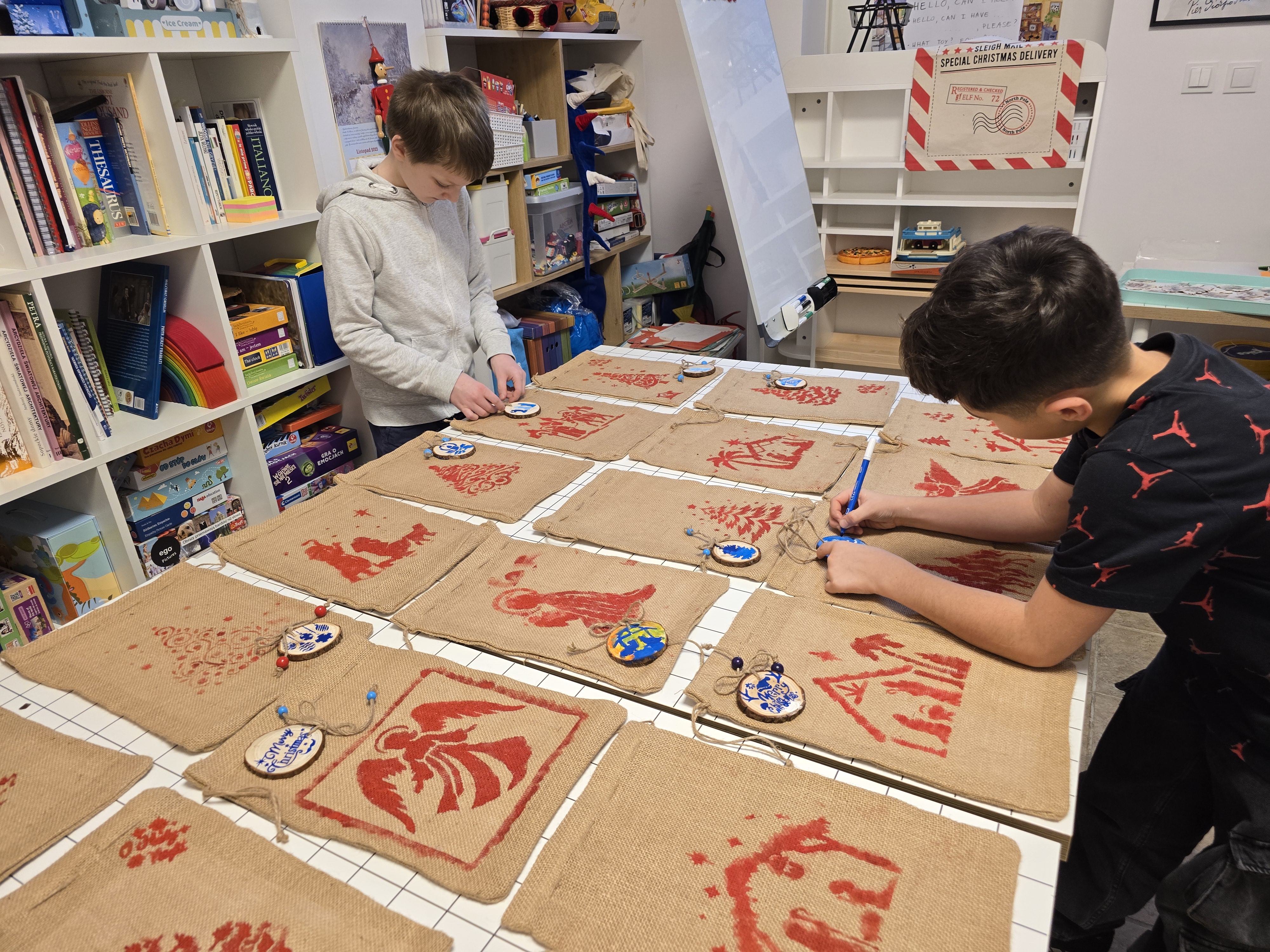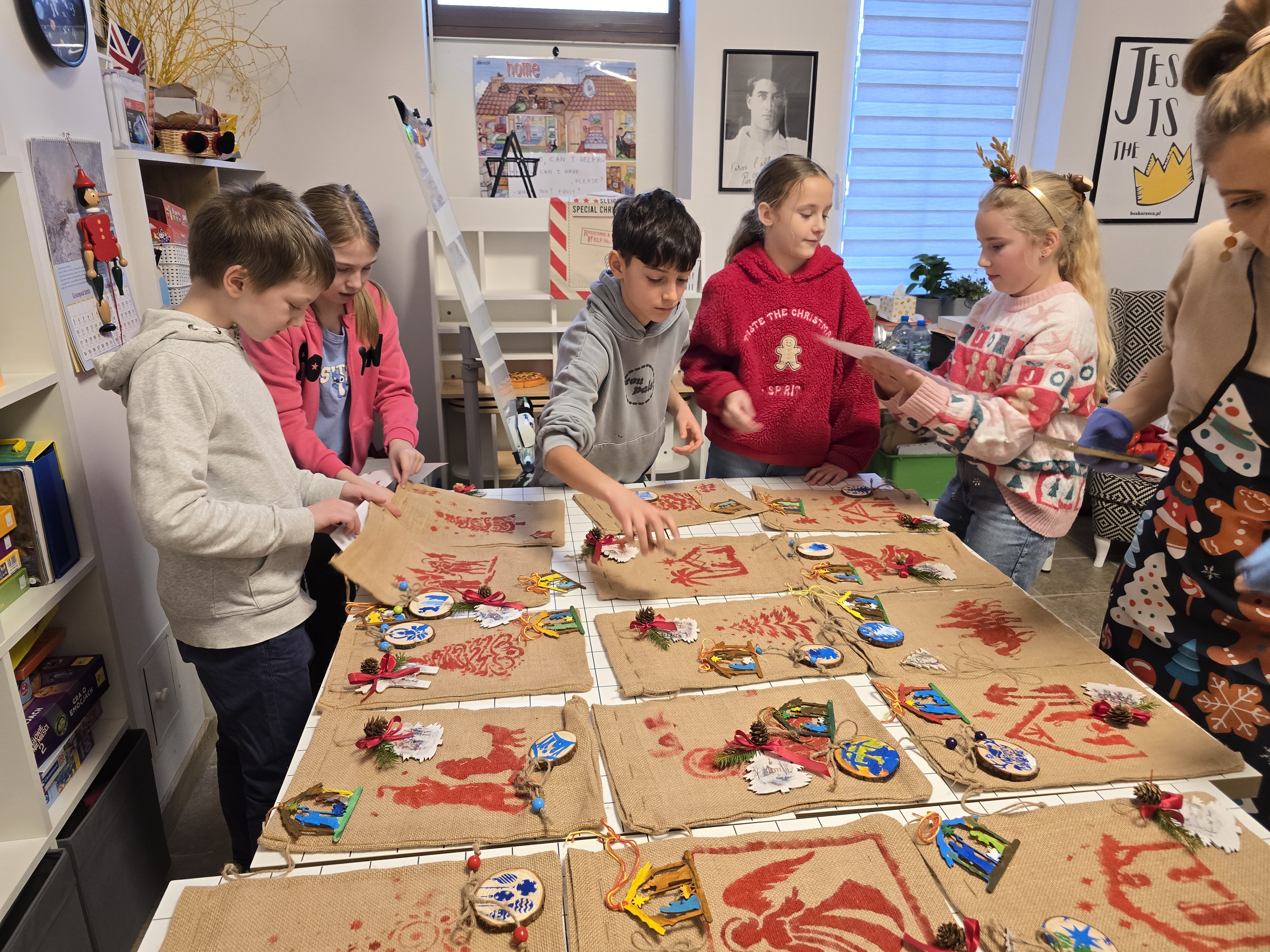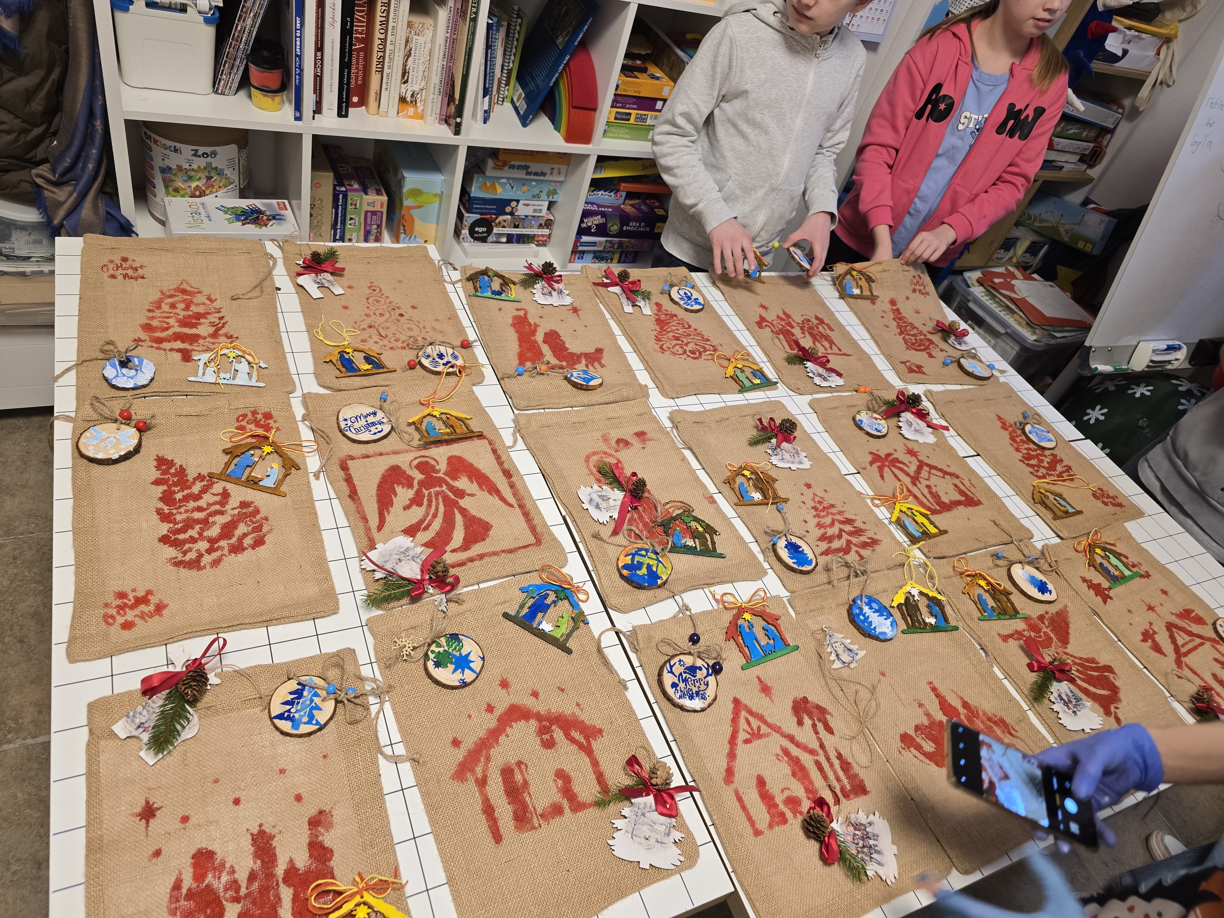 Już od progu pracownia witała uczniów ciepłem i serdecznością. Uśmiechnięte twarze prowadzących i zapachy farb, kleju mieszające się z pachnącą przyprawami korzennymi, cynamonem i pomarańczą herbatką zwiastowały niesamowite doznania. Pierwszym zadaniem, które czekało na młodych artystów, było malowanie na workach. Każdy uczeń otrzymał swój własny, płócienny worek, który miał zamienić się w unikatowe dzieło sztuki. Dzieci z zapałem chwyciły za pędzle i farby, przenosząc na materiał swoje świąteczne wizje. Na workach zaczęły pojawiać się choinki, bałwanki, renifery i gwiazdki, a także imiona, życzenia i całe sceny z wigilijnej nocy. Każdy worek był inny, wyjątkowy, odzwierciedlający indywidualność i kreatywność młodych twórców.