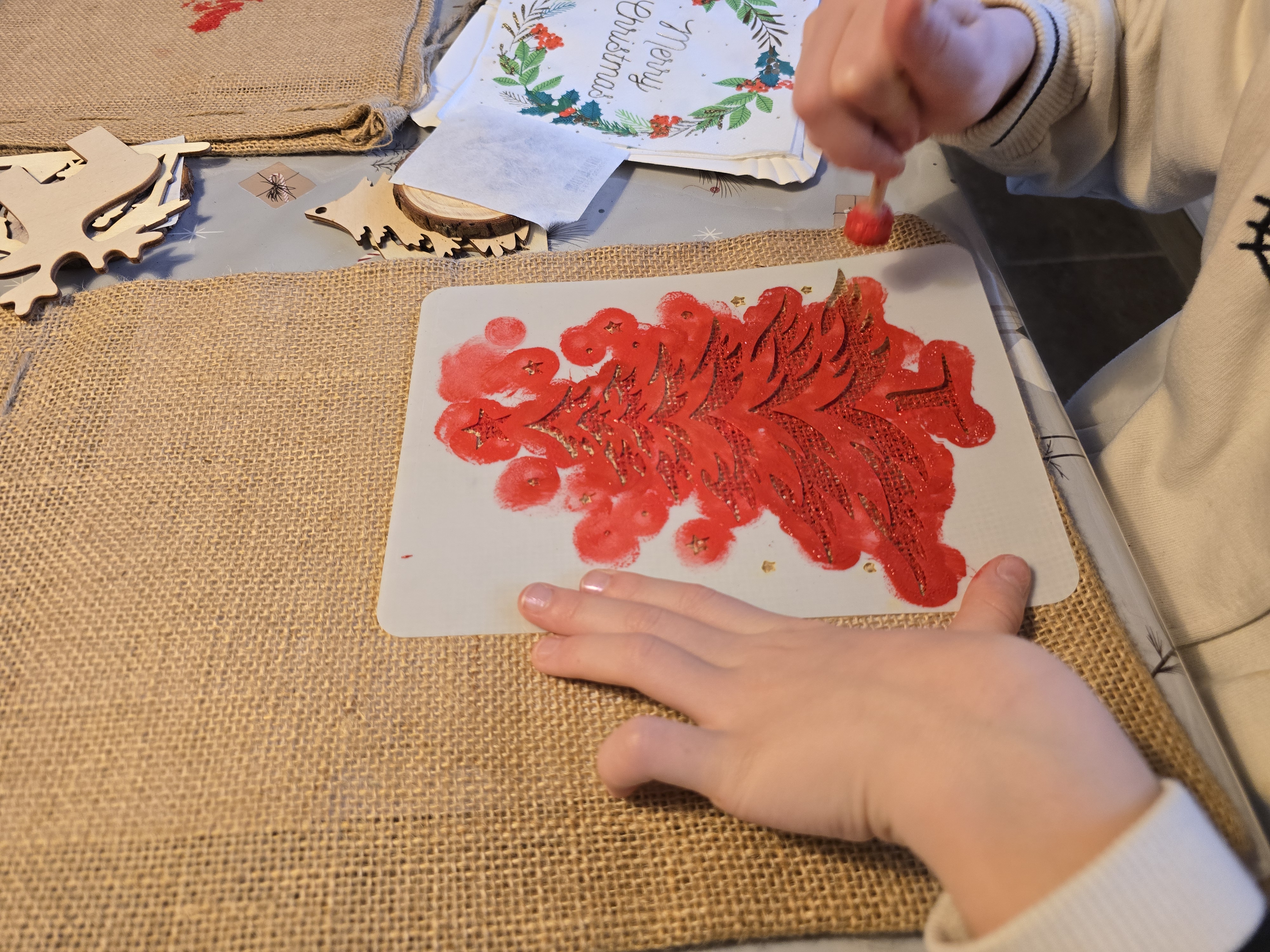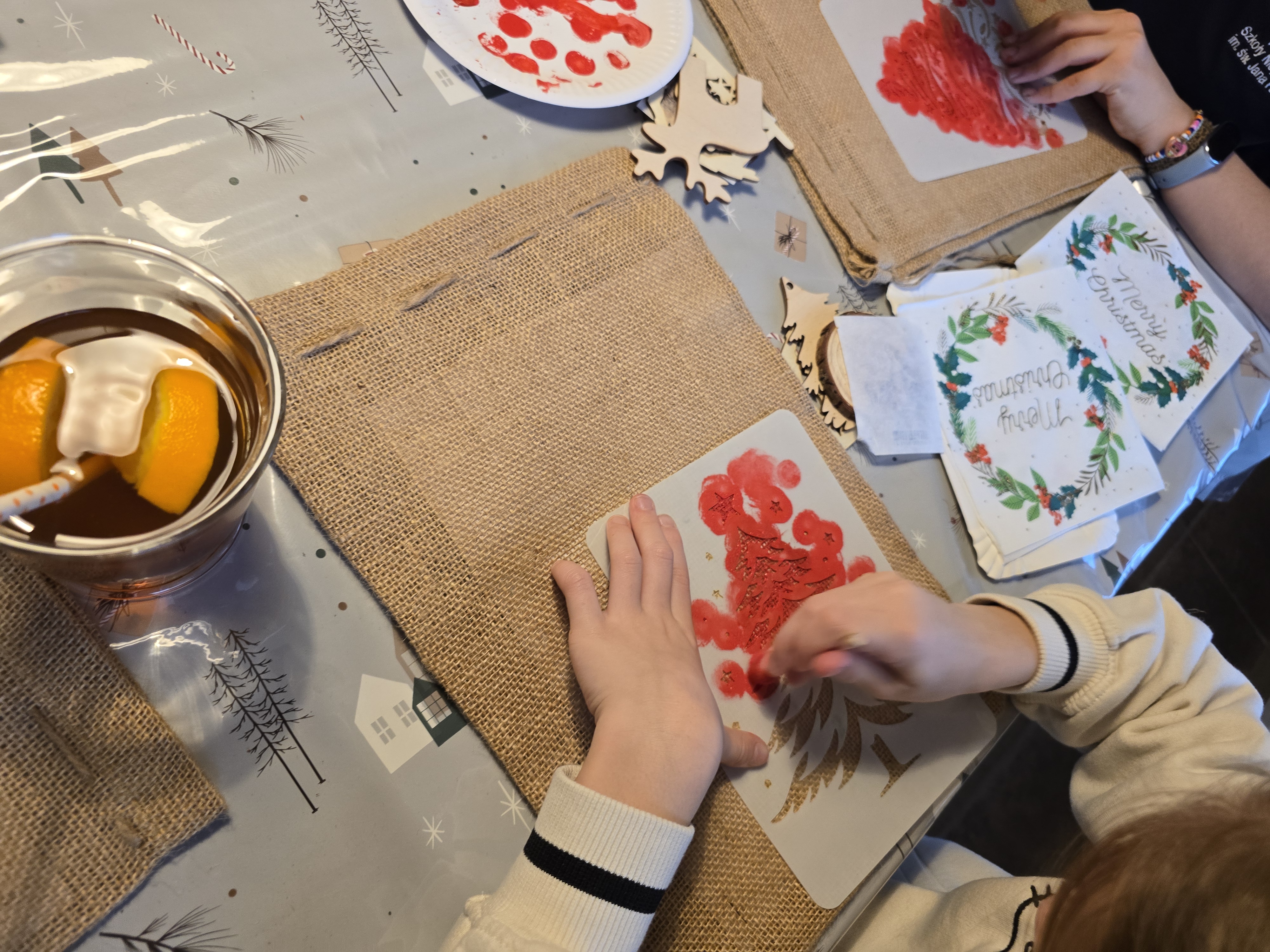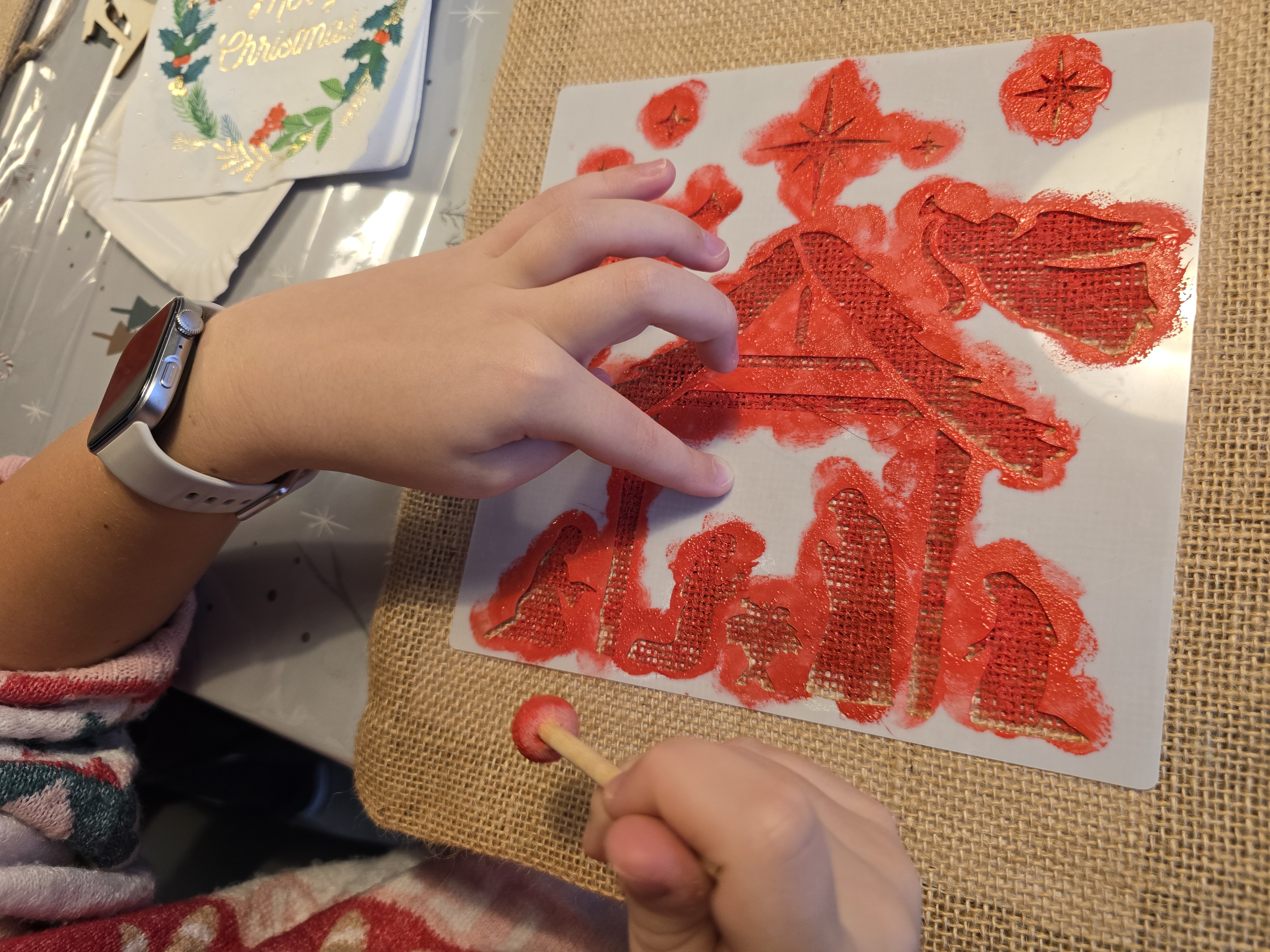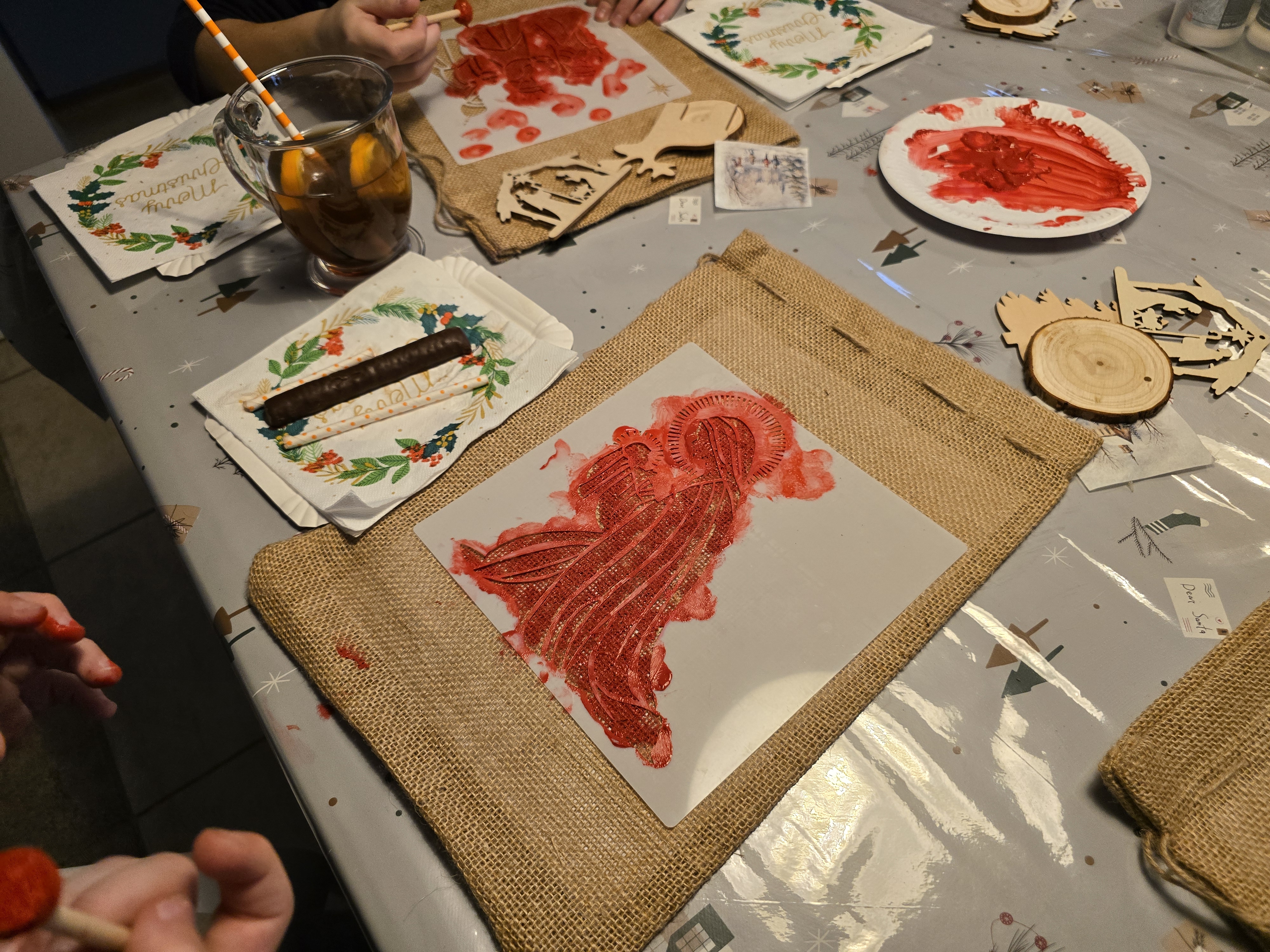 Już od progu pracownia witała uczniów ciepłem i serdecznością. Uśmiechnięte twarze prowadzących i zapachy farb, kleju mieszające się z pachnącą przyprawami korzennymi, cynamonem i pomarańczą herbatką zwiastowały niesamowite doznania. Pierwszym zadaniem, które czekało na młodych artystów, było malowanie na workach. Każdy uczeń otrzymał swój własny, płócienny worek, który miał zamienić się w unikatowe dzieło sztuki. Dzieci z zapałem chwyciły za pędzle i farby, przenosząc na materiał swoje świąteczne wizje. Na workach zaczęły pojawiać się choinki, bałwanki, renifery i gwiazdki, a także imiona, życzenia i całe sceny z wigilijnej nocy. Każdy worek był inny, wyjątkowy, odzwierciedlający indywidualność i kreatywność młodych twórców.
