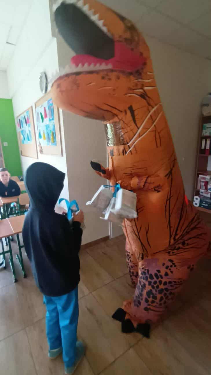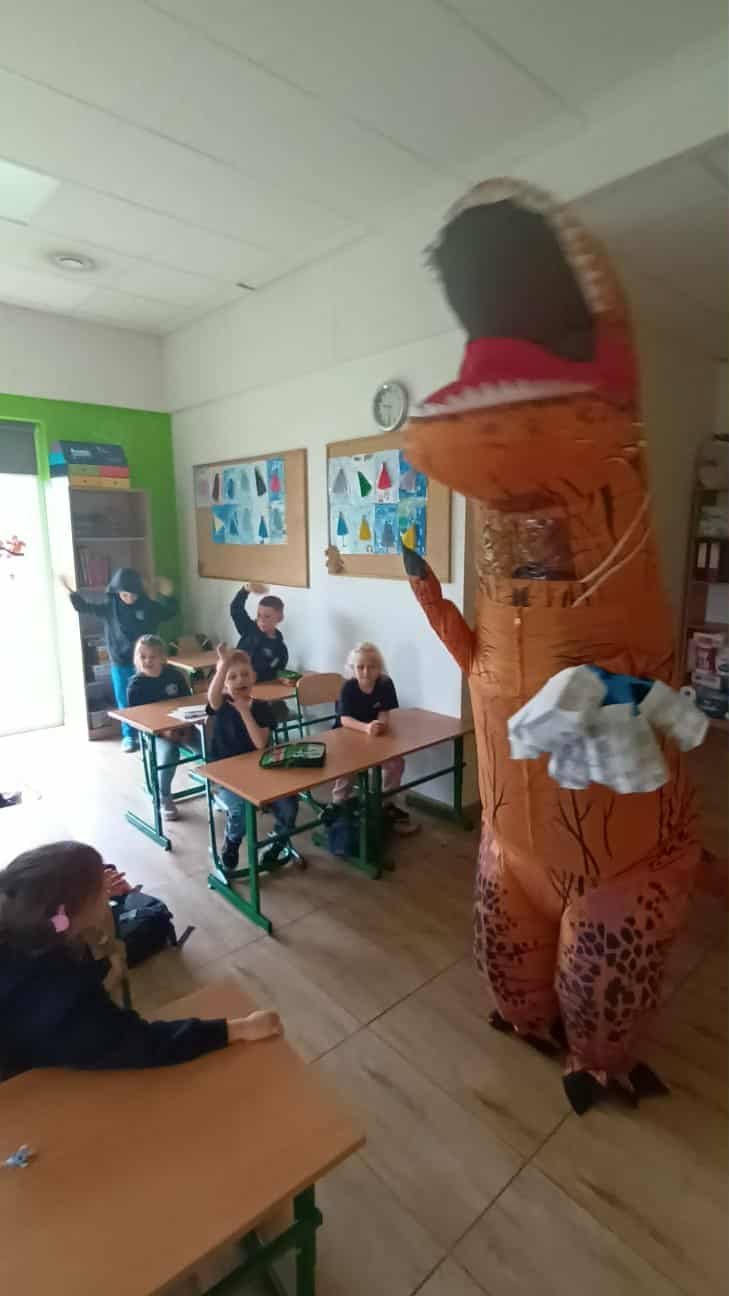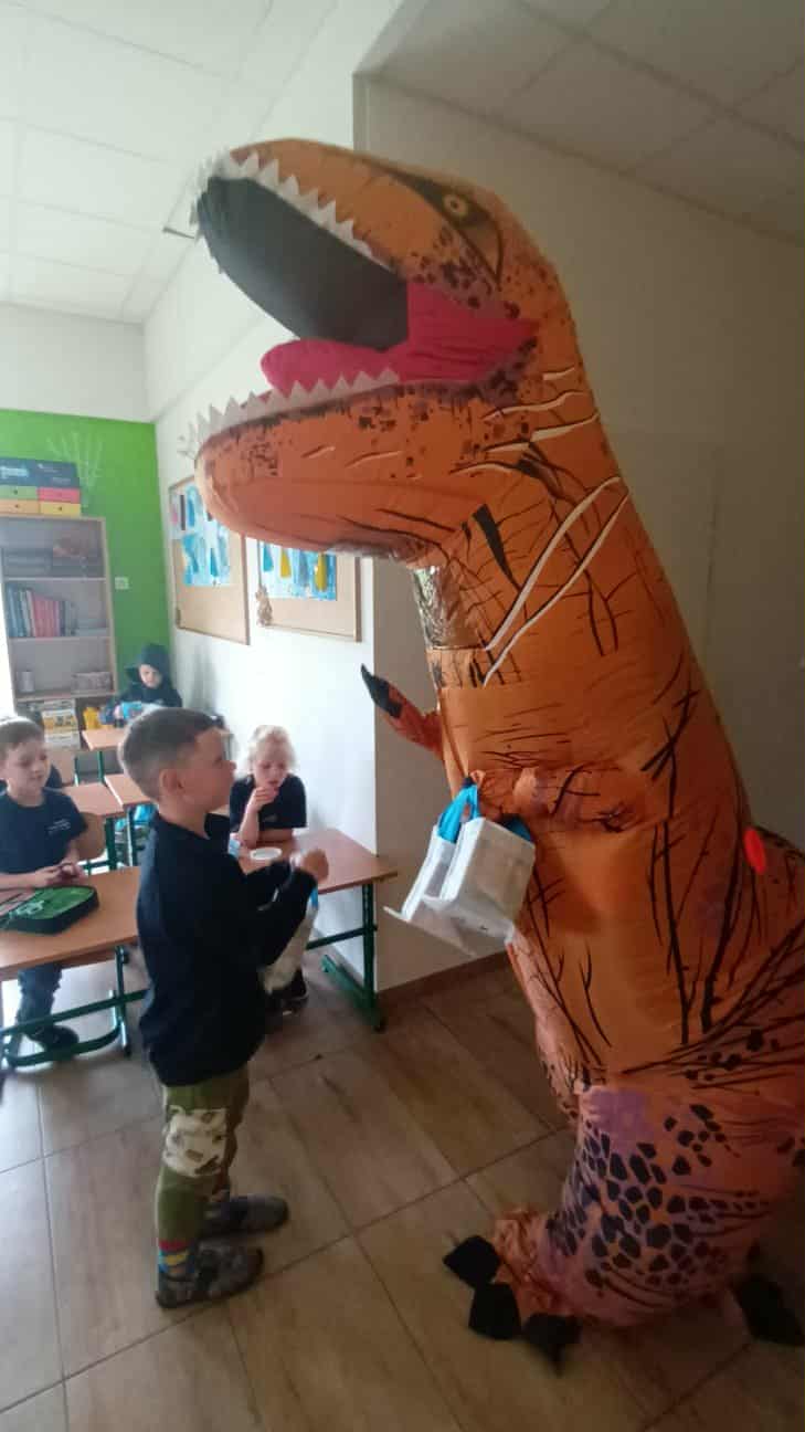 Dziś sala 1b zamieniła się w prehistoryczny raj, a to za sprawą wyjątkowego gościa, który odwiedził klasę 1b z okazji Dnia Chłopaka!