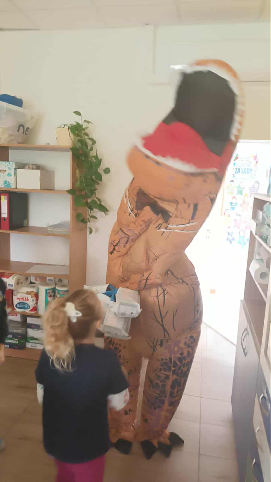 Zamiast tradycyjnych życzeń i prezentów, na chłopców z 1b czekała prawdziwa niespodzianka - wizyta… Dinozaura! Ogromny, sympatyczny gość w imieniu wszystkich dziewcząt wręczył chłopcom prezenty, wywołując tym samym mnóstwo radości i śmiechu.