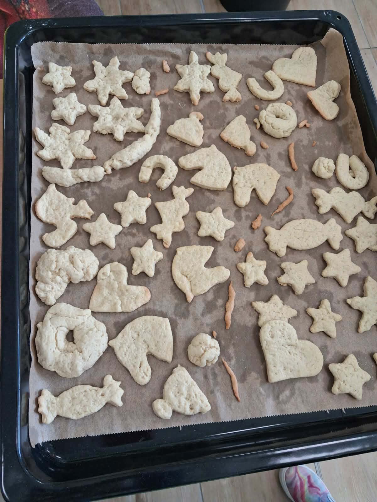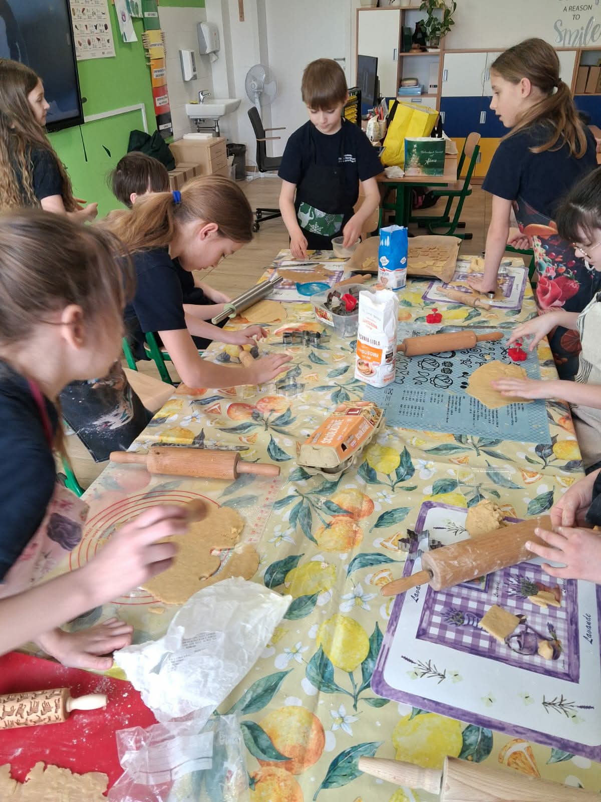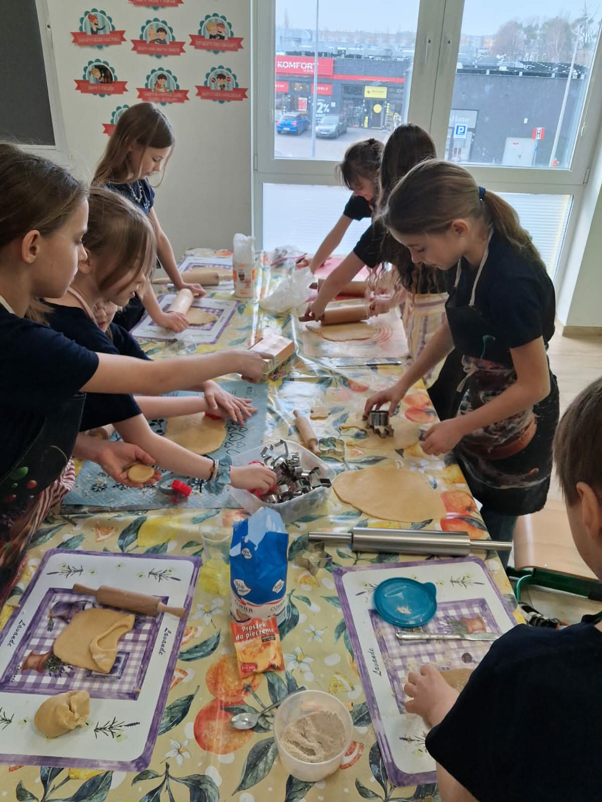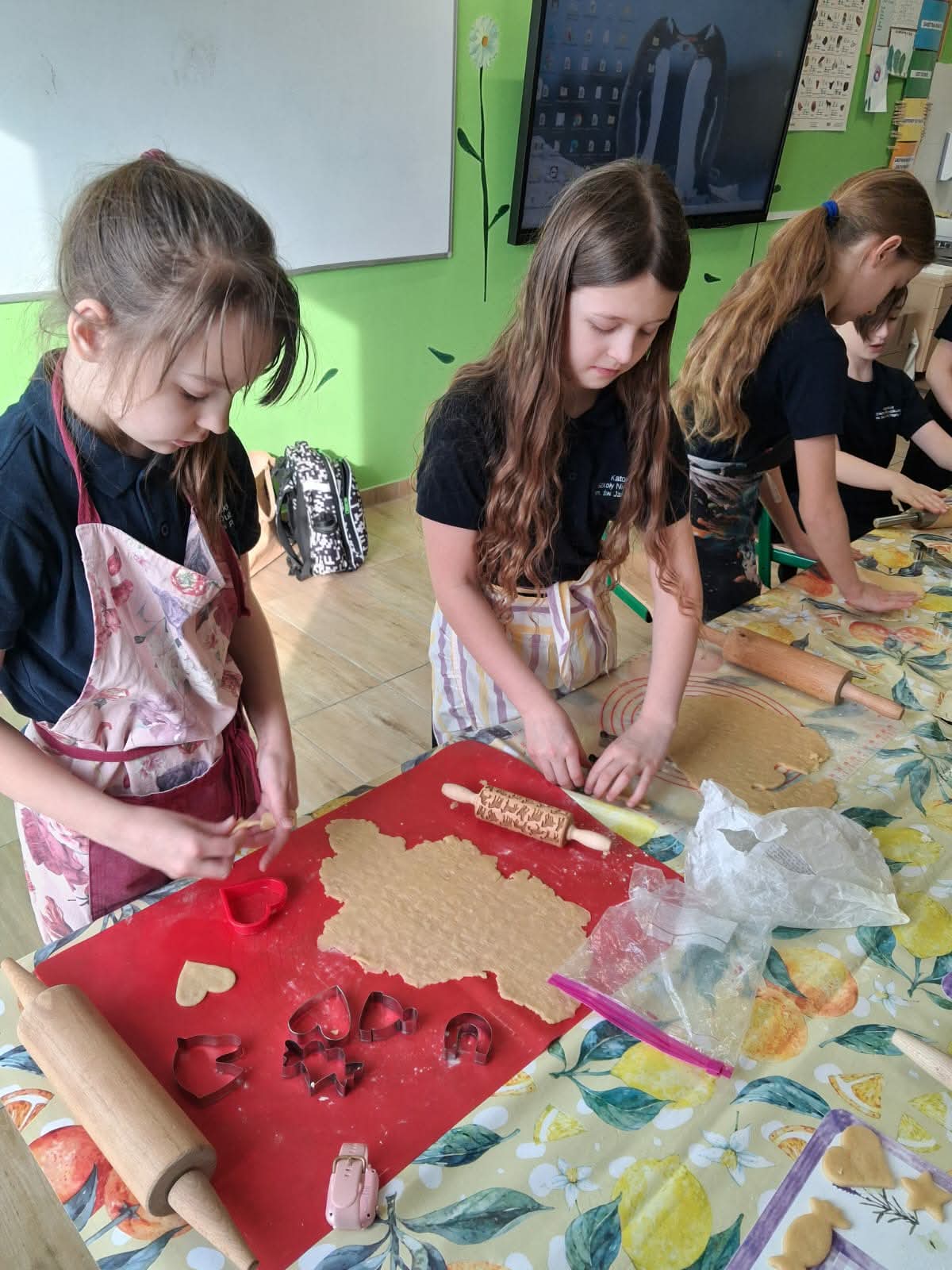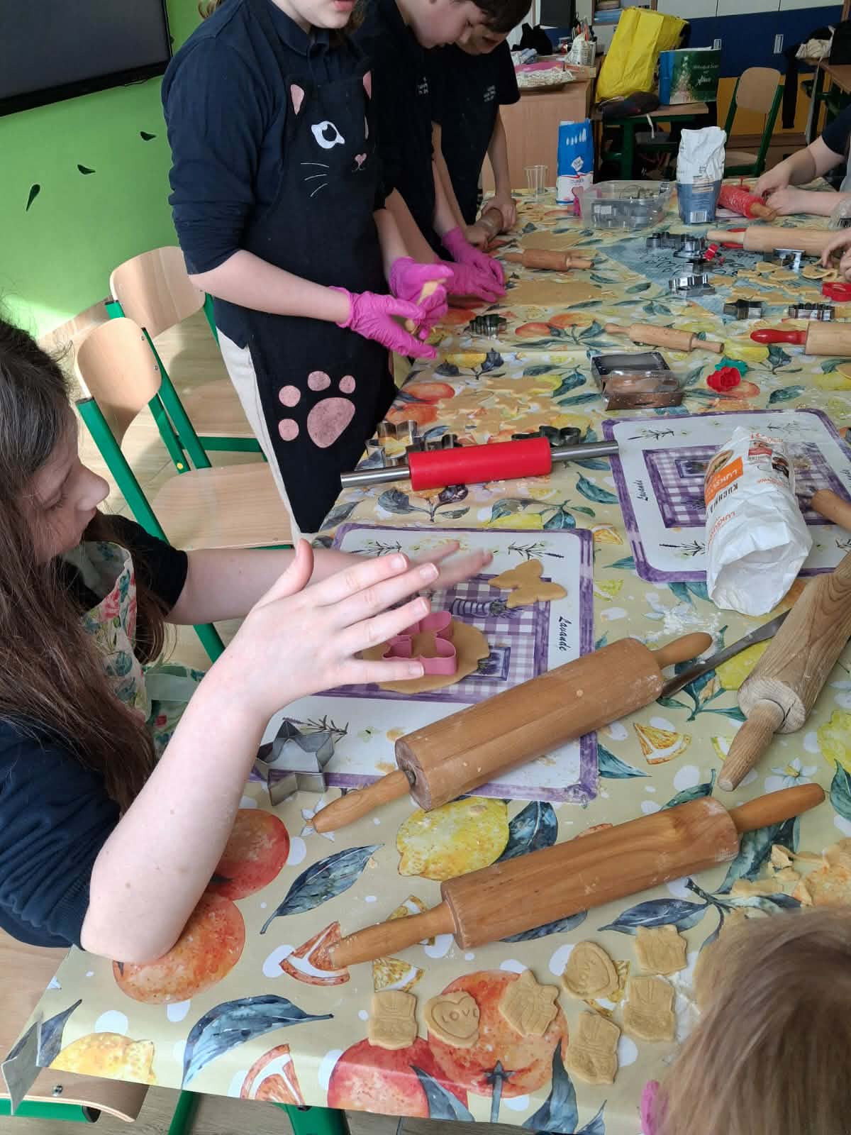 Trzecioklasiści uczyli się, jak ważna w kuchni jest dokładność i współpraca. Każdy miał swoje zadanie: jedni odważali mąkę i cukier, inni mieszali składniki, a jeszcze inni z wielką precyzją wykrawali foremkami najróżniejsze kształty. Na blaszkach pojawiły się serduszka, gwiazdki, kwiatki i uśmiechnięte buźki.