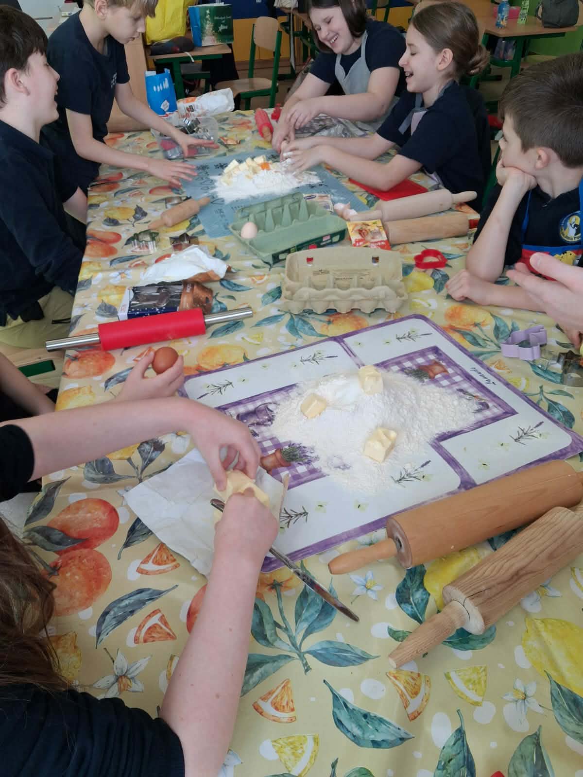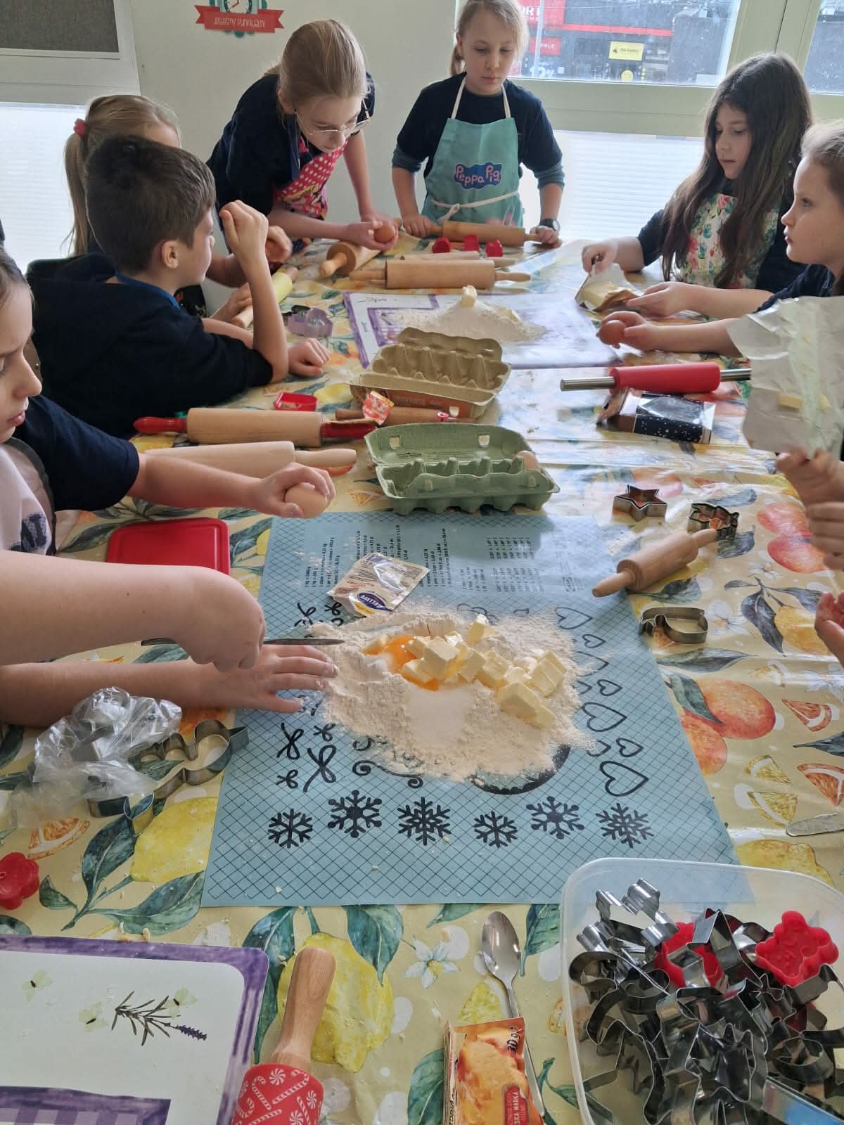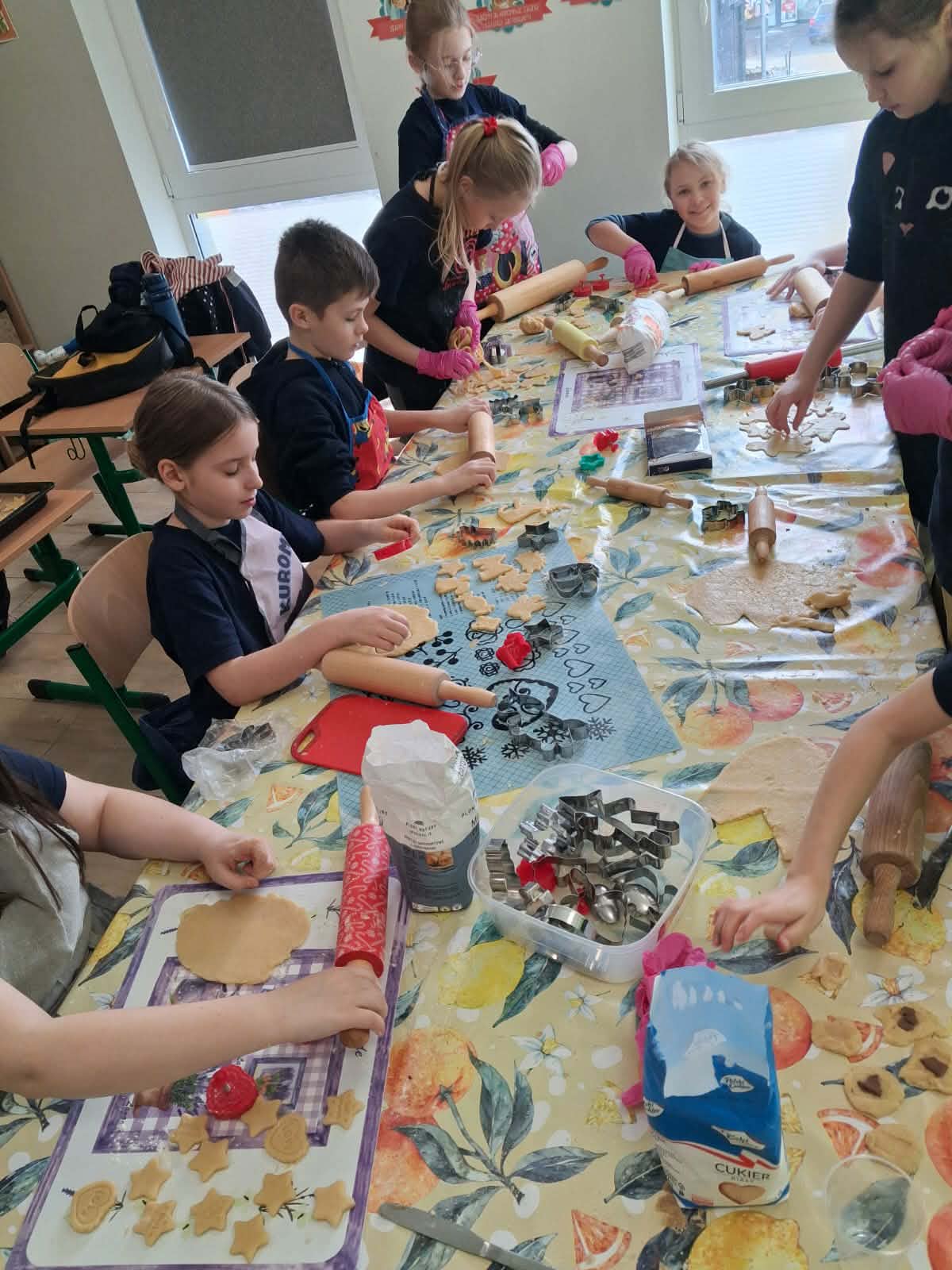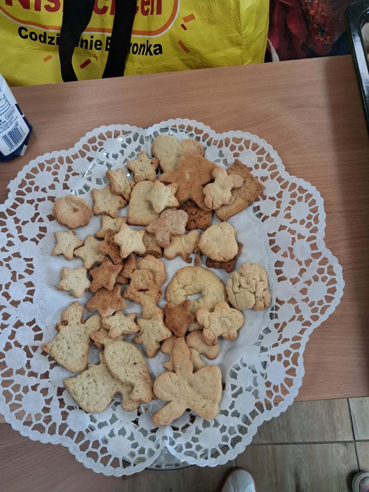 Najbardziej wyczekiwanym momentem było oczywiście pieczenie. Gdy ciasteczka rumieniły się w piekarniku, całą salę wypełnił apetyczny aromat masła i wanilii. Trudno było powstrzymać niecierpliwość! Kiedy wreszcie przyszedł czas degustacji, na twarzach uczniów pojawiły się szerokie uśmiechy. Własnoręcznie przygotowane wypieki smakowały wyjątkowo – może dlatego, że były doprawione szczyptą dumy i sporą porcją wspólnej pracy.