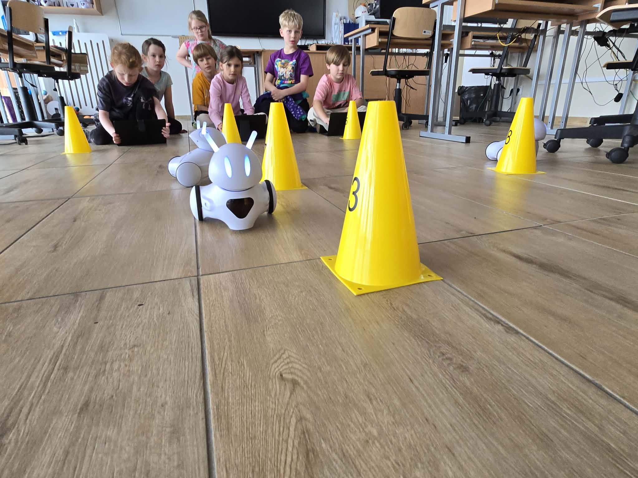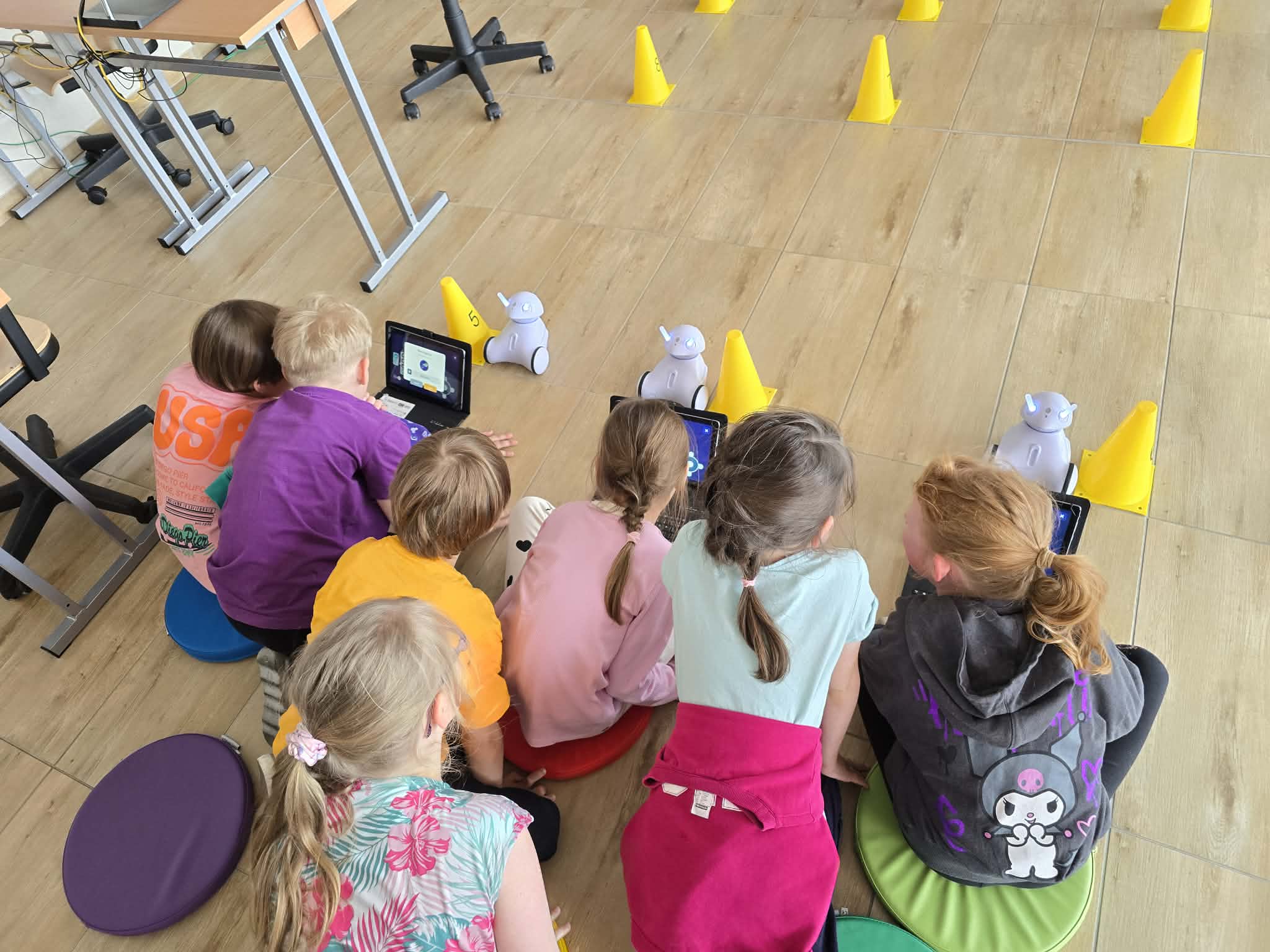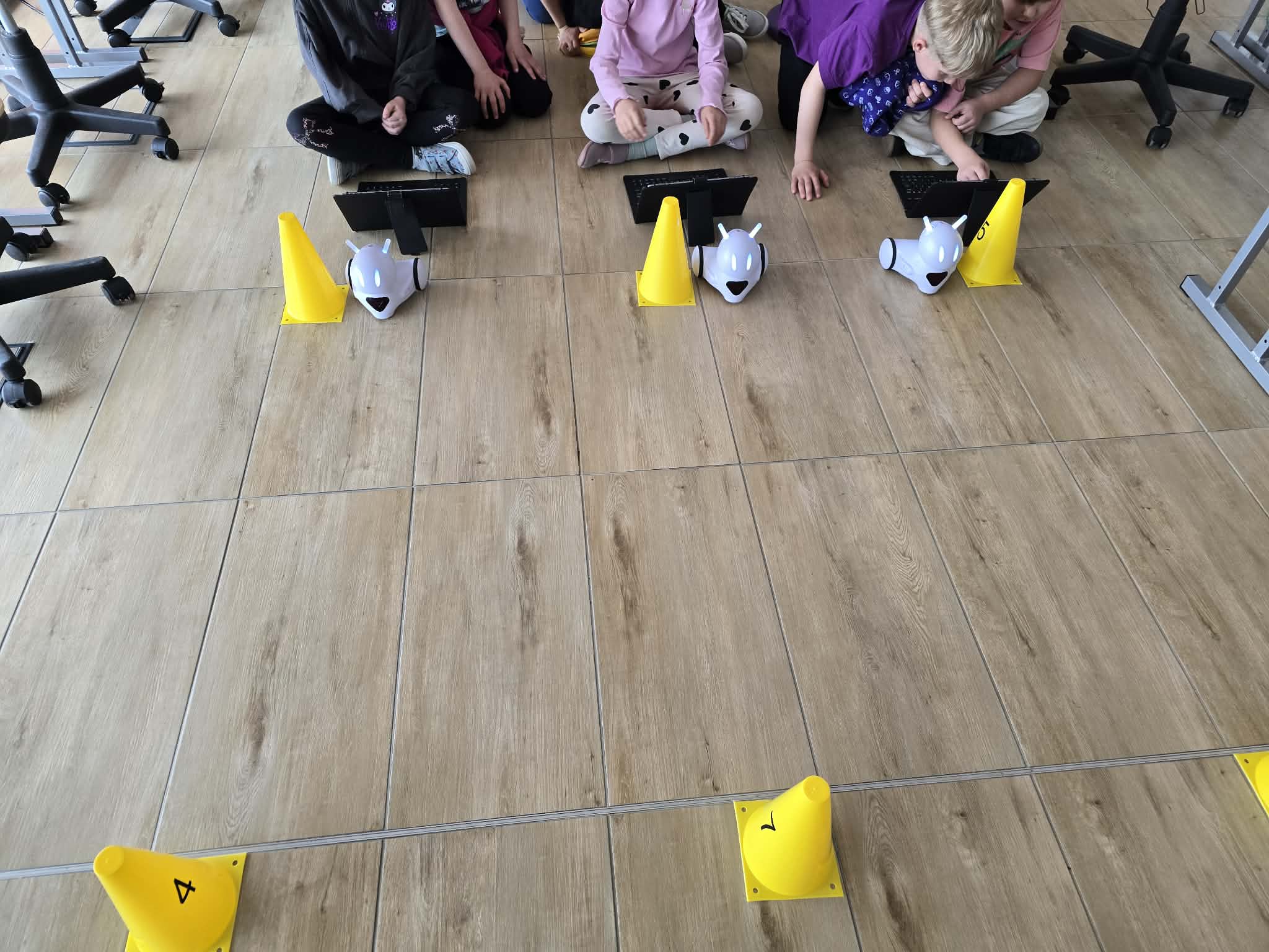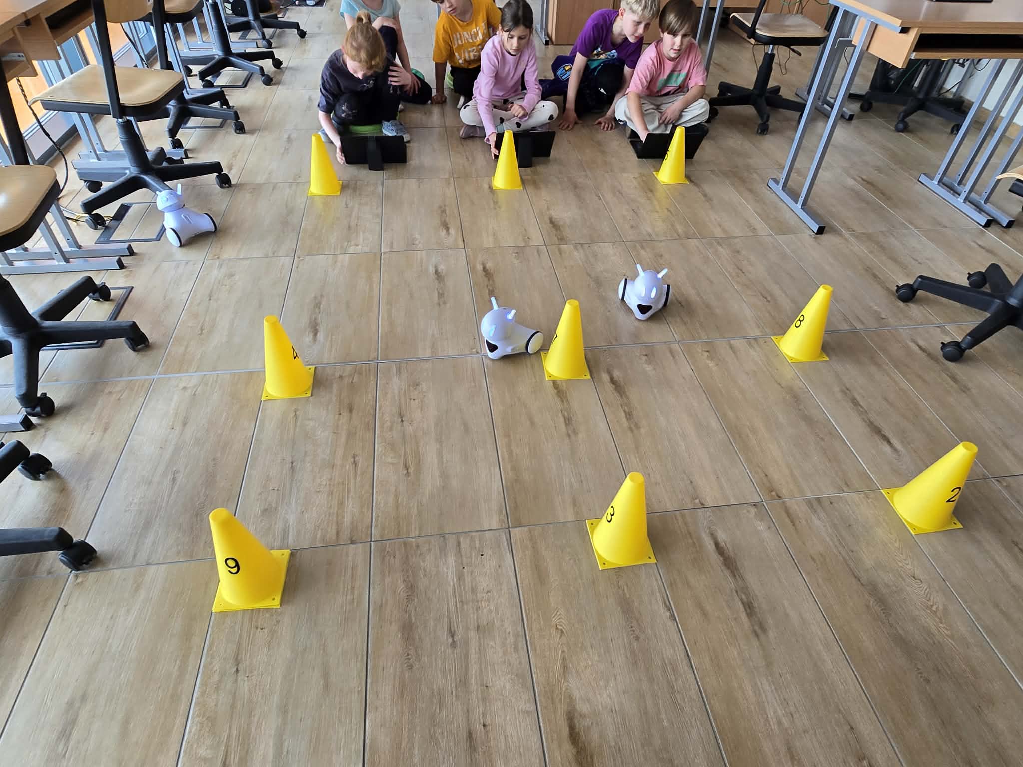 Jednym z najciekawszych elementów zajęć był slalom między pachołkami. Uczniowie musieli tak zaprogramować swoje roboty, aby precyzyjnie omijały przeszkody i nie wypadały z wyznaczonej trasy. Wymagało to skupienia, logicznego myślenia oraz cierpliwości.
