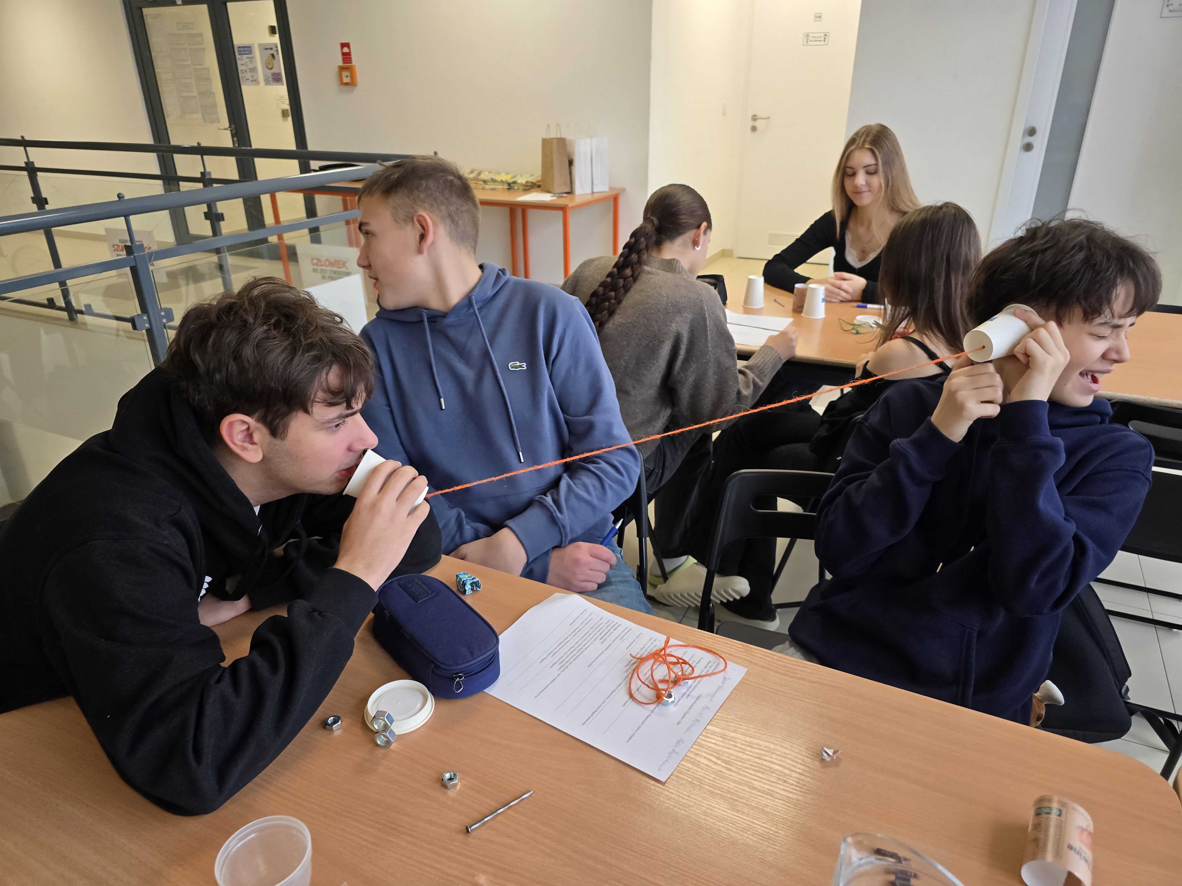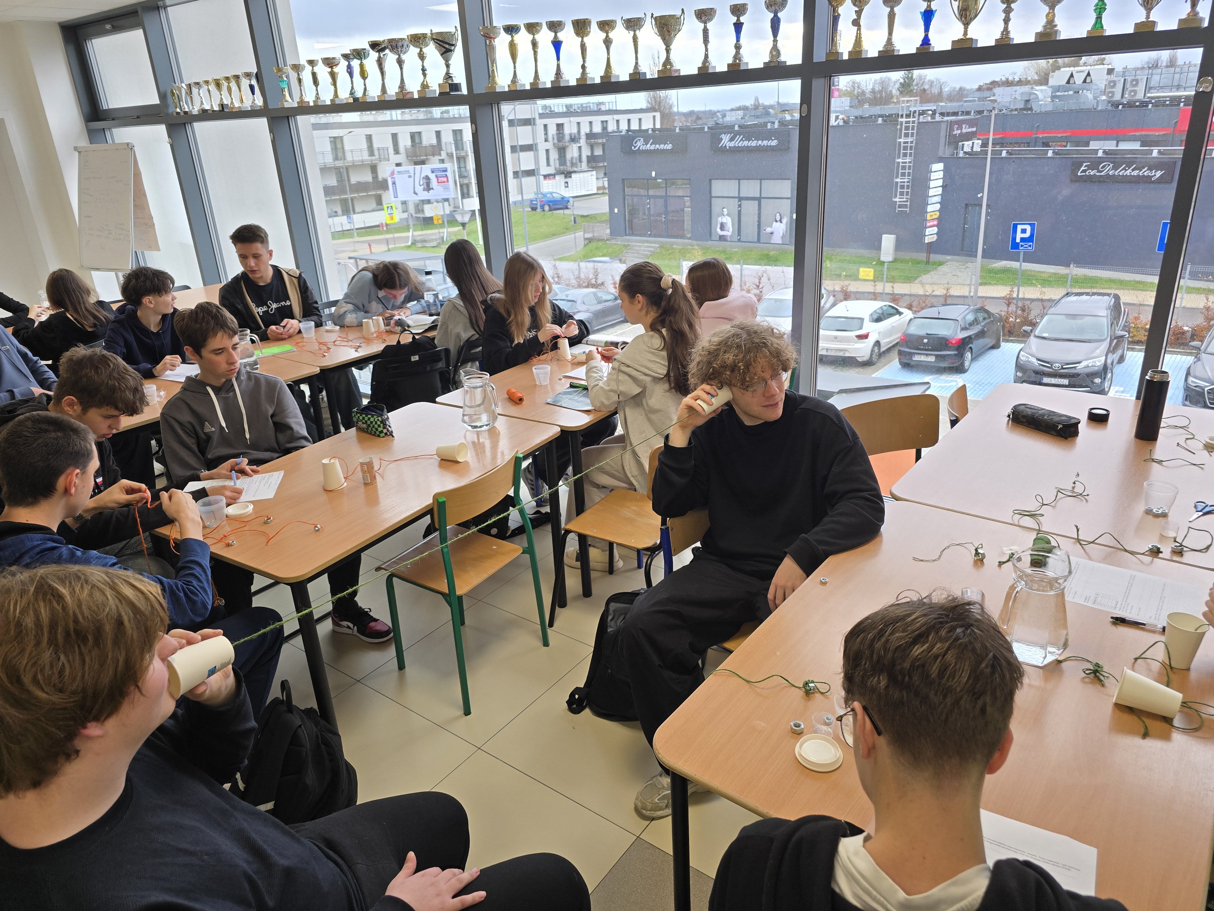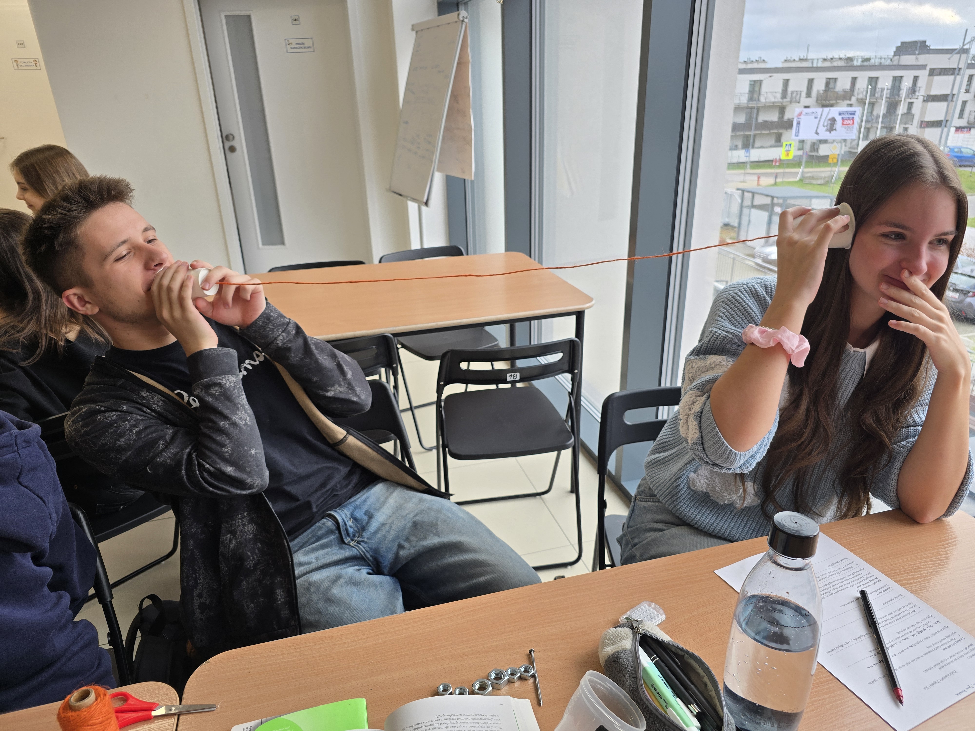 Trzecie doświadczenie przeniosło uczniów w świat dźwięku i jego propagacji. Uczniowie przywiązywali sznurek do dna dwóch kubków. Napinając sznurek, tworzyli prosty "telefon". Jedna osoba mówiła do jednego kubka, a druga, przykładając ucho do drugiego kubka, odbierała dźwięk. To proste, ale pouczające doświadczenie ilustrowało, jak dźwięk może być przenoszony przez ośrodek materialny, w tym przypadku przez naprężony sznurek. Uczniowie mogli usłyszeć, jak głos podróżuje przez sznurek, a także zauważyć, że jakość dźwięku może zależeć od napięcia sznurka.