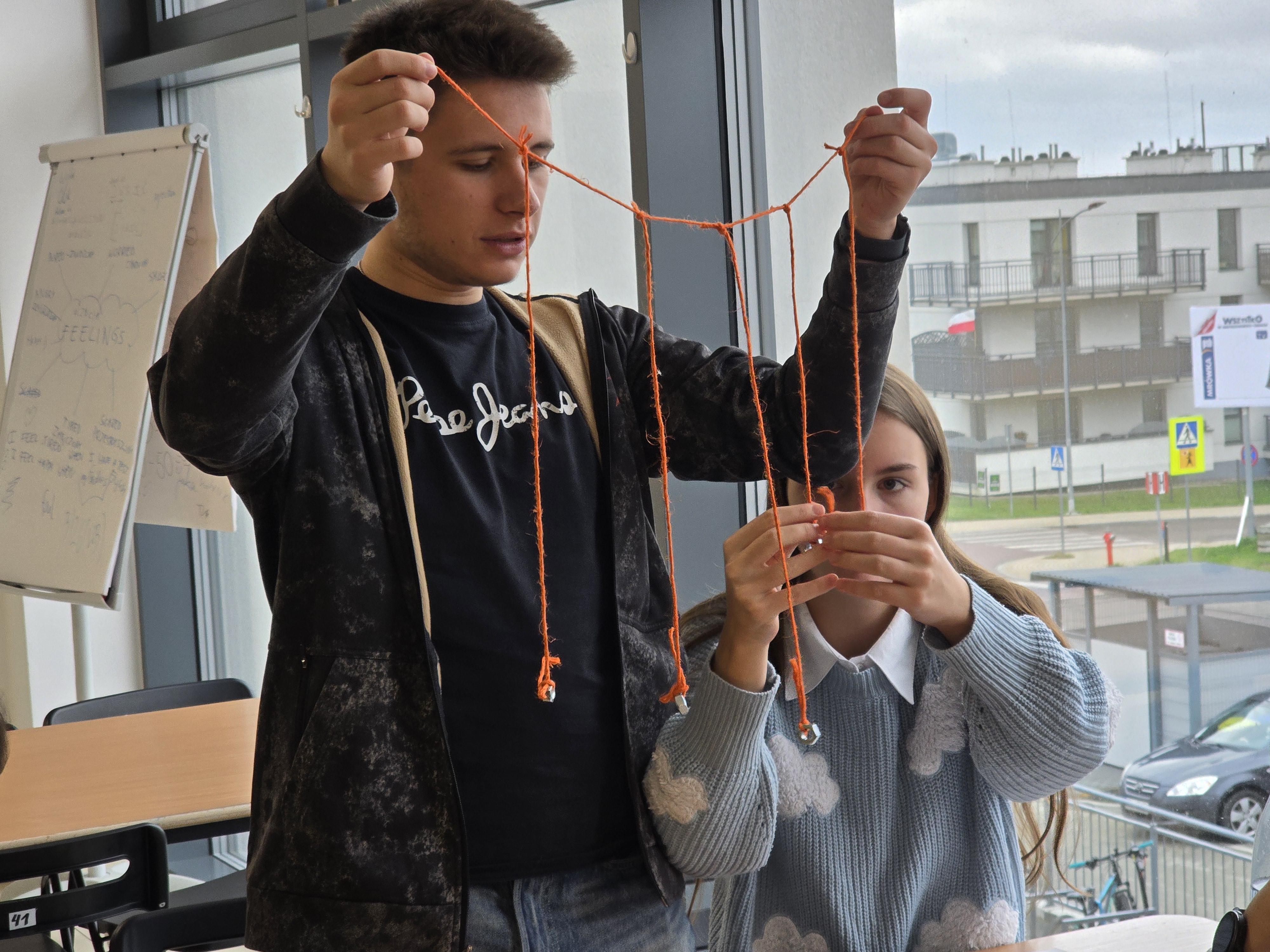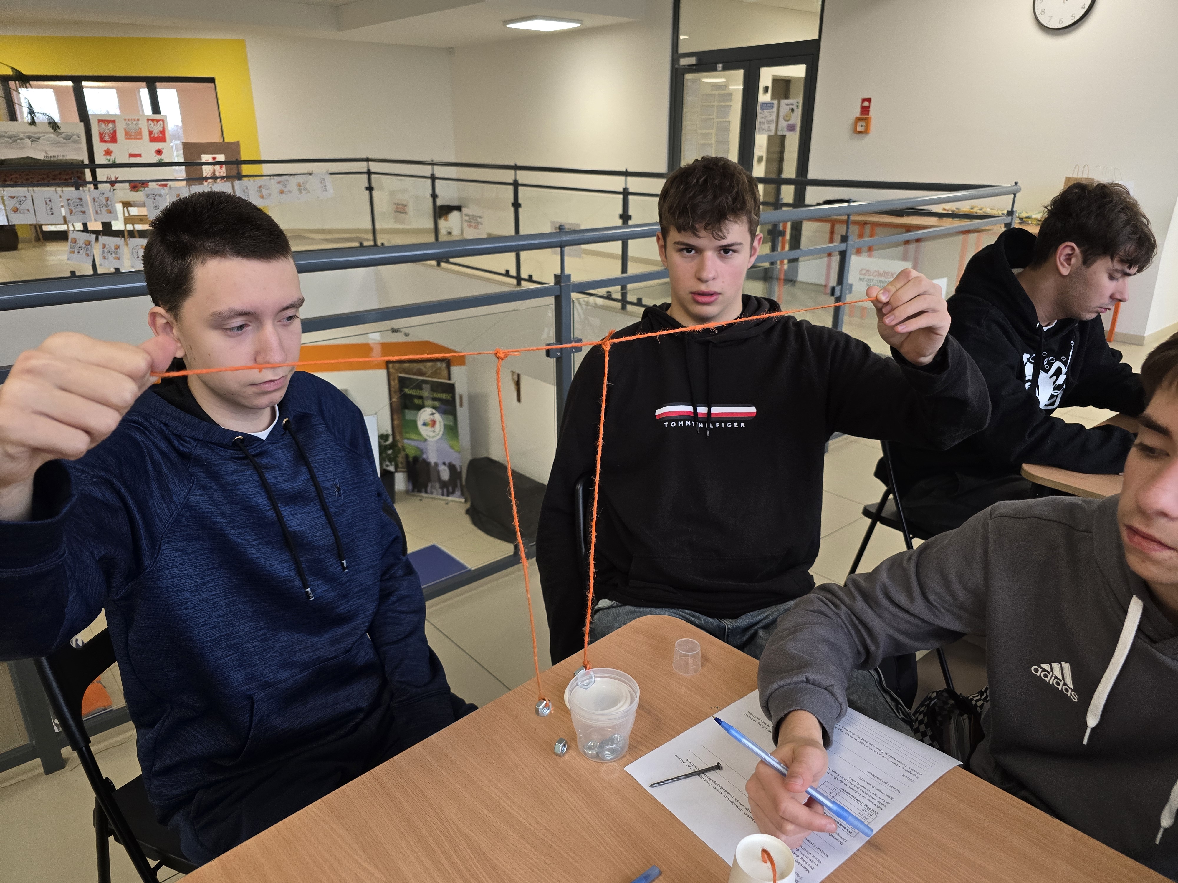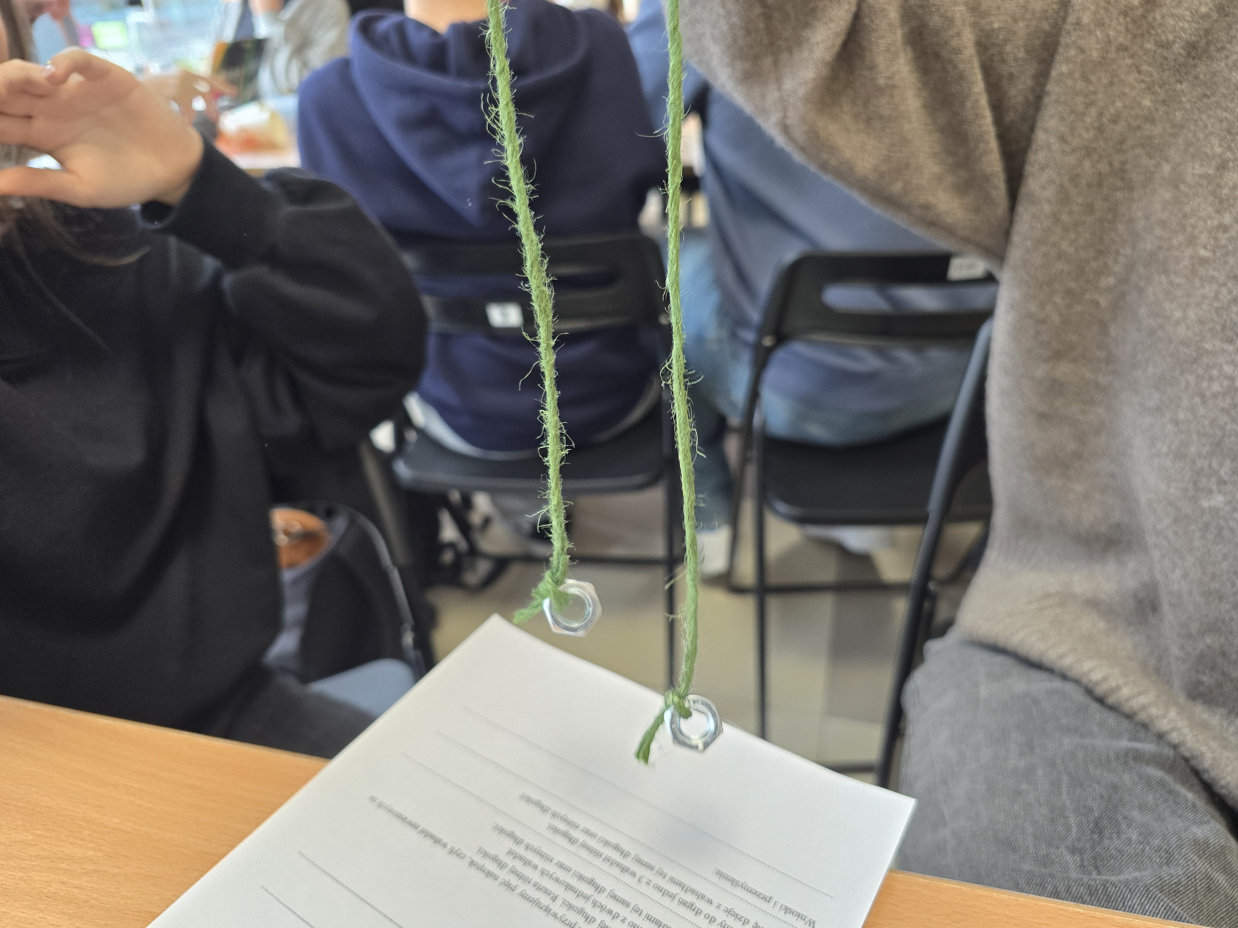 Kolejne doświadczenie było jeszcze bardziej intrygujące. Uczniowie rozciągali kawałek sznurka i przywiązywali do niego pięć nakrętek, tworząc w ten sposób pięć wahadeł zawieszonych na nitkach. Kluczowym elementem było umieszczenie dwóch wahadeł o tej samej długości. Reszta wahadeł miała różne długości. To doświadczenie pozwoliło na demonstrację zjawiska rezonansu. Kiedy jedno z wahadeł o tej samej długości co inne zaczynało się kołysać, przenosiło energię na drugie wahadło o identycznej długości, a pozostałe wahadła drgały w mniejszym stopniu lub wcale. Uczniowie mogli zaobserwować, jak rezonans pozwala na wzmacnianie drgań i transfer energii.