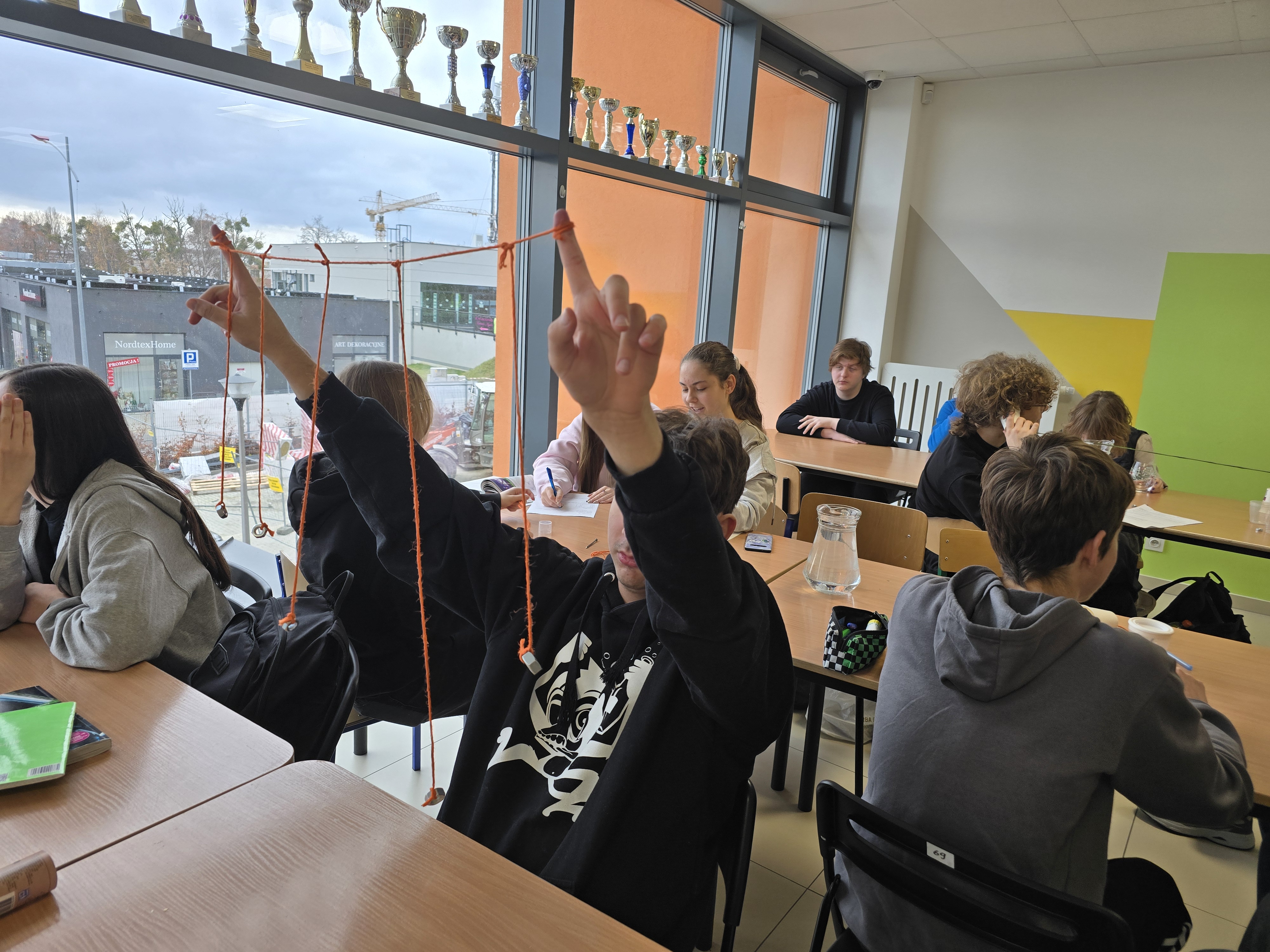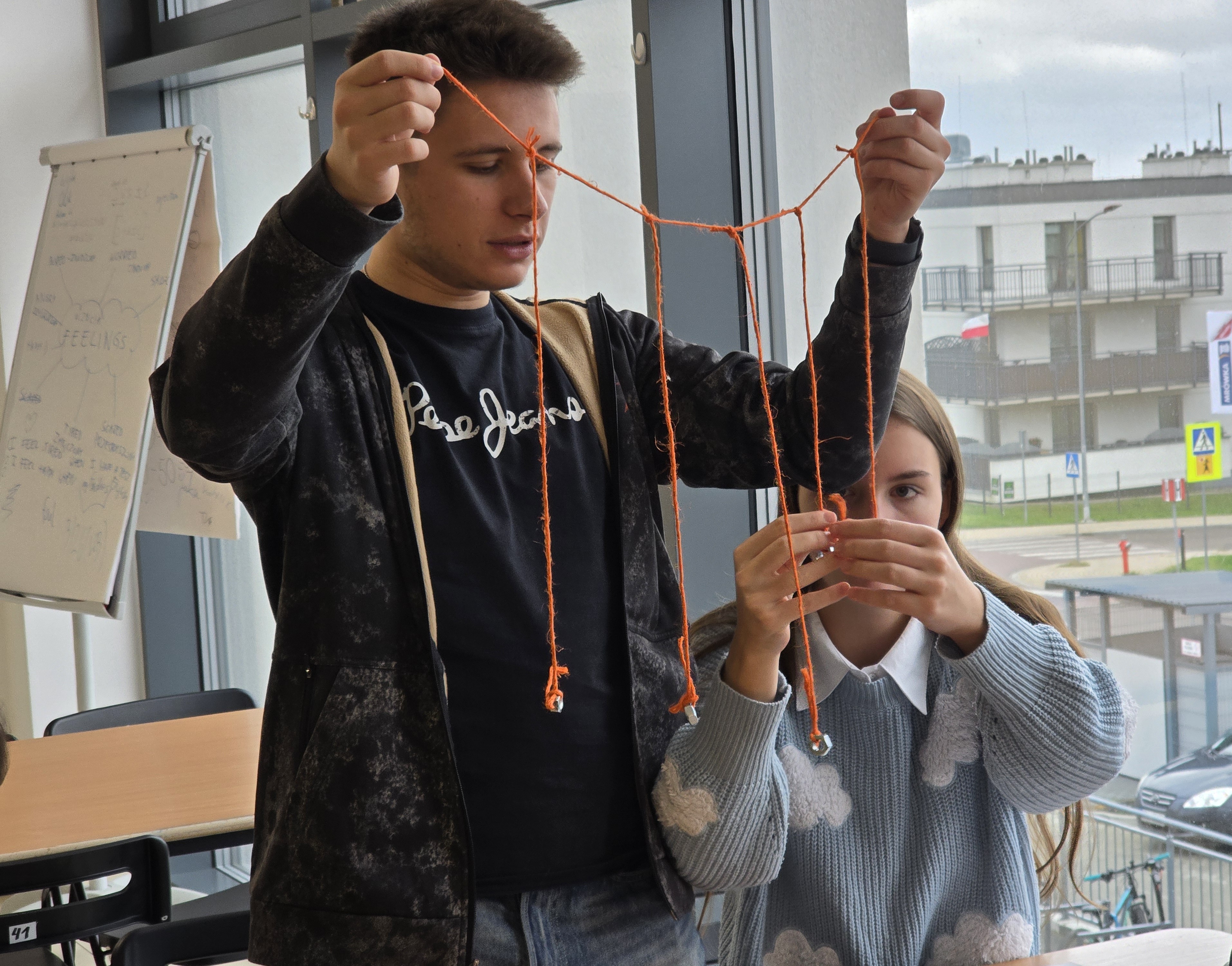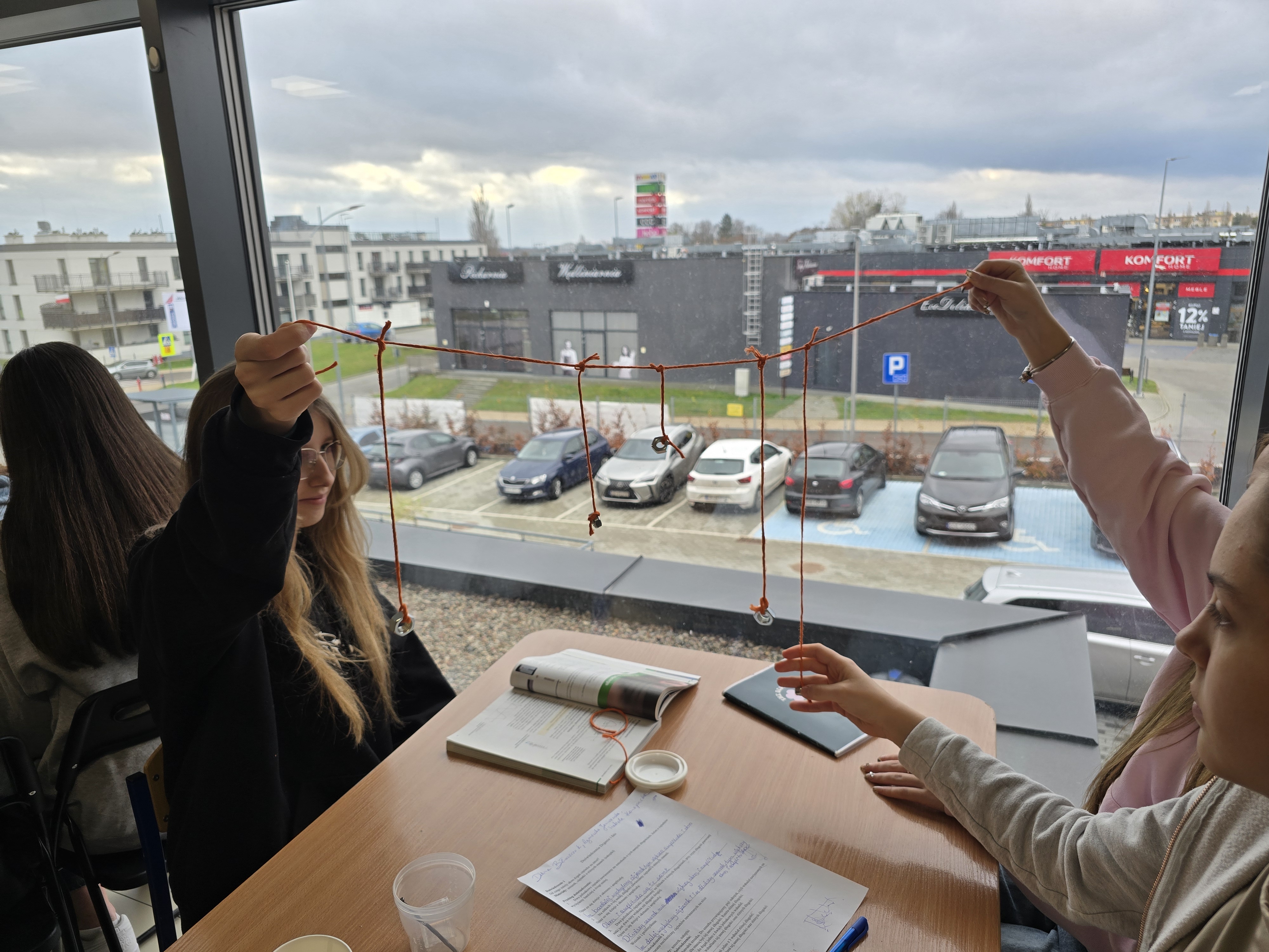 Kolejne doświadczenie było jeszcze bardziej intrygujące. Uczniowie rozciągali kawałek sznurka i przywiązywali do niego pięć nakrętek, tworząc w ten sposób pięć wahadeł zawieszonych na nitkach. Kluczowym elementem było umieszczenie dwóch wahadeł o tej samej długości. Reszta wahadeł miała różne długości. To doświadczenie pozwoliło na demonstrację zjawiska rezonansu. Kiedy jedno z wahadeł o tej samej długości co inne zaczynało się kołysać, przenosiło energię na drugie wahadło o identycznej długości, a pozostałe wahadła drgały w mniejszym stopniu lub wcale. Uczniowie mogli zaobserwować, jak rezonans pozwala na wzmacnianie drgań i transfer energii.