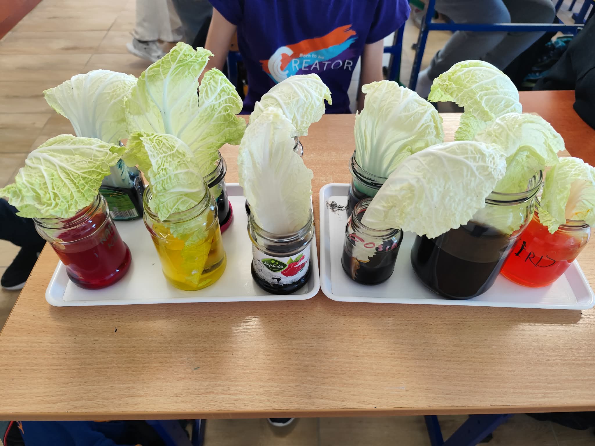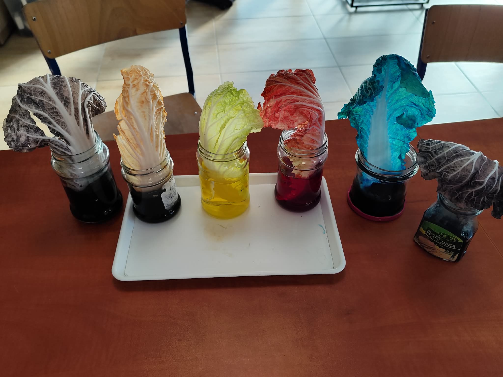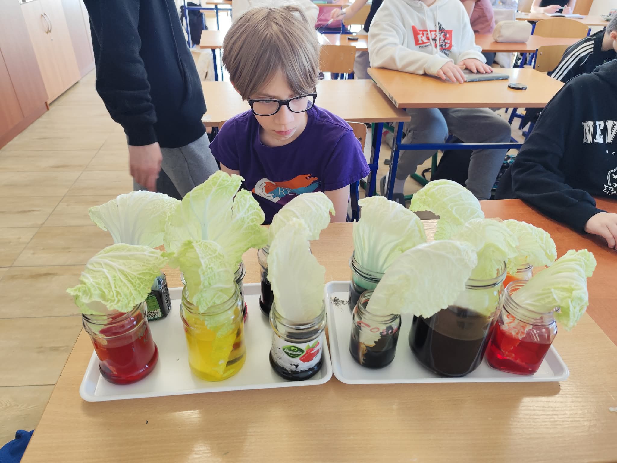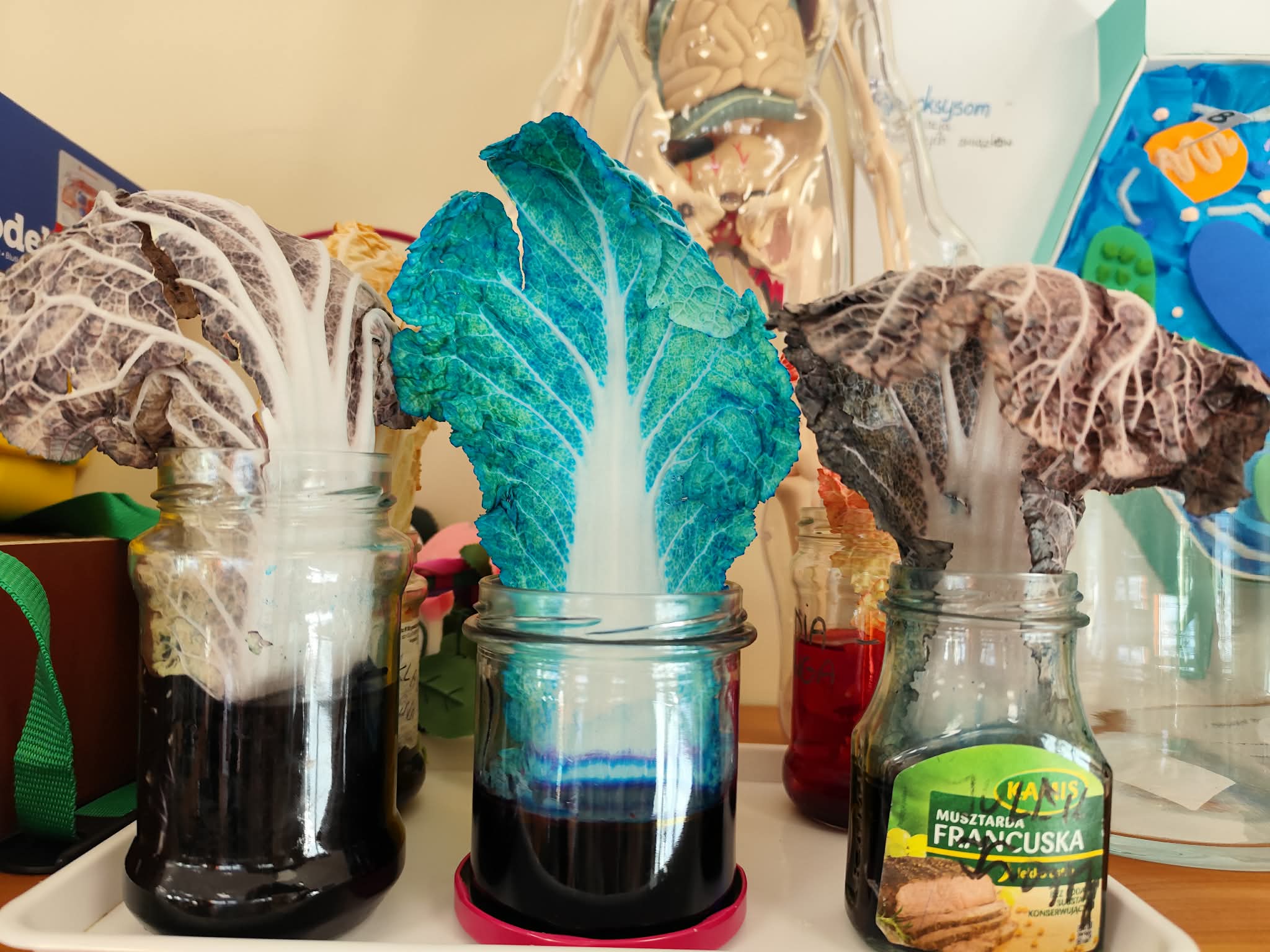 Wyobraźcie sobie kapustę pekińską jako miasto, a tkanki przewodzące jako sieć dróg i rurociągów, które transportują wszystko, co potrzebne do życia. Uczniowie postanowili "zabarwić" te autostrady, aby móc je lepiej zobaczyć i zrozumieć ich działanie. Doświadczenie było proste, ale bardzo pouczające. Kapusta pekińska, zanurzona w wodzie z barwnikiem spożywczym, przez kilka godzin, a nawet dni, chłonęła kolorową ciecz.