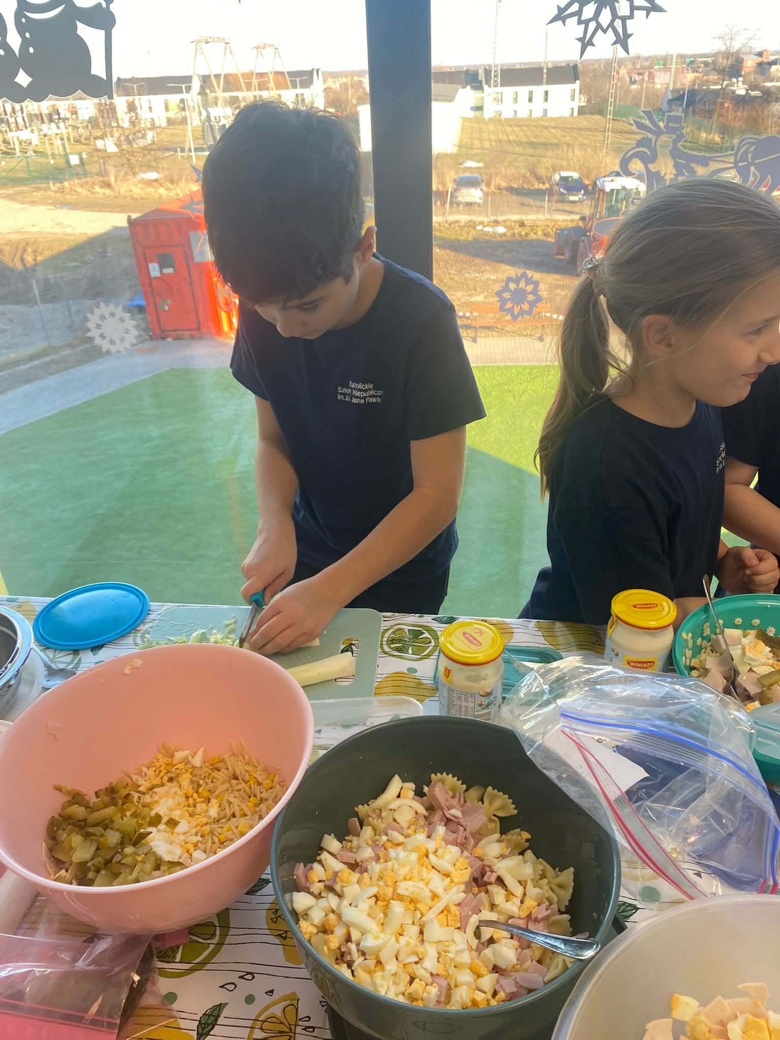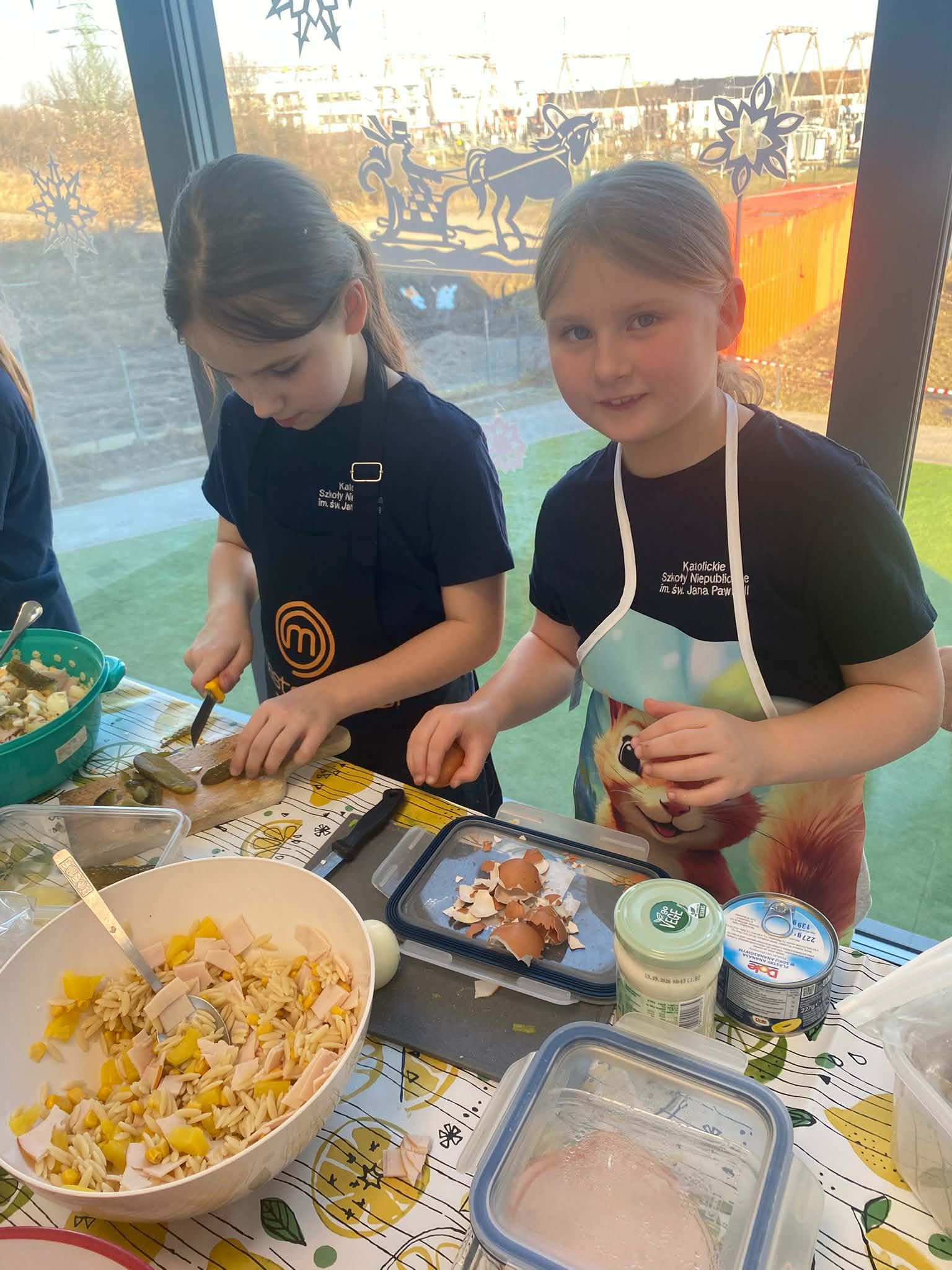 Na ostatnich zajęciach kółka kulinarnego było wyjątkowo smakowicie! Nasi młodzi kucharze przygotowywali pyszną i kolorową sałatkę makaronową z szynką, serem oraz świeżymi ogórkami.