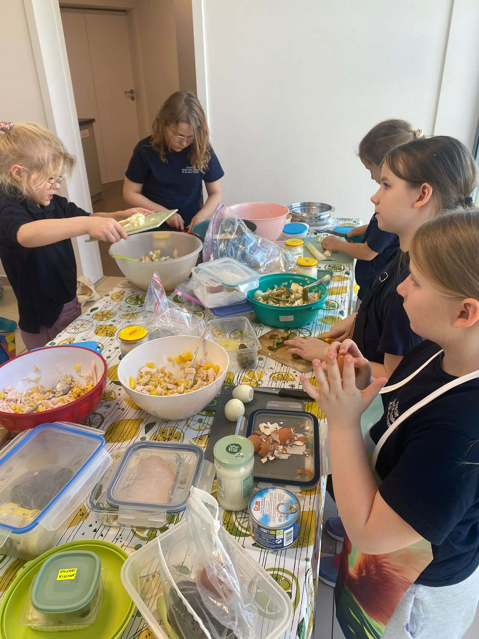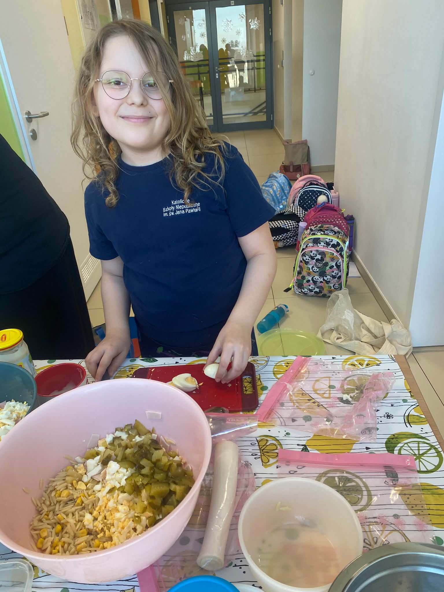 Najpierw wspólnie ugotowaliśmy makaron, a potem każdy z zaangażowaniem kroił składniki i komponował własną porcję. Było dużo śmiechu, współpracy i nauki – bo gotowanie to nie tylko świetna zabawa, ale też rozwijanie samodzielności i zdrowych nawyków.
