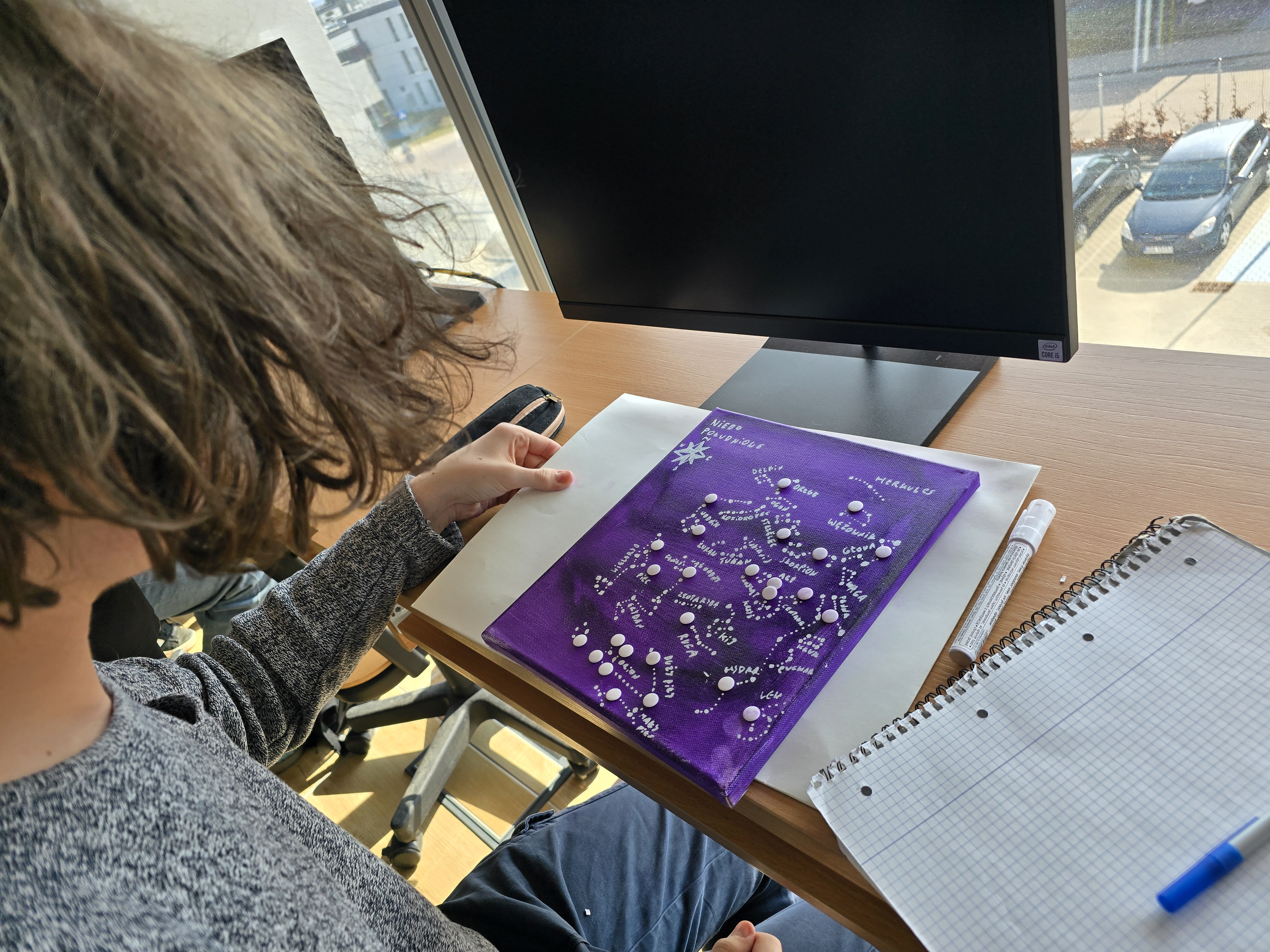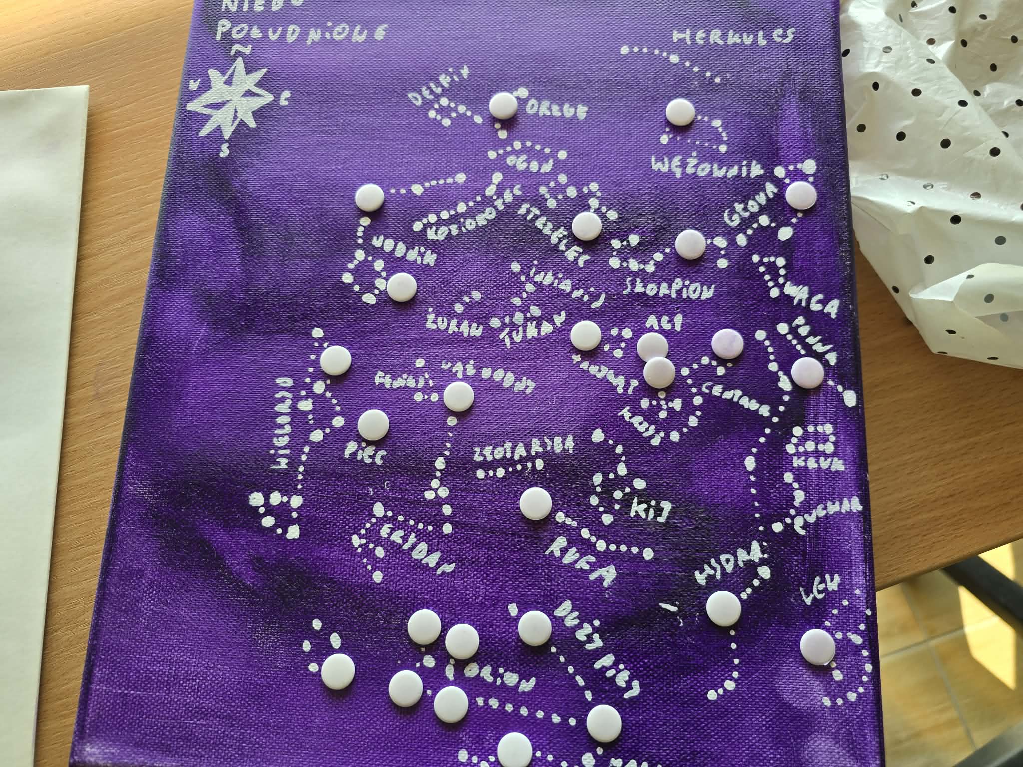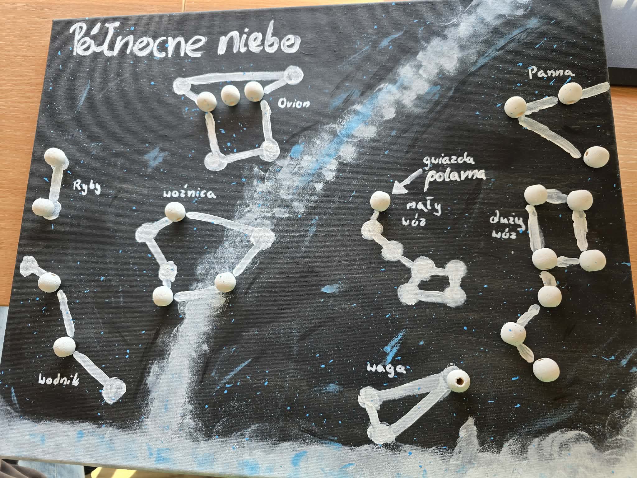 Grupa zajmująca się niebem półkuli północnej skupiła się na tym, co możemy obserwować z naszej szerokości geograficznej. W ich pracy pojawiły się charakterystyczne układy gwiazd oraz próby odwzorowania ich położenia na nocnym niebie.