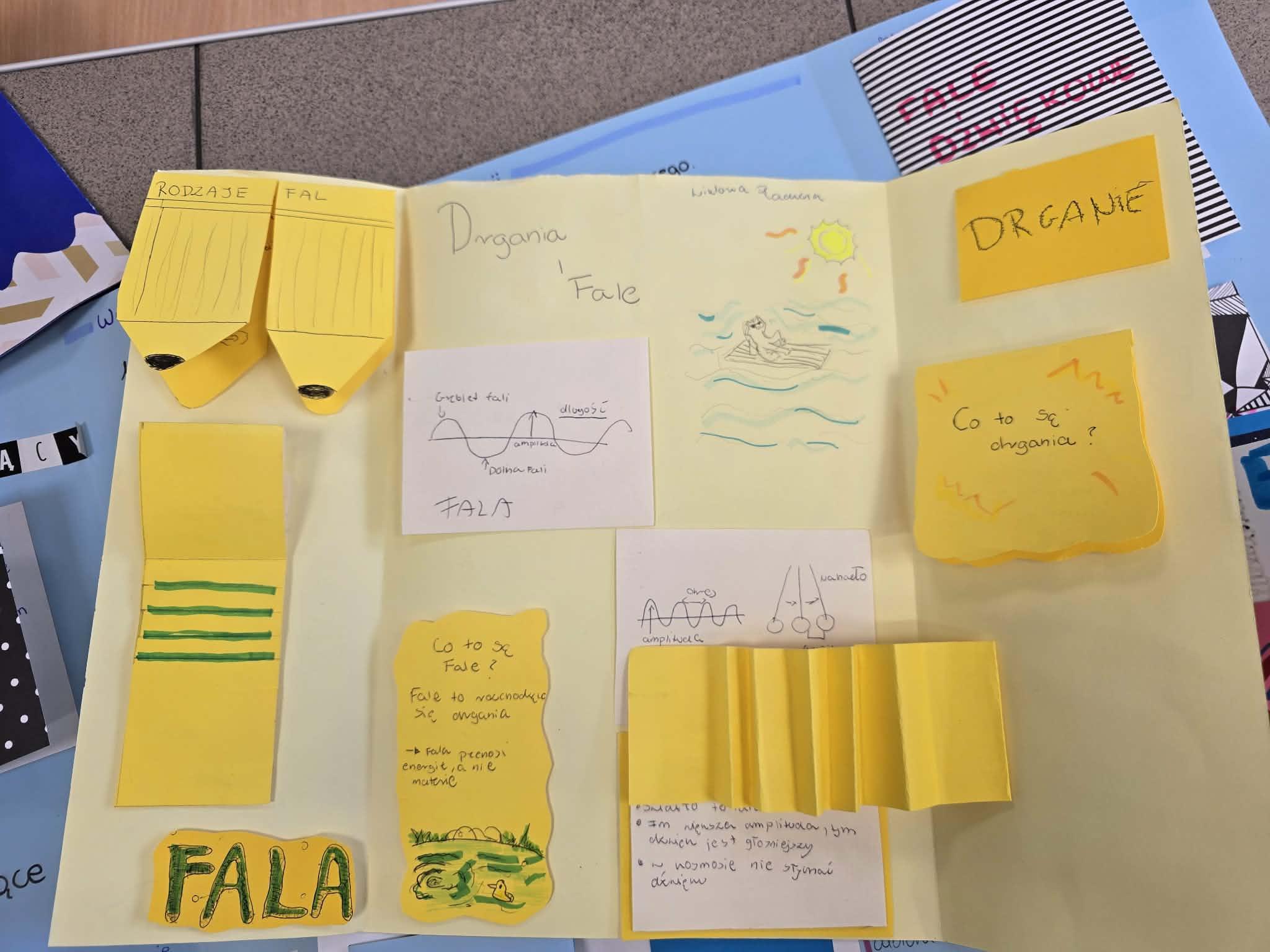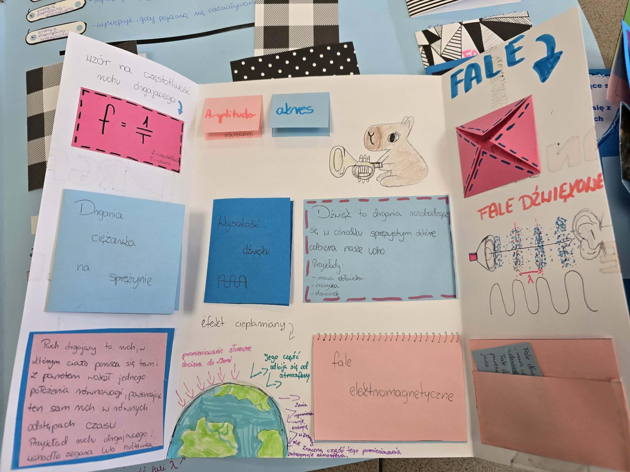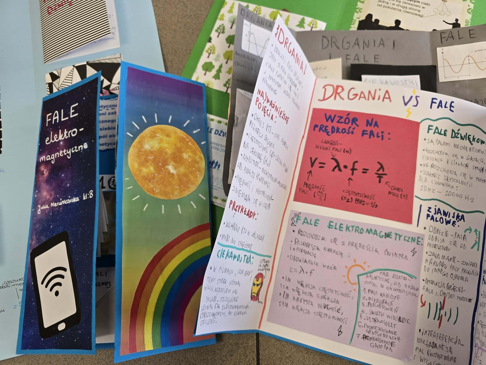 W swoich lapbookach uczniowie umieścili kluczowe informacje związane z tematyką drgań i fal, między innymi: