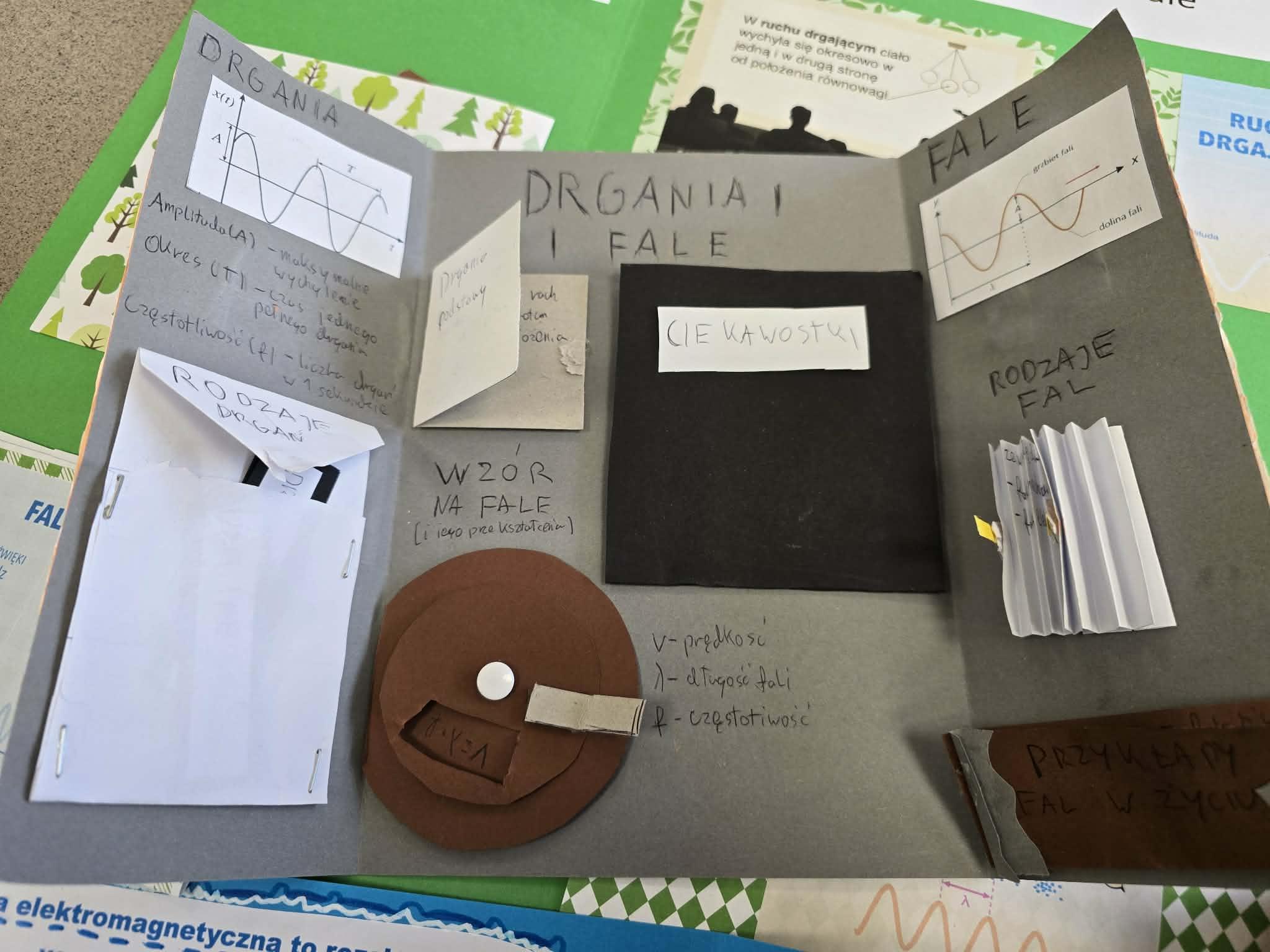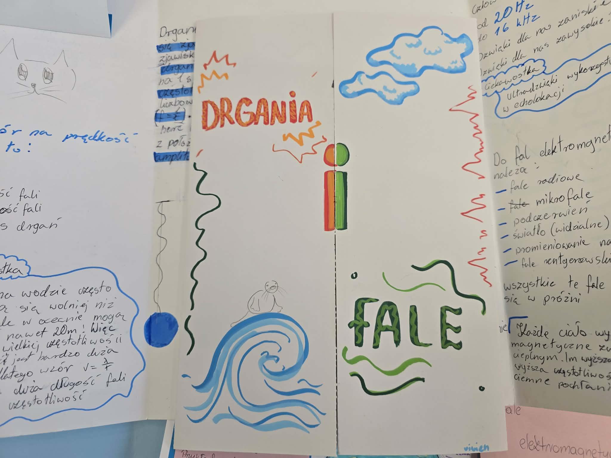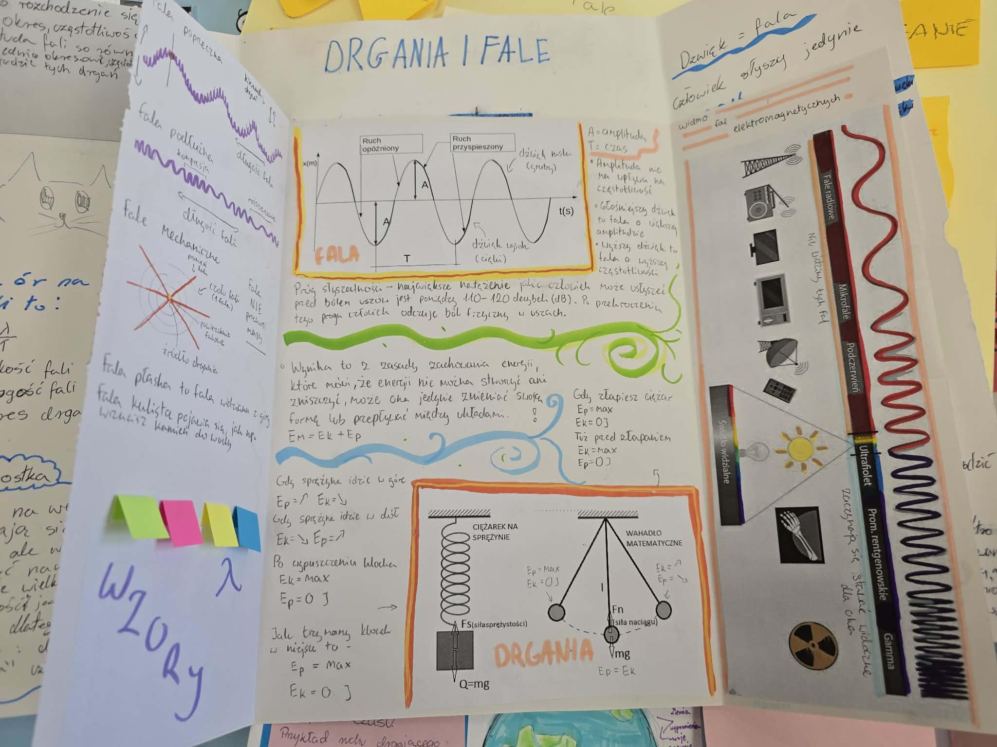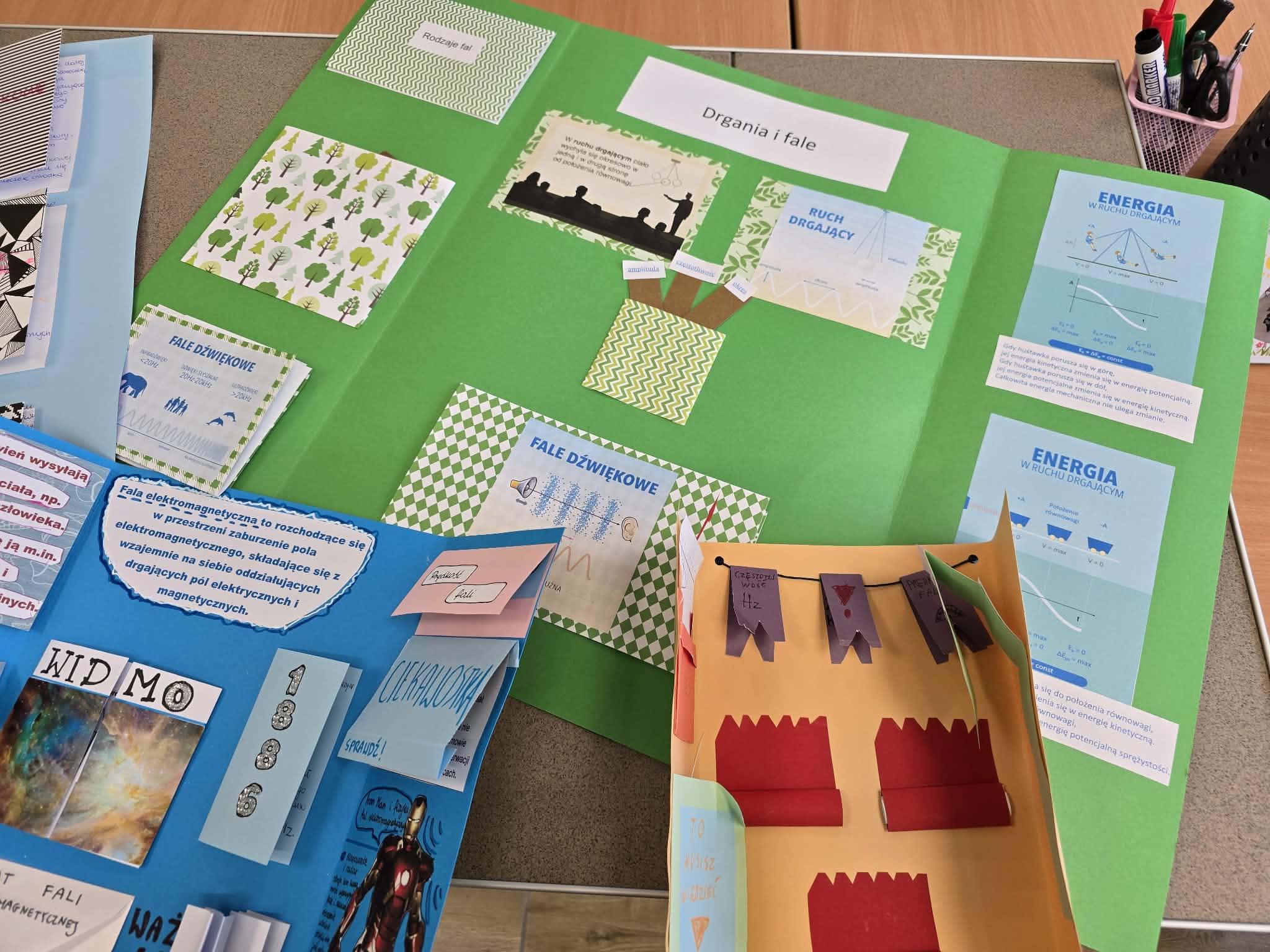 W swoich lapbookach uczniowie umieścili kluczowe informacje związane z tematyką drgań i fal, między innymi: