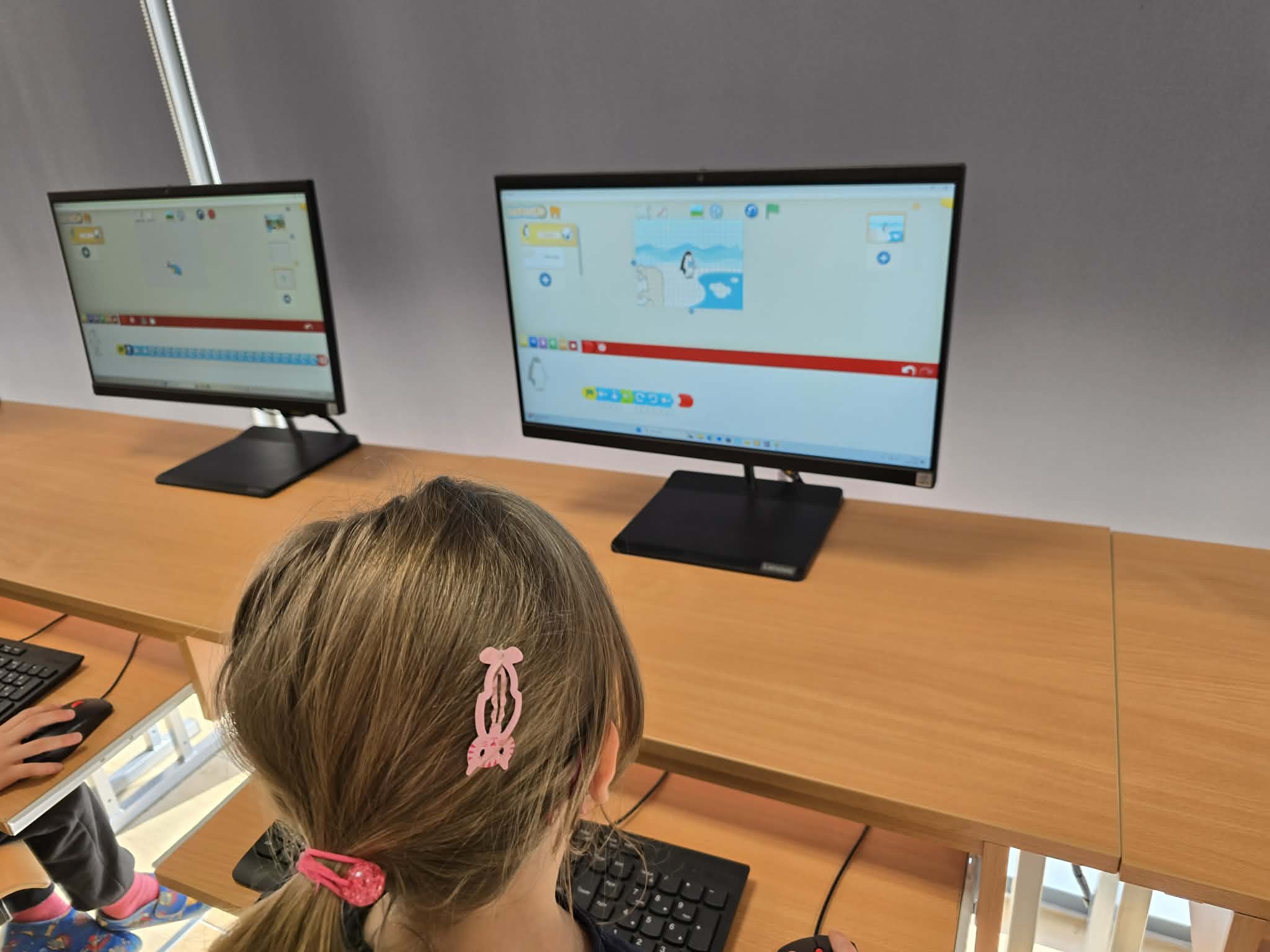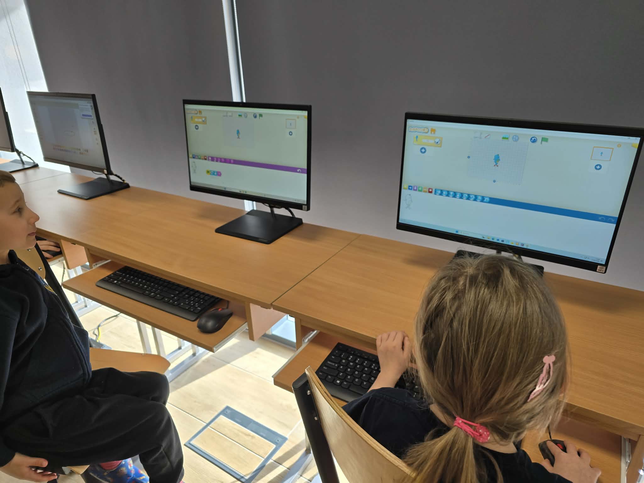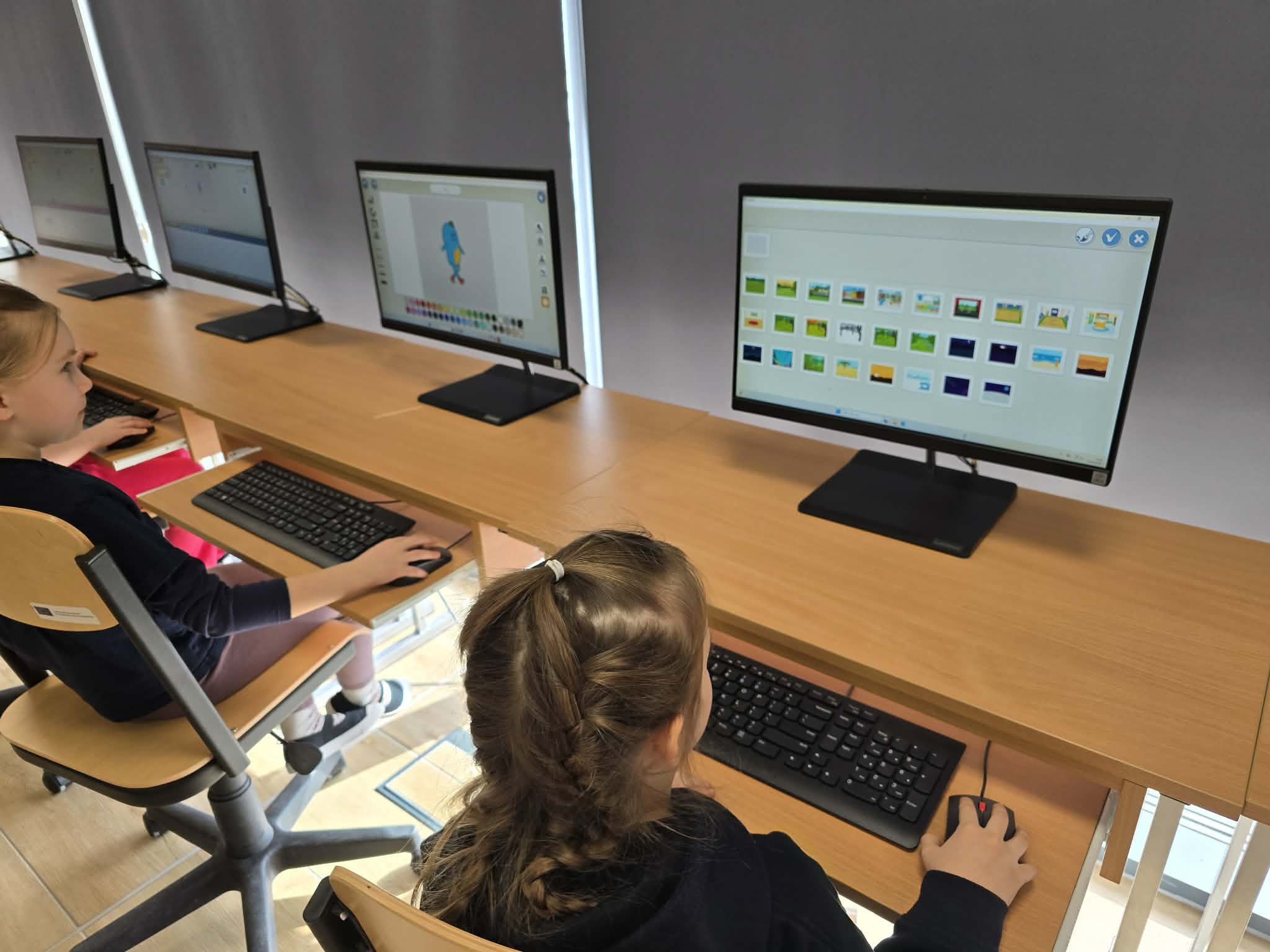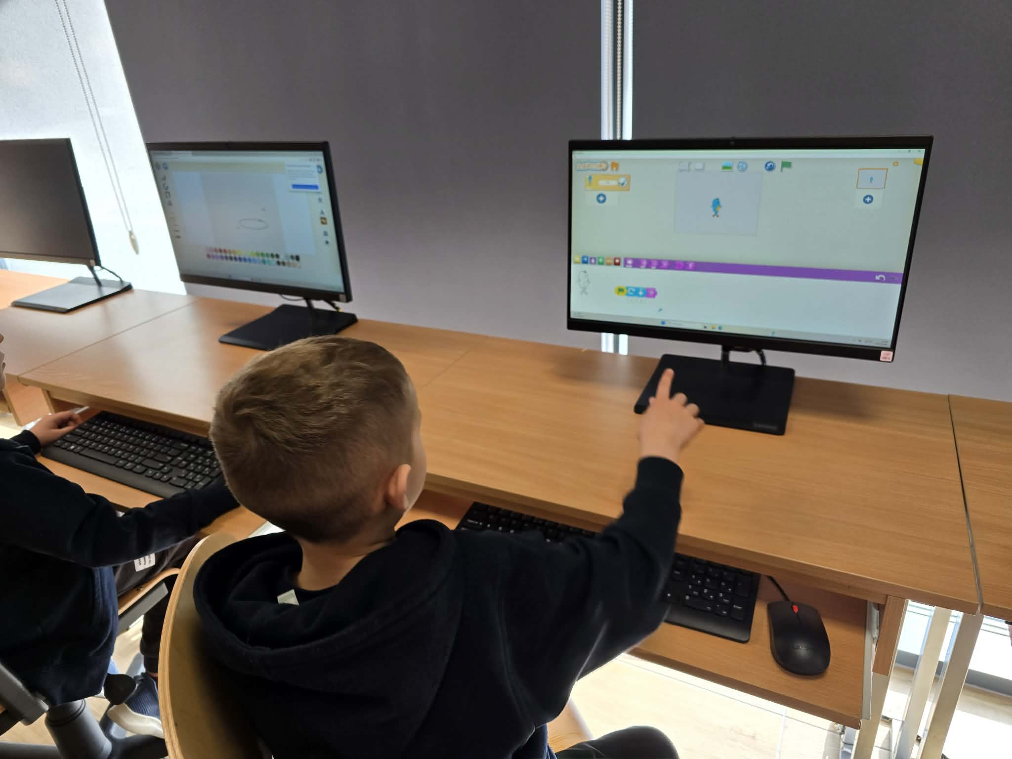 Kolejnym etapem było programowanie stworzonych postaci. Uczniowie układali odpowiednie bloczki poleceń, dzięki którym ich duszki mogły się poruszać, wykonywać różne czynności oraz ożywiać przygotowane wcześniej sceny. Dla wielu dzieci było to niezwykle ekscytujące doświadczenie – mogły zobaczyć, jak ich pomysły zamieniają się w działające animacje.