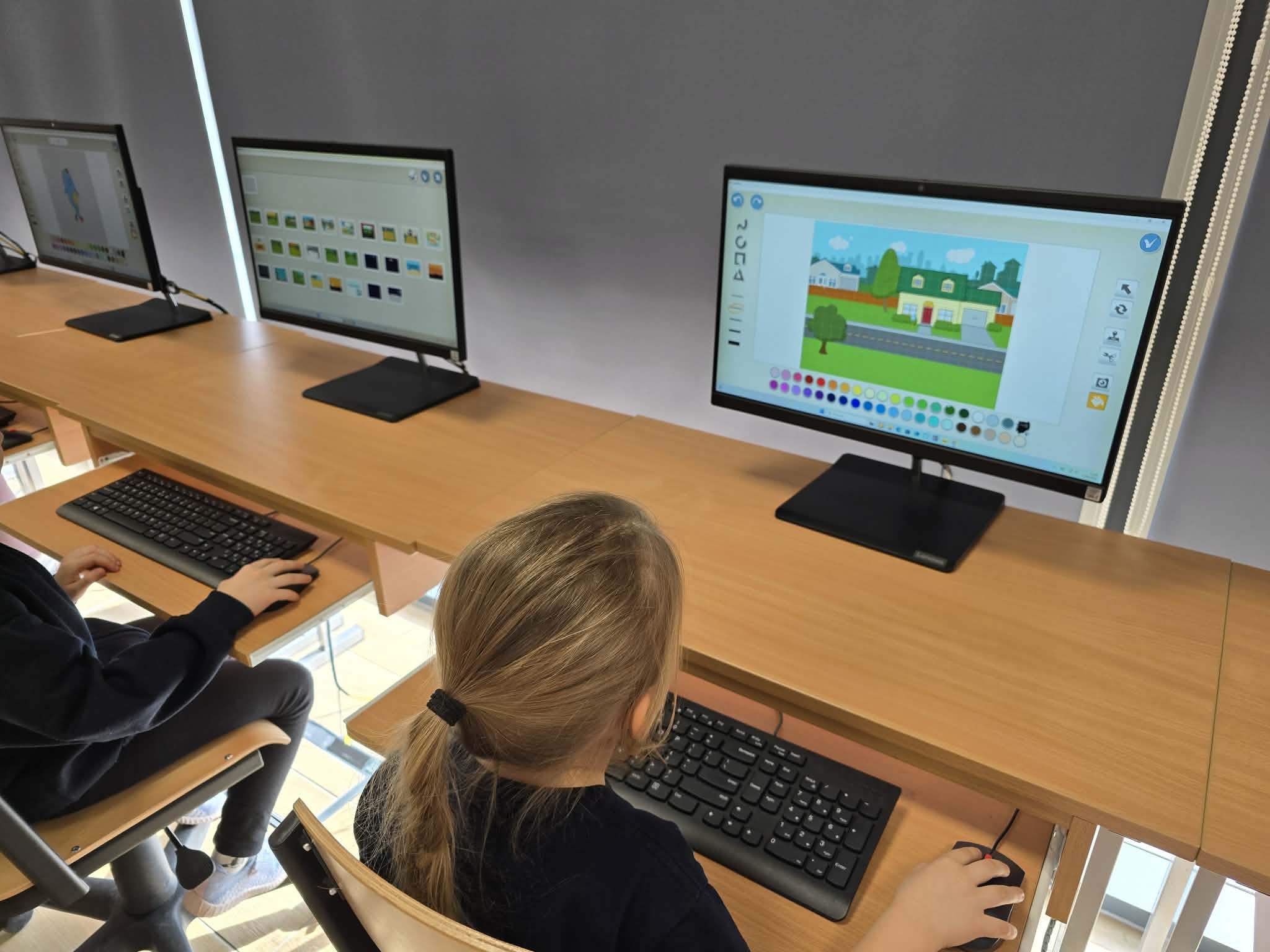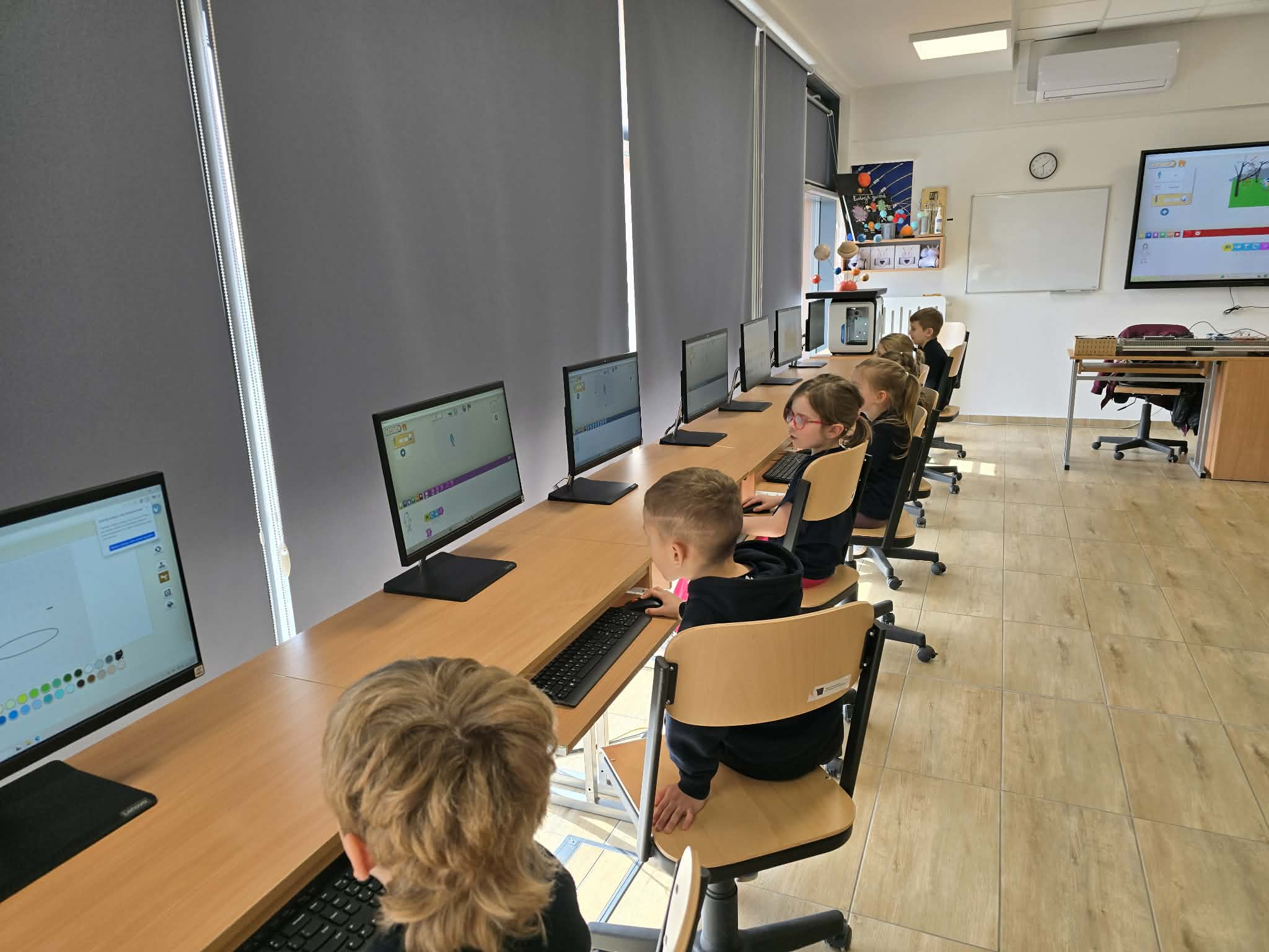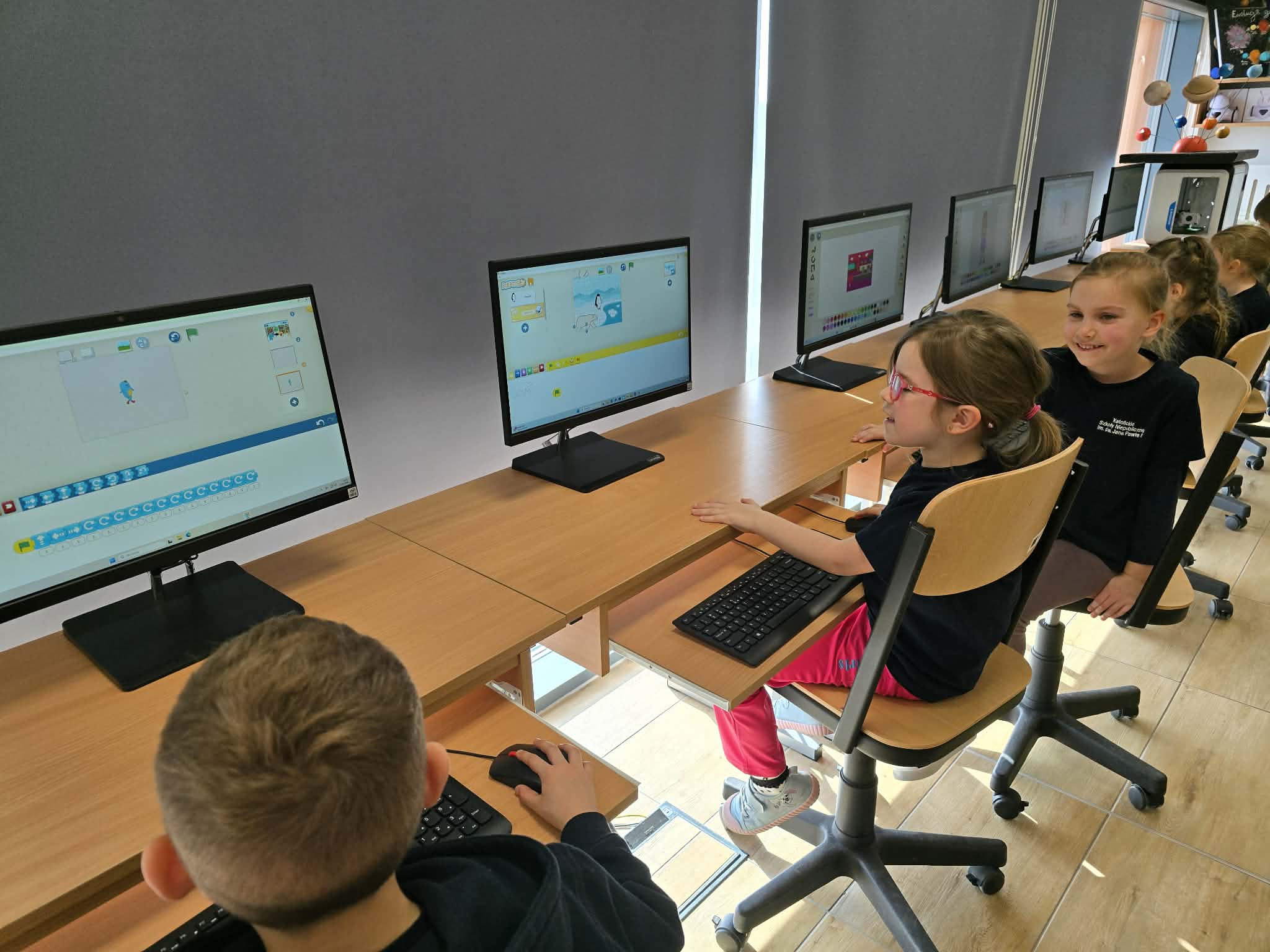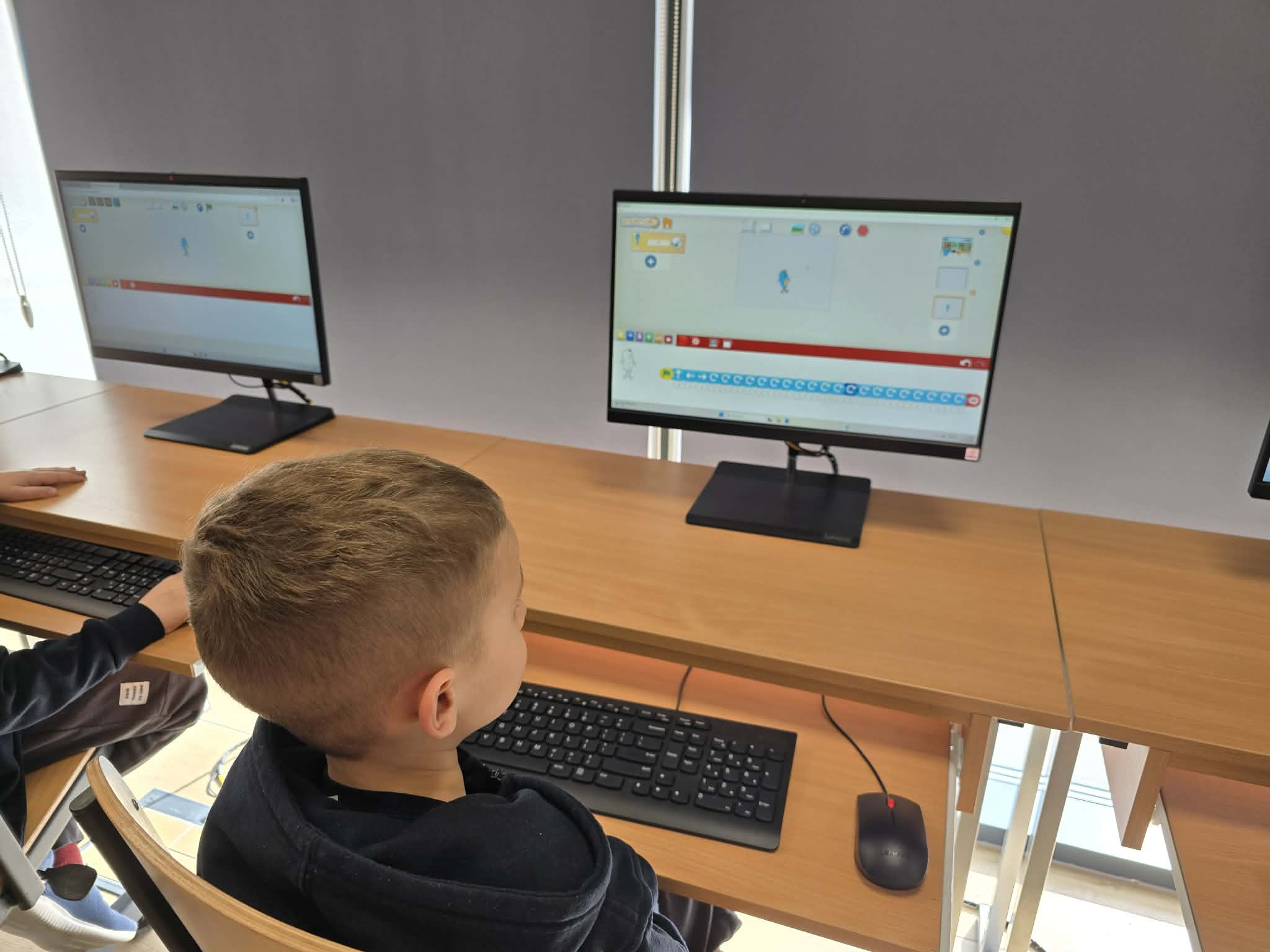 Kolejnym etapem było programowanie stworzonych postaci. Uczniowie układali odpowiednie bloczki poleceń, dzięki którym ich duszki mogły się poruszać, wykonywać różne czynności oraz ożywiać przygotowane wcześniej sceny. Dla wielu dzieci było to niezwykle ekscytujące doświadczenie – mogły zobaczyć, jak ich pomysły zamieniają się w działające animacje.