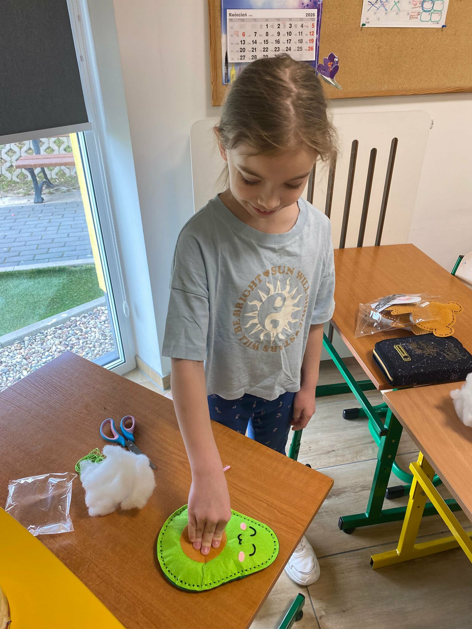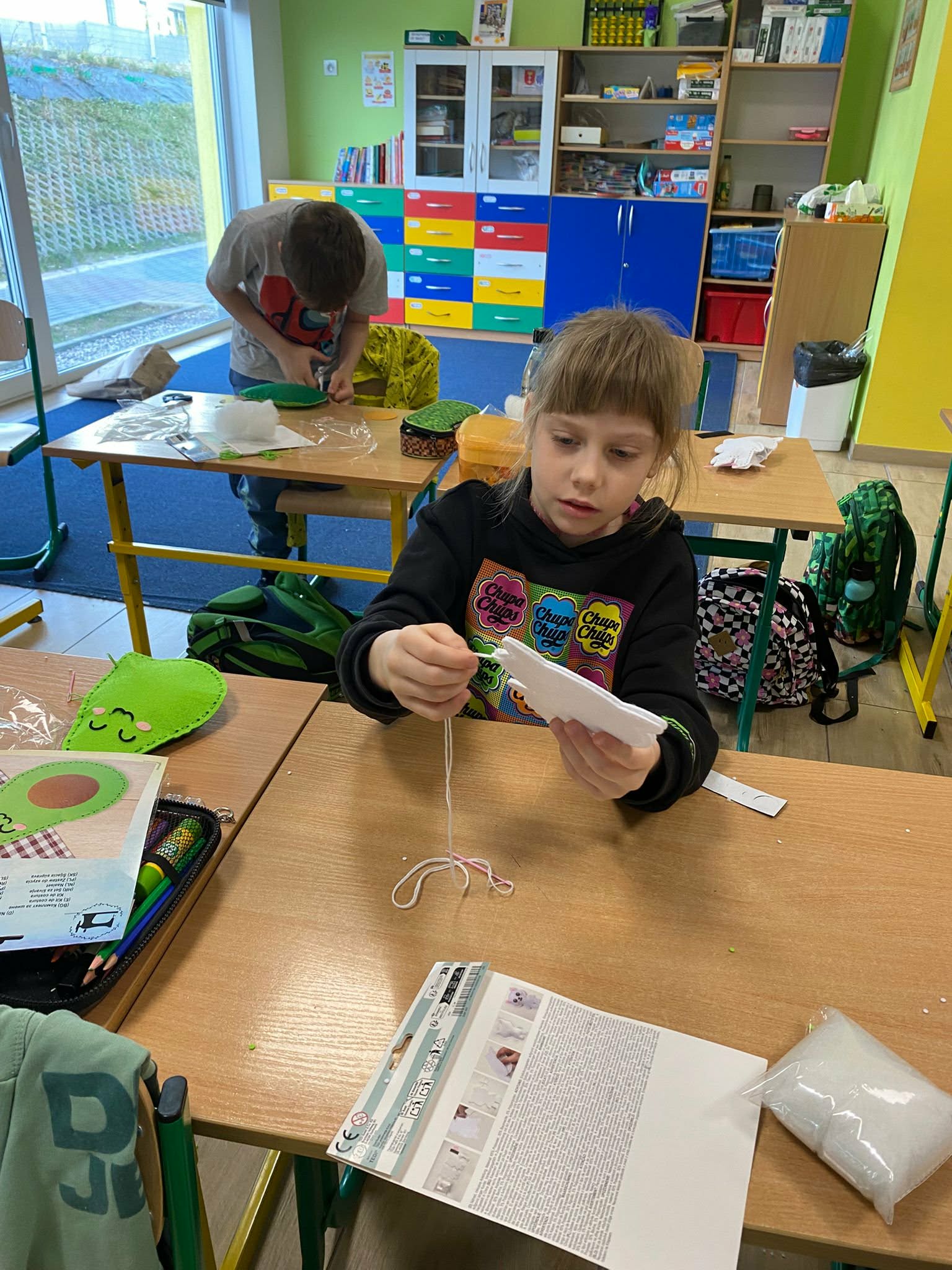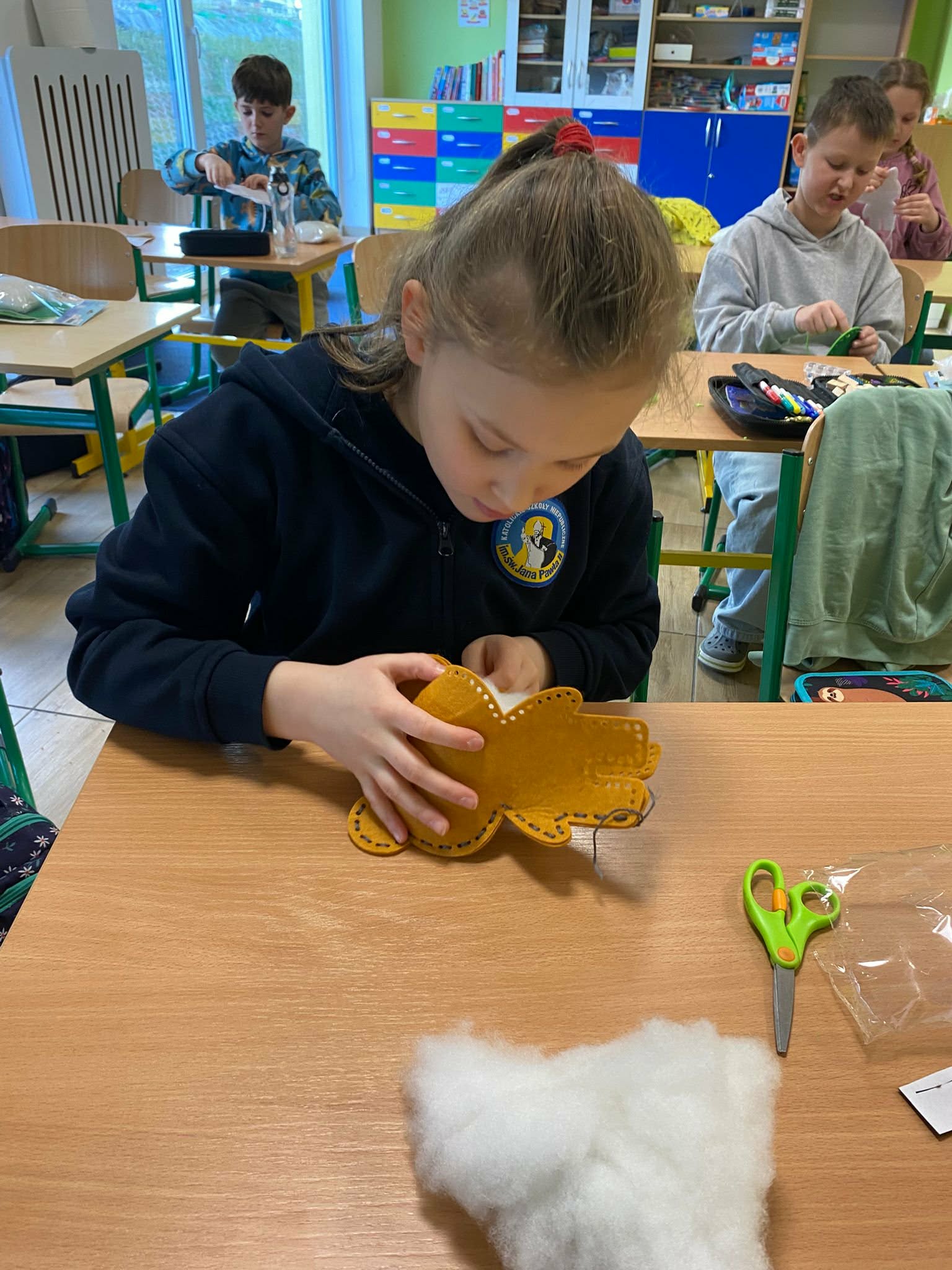 Praca nad maskotkami była dla uczniów nie tylko świetną zabawą, ale także okazją do rozwijania zdolności manualnych, cierpliwości i dokładności. Dzieci uczyły się podstaw szycia – jak bezpiecznie posługiwać się igłą, łączyć elementy materiału oraz dbać o estetykę wykonania.