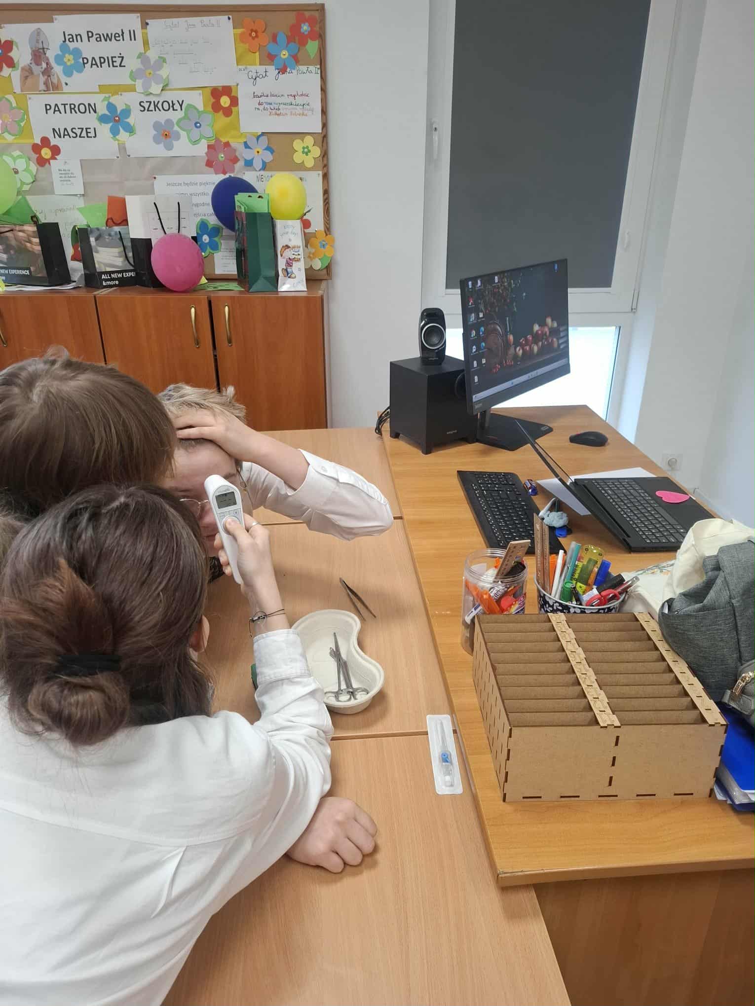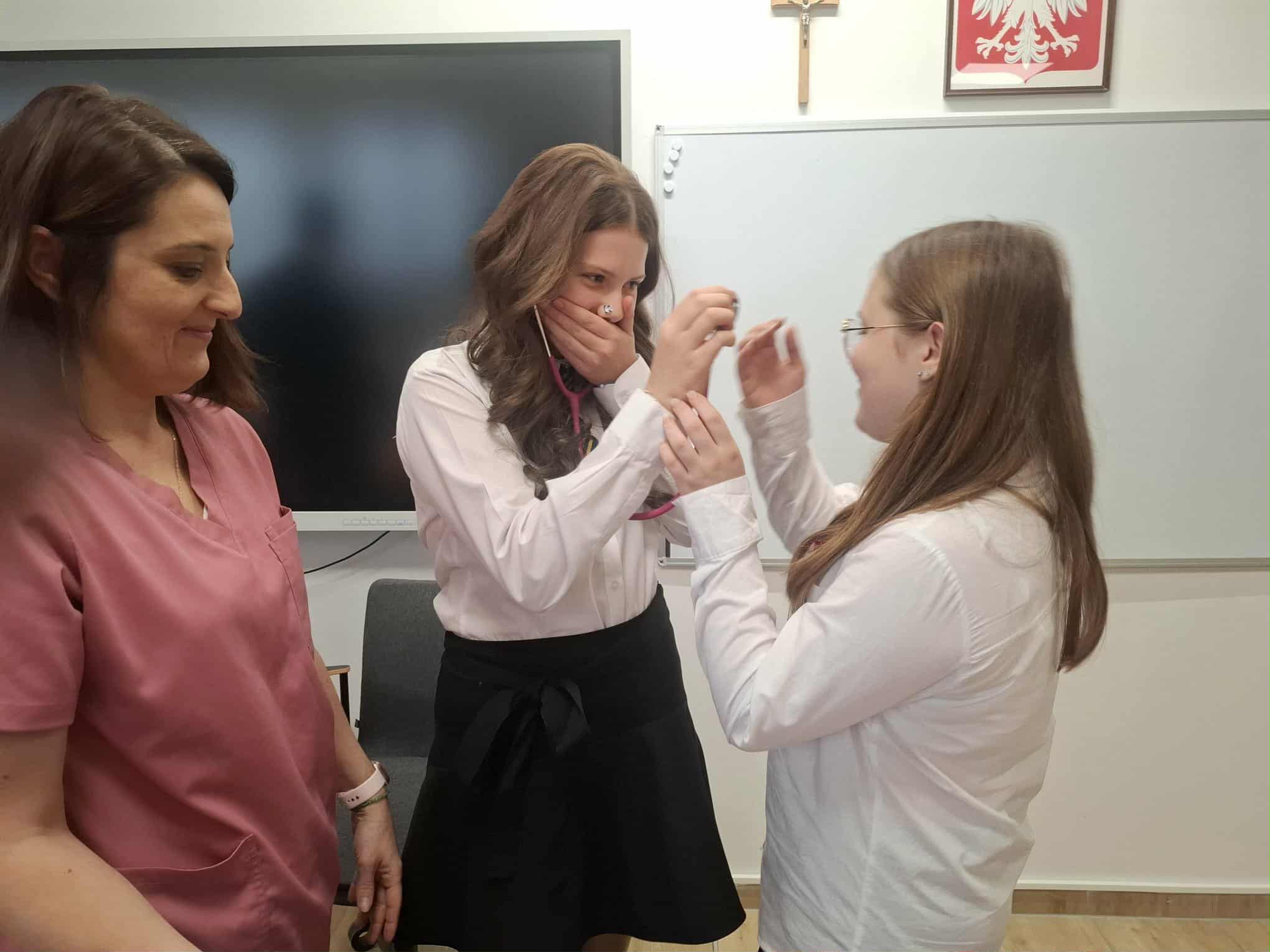 Kolejnym punktem programu było mierzenie ciśnienia krwi za pomocą tradycyjnego ciśnieniomierza oraz stosowanie stetoskopu. Uczniowie poznali, jak poprawnie używać tych narzędzi i zrozumieli, jak ważne jest monitorowanie zdrowia pacjentów.