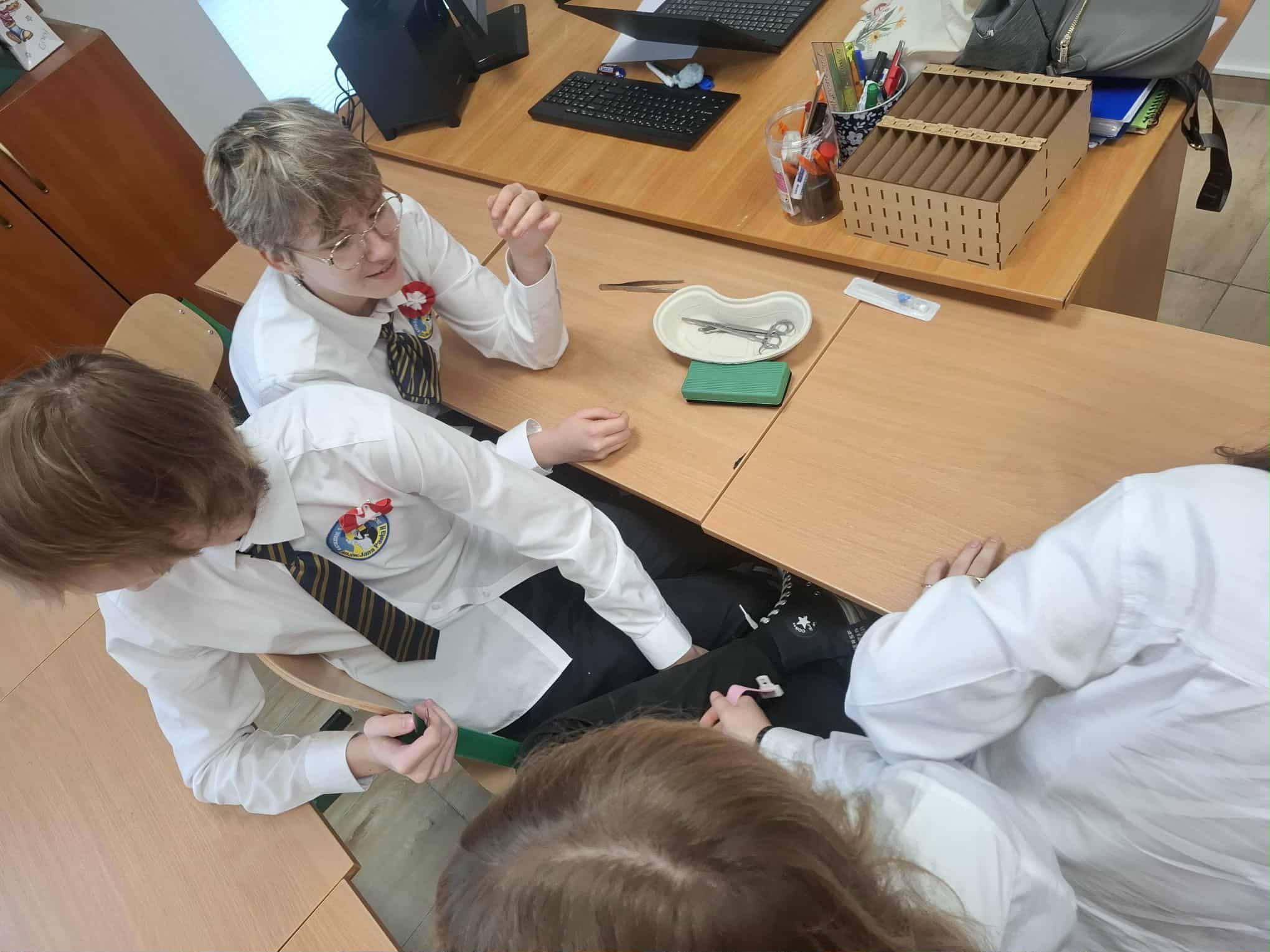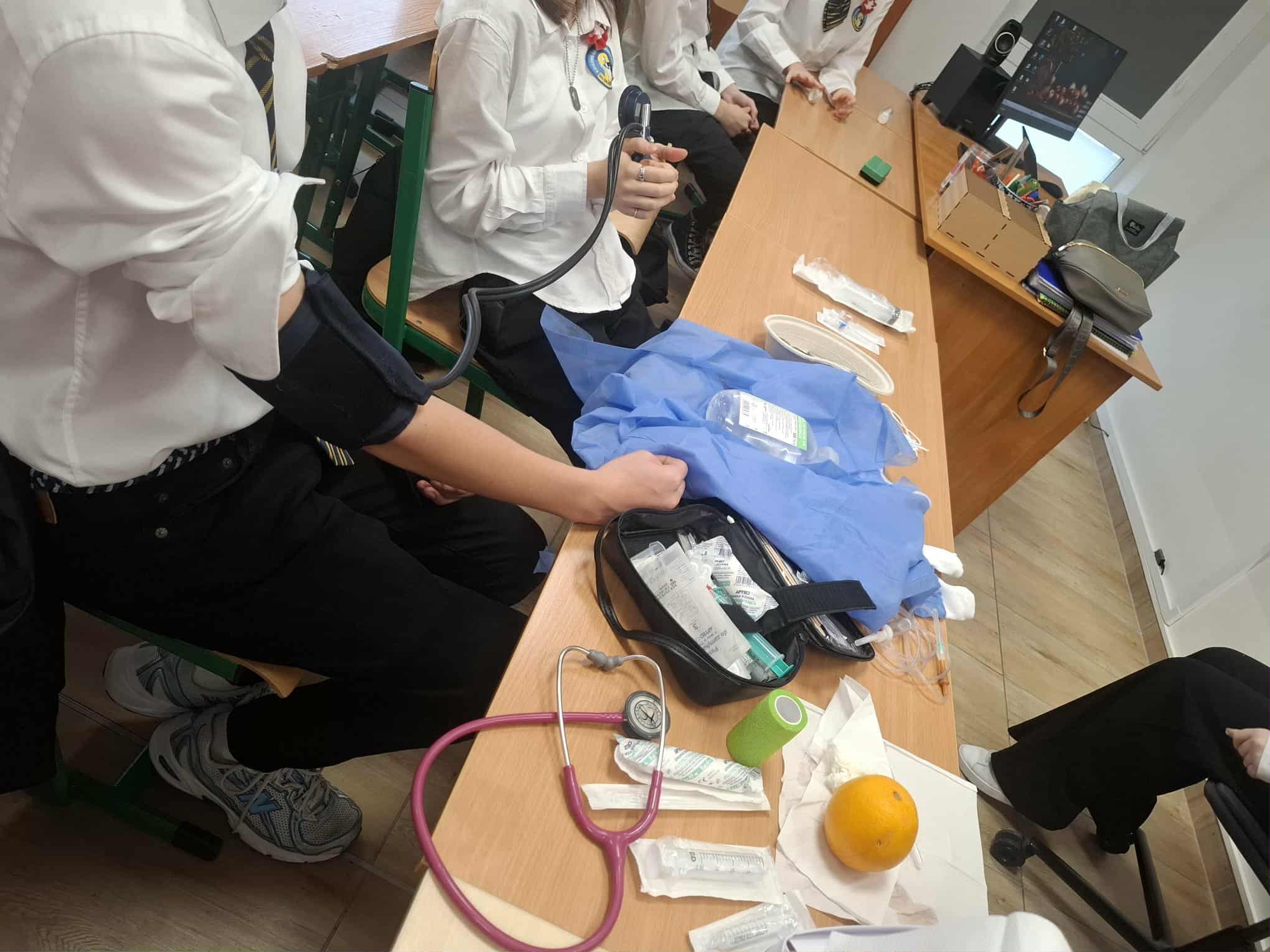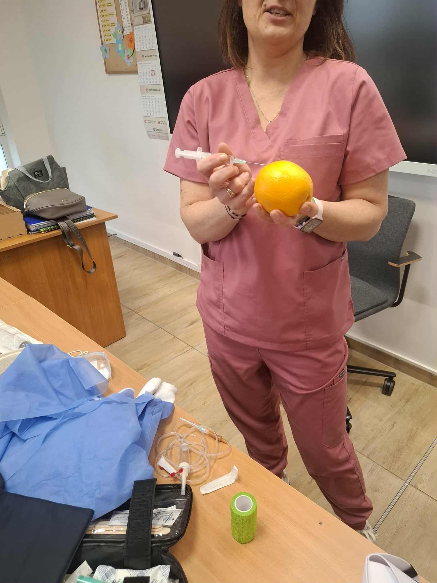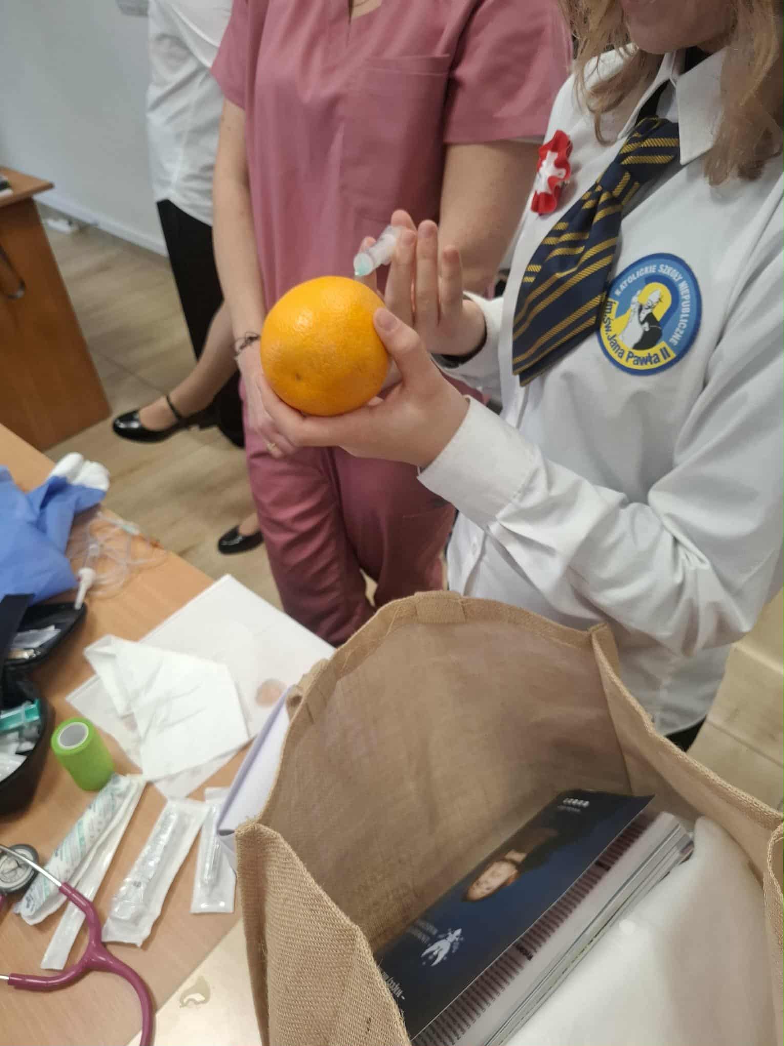 Podczas zajęć uczniowie mieli możliwość uczestniczenia w praktycznych symulacjach. Jedną z nich było podanie zastrzyku na pomarańczy, co pozwoliło na naukę techniki bezpiecznego wkłucia w przyjaznej i bezstresowej atmosferze. To świetny sposób na zdobycie podstawowych umiejętności i pewności siebie przed ewentualną przyszłą pracą w służbie zdrowia.